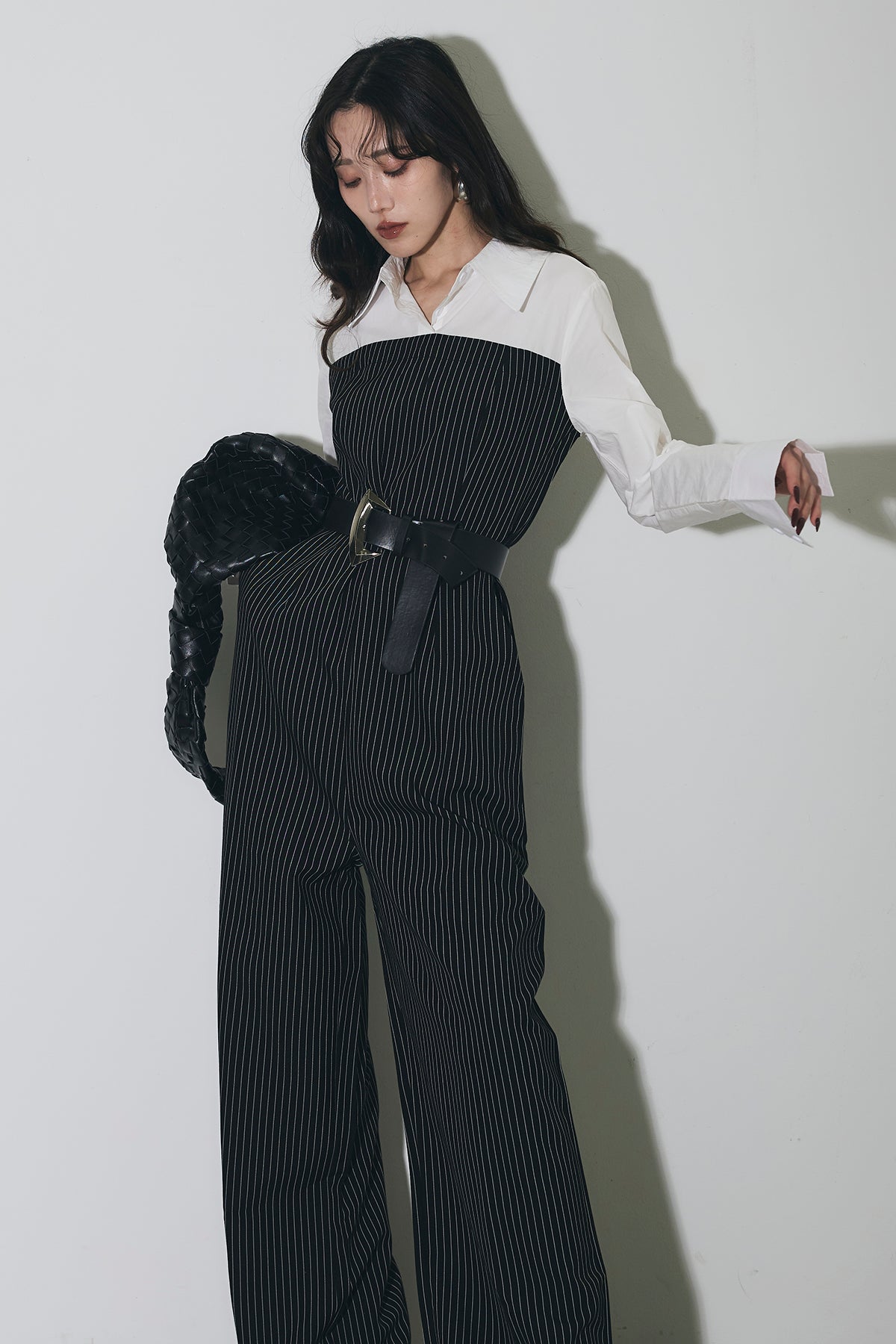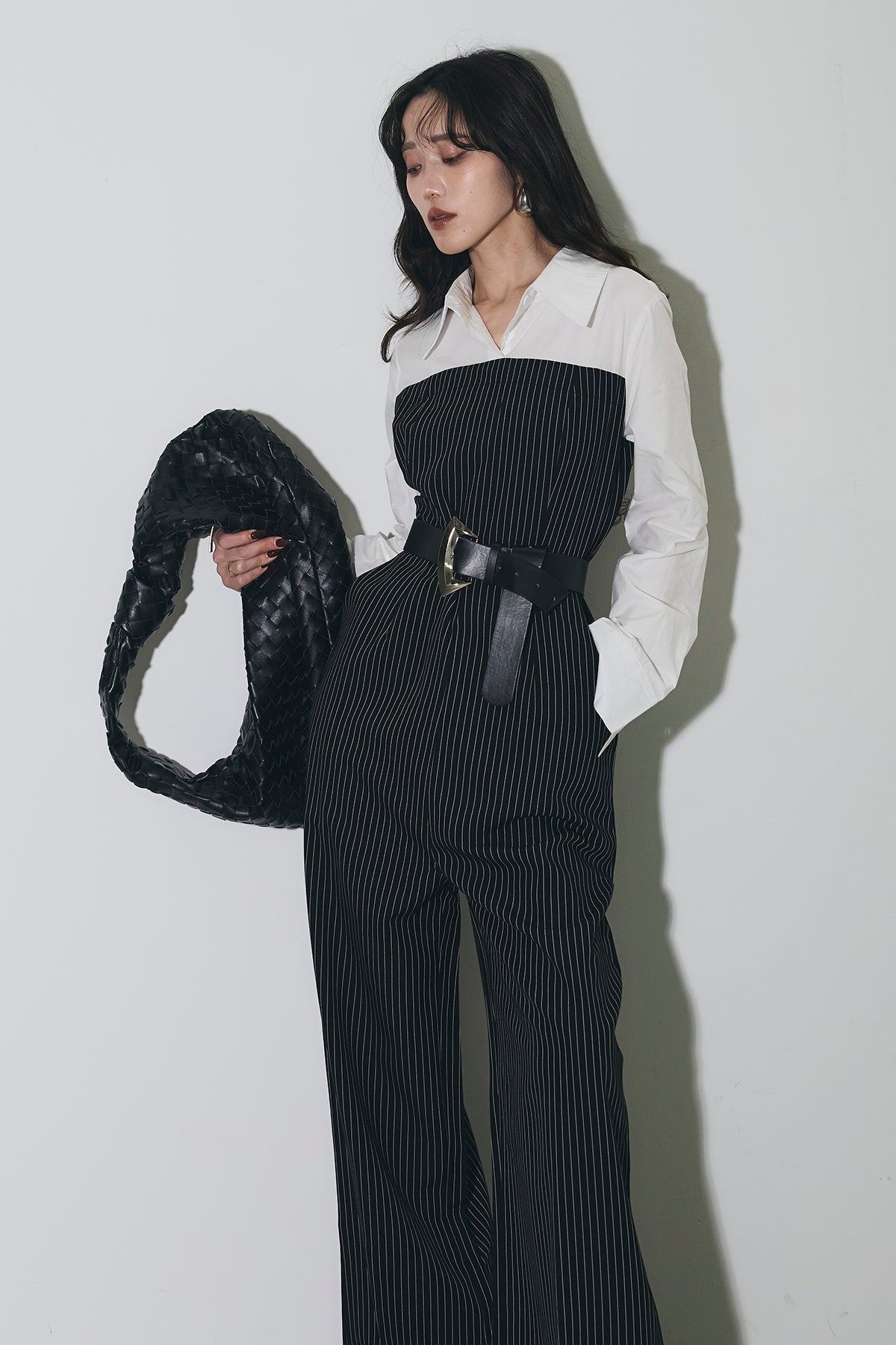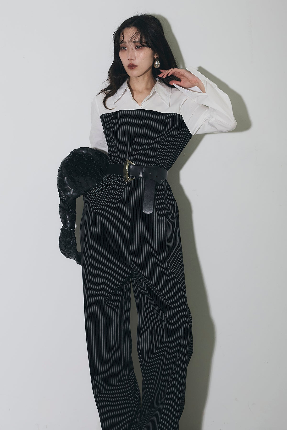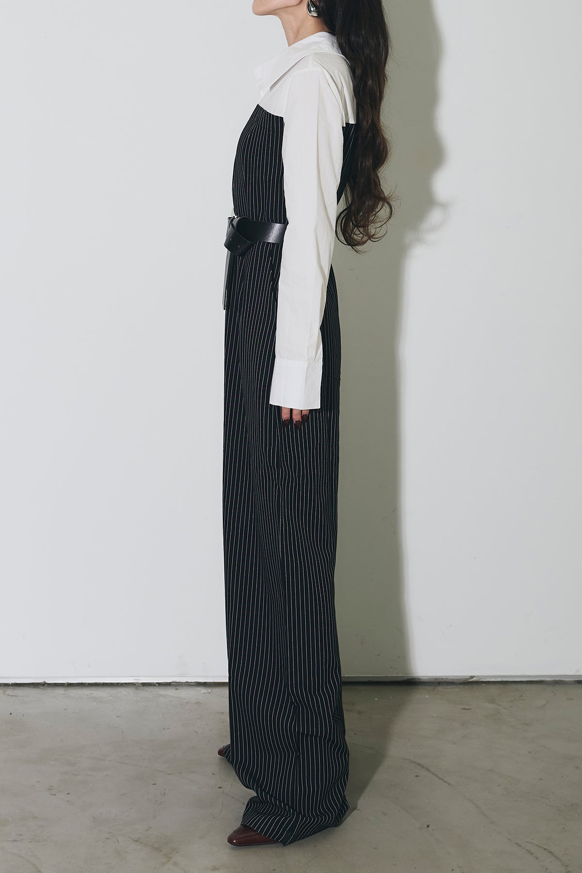 ストライプ柄が縦のラインを強調するオールインワン。 シャツをレイヤードしたようなデザインで、1枚でスタイリングが完成します。 ウエストベルト付きで、シルエットにメリハリをプラス。 きれいめからモードまで幅広く活躍するアイテムです。
