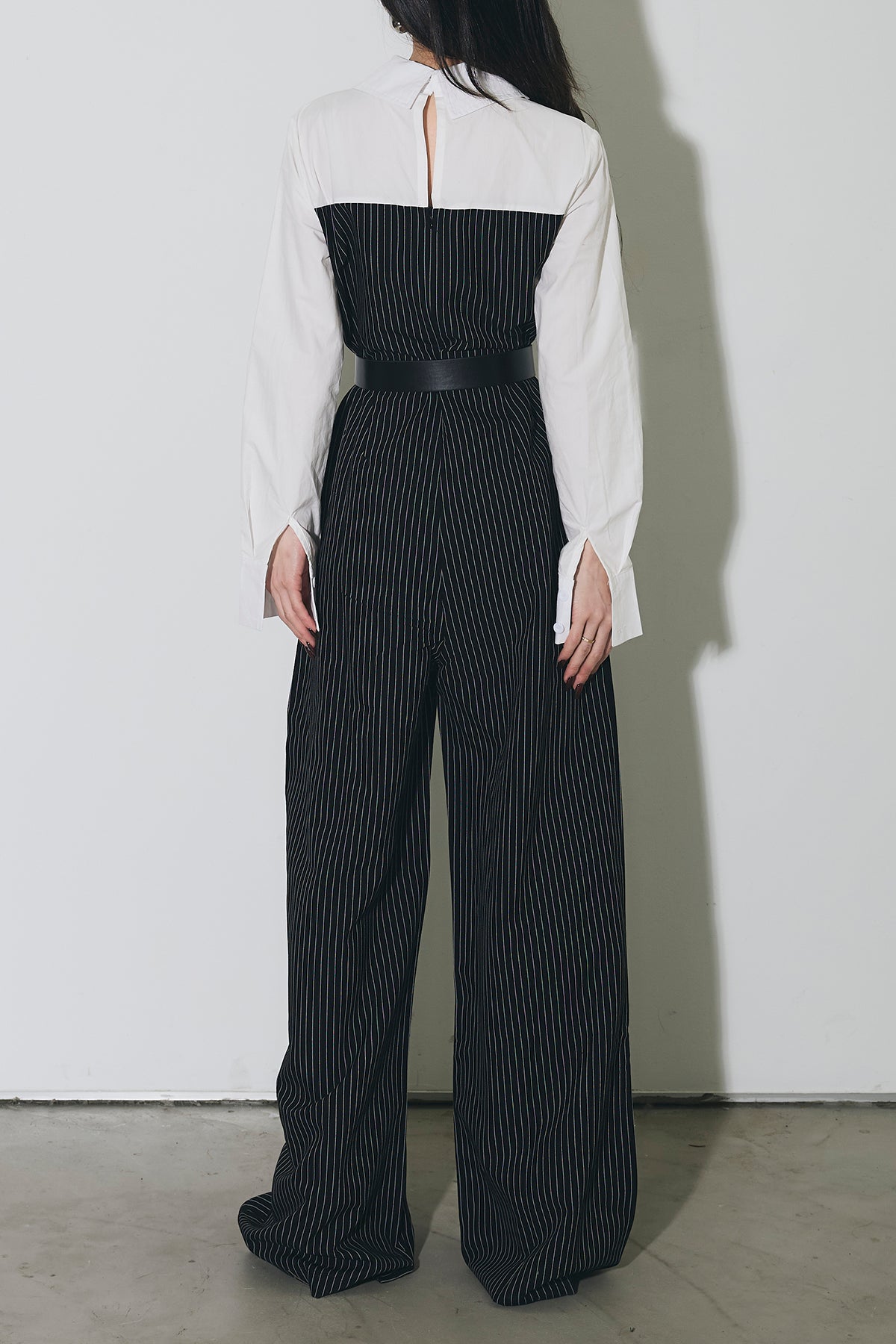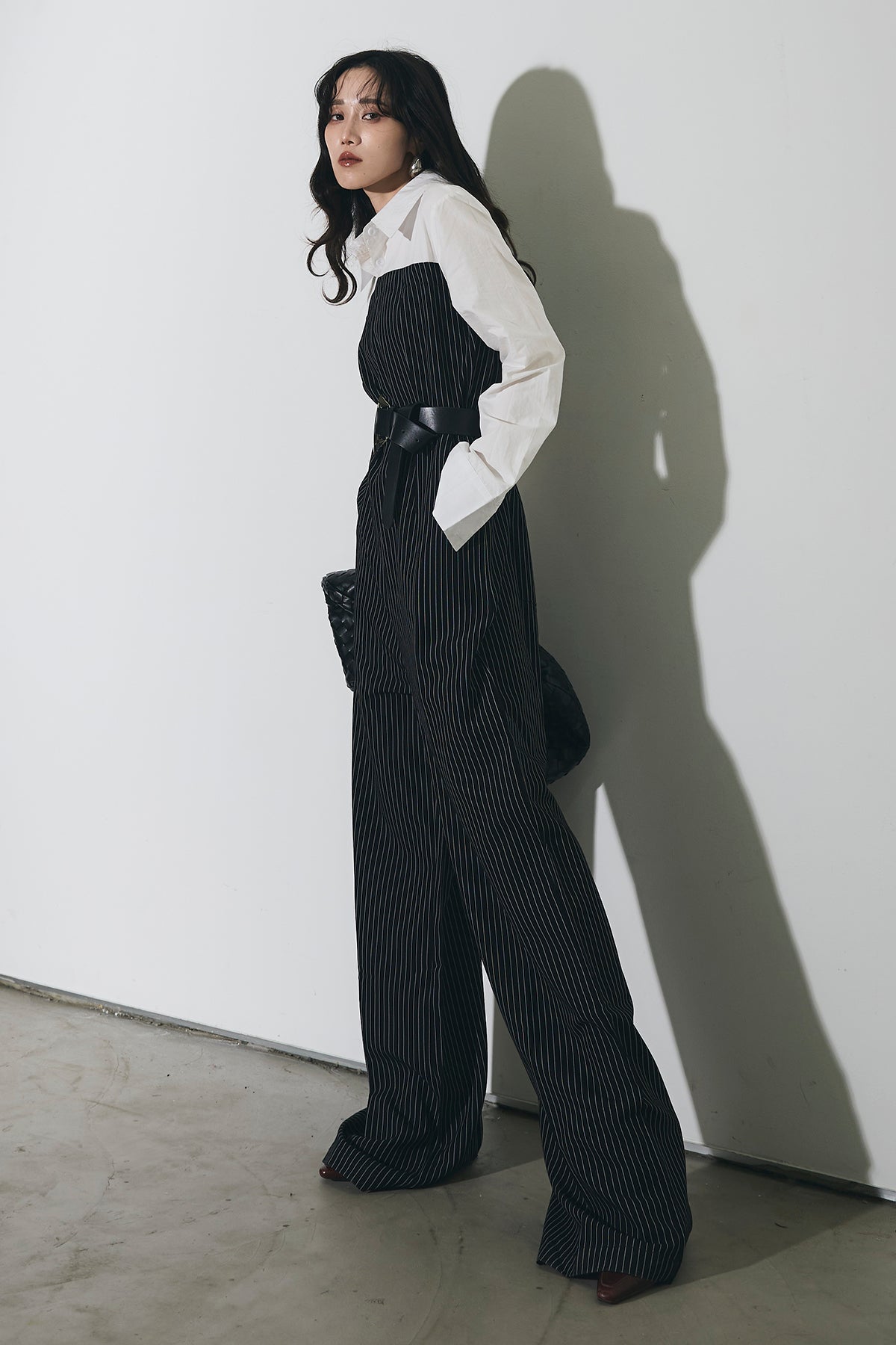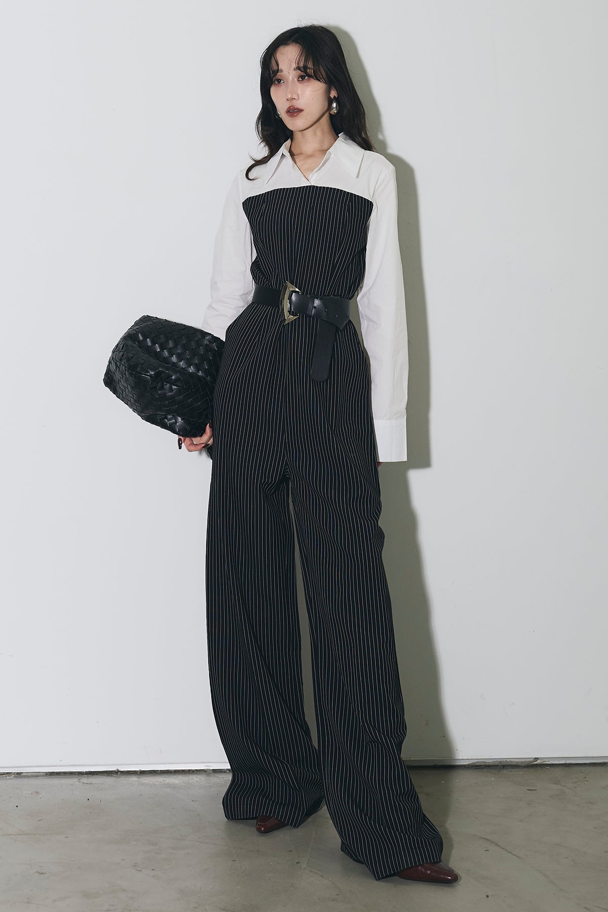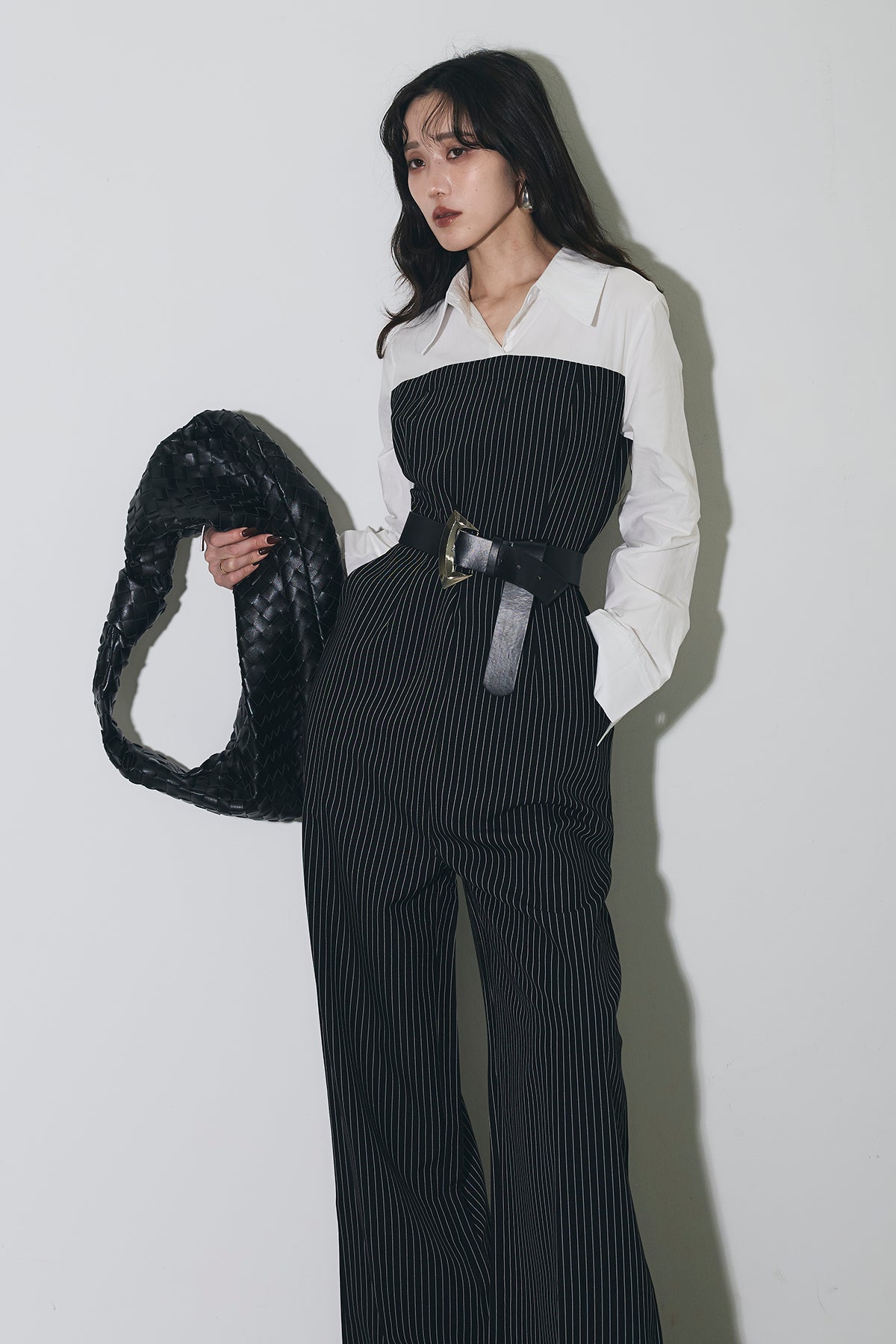 ストライプ柄が縦のラインを強調するオールインワン。 シャツをレイヤードしたようなデザインで、1枚でスタイリングが完成します。 ウエストベルト付きで、シルエットにメリハリをプラス。 きれいめからモードまで幅広く活躍するアイテムです。