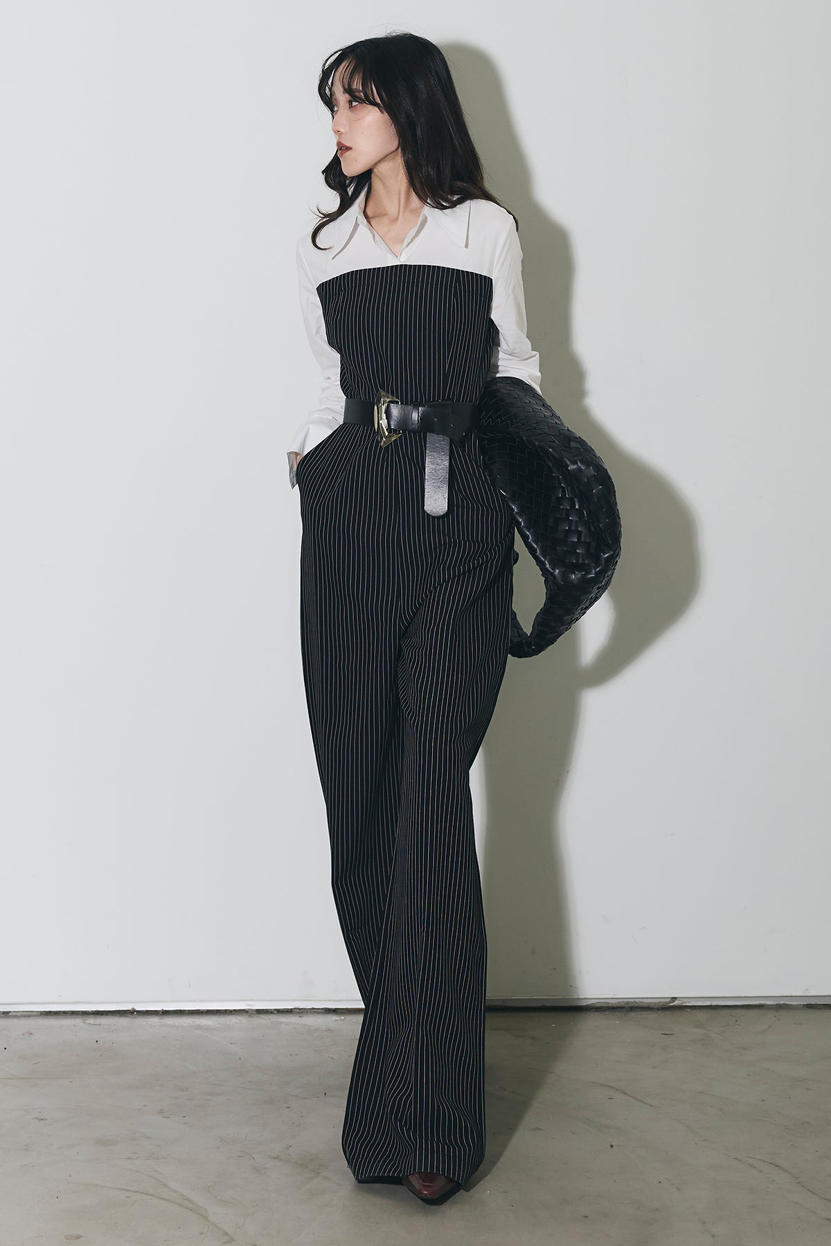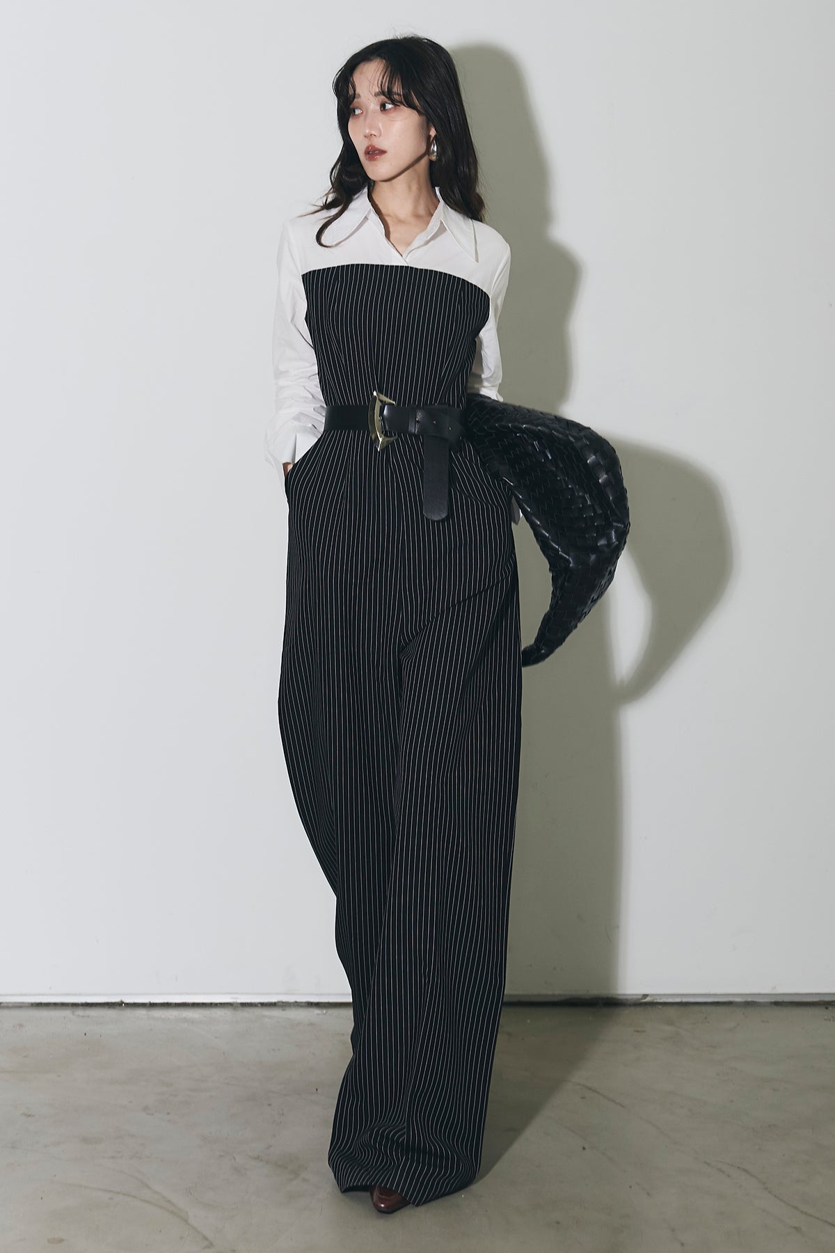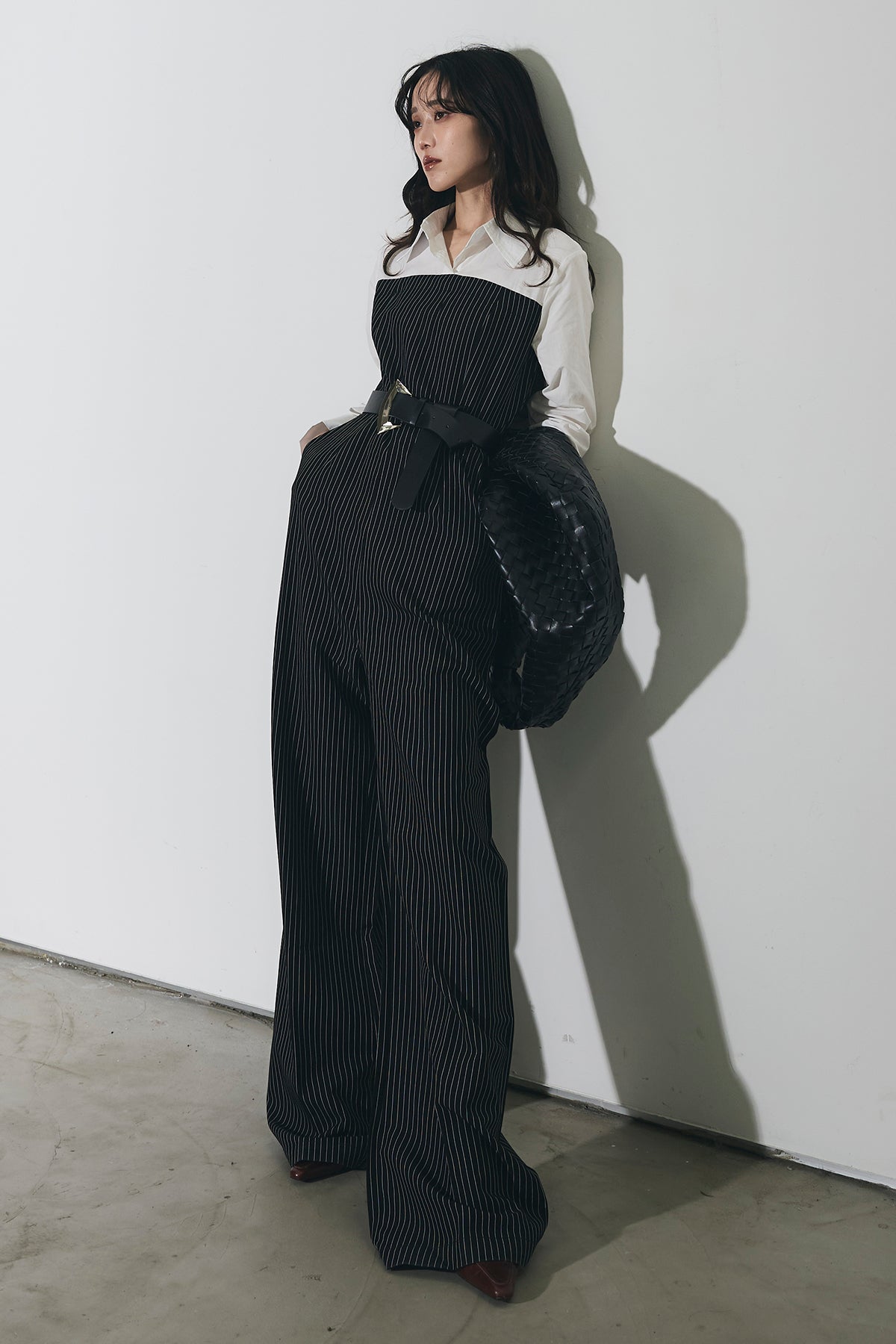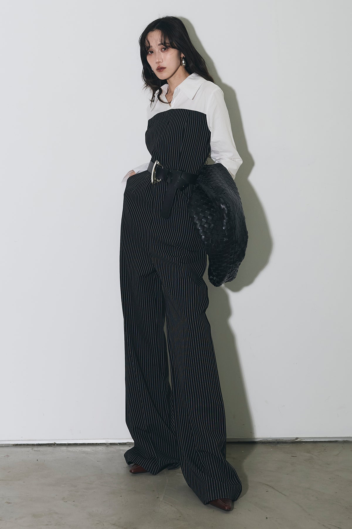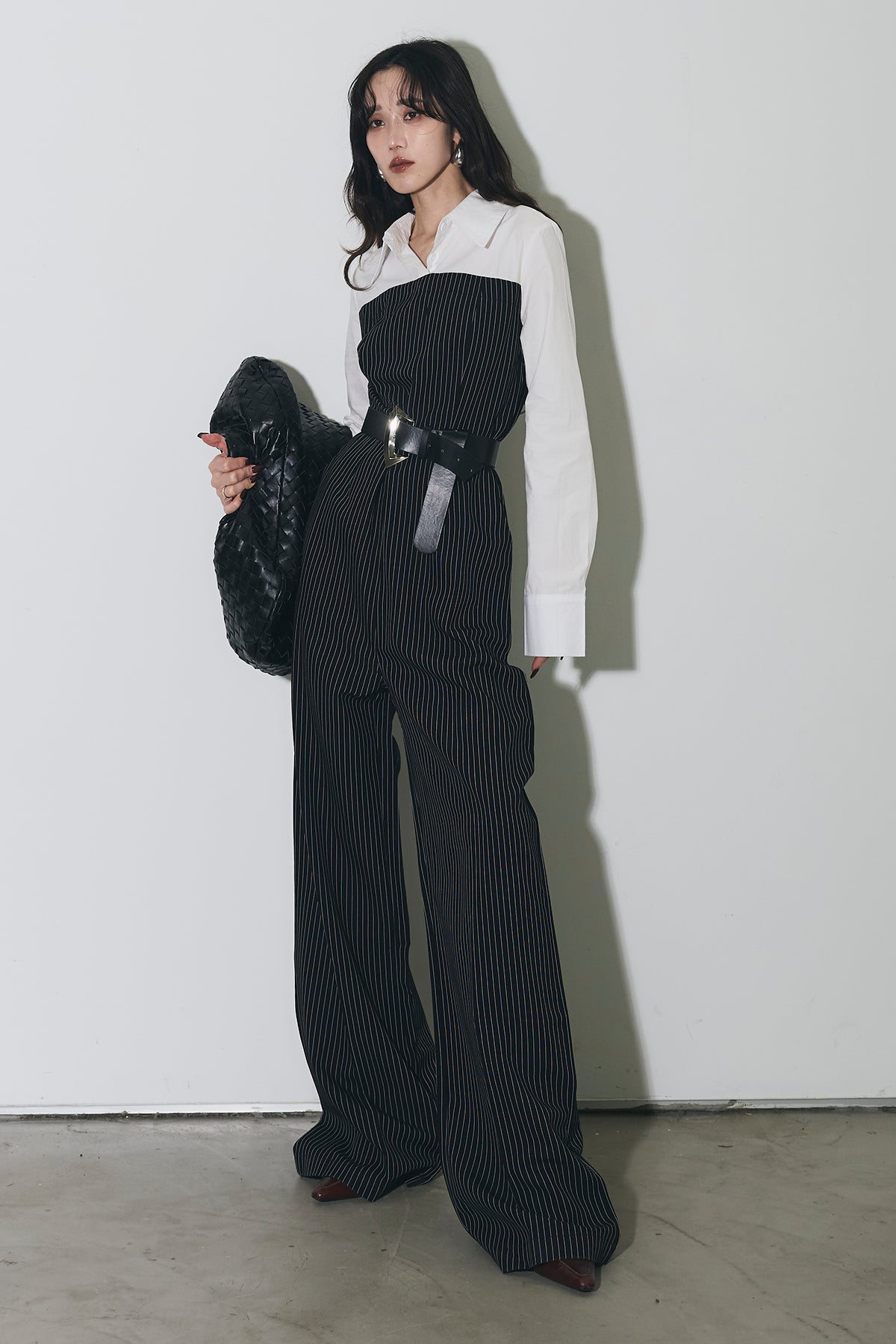 ストライプ柄が縦のラインを強調するオールインワン。 シャツをレイヤードしたようなデザインで、1枚でスタイリングが完成します。 ウエストベルト付きで、シルエットにメリハリをプラス。 きれいめからモードまで幅広く活躍するアイテムです。