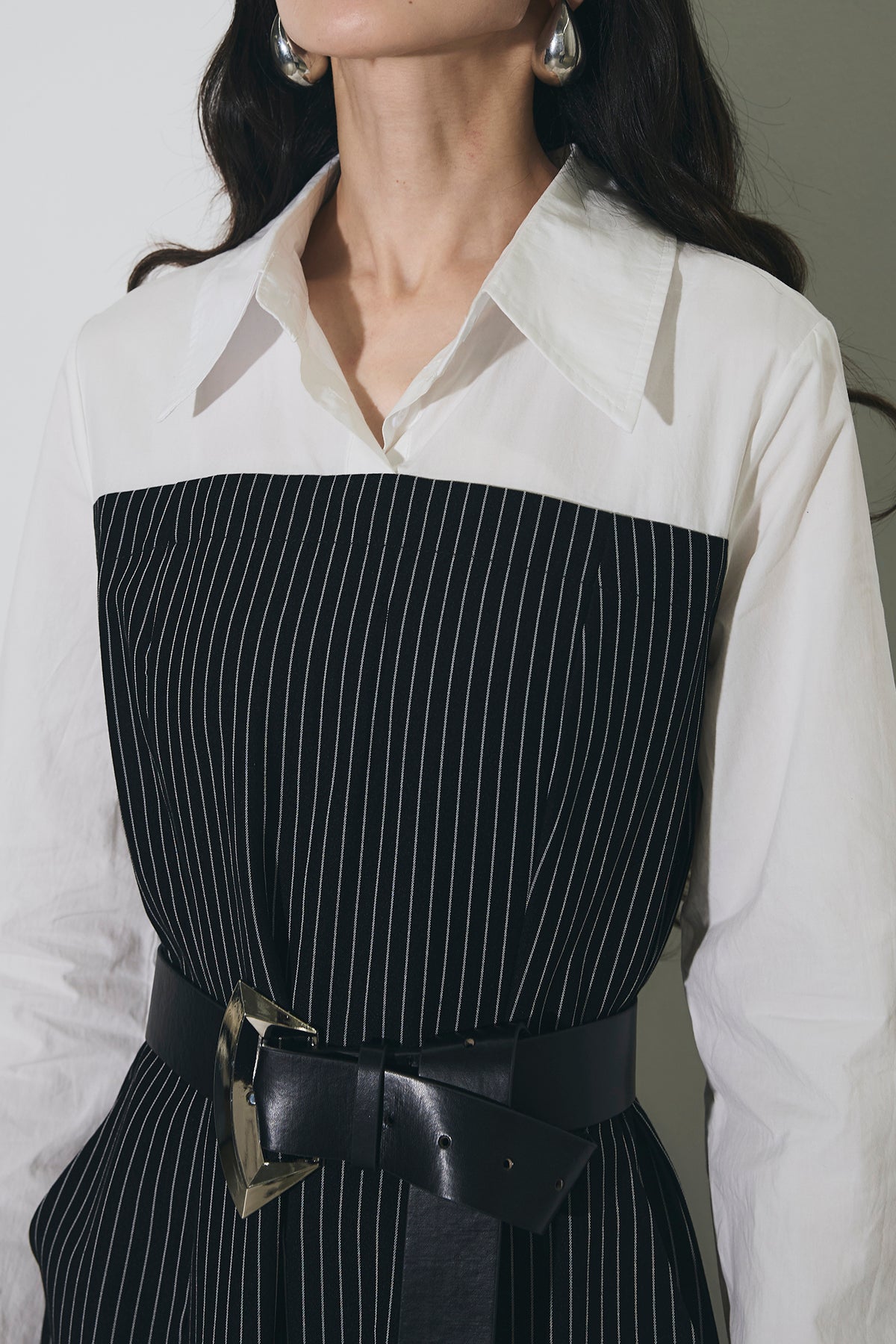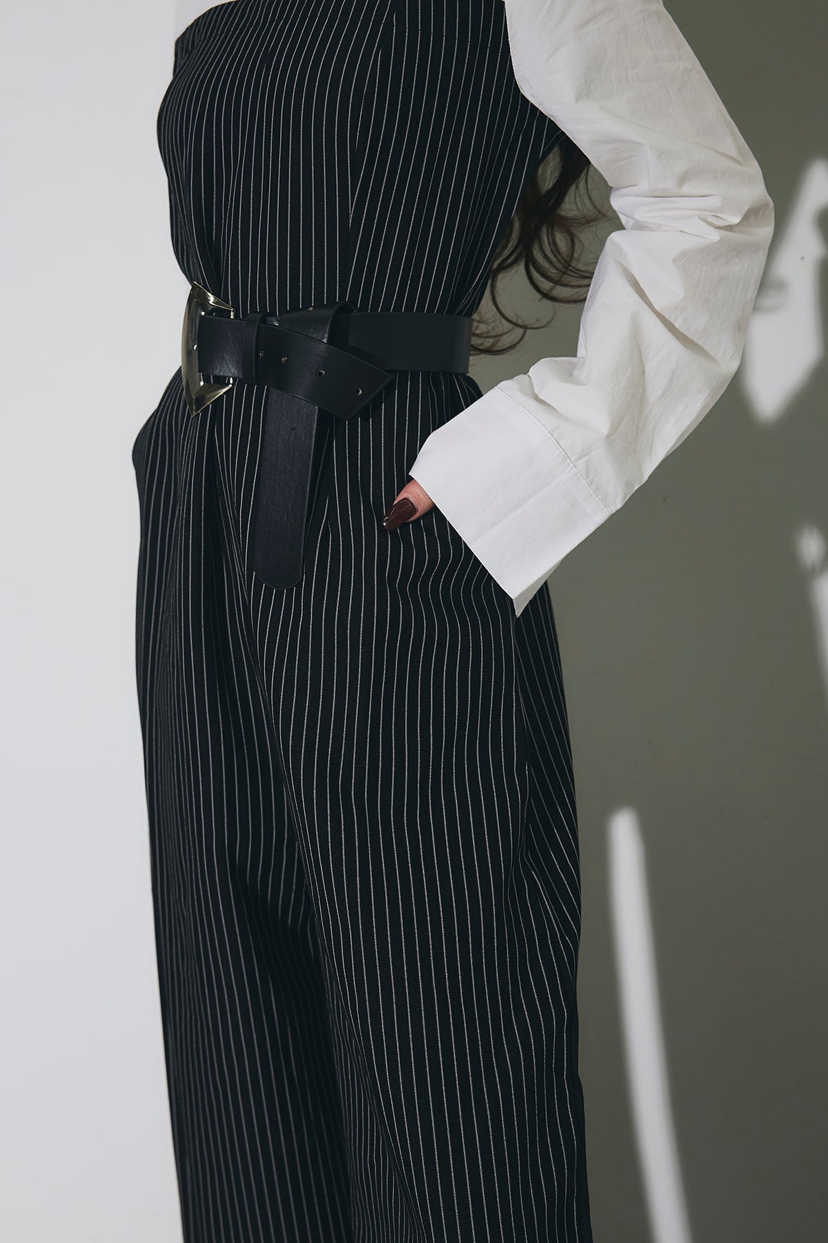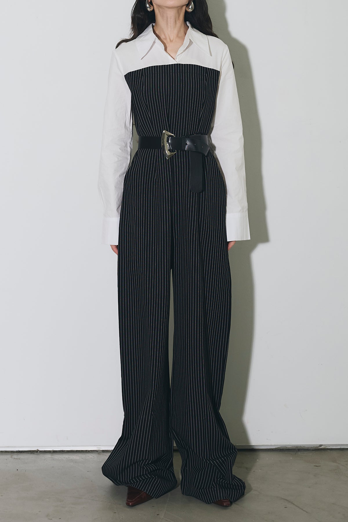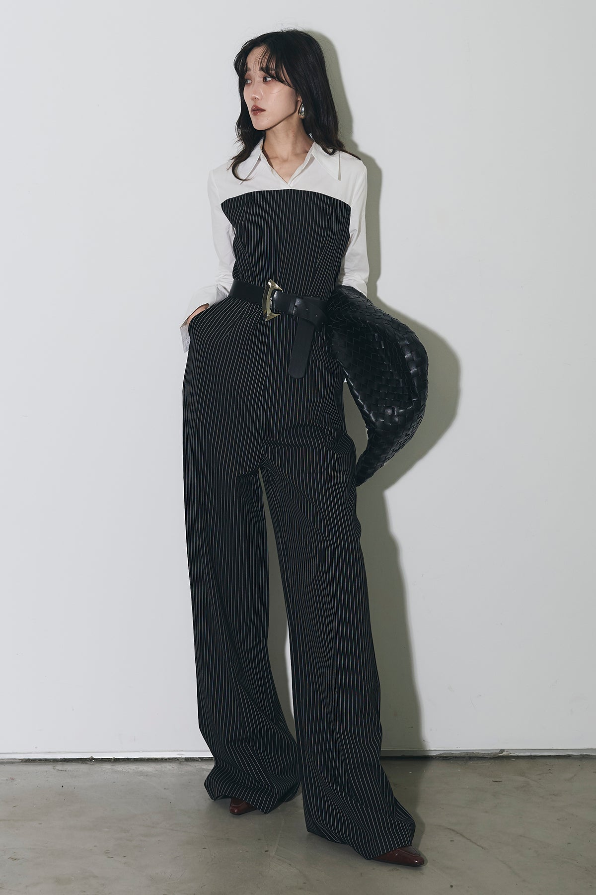 ストライプ柄が縦のラインを強調するオールインワン。 シャツをレイヤードしたようなデザインで、1枚でスタイリングが完成します。 ウエストベルト付きで、シルエットにメリハリをプラス。 きれいめからモードまで幅広く活躍するアイテムです。