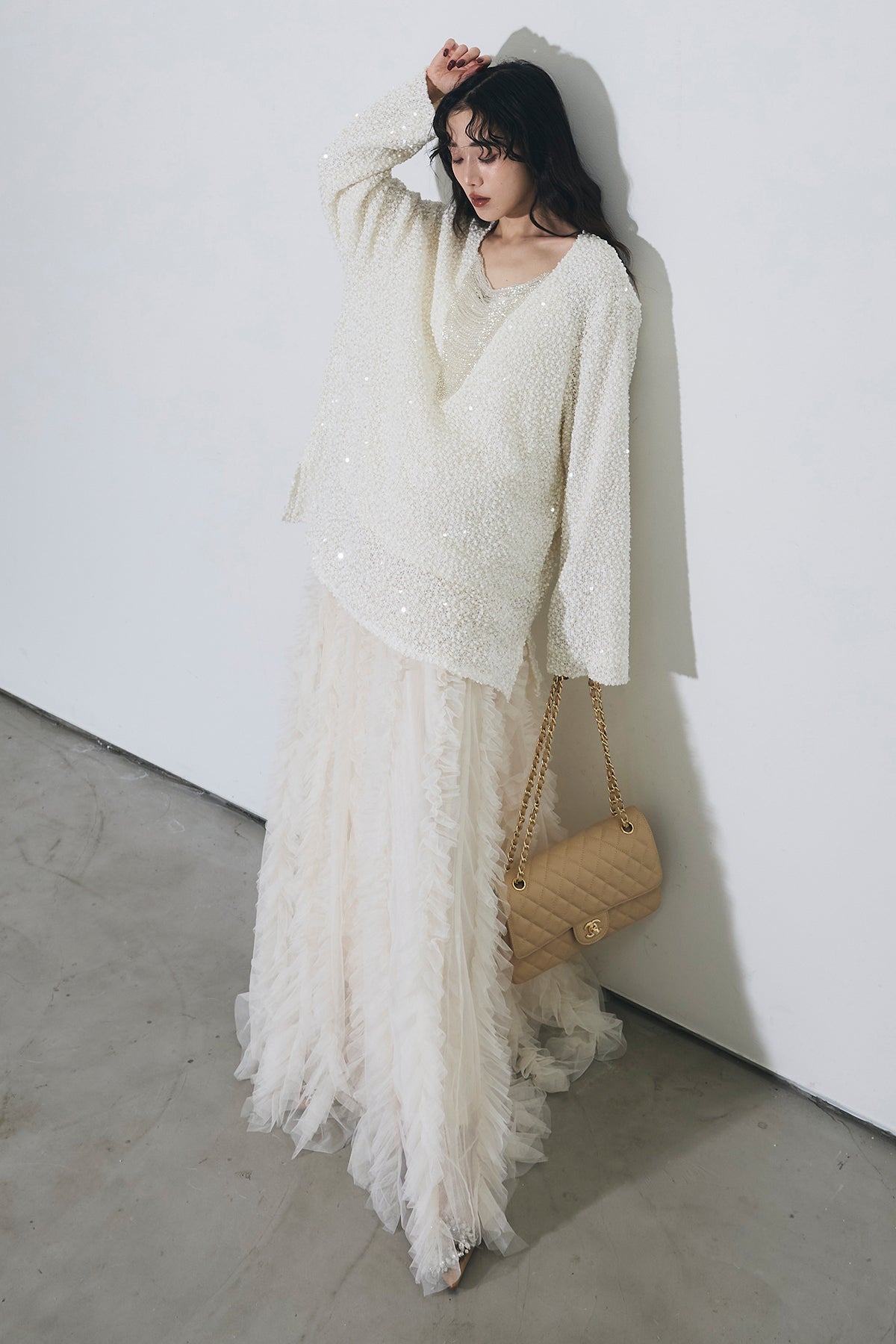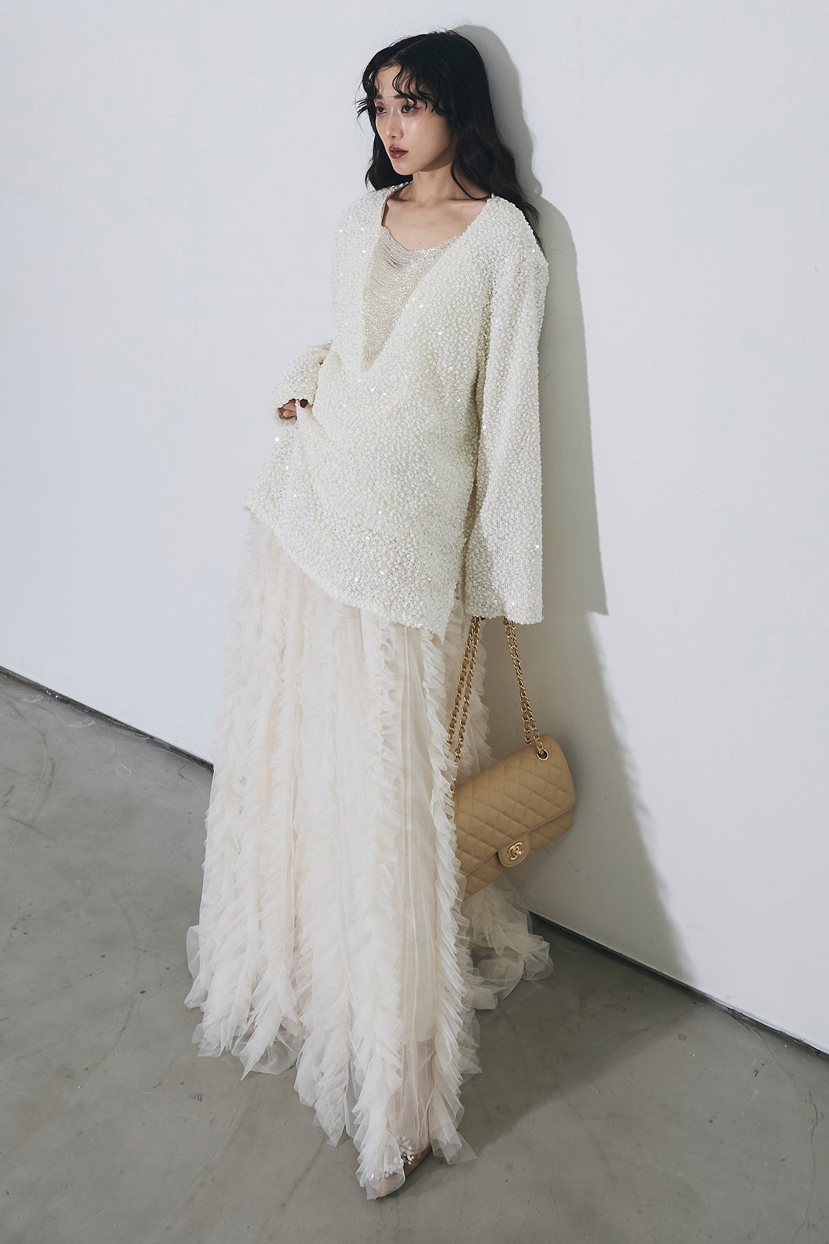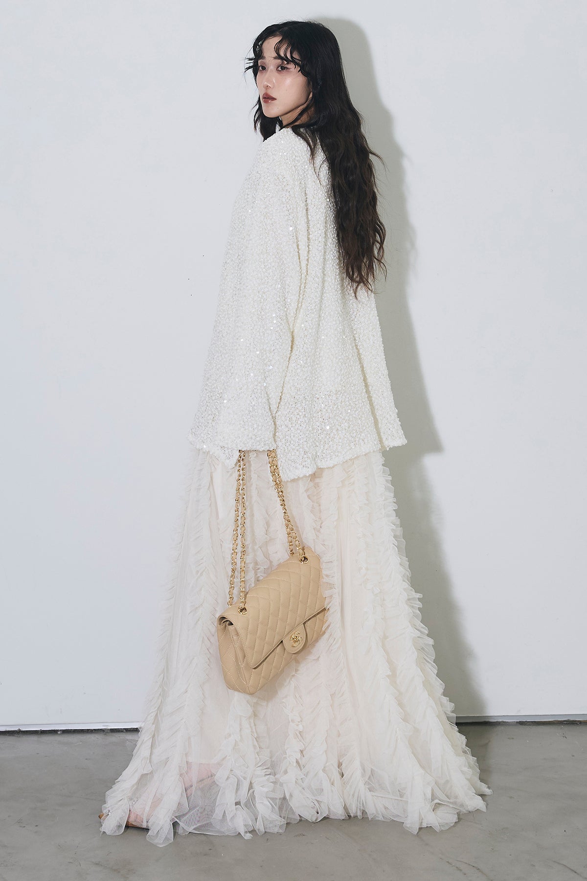 ご注文前に必ずページ下部「お届け期間」をご確認くださいませ。軽やかな透け感が魅力のロングスカート。繊細なチュールを贅沢に重ね、動くたびにふわりと広がるエアリーなシルエットに仕上げました。ウエストから自然に落ちるデザインで甘さがありながらも上品な印象に。ボリュームがありつつも軽やかな素材感で、ニットやコンパクトなトップスと合わせるだけで華やかなスタイリングが完成します。特別なシーンにもデイリーにも活躍する一枚です。