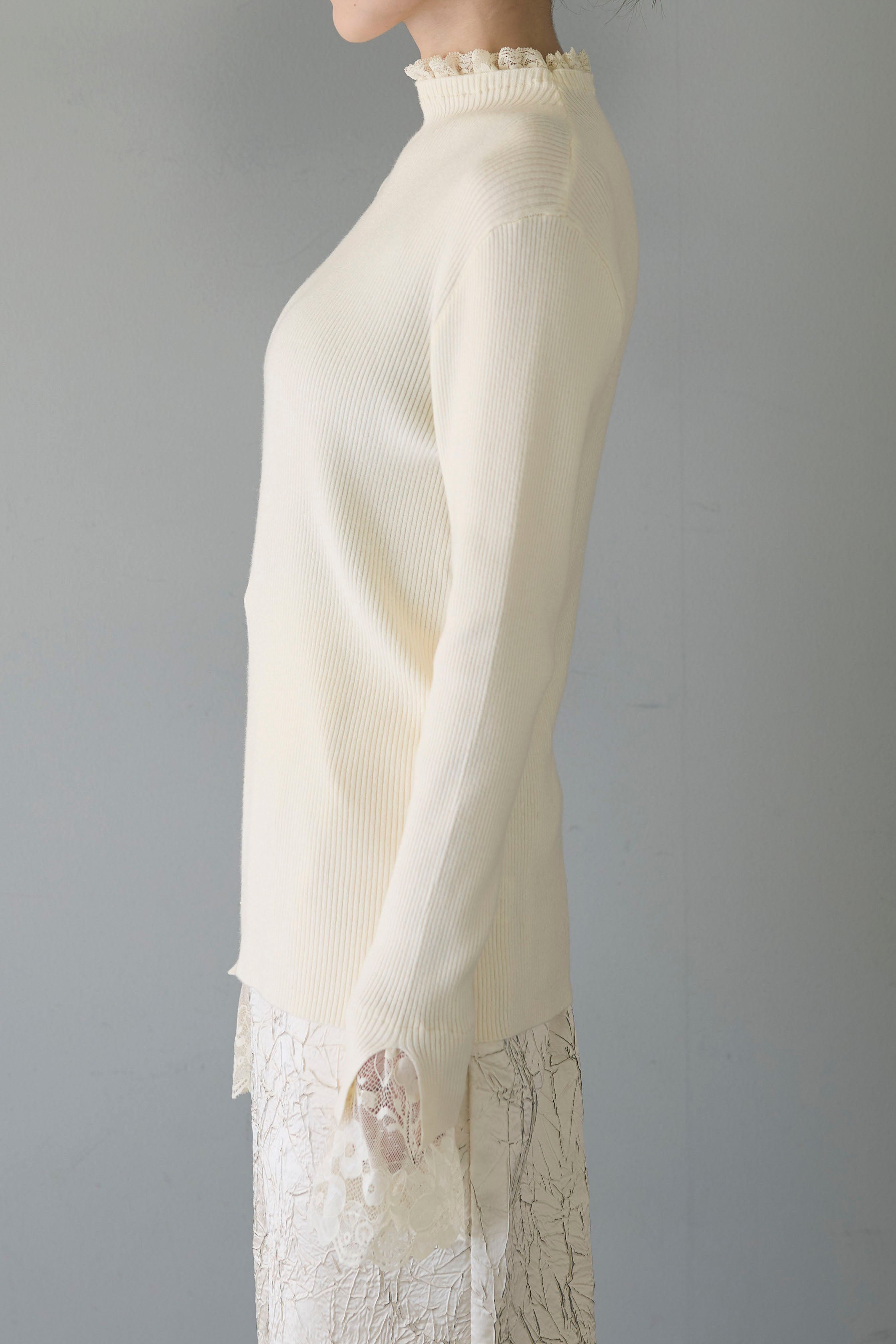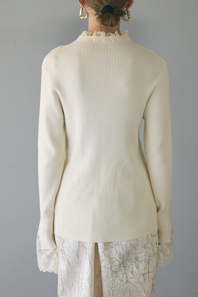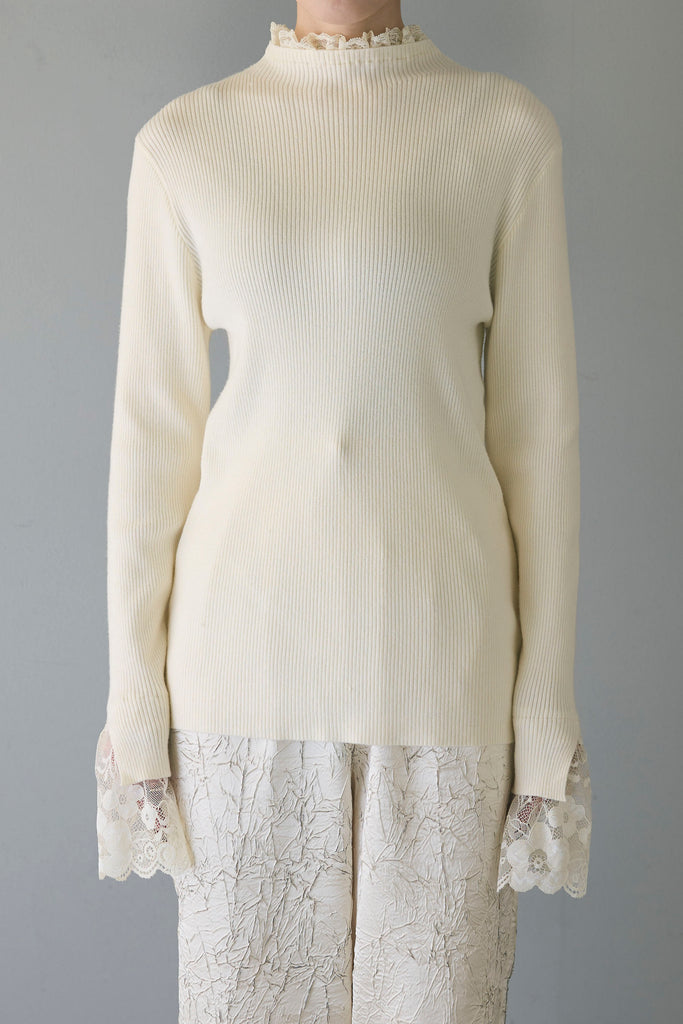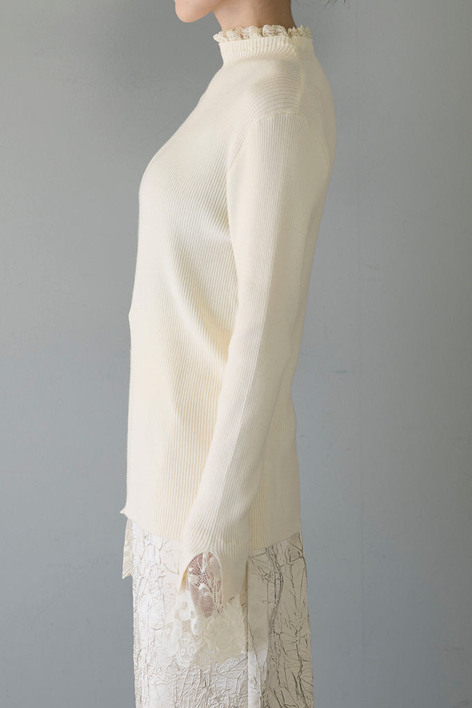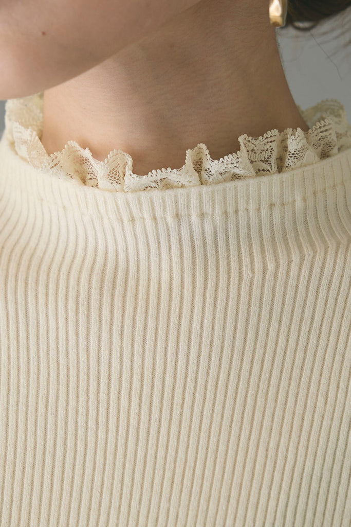 上品なフリルと繊細なレースが魅力の一着です。ハイネックのデザインが首元を華やかに飾り、フェミニンな印象を演出します。袖口にもレースがあしらわれており、ディテールにこだわったデザインが特徴です。しっかりとしたリブ素材で、体に程よくフィットし、美しいシルエットを実現します。単品でも存在感があり、レイヤードスタイルにもぴったりの万能アイテムです。