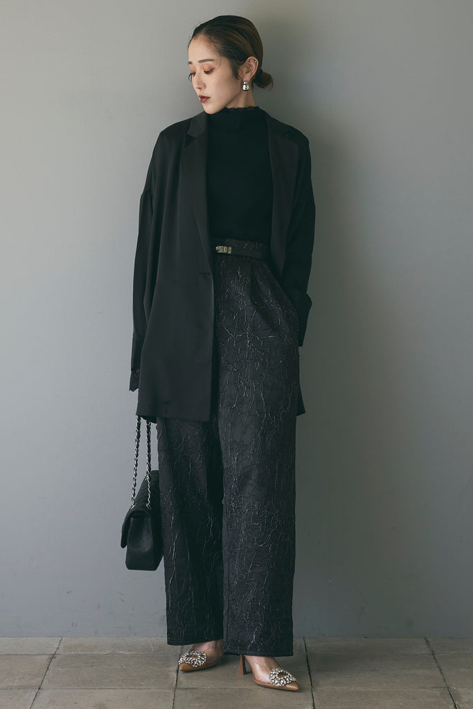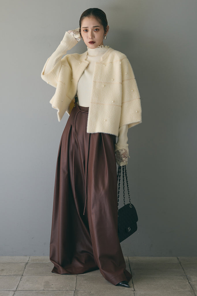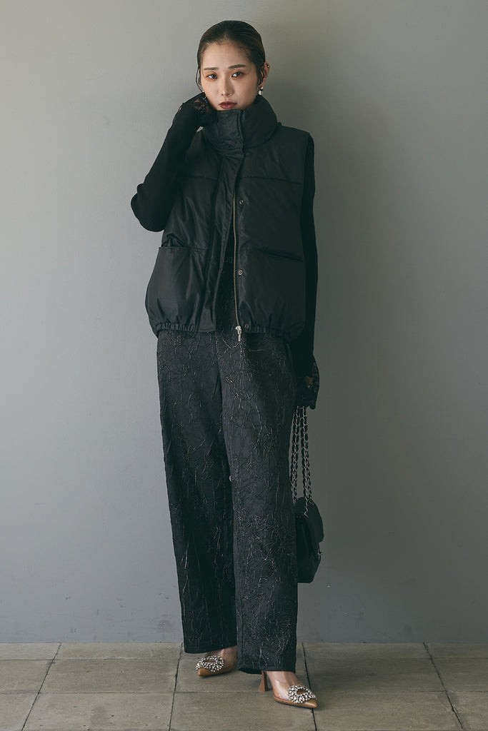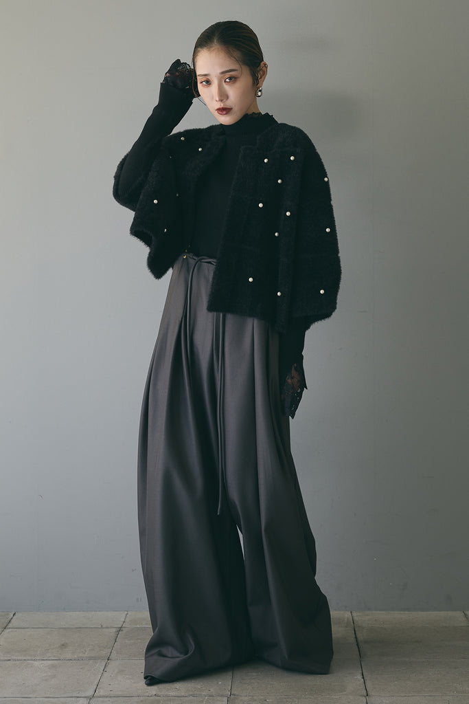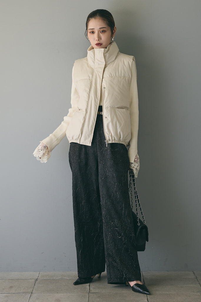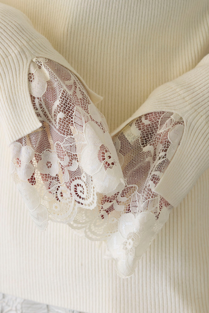 上品なフリルと繊細なレースが魅力の一着です。ハイネックのデザインが首元を華やかに飾り、フェミニンな印象を演出します。袖口にもレースがあしらわれており、ディテールにこだわったデザインが特徴です。しっかりとしたリブ素材で、体に程よくフィットし、美しいシルエットを実現します。単品でも存在感があり、レイヤードスタイルにもぴったりの万能アイテムです。