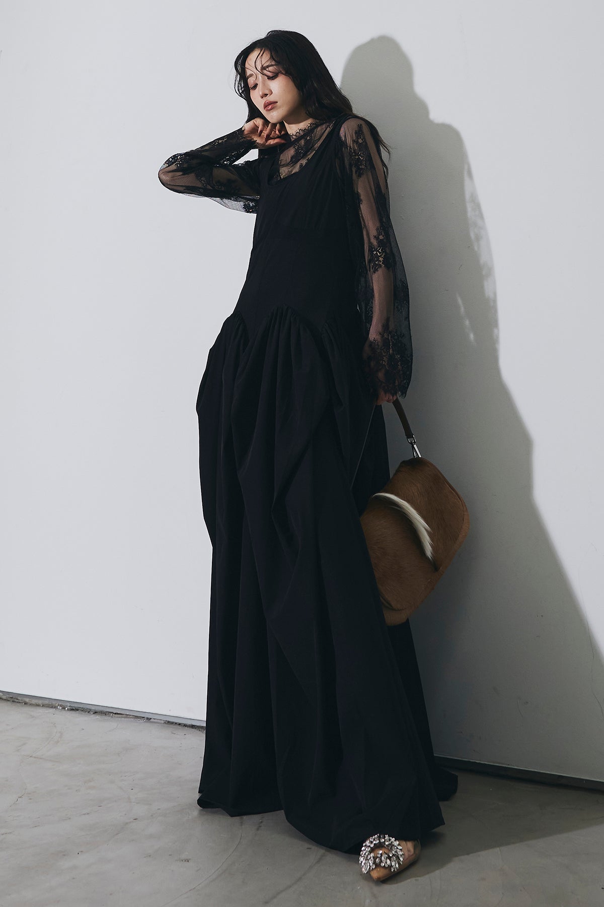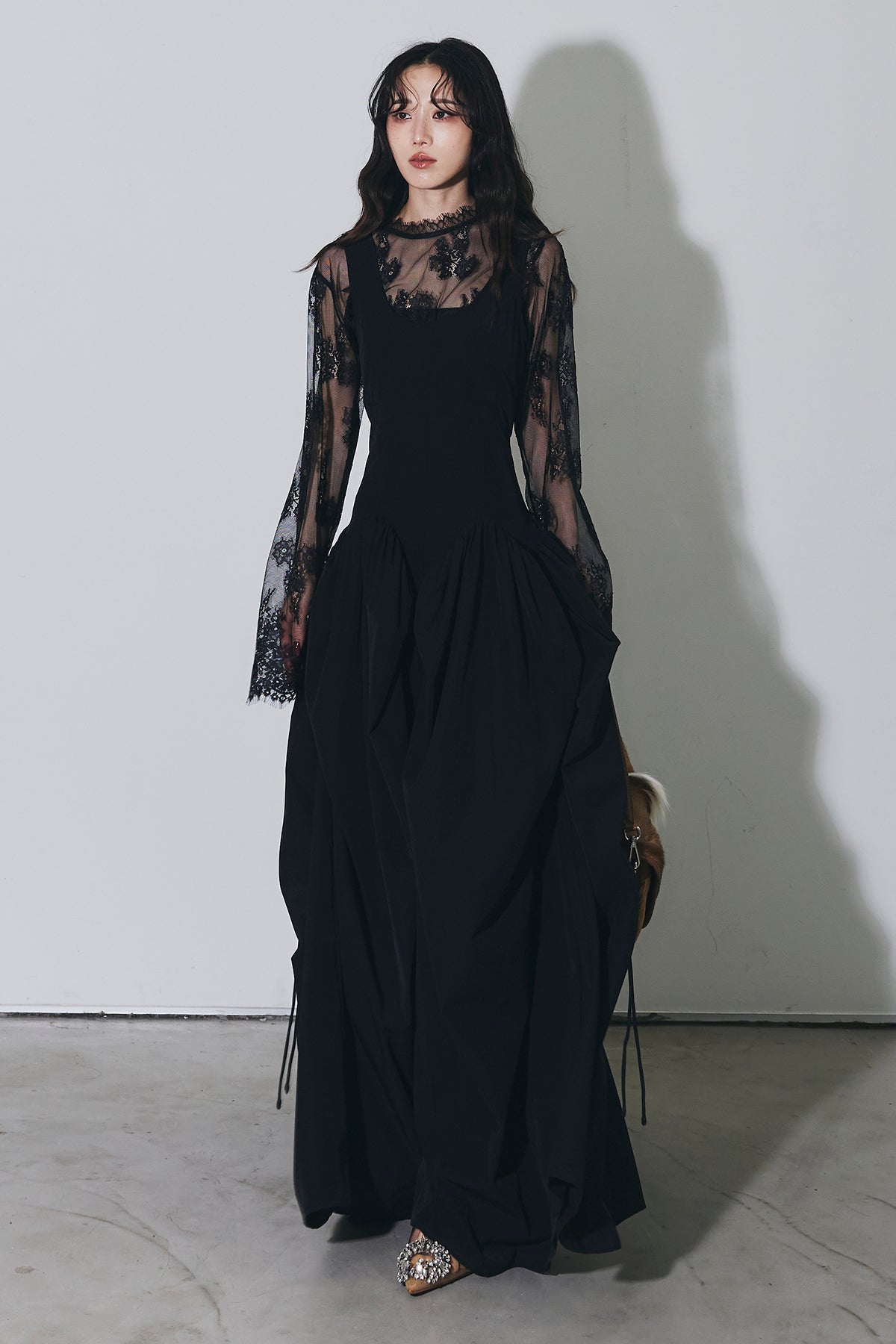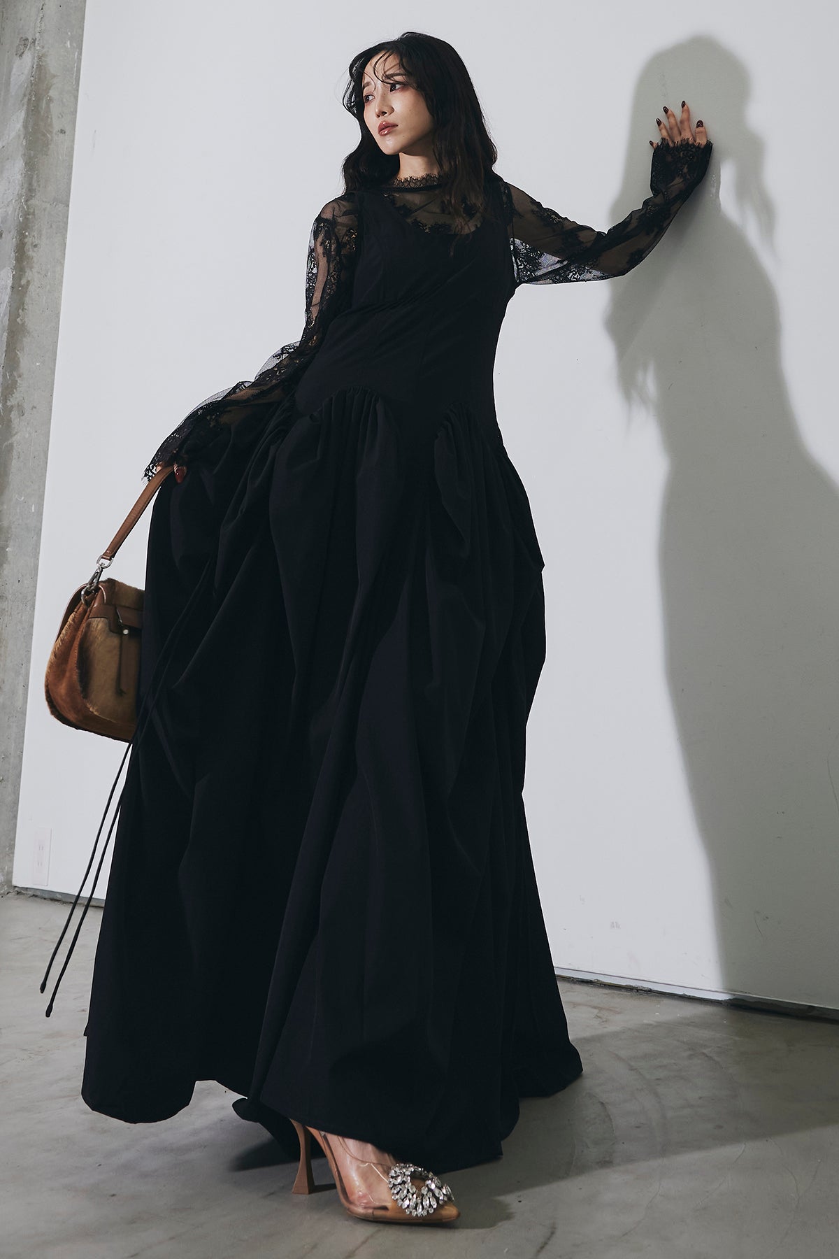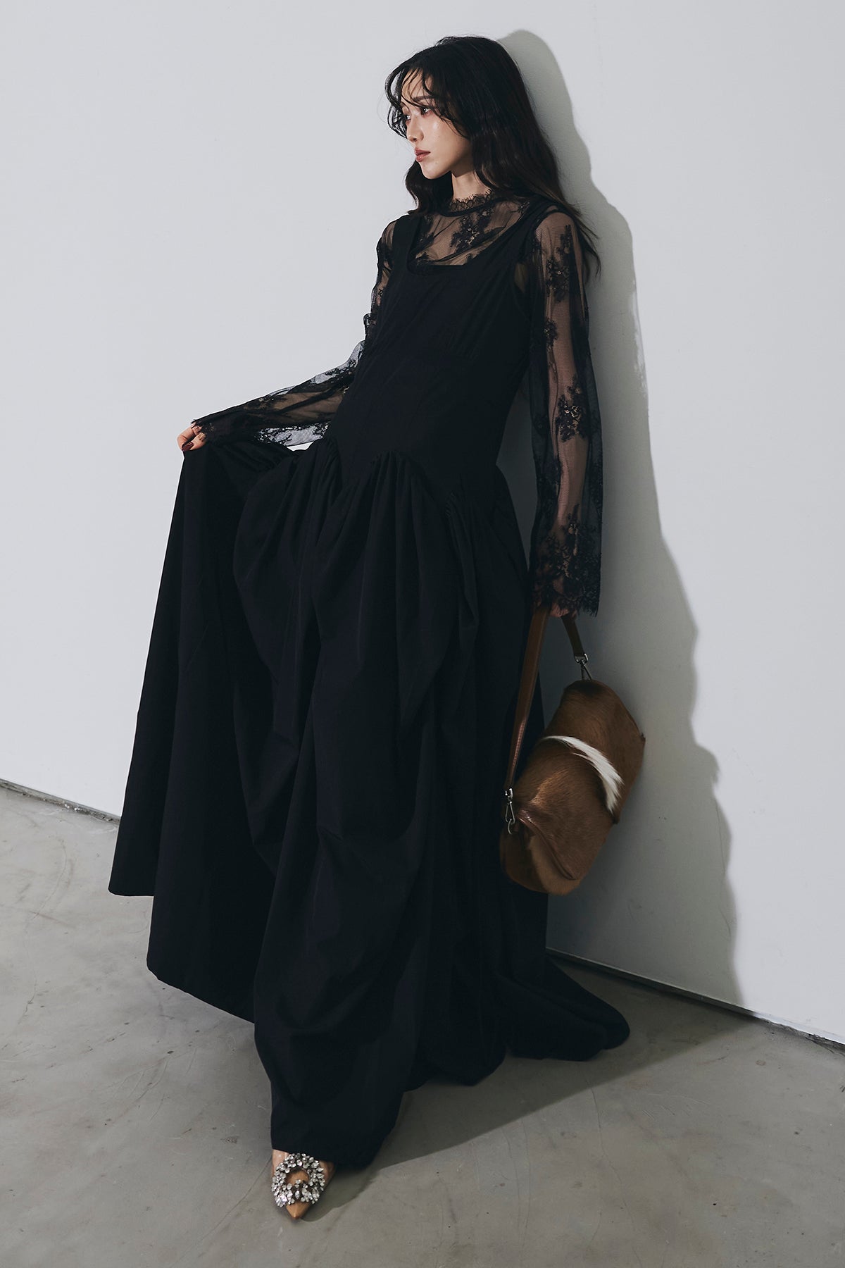 ご注文前に必ずページ下部「お届け期間」をご確認くださいませ。ドラマティックなシルエットが魅力のロングドレス。立体感のあるスカートデザインが動きに表情を生み、存在感のあるスタイルを演出します。インナーとのレイヤードで奥行きのある着こなしが楽しめる一着。特別なシーンにも映える、モードな雰囲気のアイテムです。