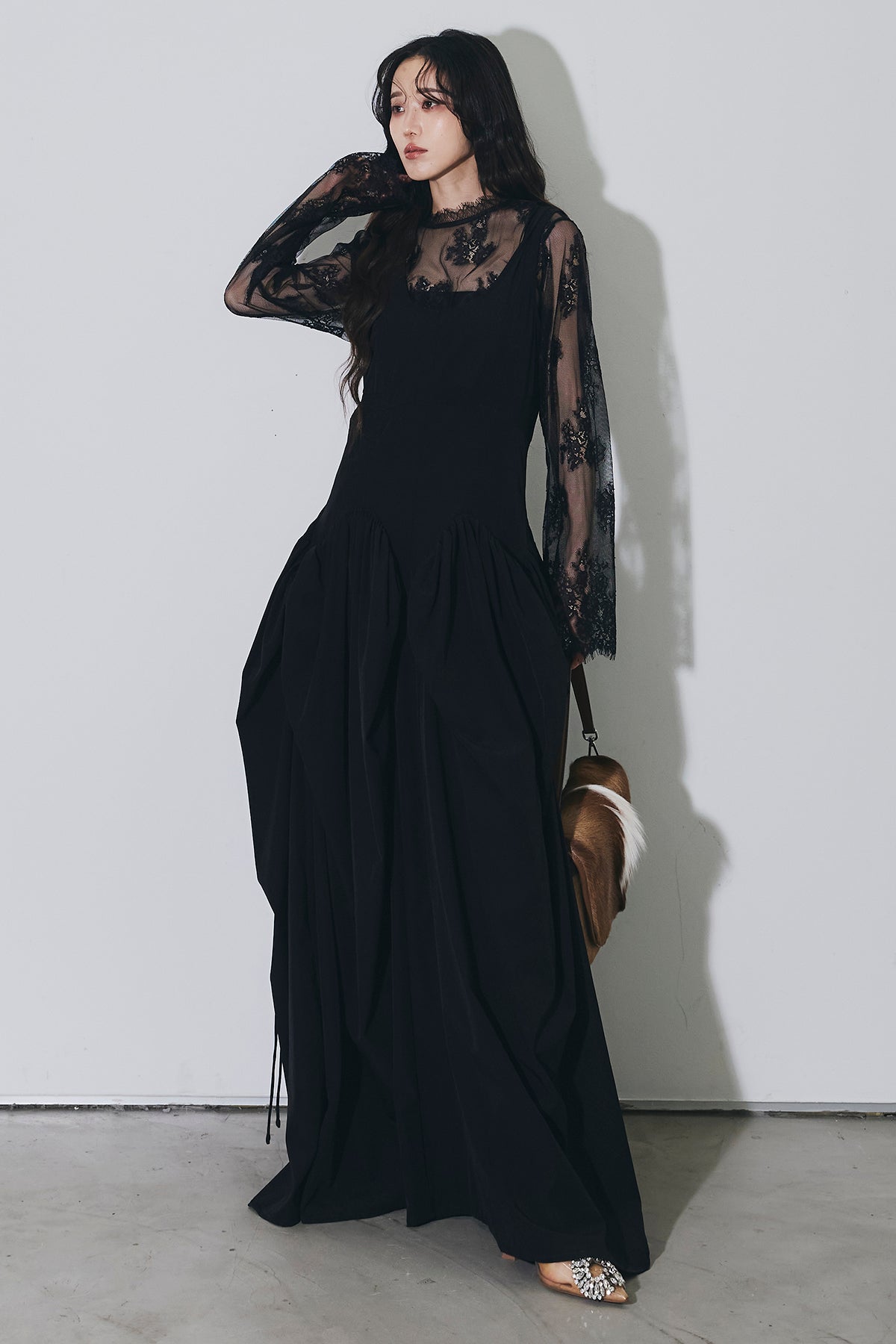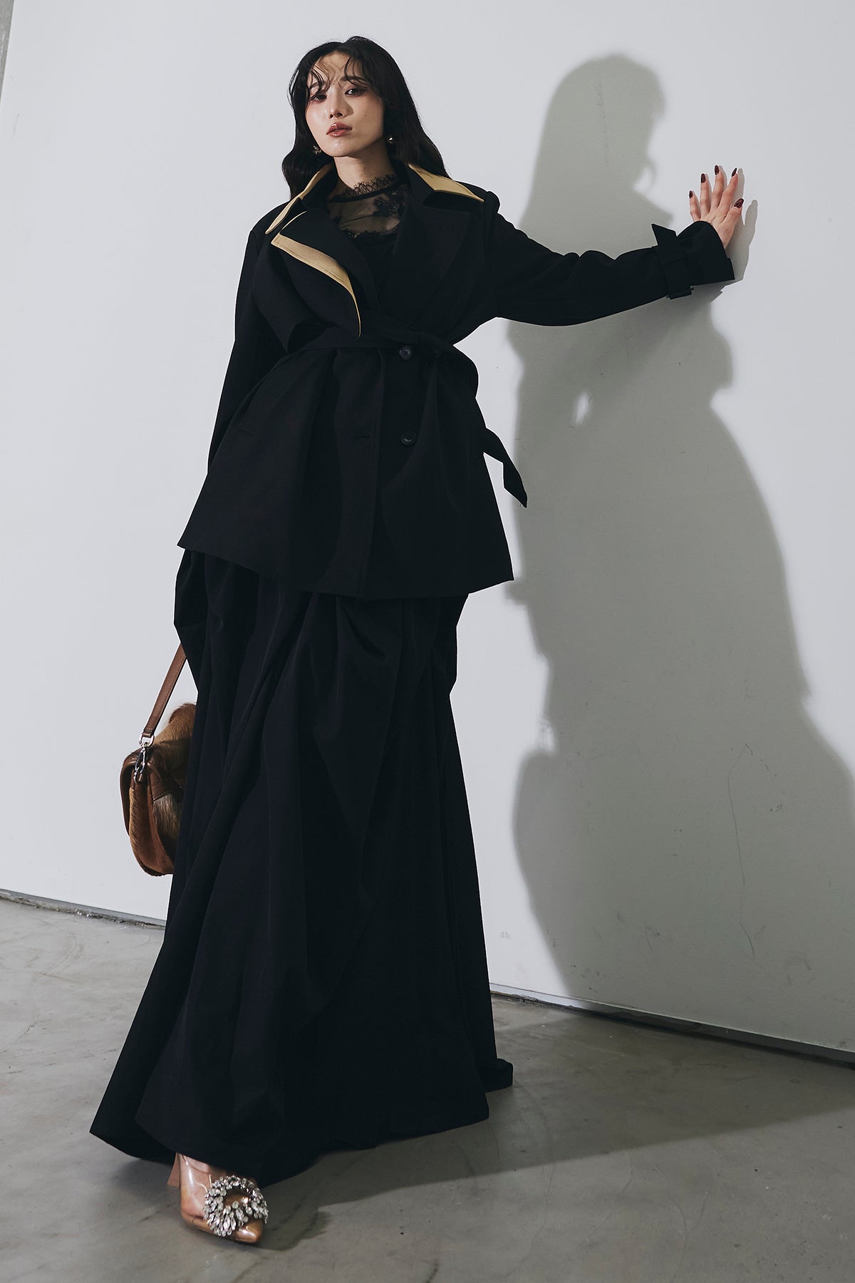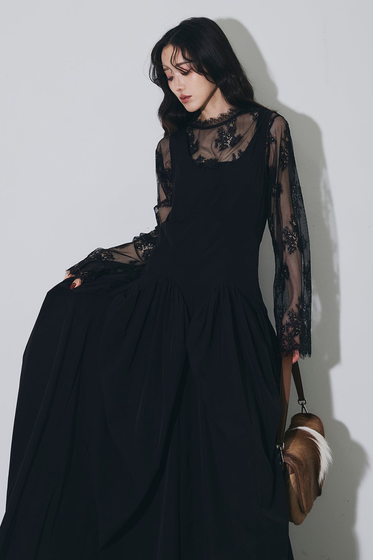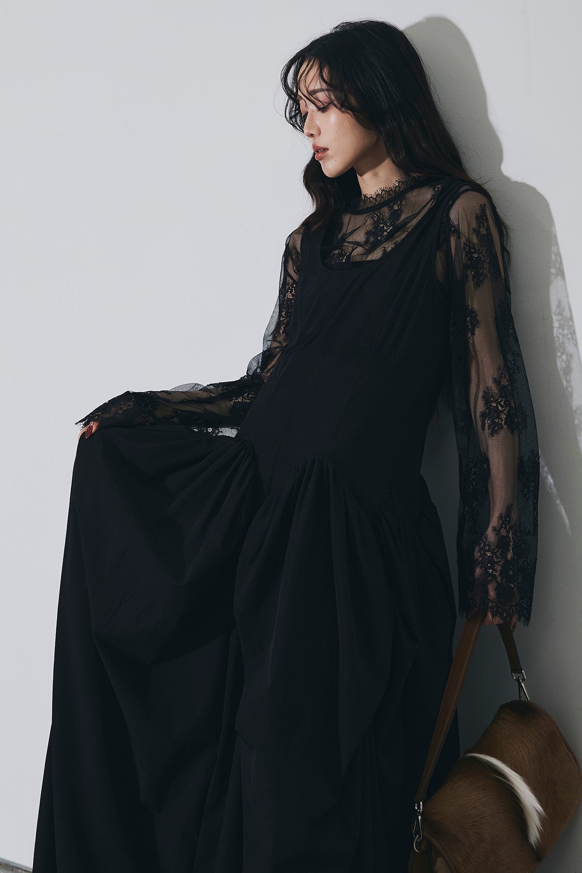 ご注文前に必ずページ下部「お届け期間」をご確認くださいませ。ドラマティックなシルエットが魅力のロングドレス。立体感のあるスカートデザインが動きに表情を生み、存在感のあるスタイルを演出します。インナーとのレイヤードで奥行きのある着こなしが楽しめる一着。特別なシーンにも映える、モードな雰囲気のアイテムです。