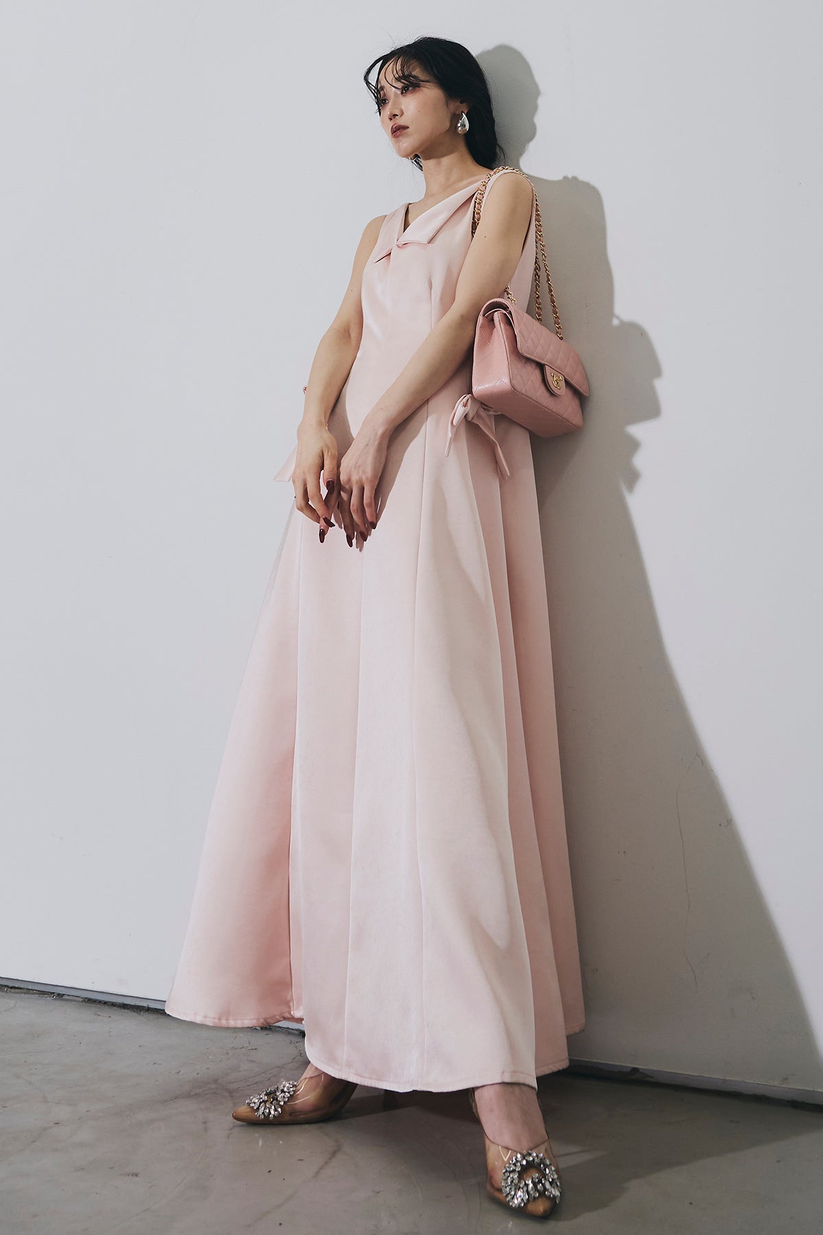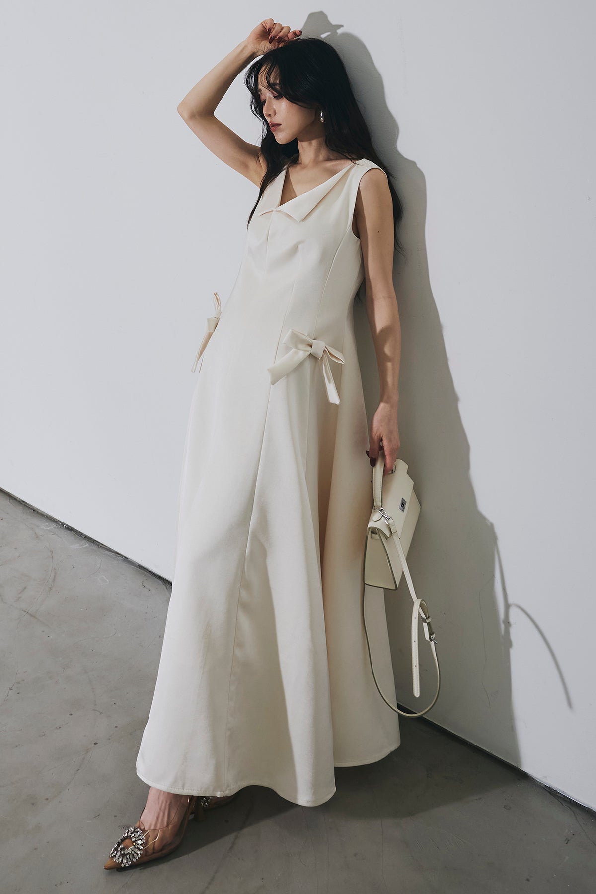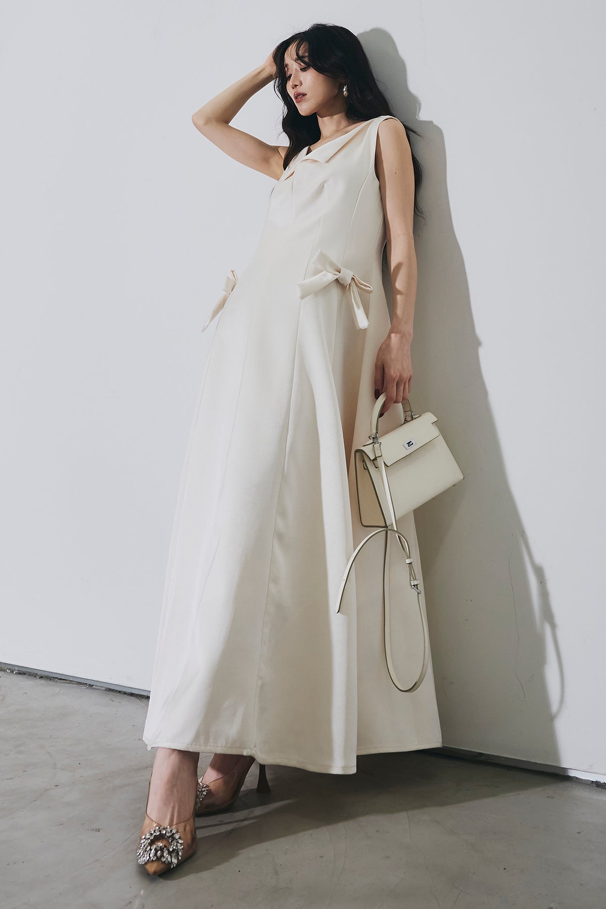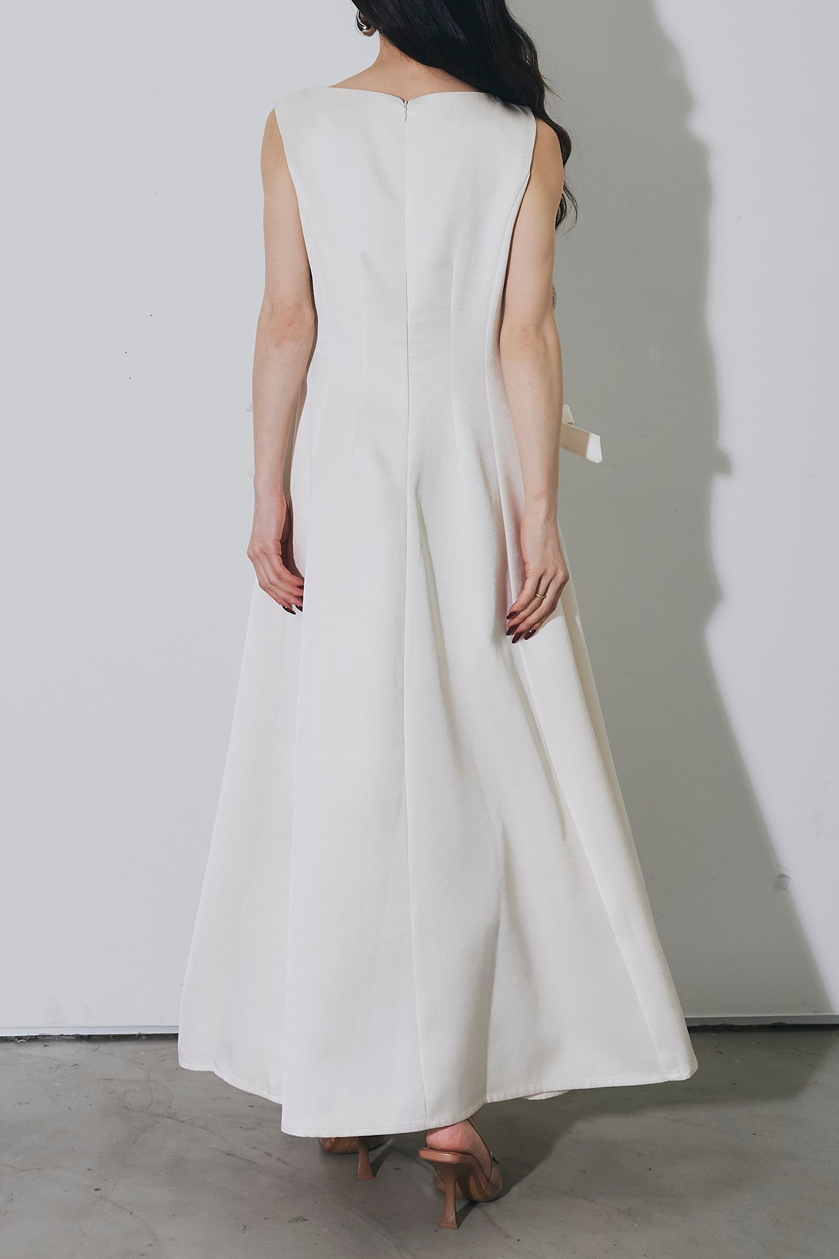 ご注文前に必ずページ下部「お届け期間」をご確認くださいませ。上品なシルエットが際立つロングワンピース。程よく広がるフレアラインが女性らしい印象を演出します。ウエストサイドのリボンデザインがさりげないアクセントに。シンプルながらも華やかさを兼ね備えた、特別なシーンにも映える一着です。
