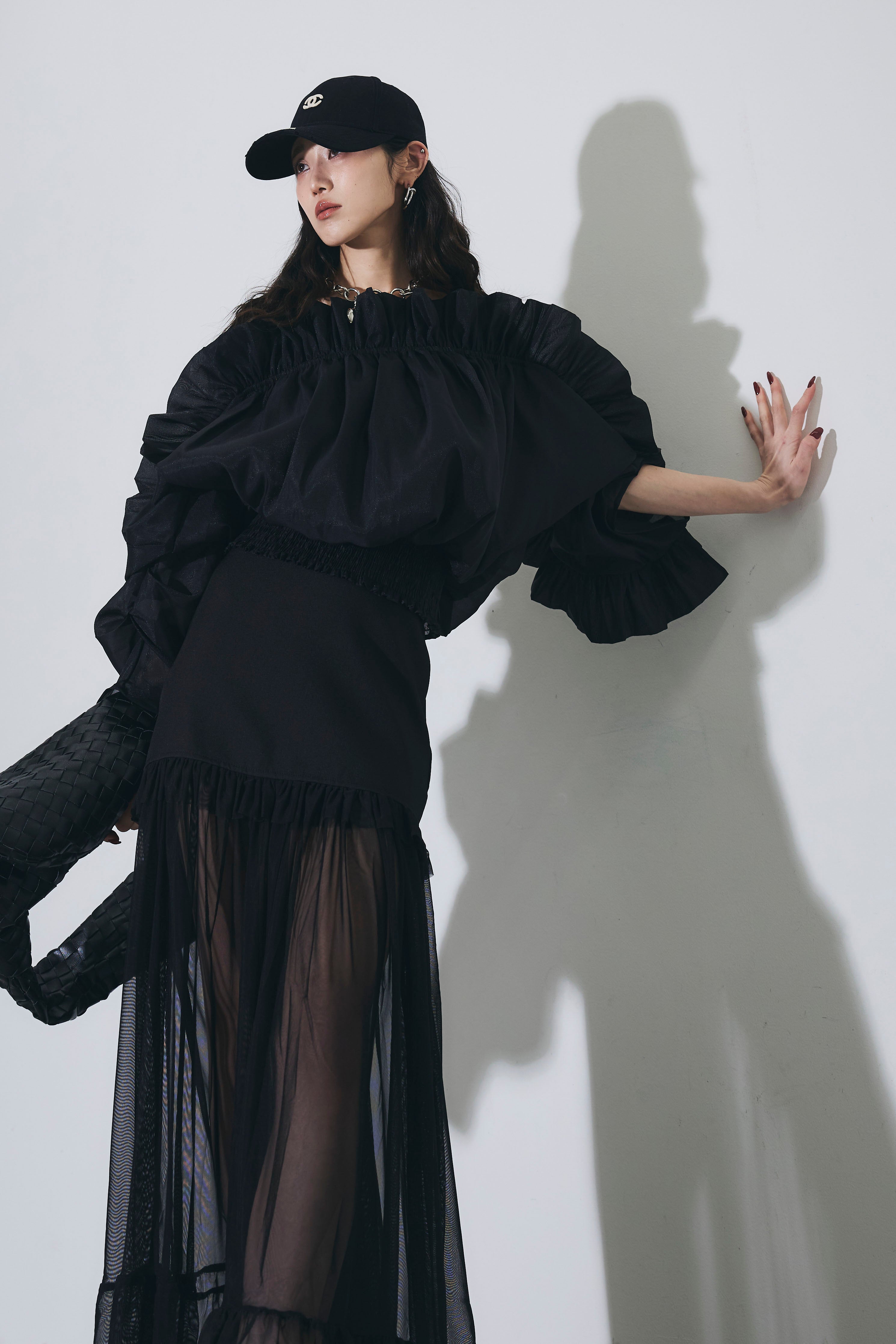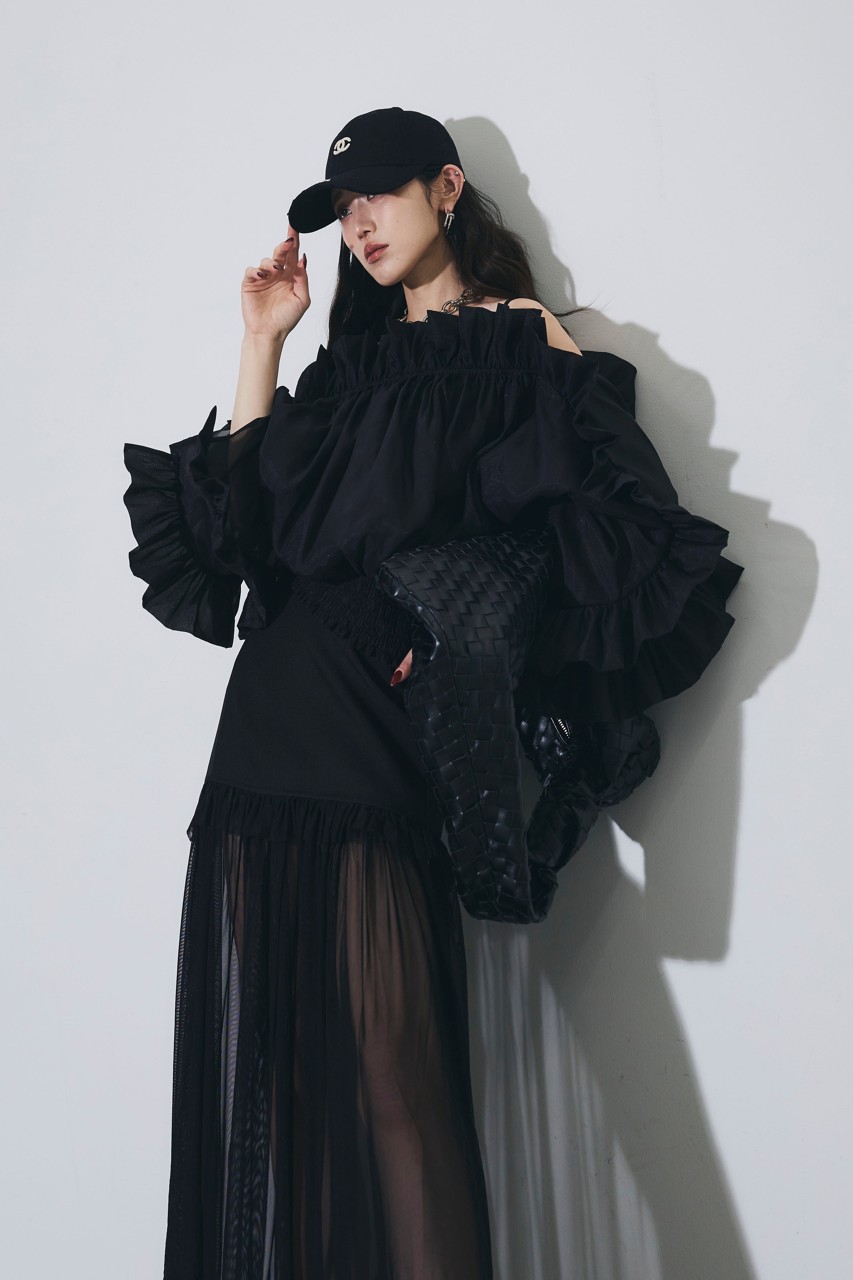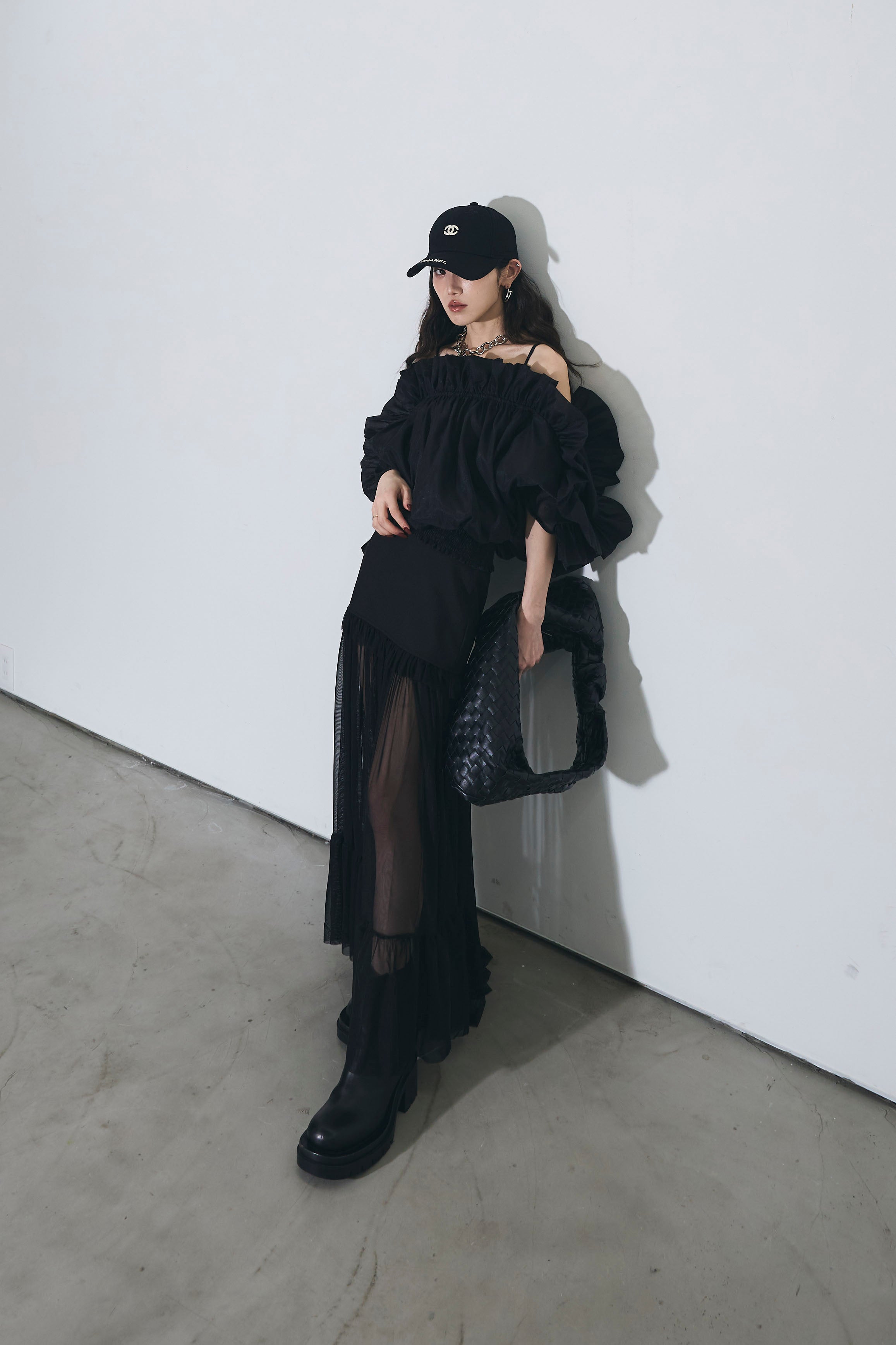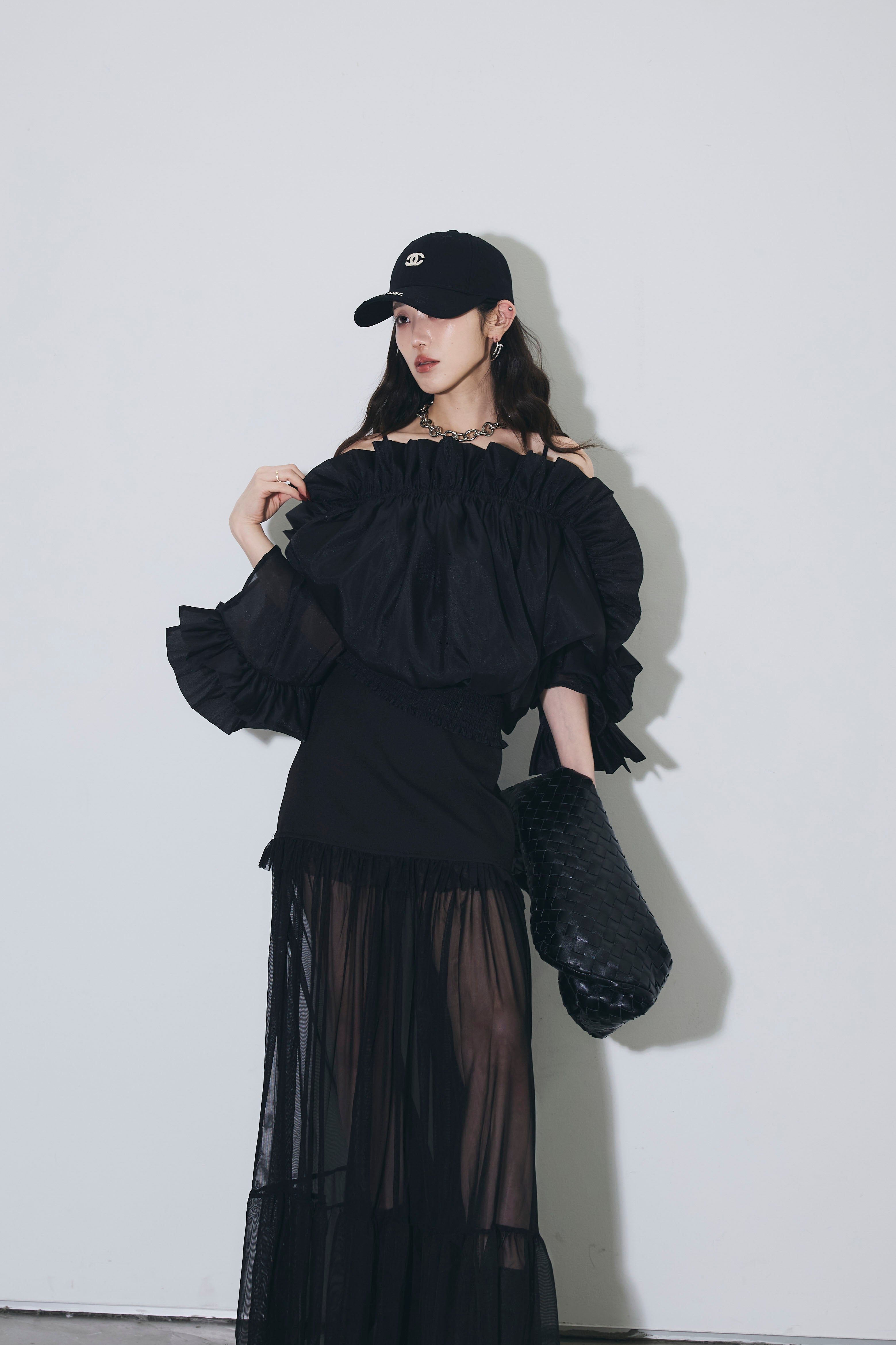 ご注文前に必ずページ下部「お届け期間」をご確認くださいませ。肩まわりを美しく見せるオフショルデザインに、たっぷり寄せたギャザーとボリュームスリーブがドラマティックな表情を添えるブラウスで、シンプルなボトムに合わせるだけで一気に華やぐ主役トップス。