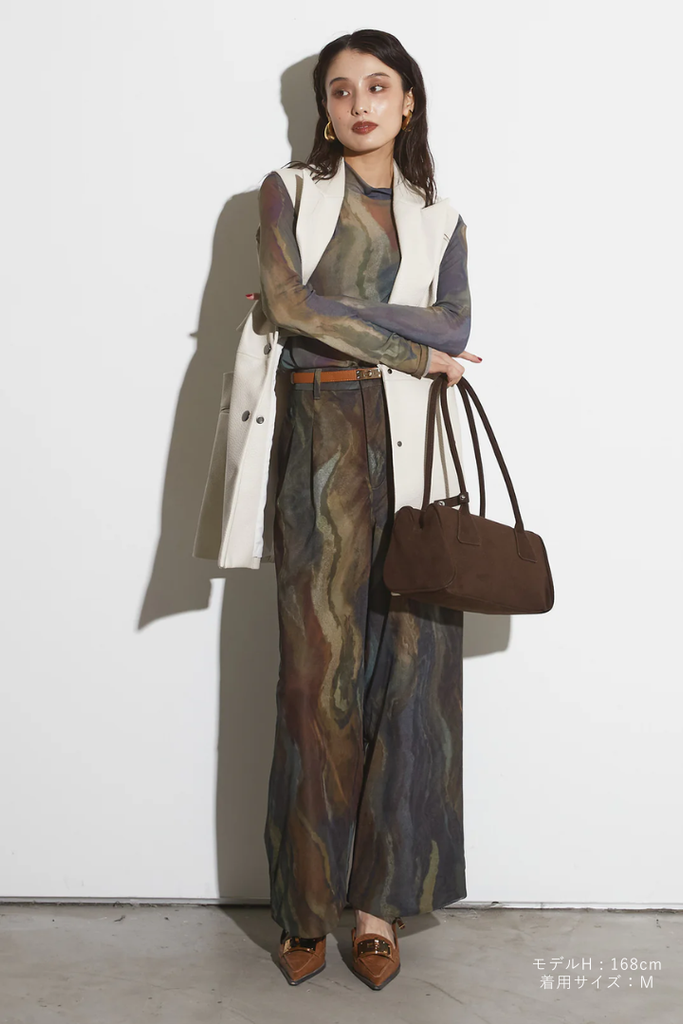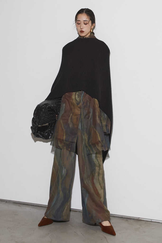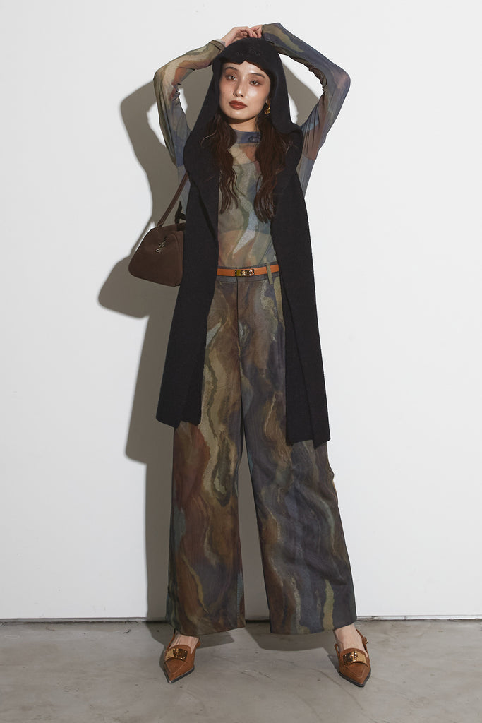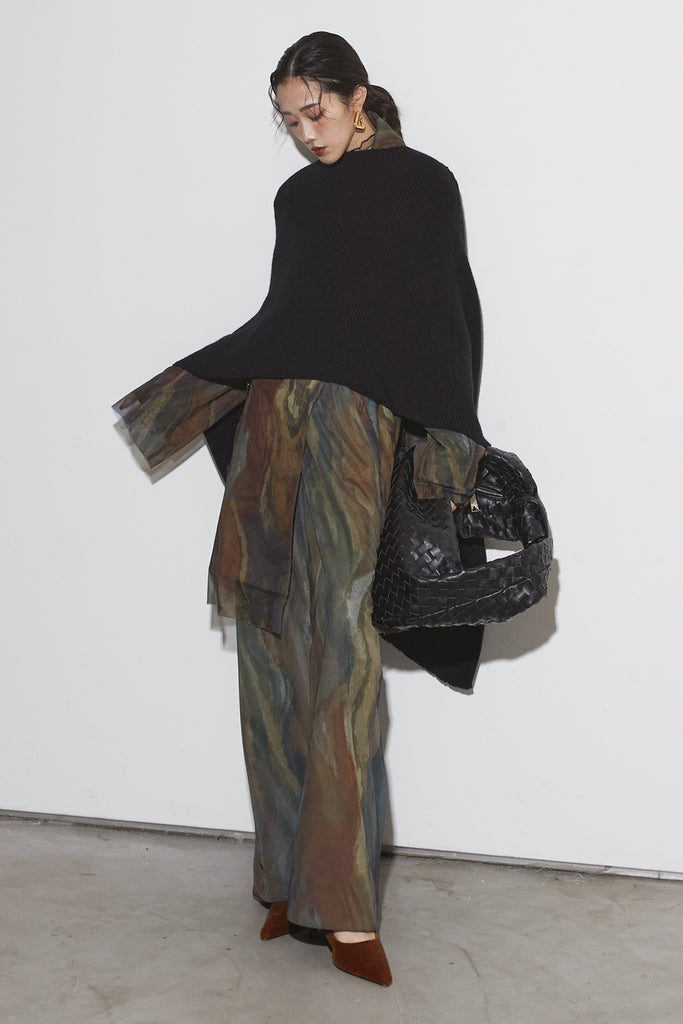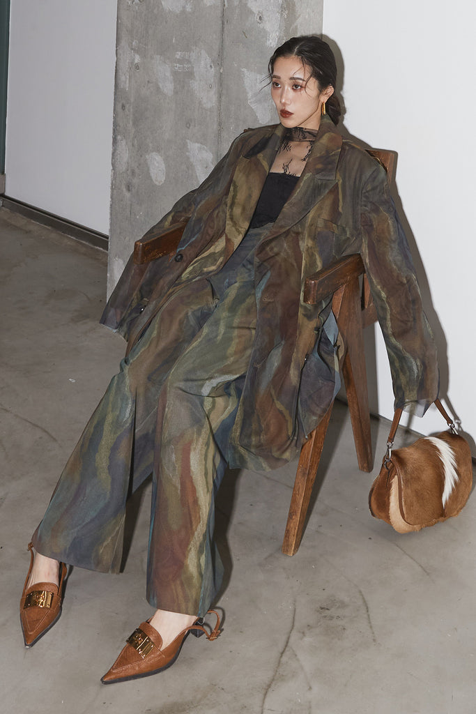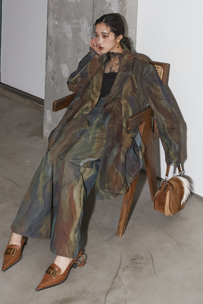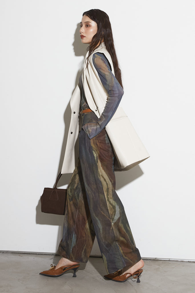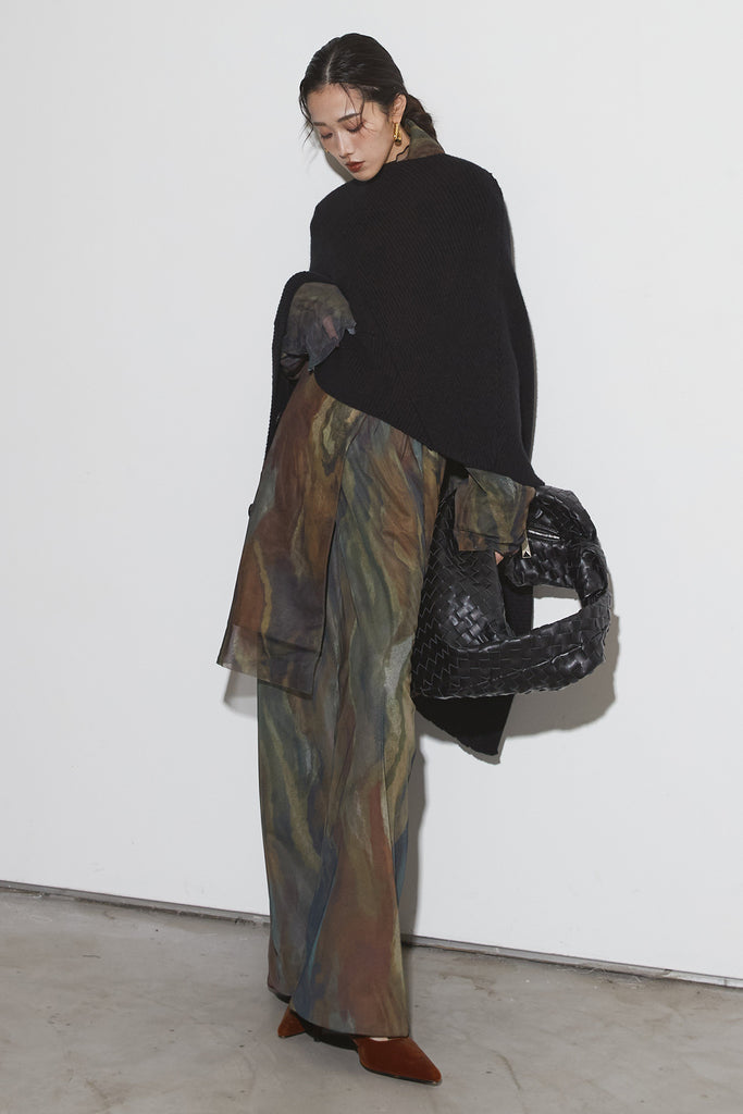 アーティスティックなプリントが施されたチュール素材のパンツ。透け感と深みのある色調が重なり合い、まるで絵画のような奥行きを生み出します。軽やかな素材ながら、タックを入れることで美しいシルエットを構築。動くたびに柔らかく揺れ、印象的なスタイルを演出します。同素材のジャケットと合わせれば、統一感のある洗練されたセットアップが完成。日常から特別なシーンまで幅広く活躍する一本です。