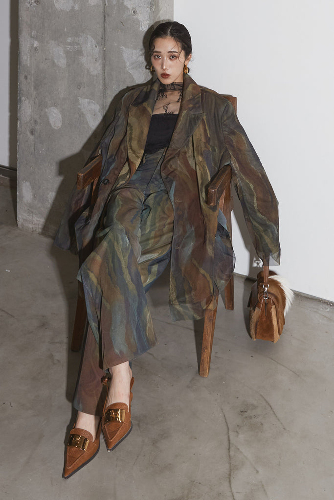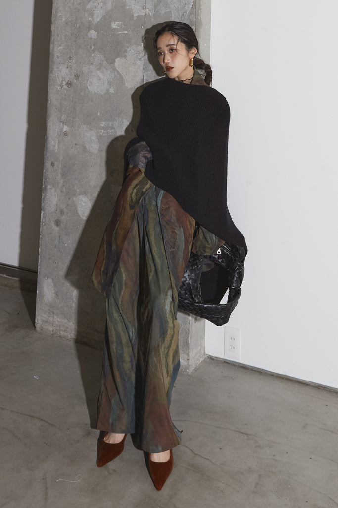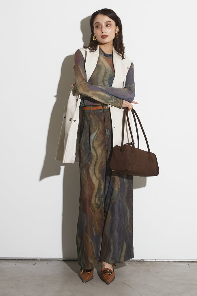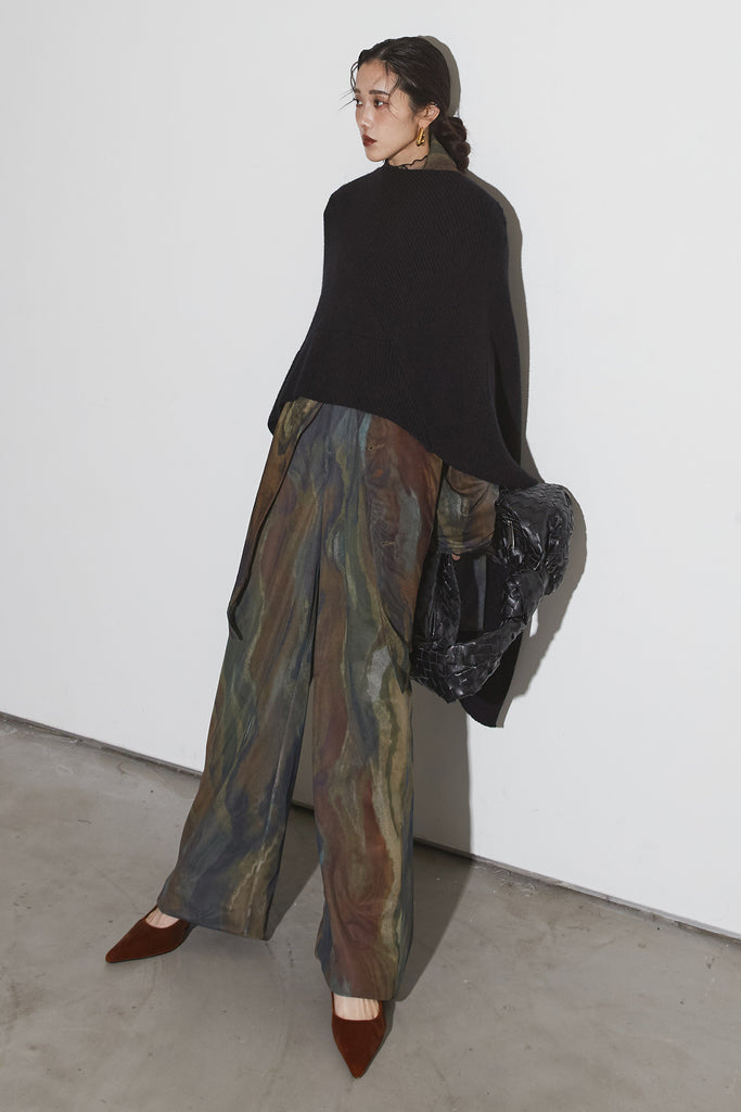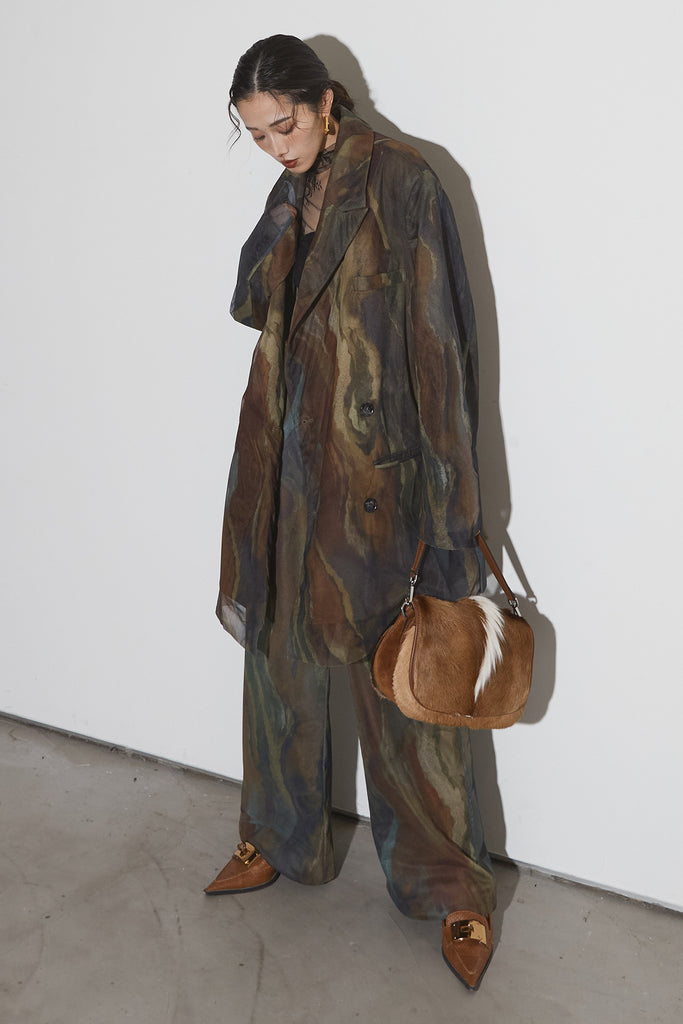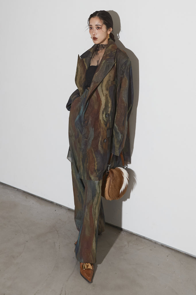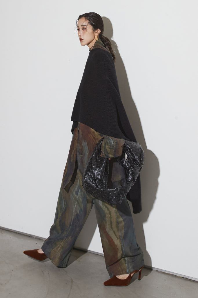 アーティスティックなプリントが施されたチュール素材のパンツ。透け感と深みのある色調が重なり合い、まるで絵画のような奥行きを生み出します。軽やかな素材ながら、タックを入れることで美しいシルエットを構築。動くたびに柔らかく揺れ、印象的なスタイルを演出します。同素材のジャケットと合わせれば、統一感のある洗練されたセットアップが完成。日常から特別なシーンまで幅広く活躍する一本です。