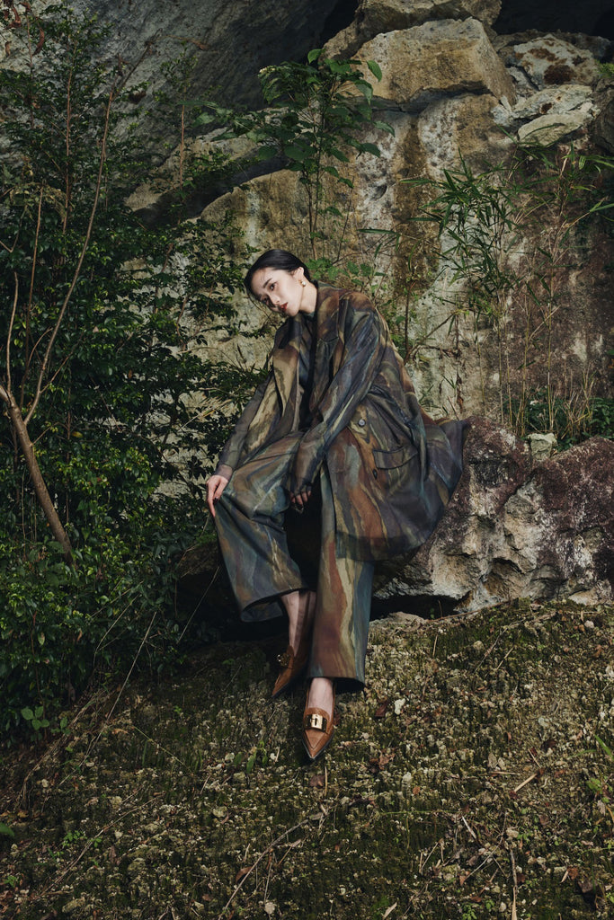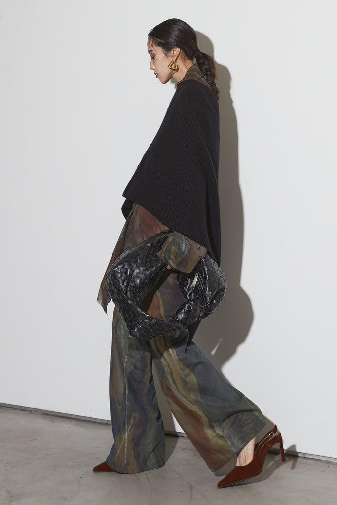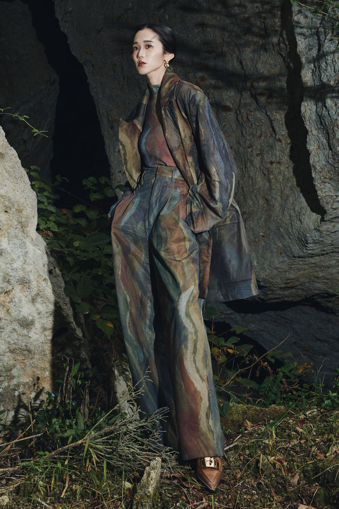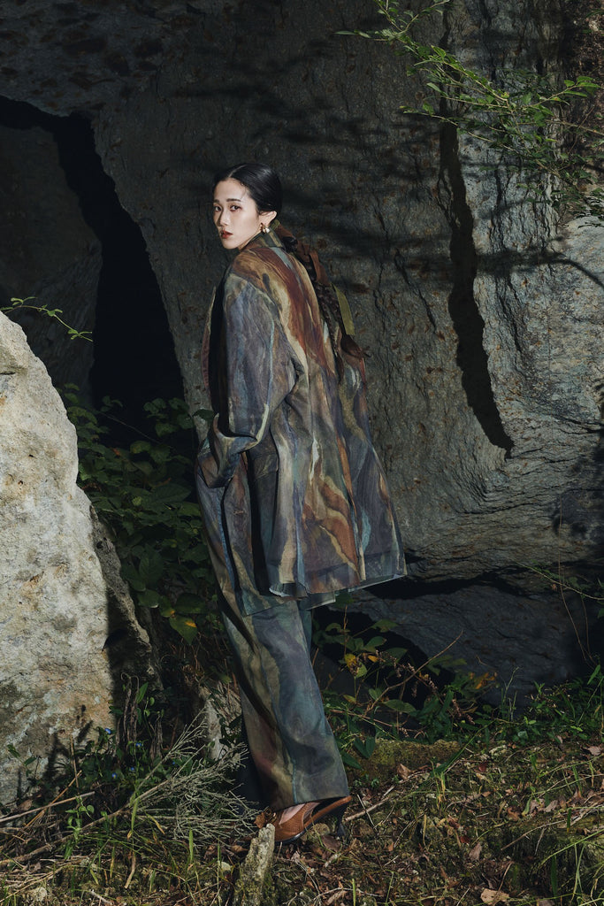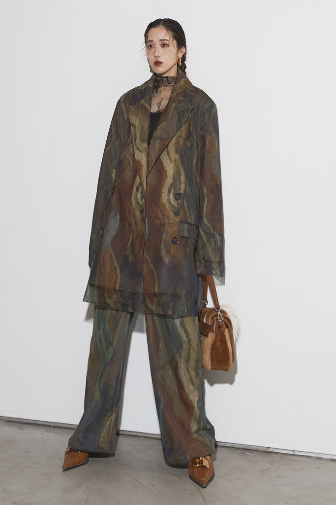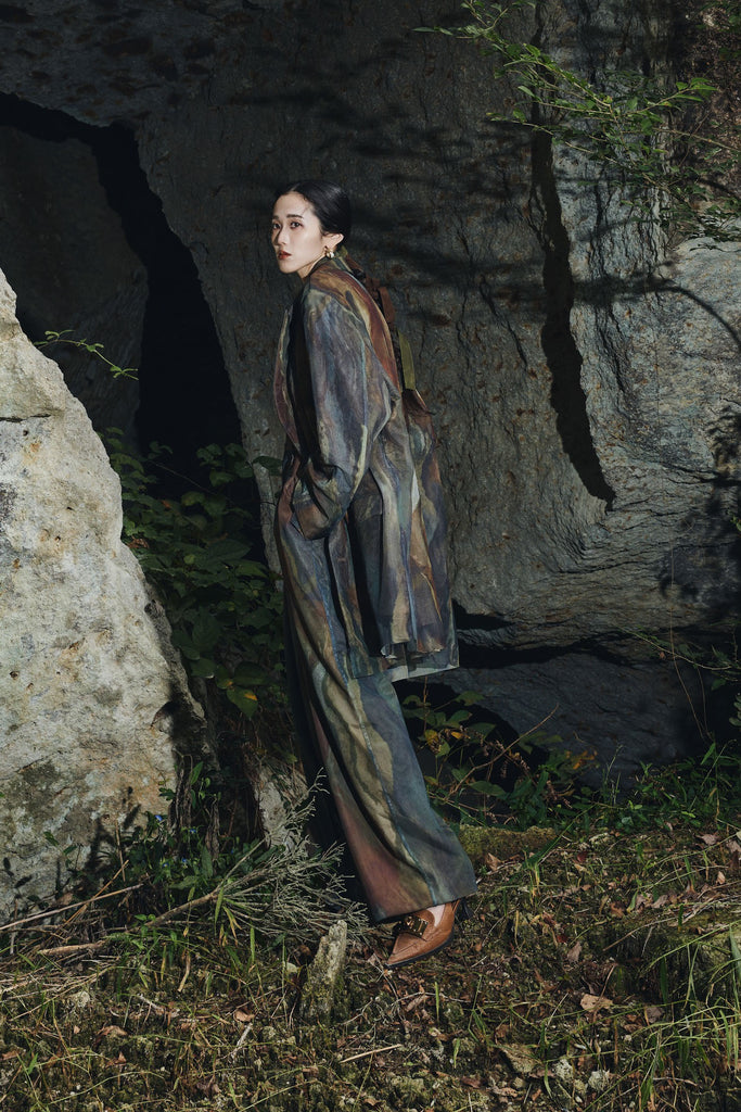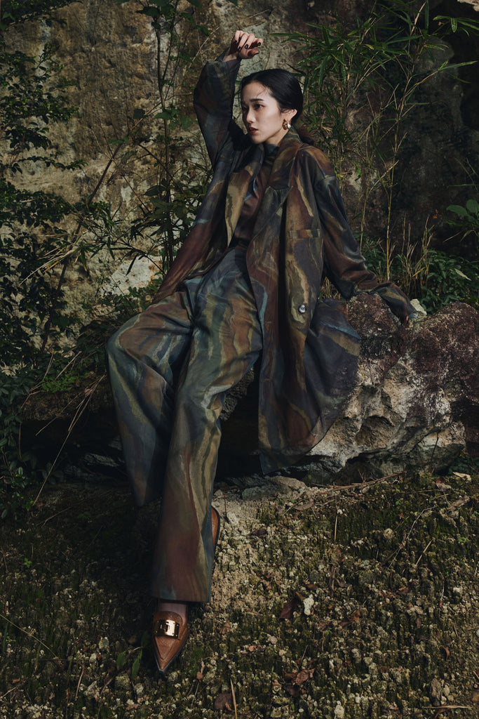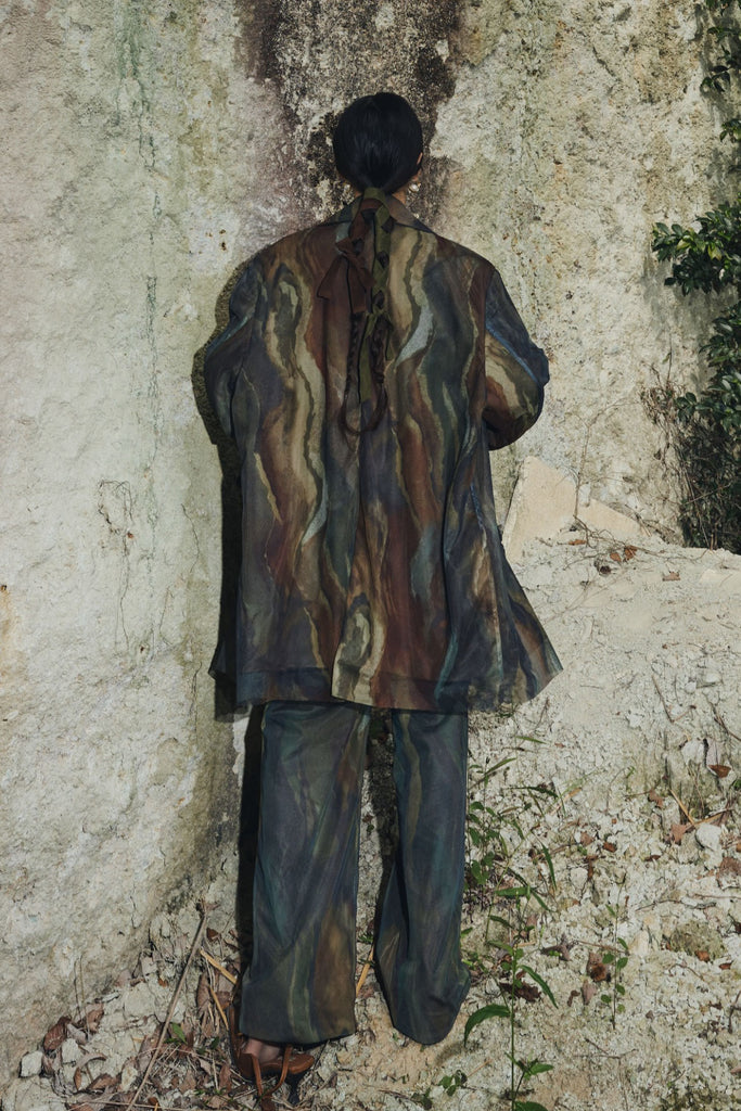 アーティスティックなプリントが施されたチュール素材のパンツ。透け感と深みのある色調が重なり合い、まるで絵画のような奥行きを生み出します。軽やかな素材ながら、タックを入れることで美しいシルエットを構築。動くたびに柔らかく揺れ、印象的なスタイルを演出します。同素材のジャケットと合わせれば、統一感のある洗練されたセットアップが完成。日常から特別なシーンまで幅広く活躍する一本です。