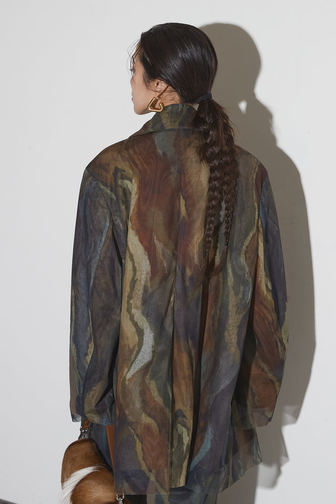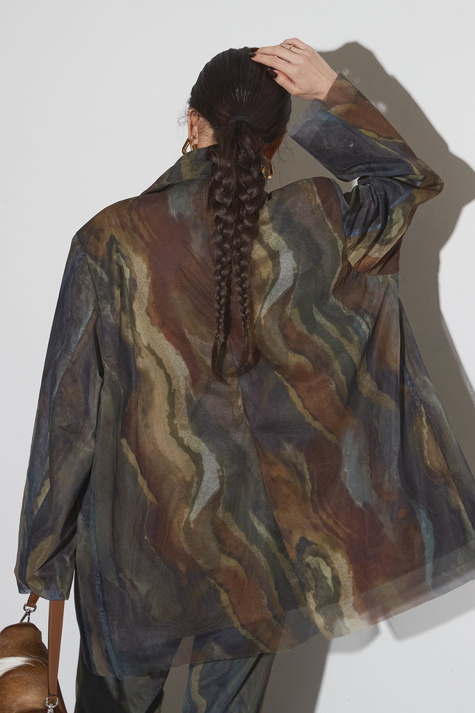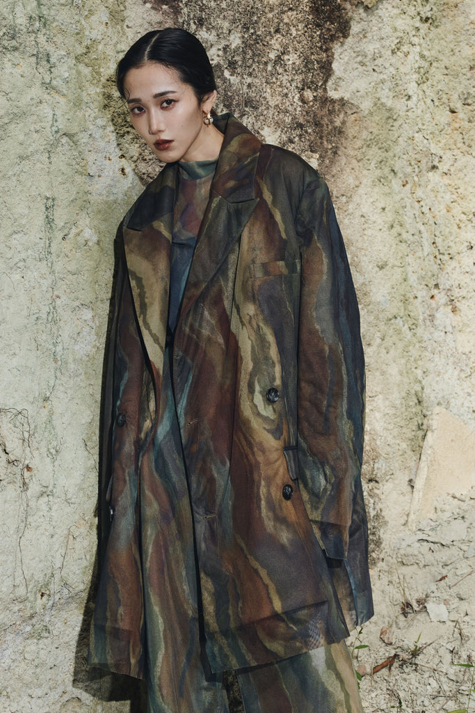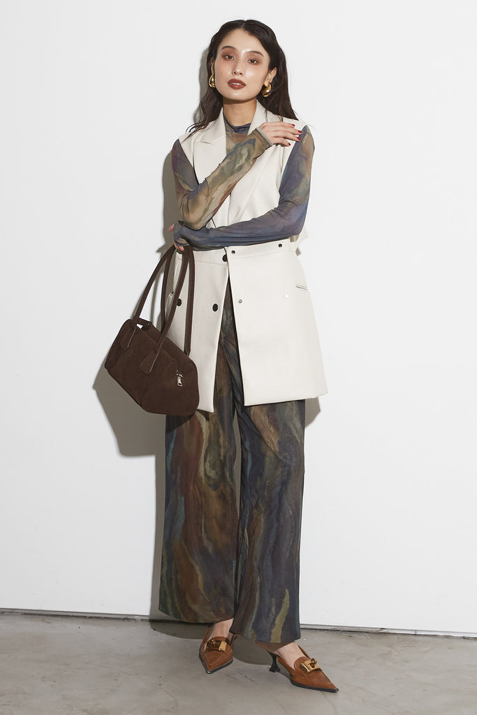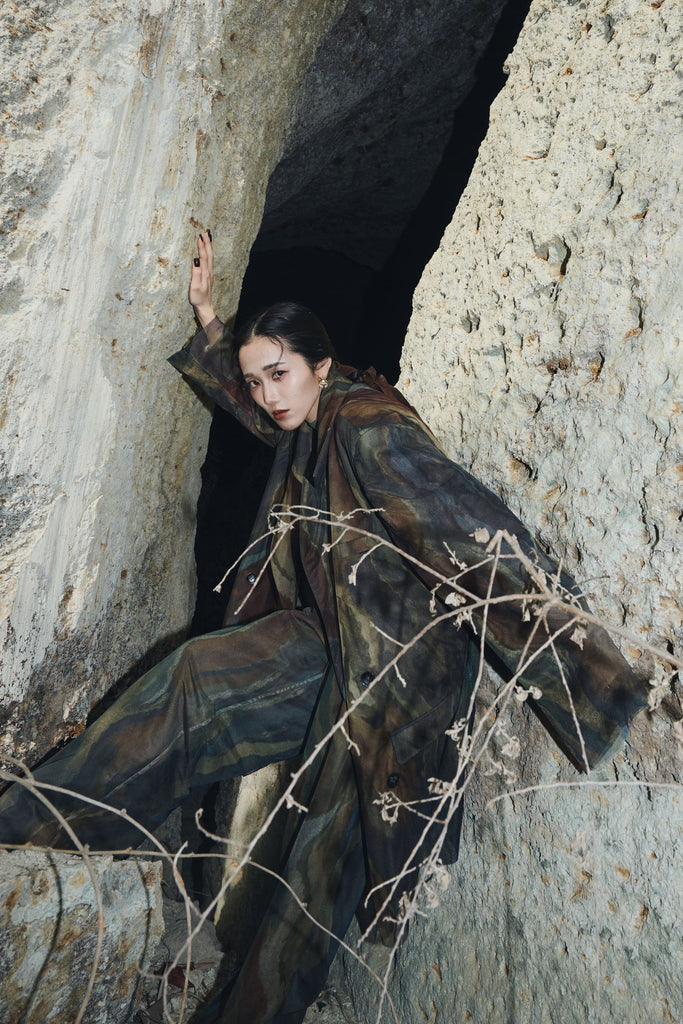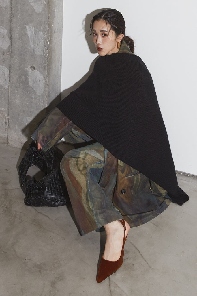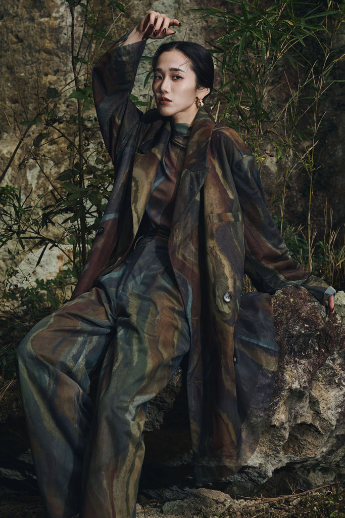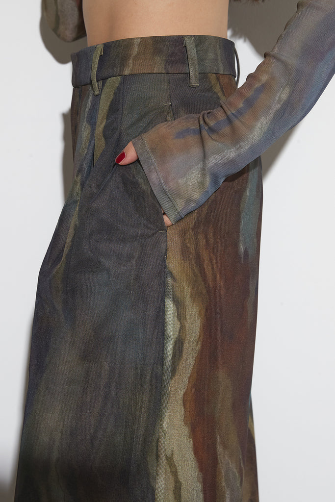 アーティスティックなプリントが施されたチュール素材のパンツ。透け感と深みのある色調が重なり合い、まるで絵画のような奥行きを生み出します。軽やかな素材ながら、タックを入れることで美しいシルエットを構築。動くたびに柔らかく揺れ、印象的なスタイルを演出します。同素材のジャケットと合わせれば、統一感のある洗練されたセットアップが完成。日常から特別なシーンまで幅広く活躍する一本です。