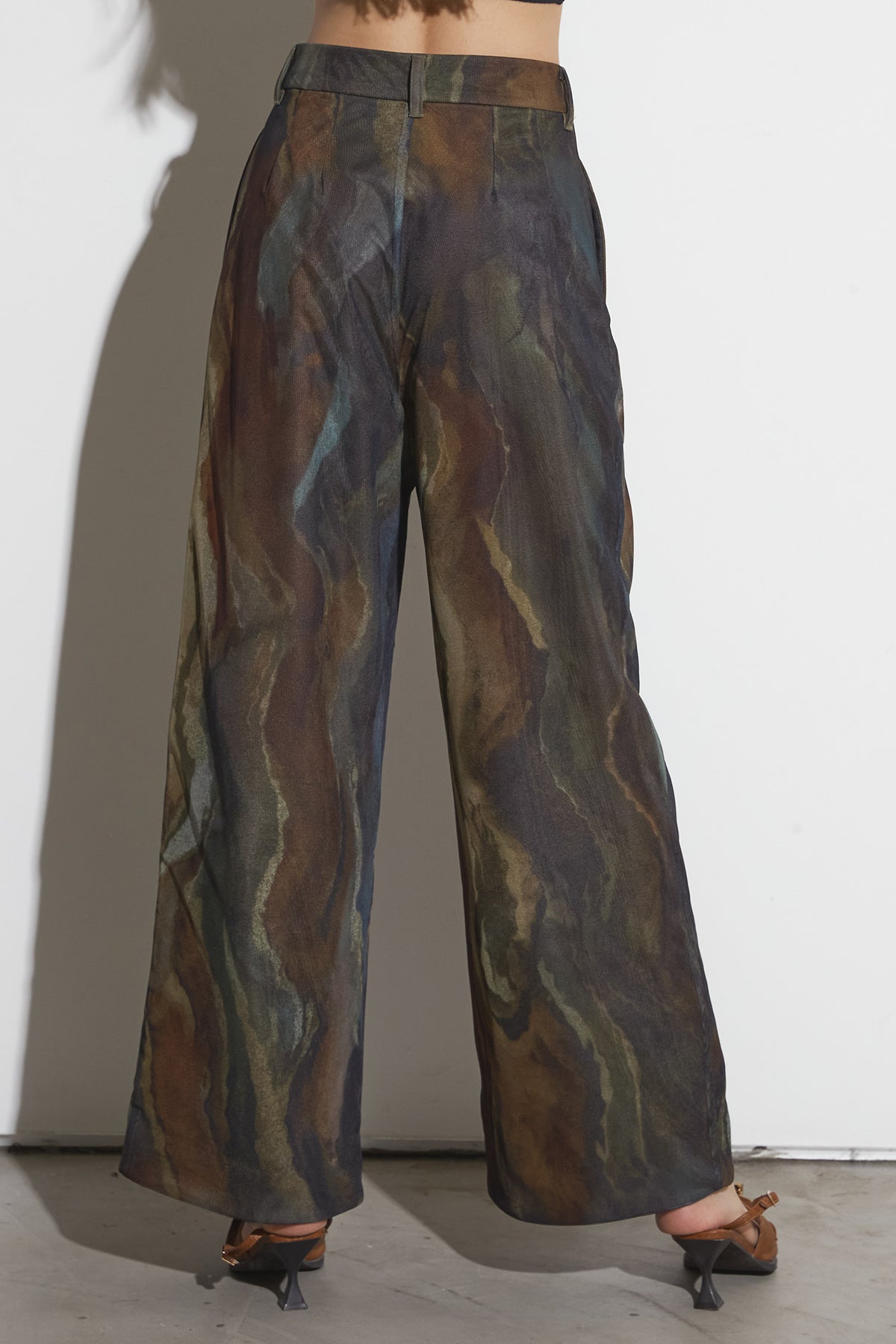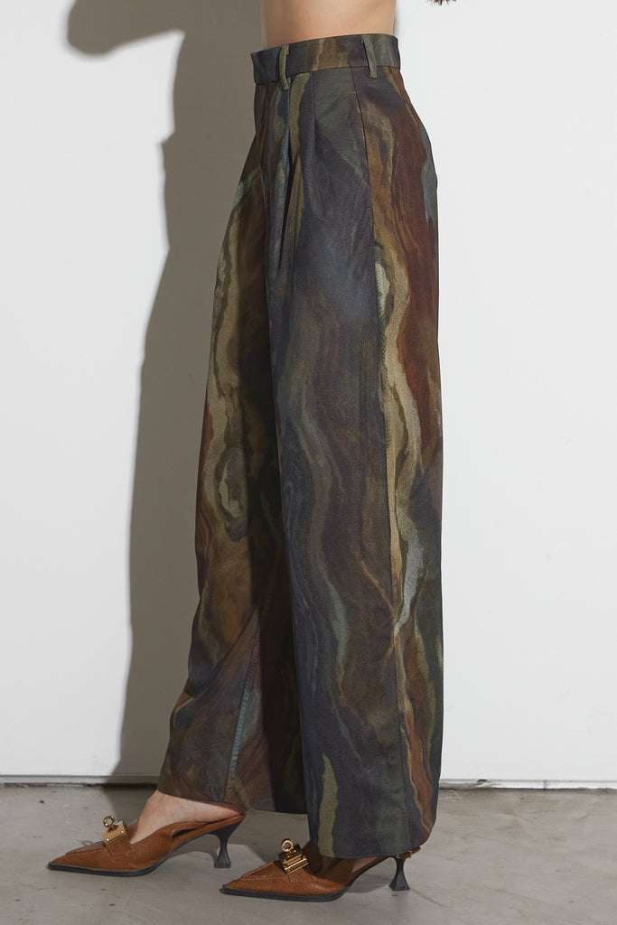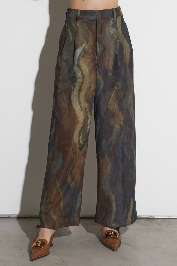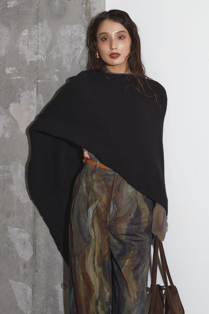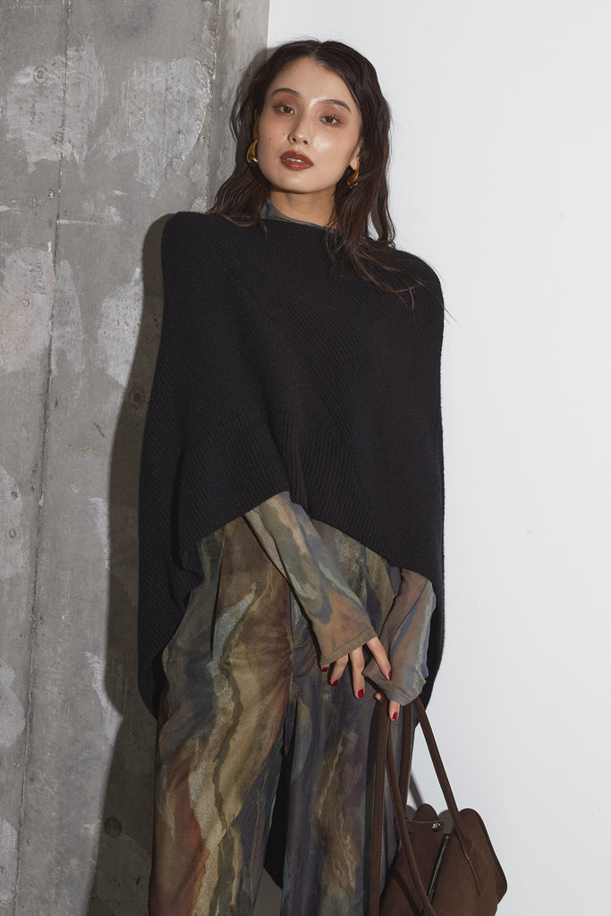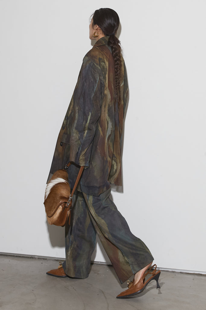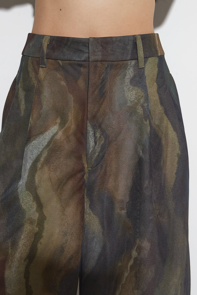 アーティスティックなプリントが施されたチュール素材のパンツ。透け感と深みのある色調が重なり合い、まるで絵画のような奥行きを生み出します。軽やかな素材ながら、タックを入れることで美しいシルエットを構築。動くたびに柔らかく揺れ、印象的なスタイルを演出します。同素材のジャケットと合わせれば、統一感のある洗練されたセットアップが完成。日常から特別なシーンまで幅広く活躍する一本です。