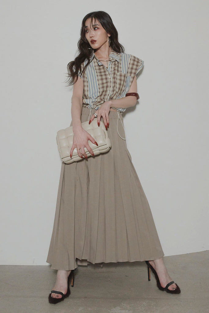 ナチュラルな風合いのストライプ柄ワイドパンツ。 ウエストはゴム+ドローストリング仕様でリラックス感のある着心地。 ルーズなシルエットがスタイルに抜け感をプラスします。