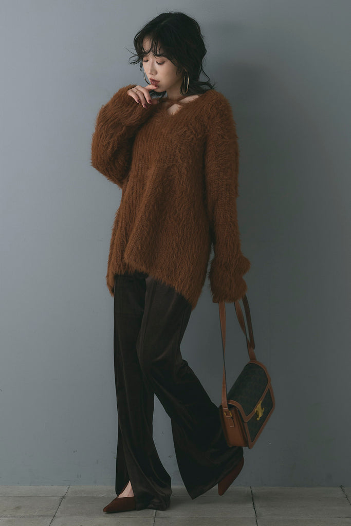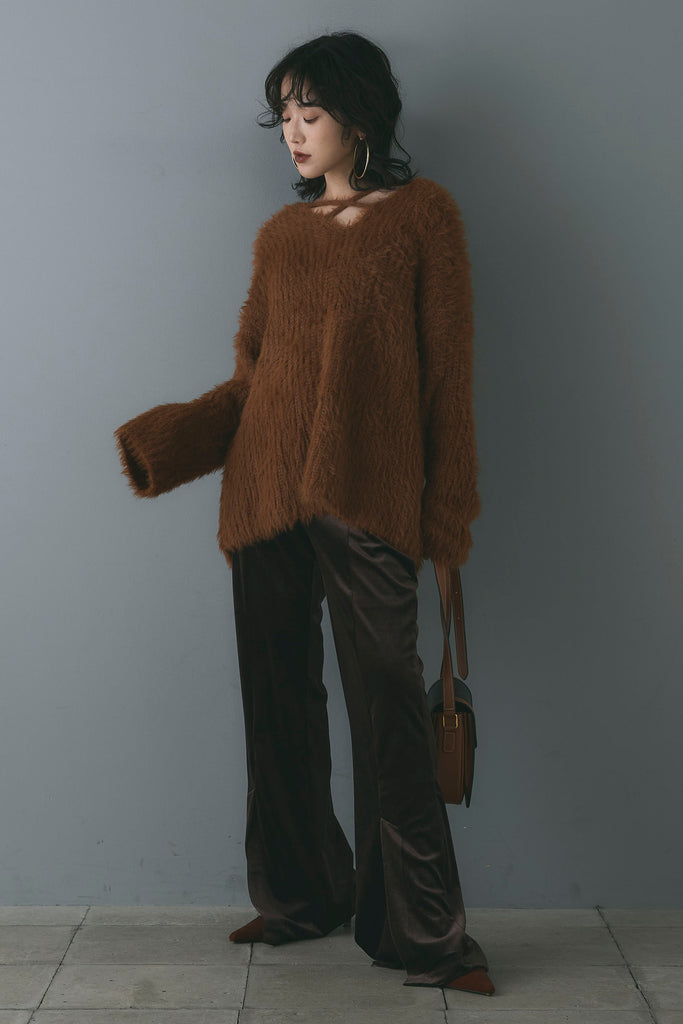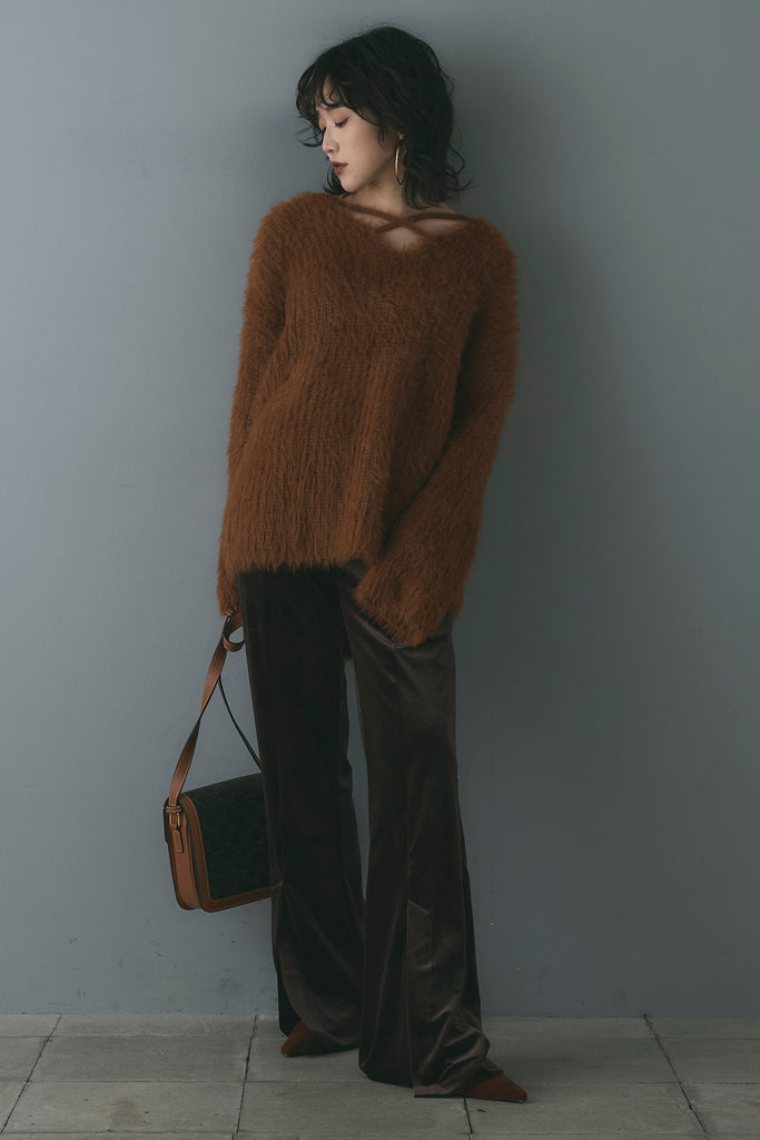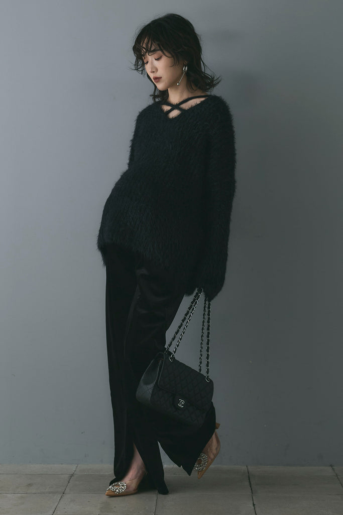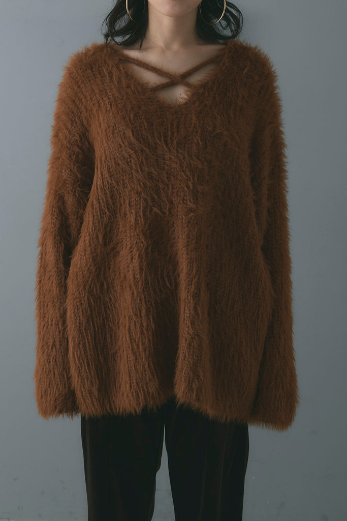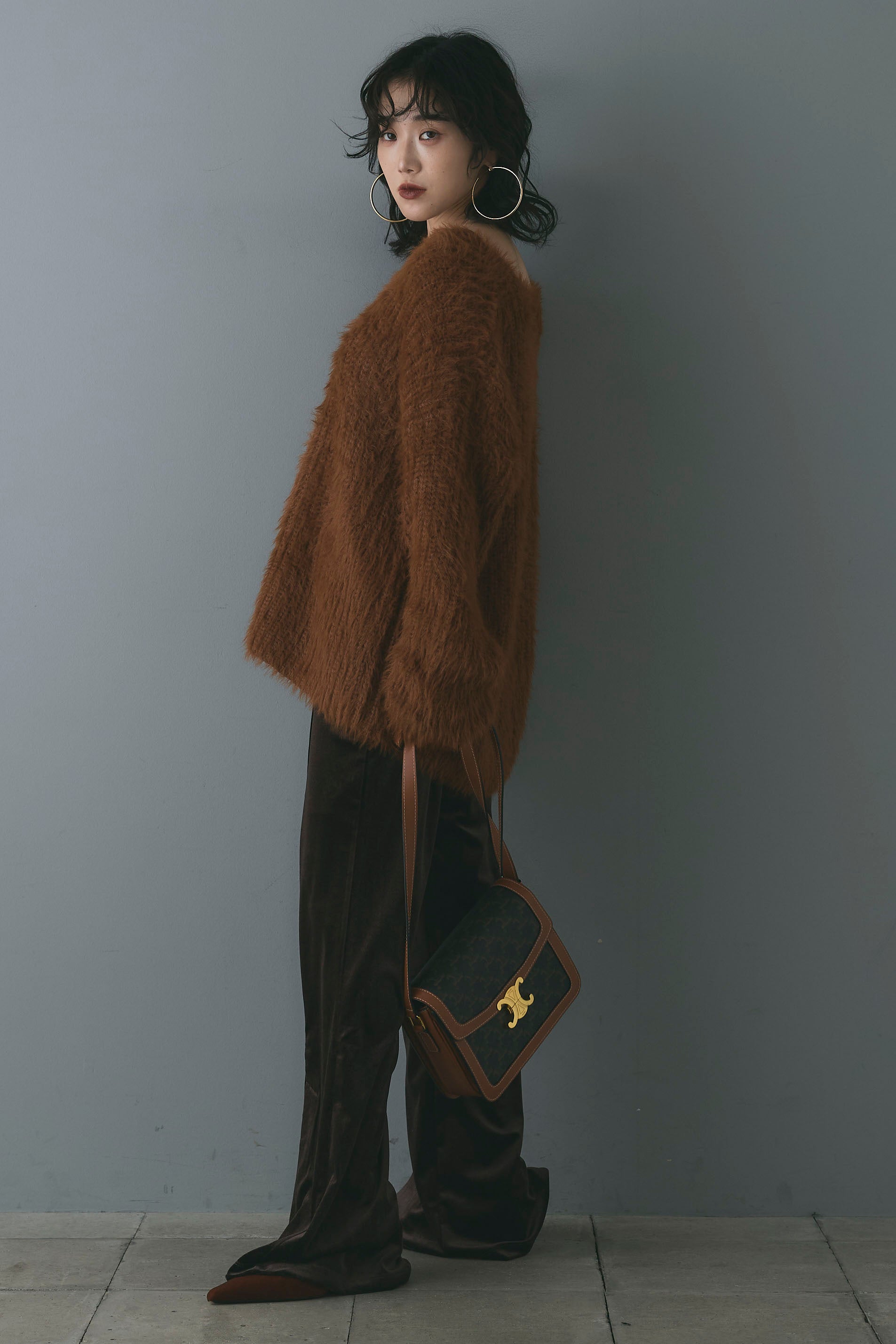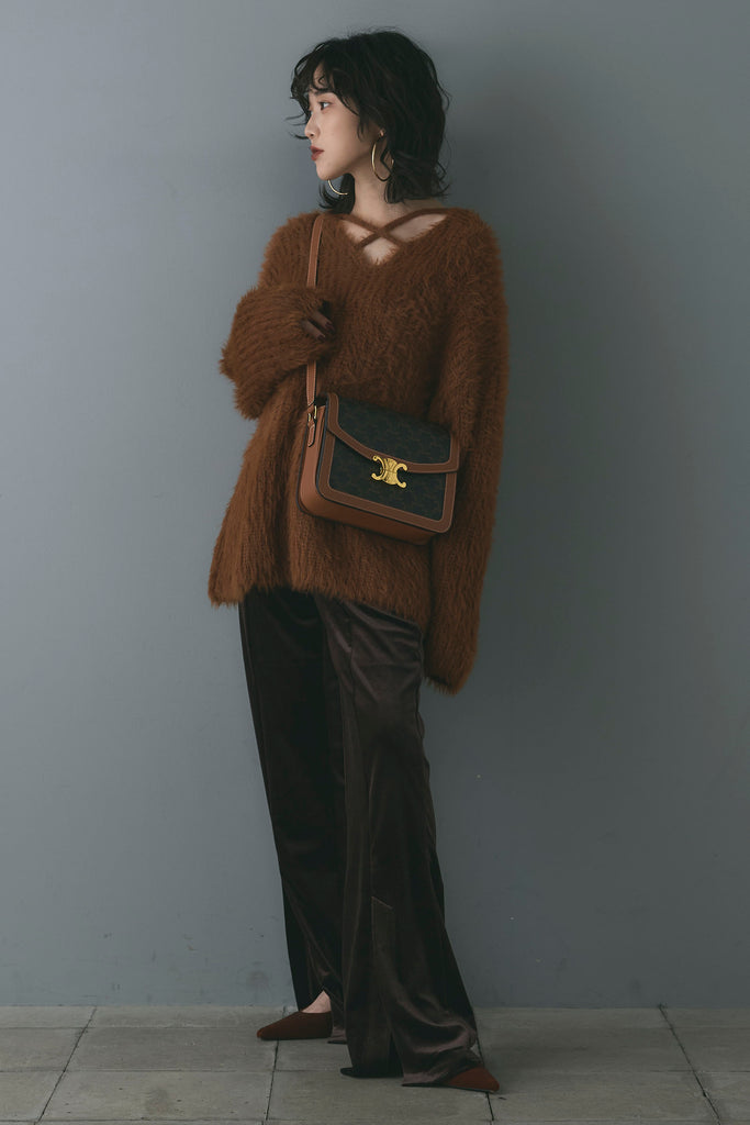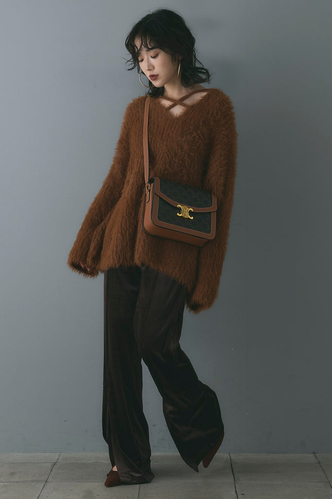 このクロスシャギーニットは、柔らかくふんわりとした素材感が特徴です。背面に施されたクロスデザインがポイントとなり、後ろ姿にもアクセントをプラス。深めのVネックラインが首元をスッキリ見せ、大人の上品な印象を演出します。シルエットはゆったりとしており、リラックス感のある着心地です。パンツやスカートと合わせて、カジュアルからきれいめスタイルまで幅広く活躍するアイテムです。