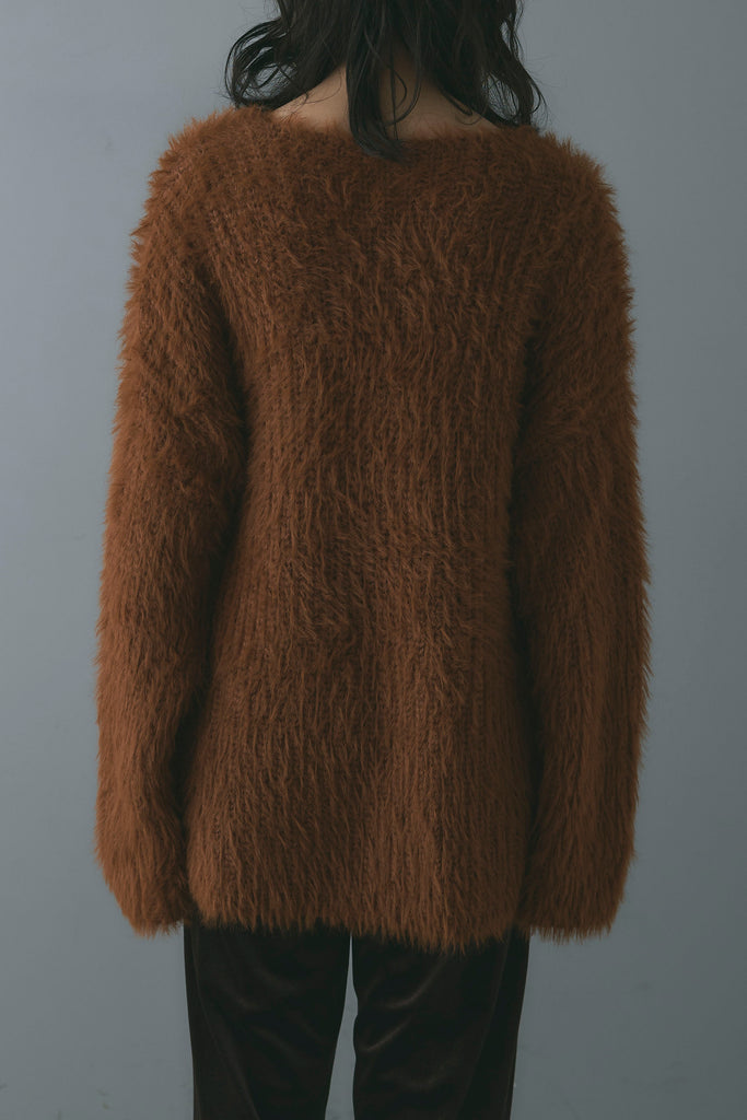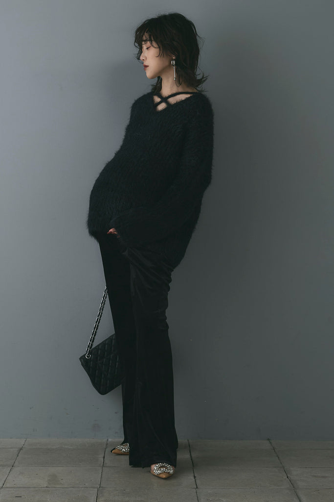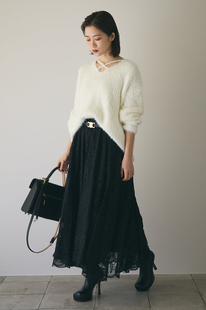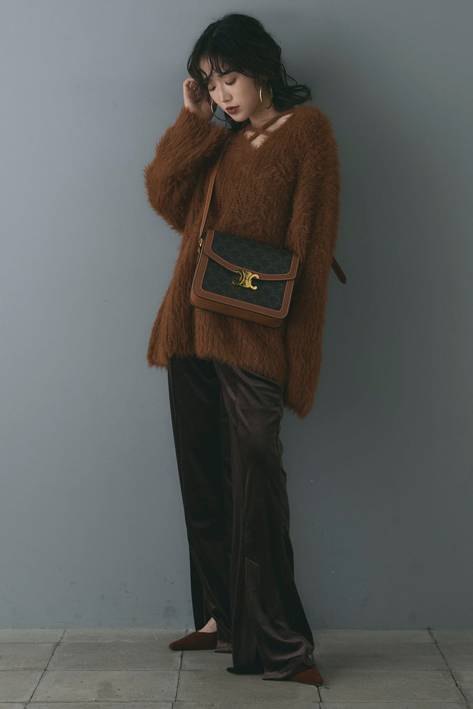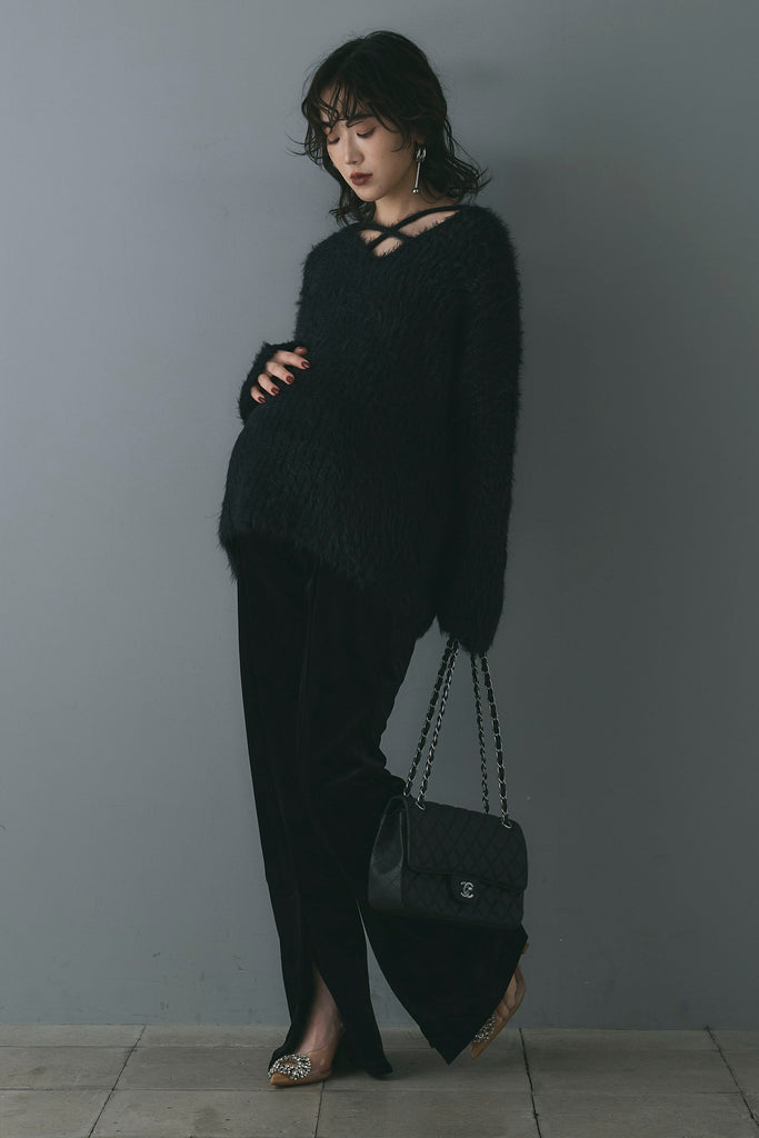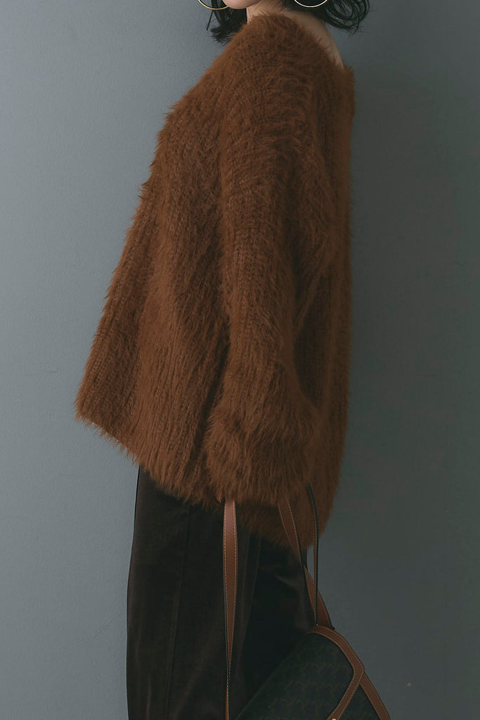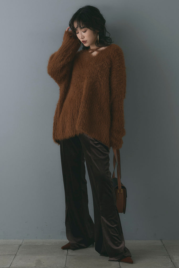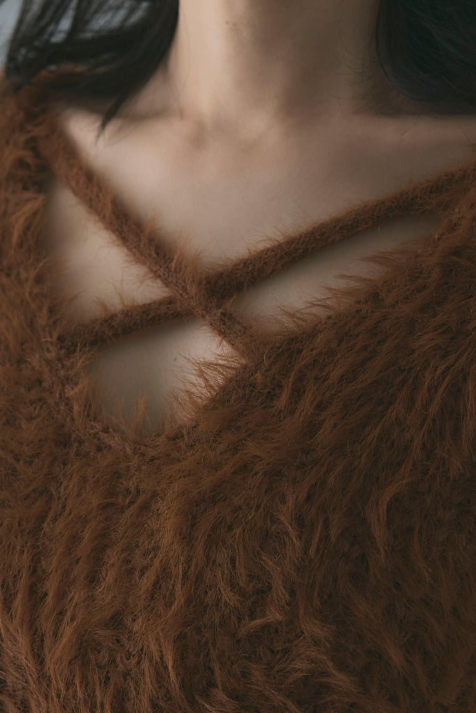 このクロスシャギーニットは、柔らかくふんわりとした素材感が特徴です。背面に施されたクロスデザインがポイントとなり、後ろ姿にもアクセントをプラス。深めのVネックラインが首元をスッキリ見せ、大人の上品な印象を演出します。シルエットはゆったりとしており、リラックス感のある着心地です。パンツやスカートと合わせて、カジュアルからきれいめスタイルまで幅広く活躍するアイテムです。