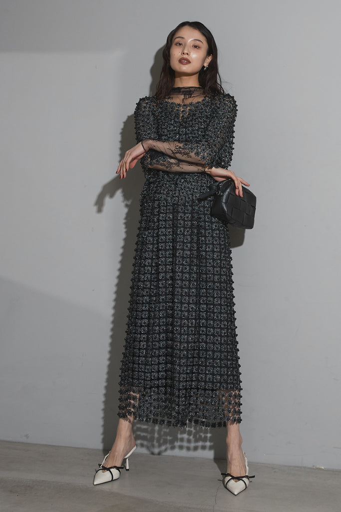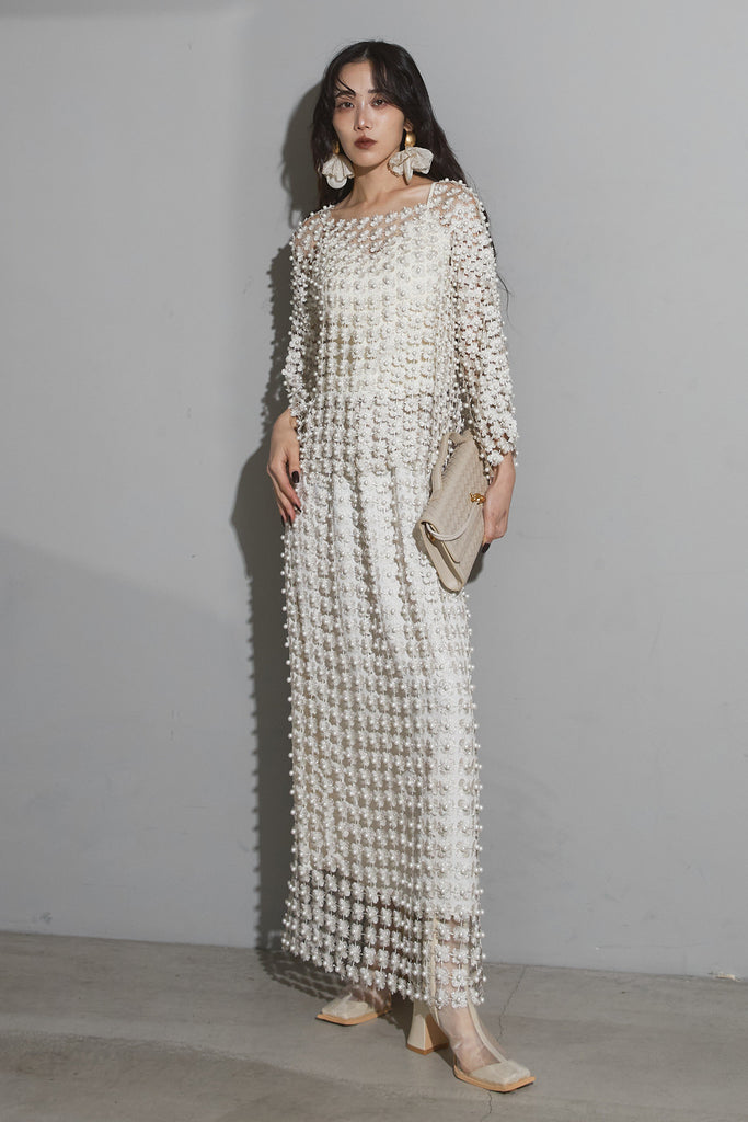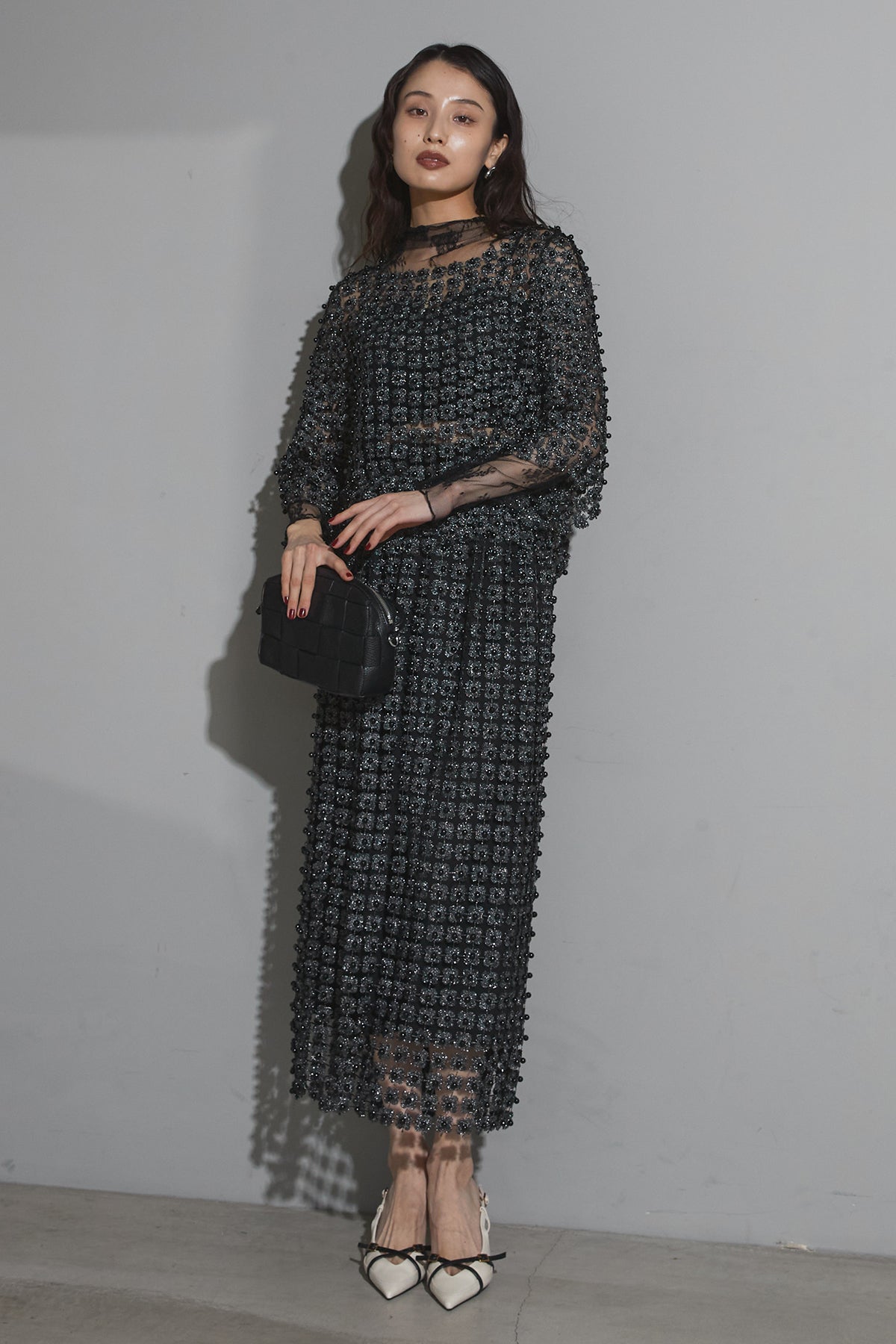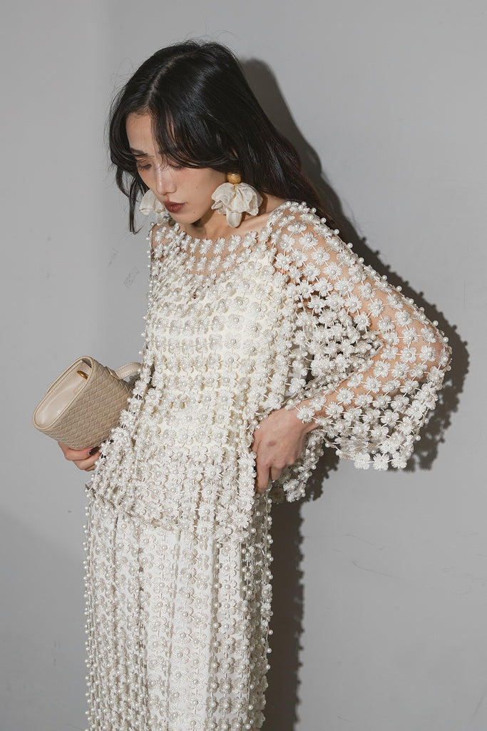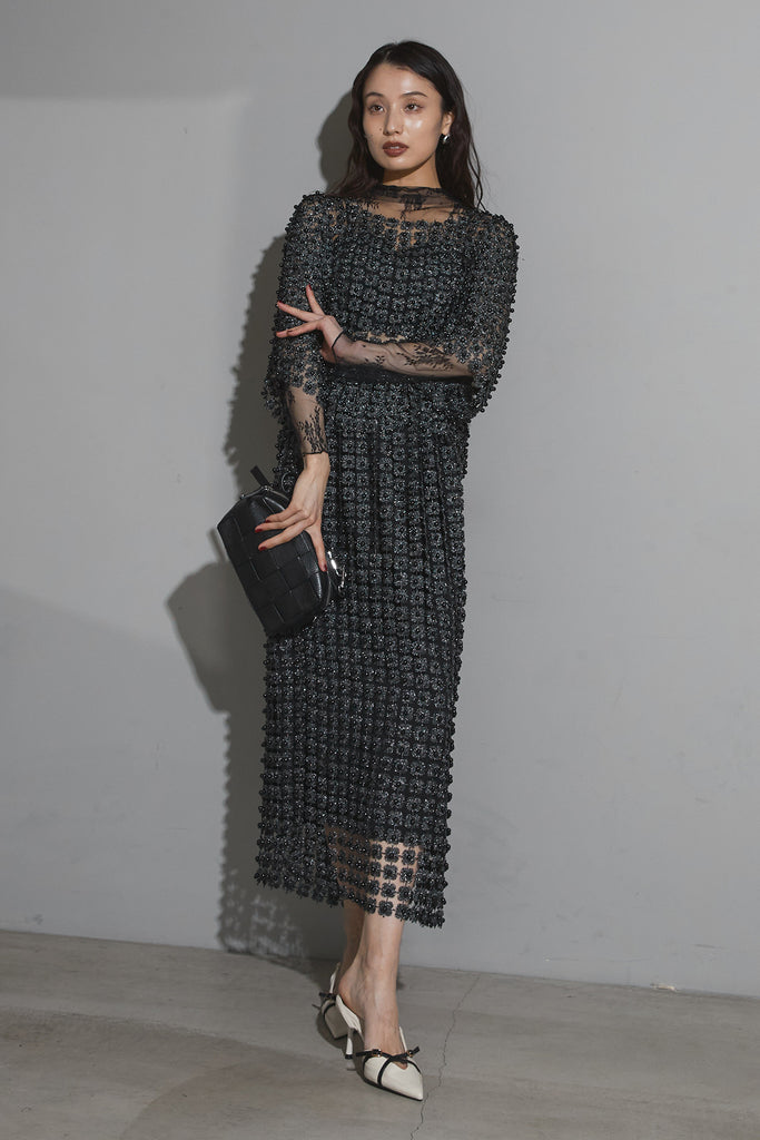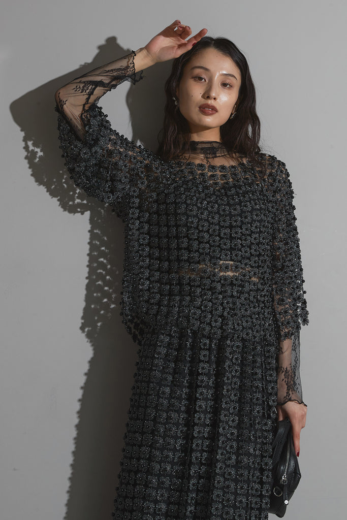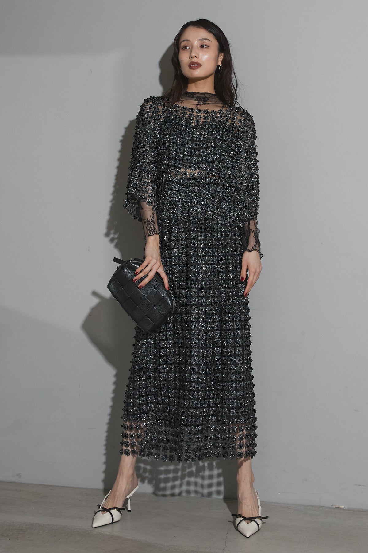 【SET】フラワーパールメッシュセットアップ+ボタンニットロングコート