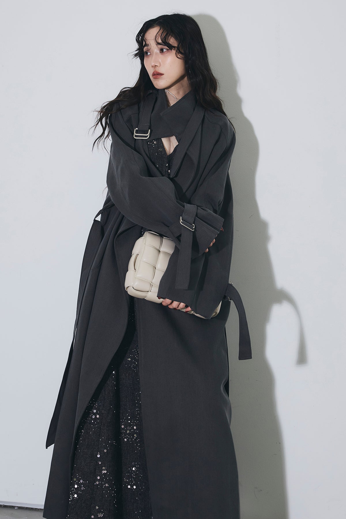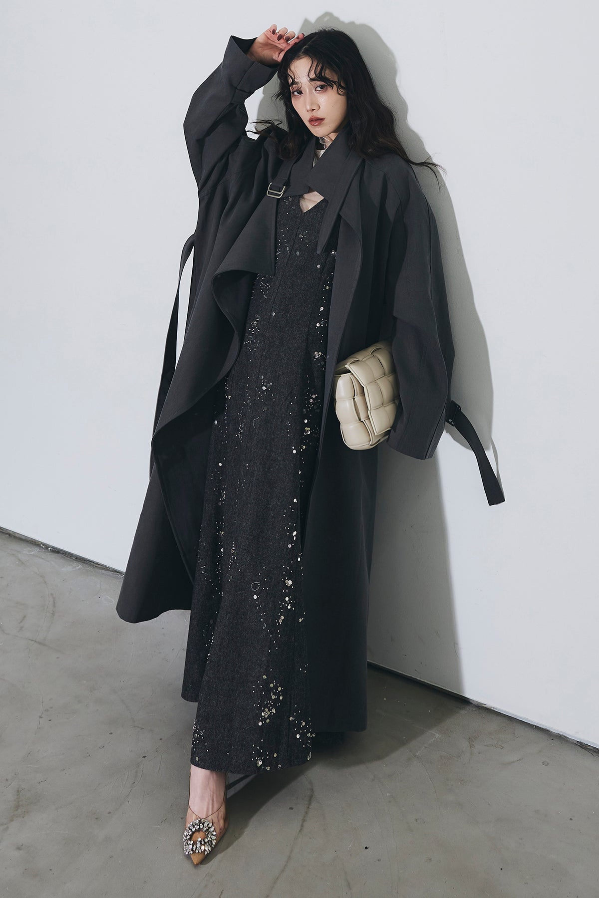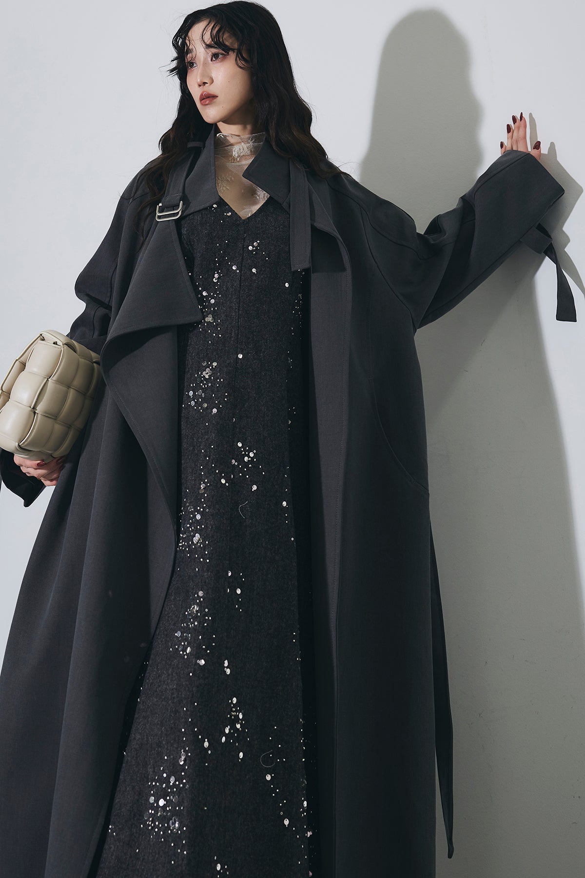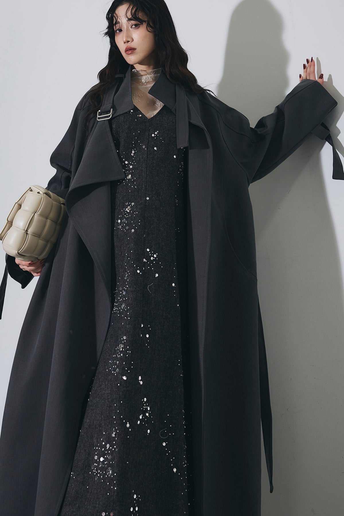 【SET】スパンコールスキャタードワンピース+スタンドカラースプリングコート