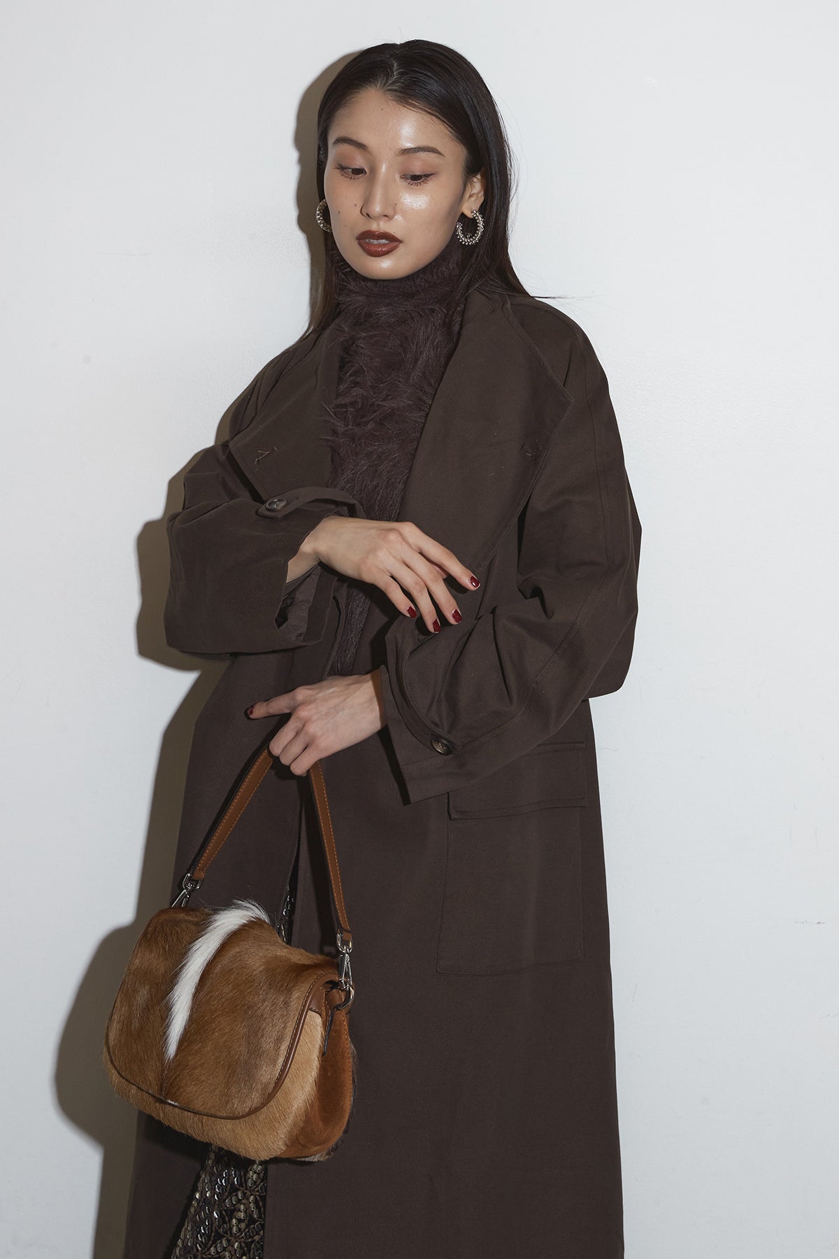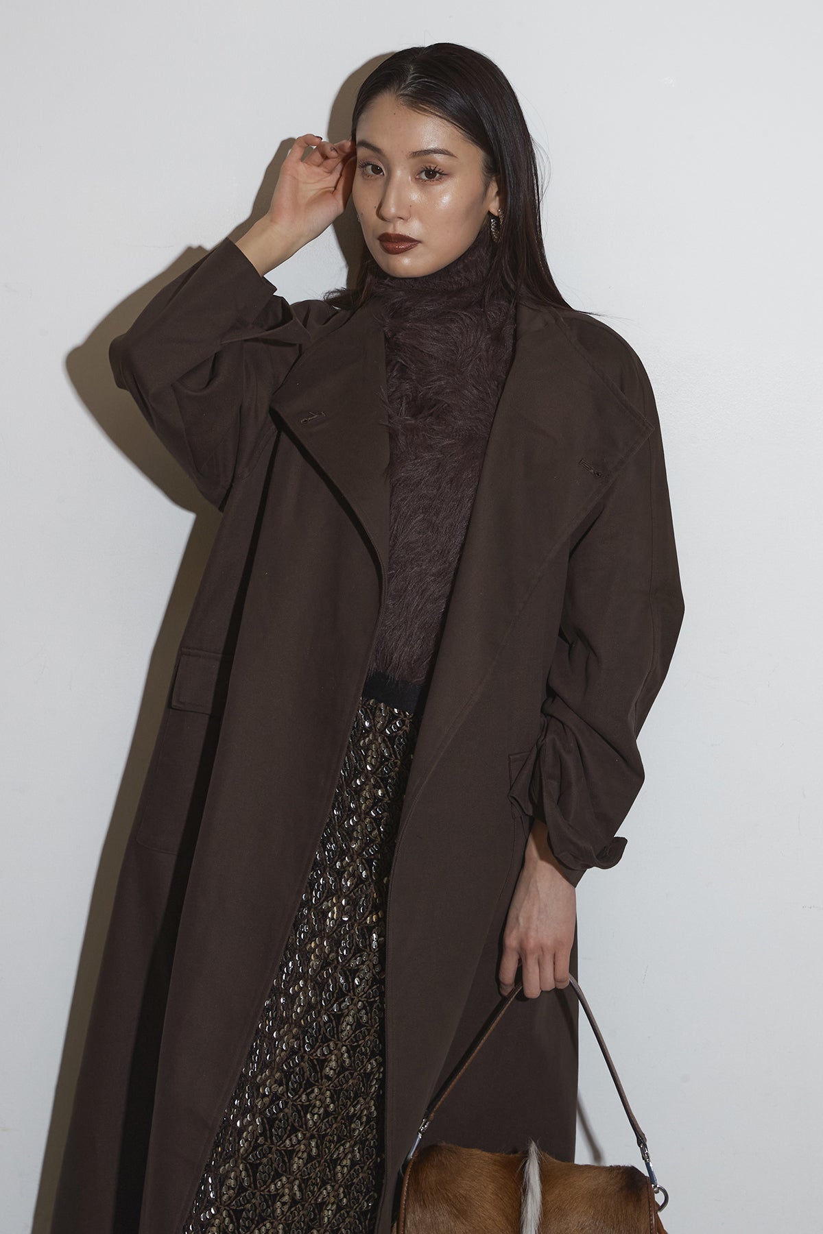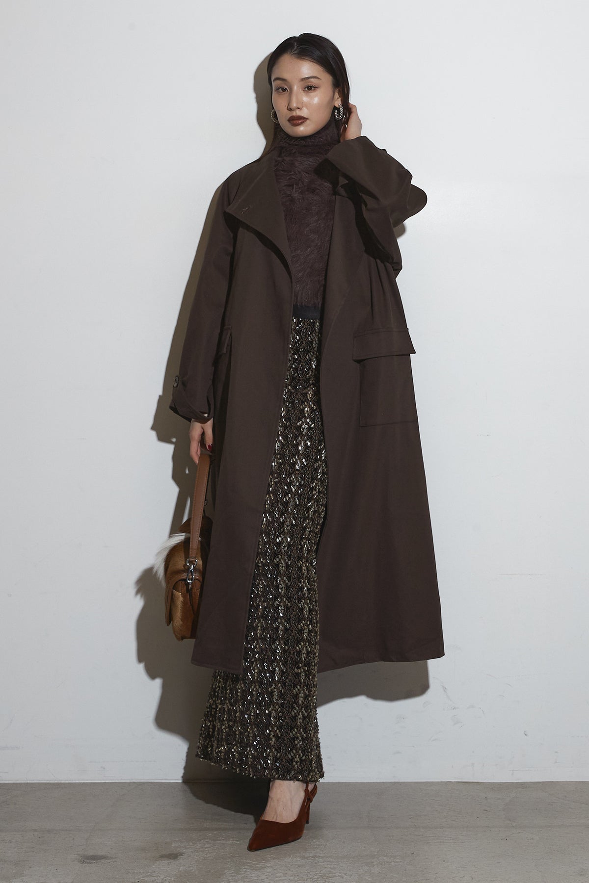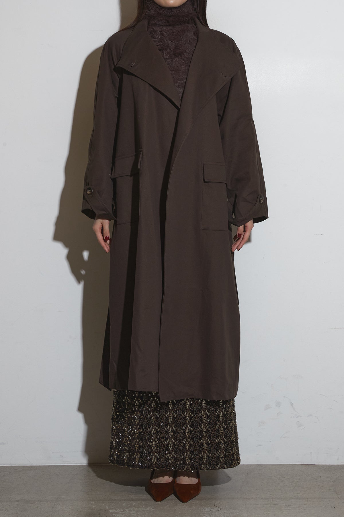 滑らかな落ち感のあるロングコートは、広めのラペルとゆったりとしたスリーブが抜け感を生み、フラップ付きポケットが程よい存在感を添える一着。シンプルながらも立体的なシルエットで、インに厚手のトップスを仕込んでもバランス良くまとまり、さらっと羽織るだけでこなれた印象に仕上がります。