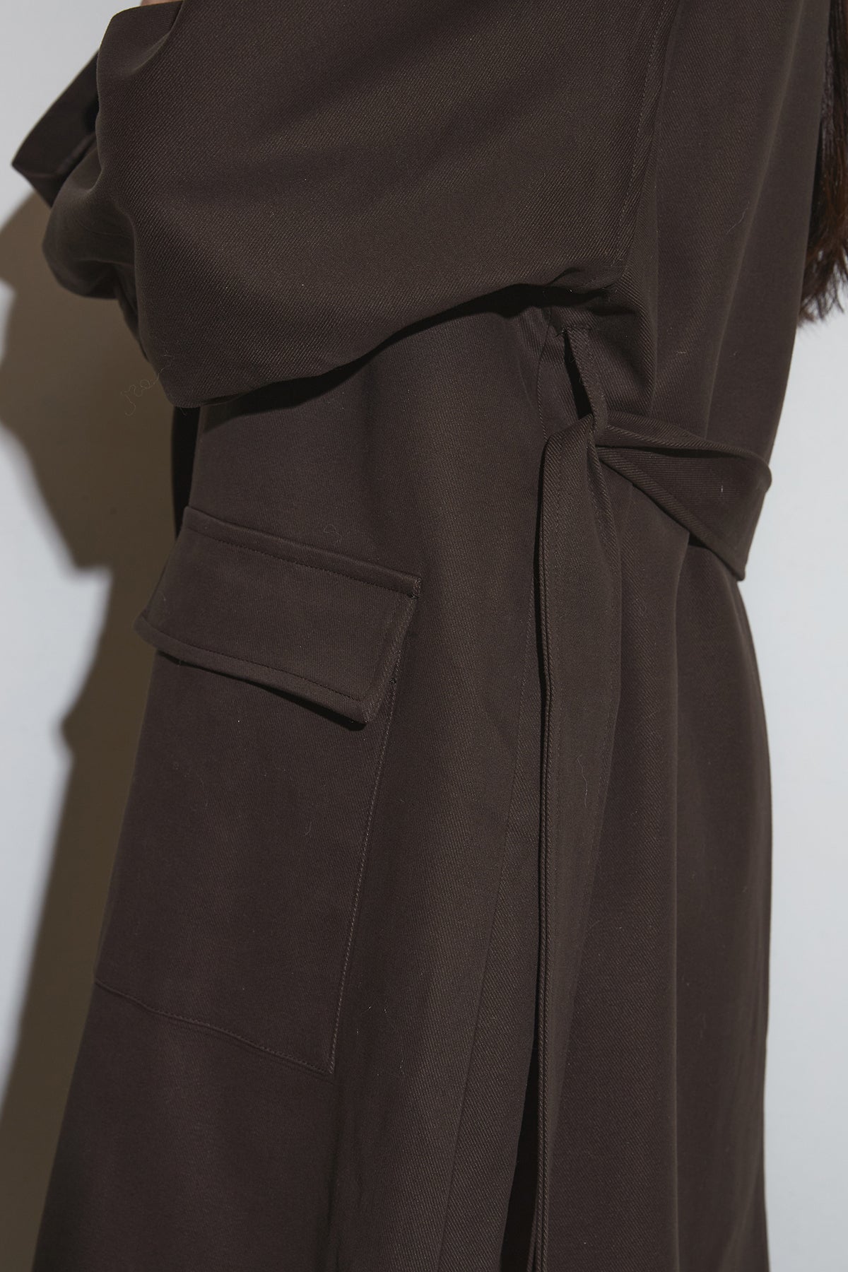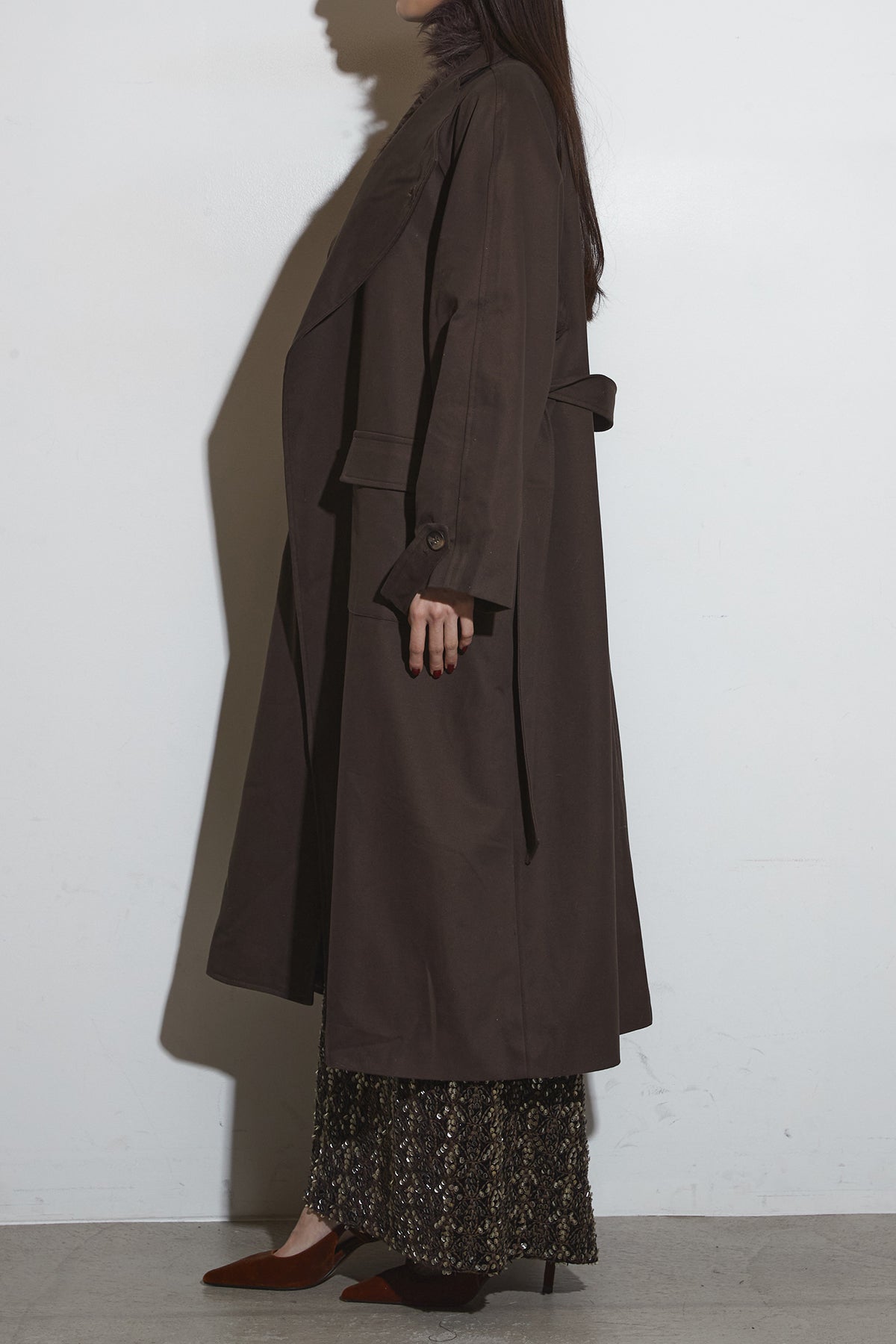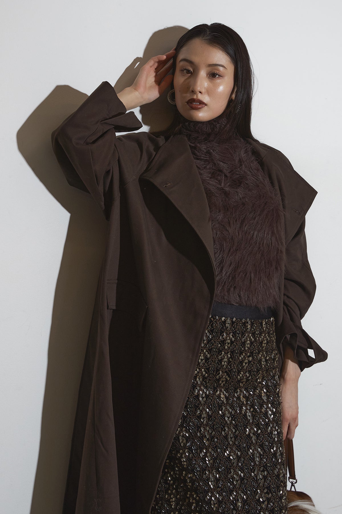 滑らかな落ち感のあるロングコートは、広めのラペルとゆったりとしたスリーブが抜け感を生み、フラップ付きポケットが程よい存在感を添える一着。シンプルながらも立体的なシルエットで、インに厚手のトップスを仕込んでもバランス良くまとまり、さらっと羽織るだけでこなれた印象に仕上がります。
