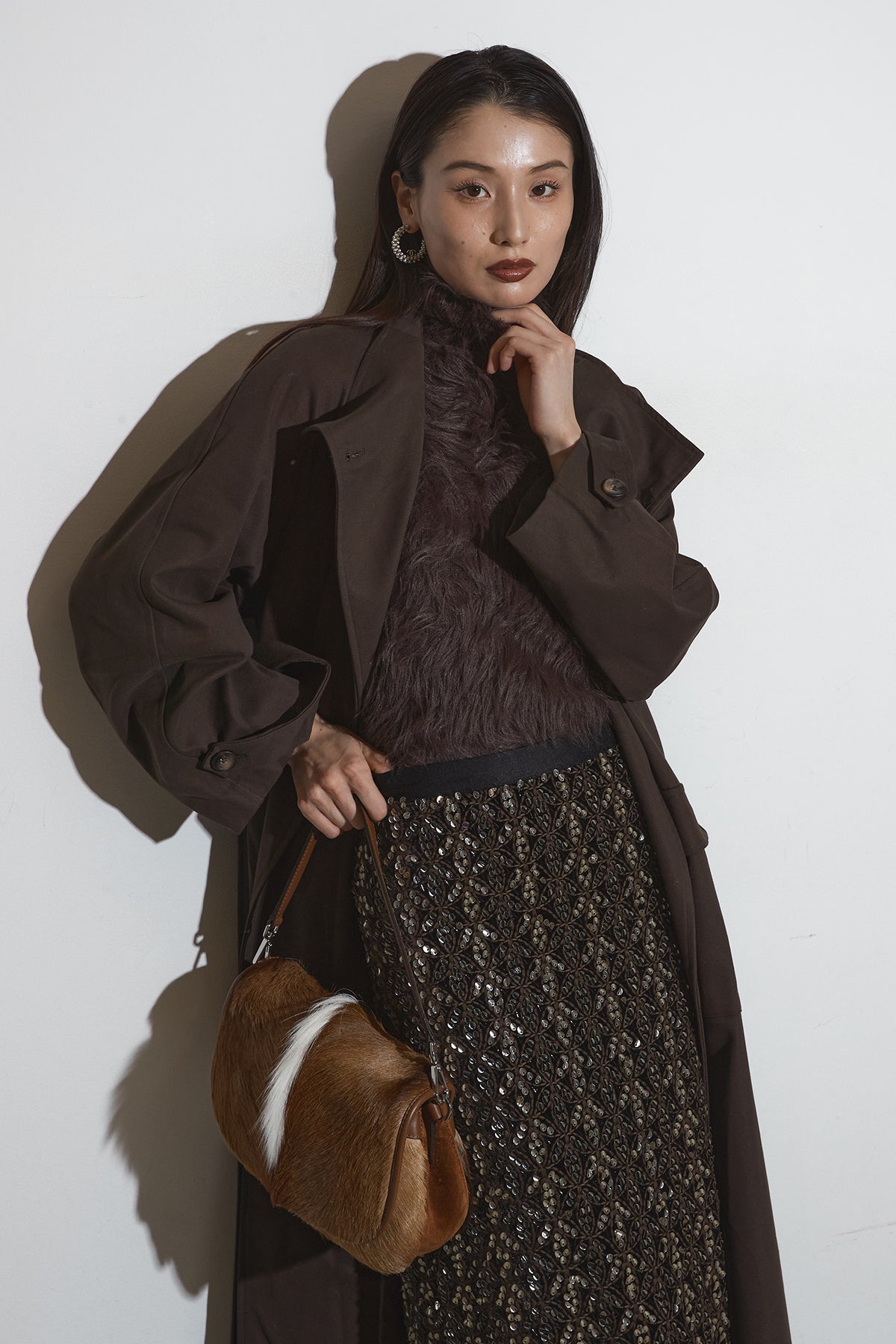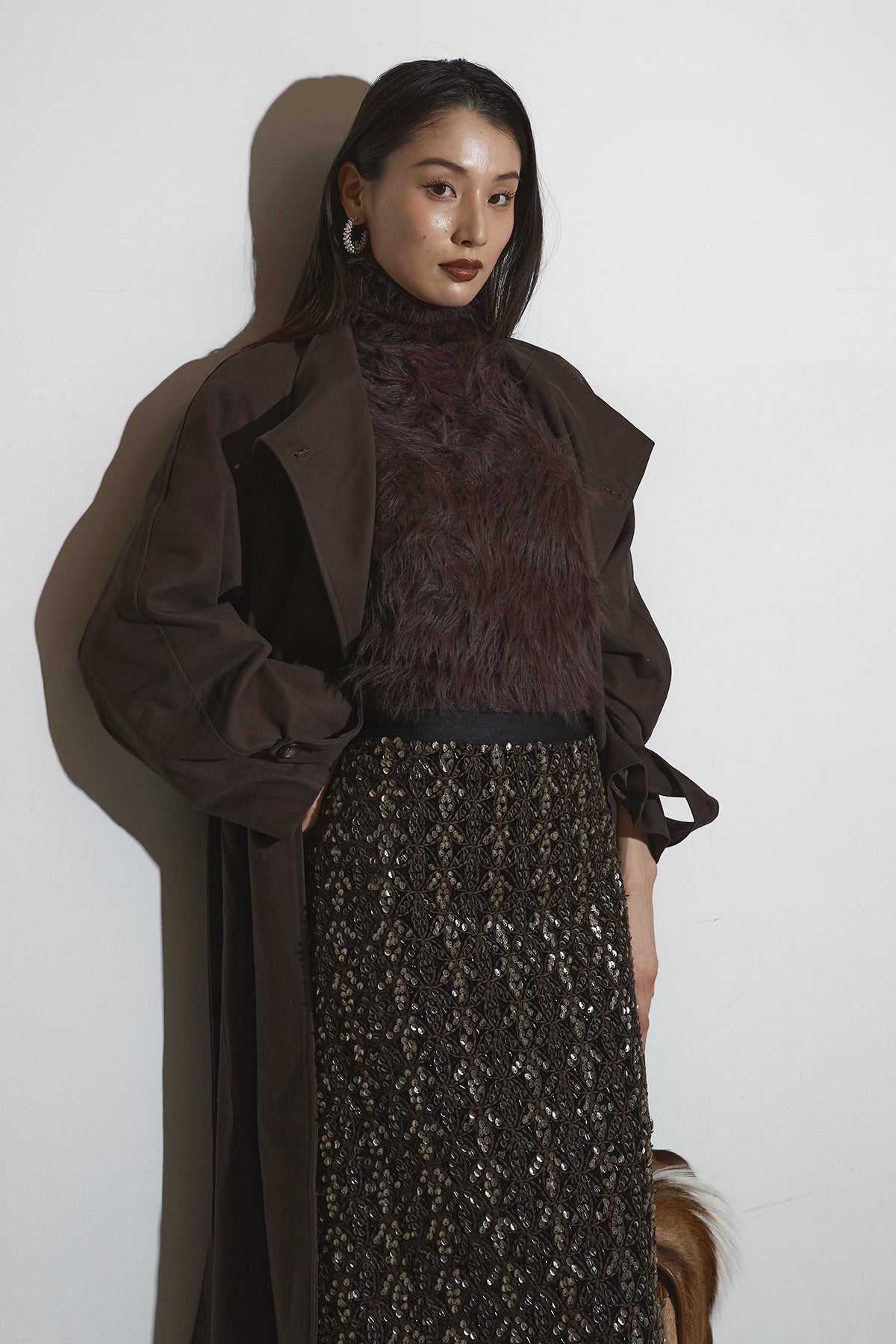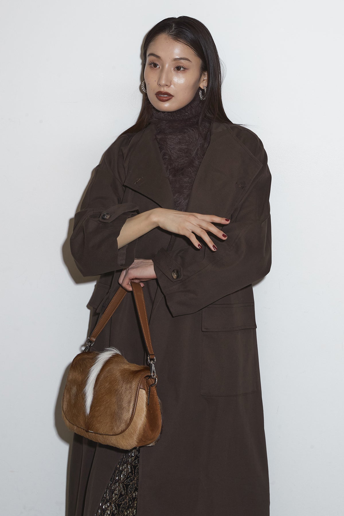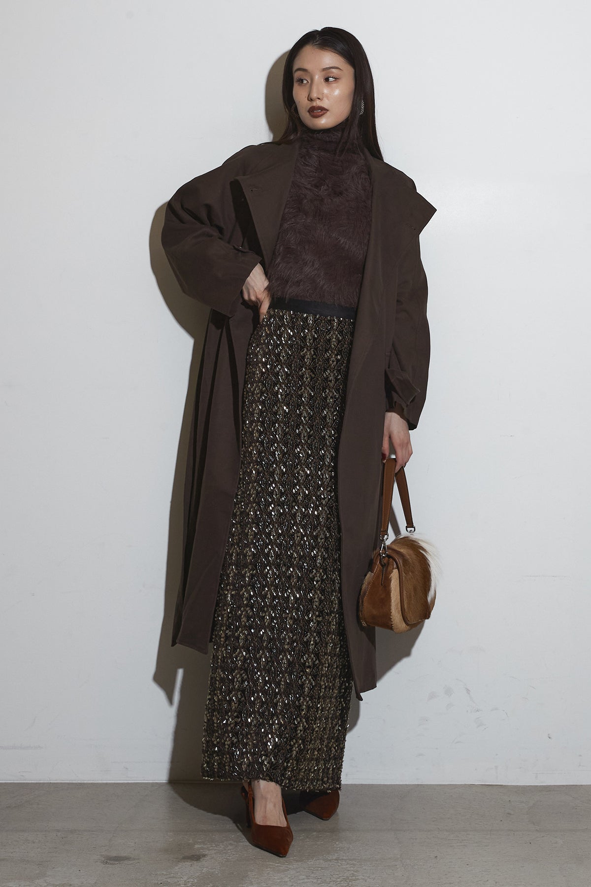 滑らかな落ち感のあるロングコートは、広めのラペルとゆったりとしたスリーブが抜け感を生み、フラップ付きポケットが程よい存在感を添える一着。シンプルながらも立体的なシルエットで、インに厚手のトップスを仕込んでもバランス良くまとまり、さらっと羽織るだけでこなれた印象に仕上がります。