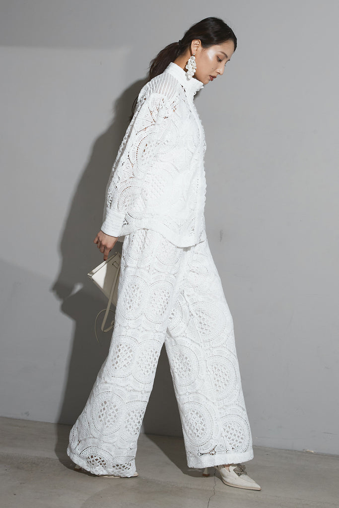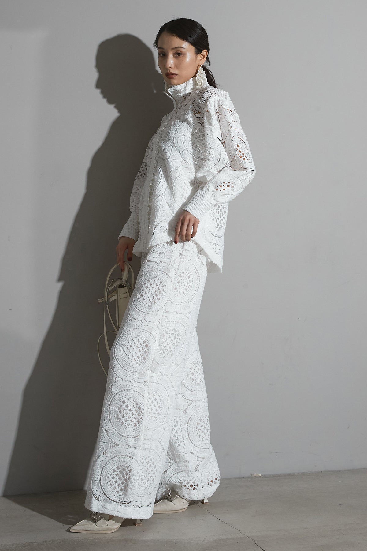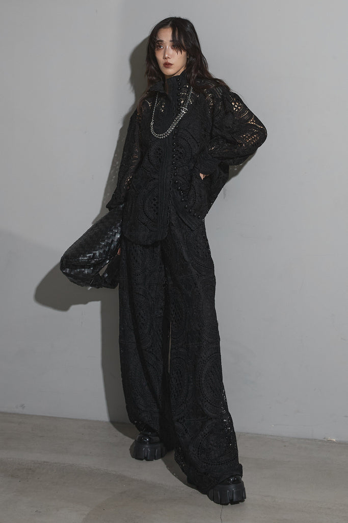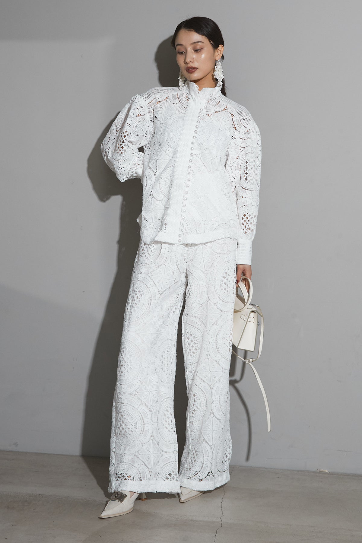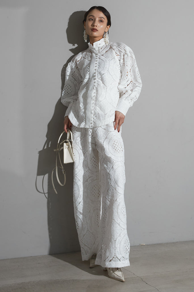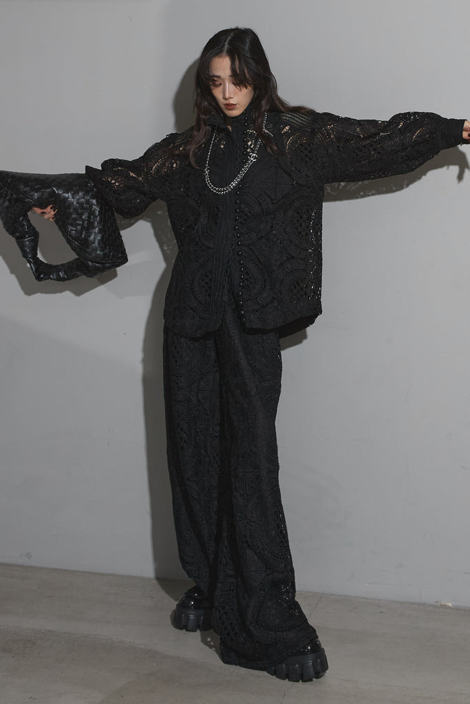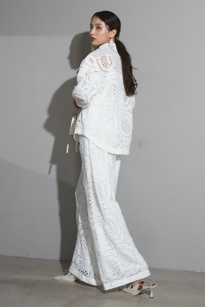 立体的なレース素材が華やかな印象を与えるセットアップ。 程よい透け感と繊細な模様が、エレガントでモードな雰囲気を演出します。 トップスはスタンドカラーとフロントボタンが特徴で、フォーマルにもカジュアルにも着回し可能。 ワイドシルエットのパンツがリラクシーさを加え、セットでの着用はもちろん、単品使いでも存在感のあるアイテムです。