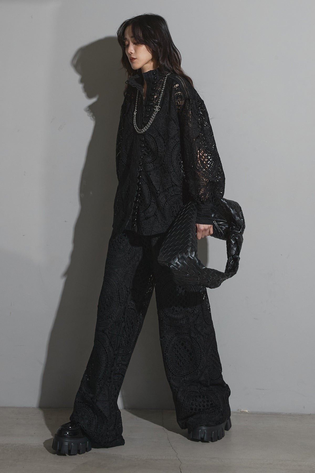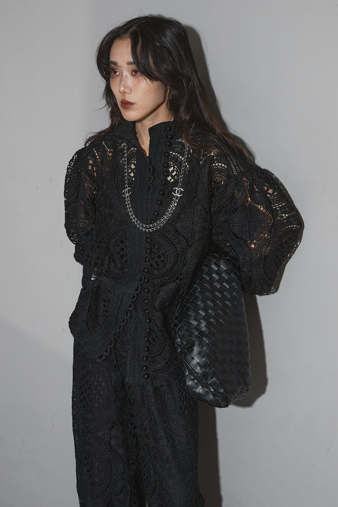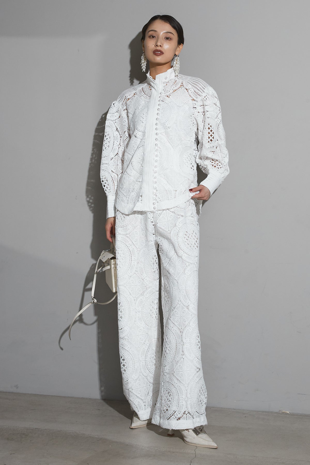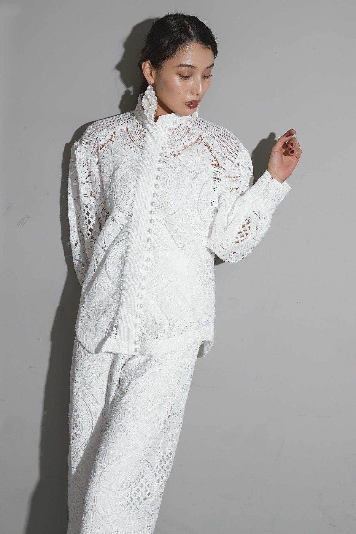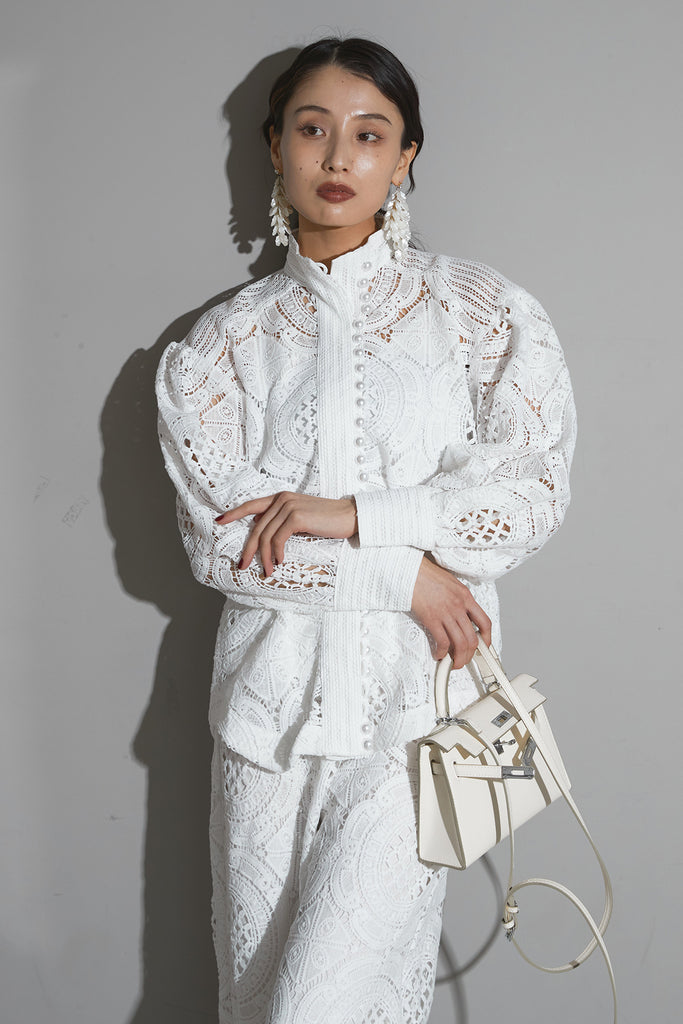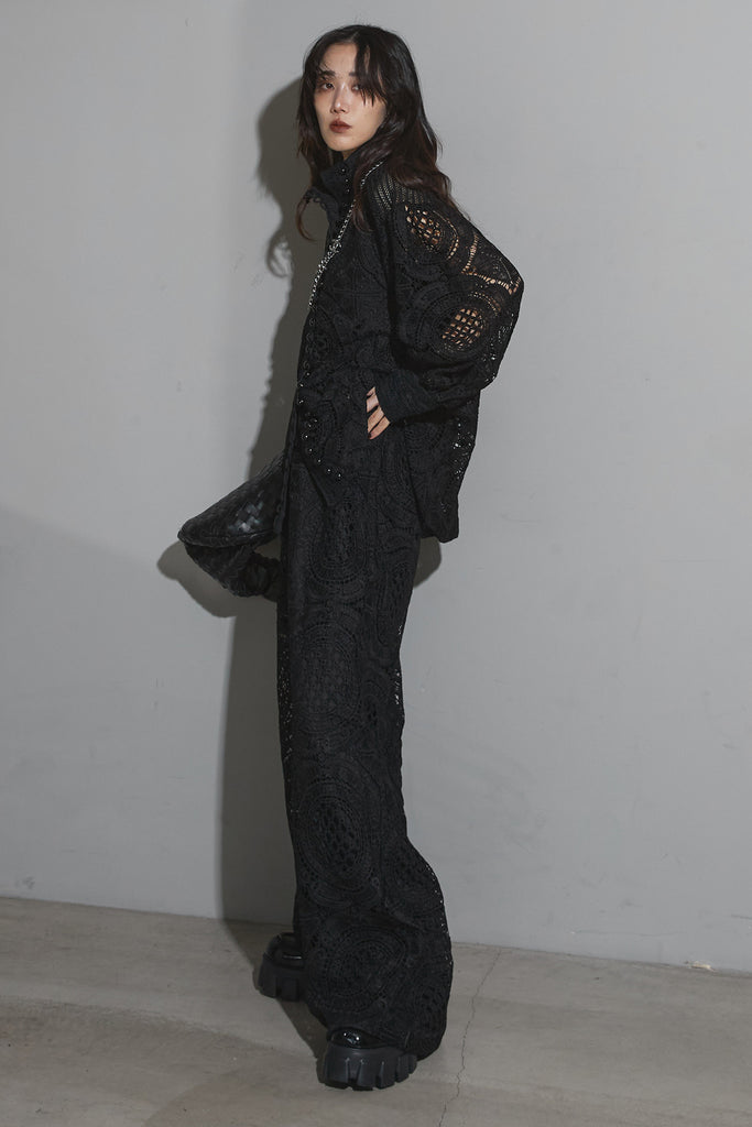 立体的なレース素材が華やかな印象を与えるセットアップ。 程よい透け感と繊細な模様が、エレガントでモードな雰囲気を演出します。 トップスはスタンドカラーとフロントボタンが特徴で、フォーマルにもカジュアルにも着回し可能。 ワイドシルエットのパンツがリラクシーさを加え、セットでの着用はもちろん、単品使いでも存在感のあるアイテムです。