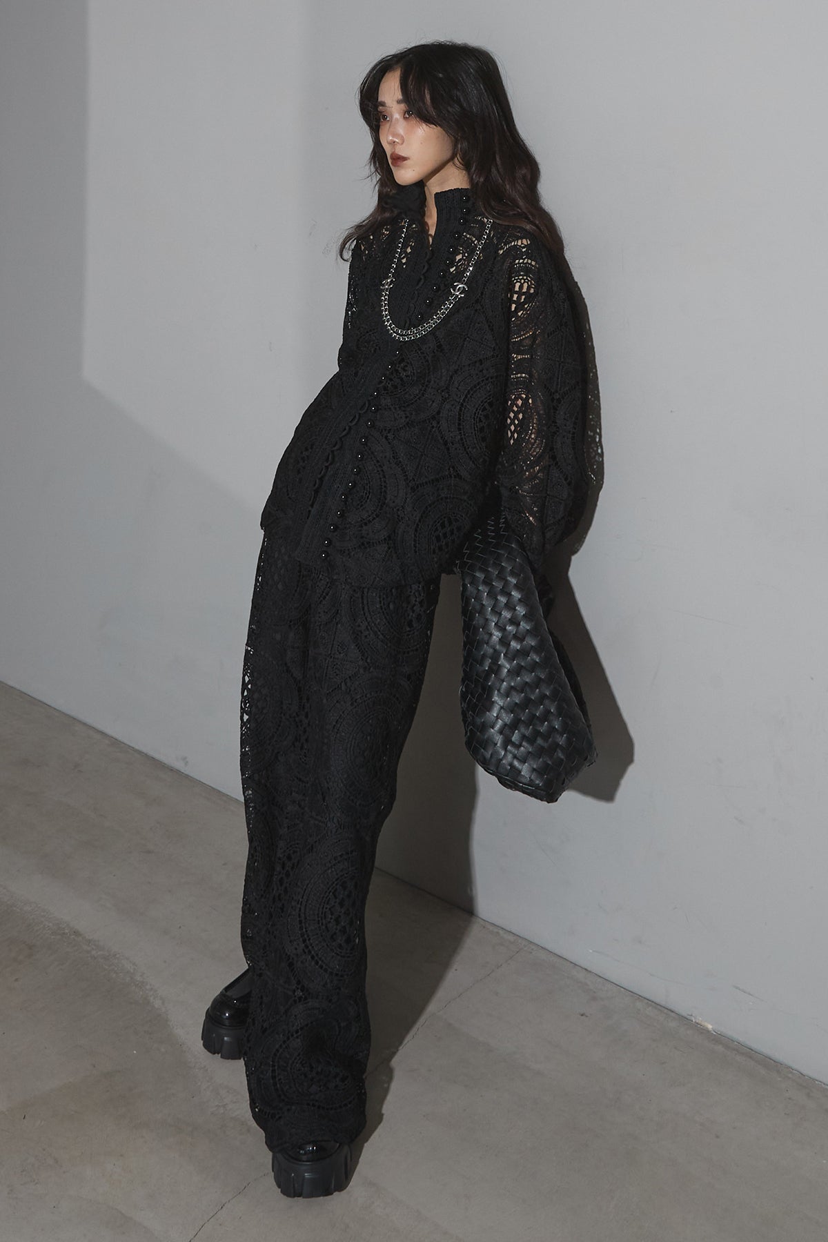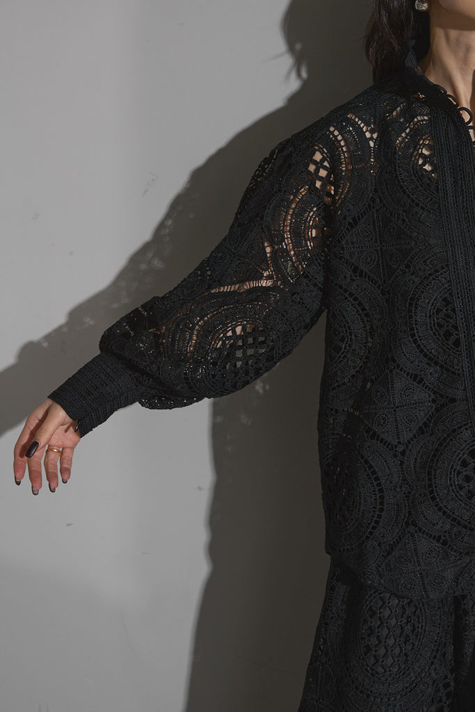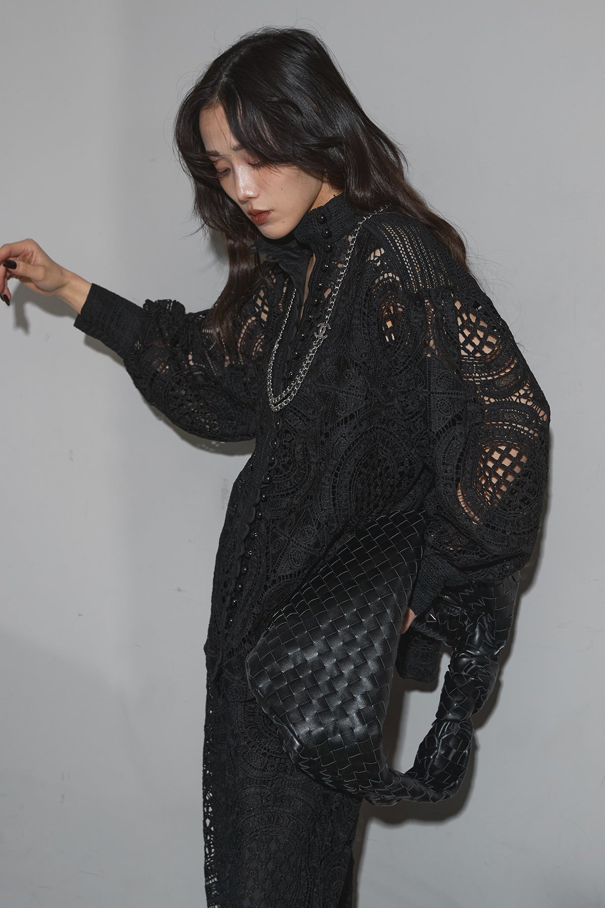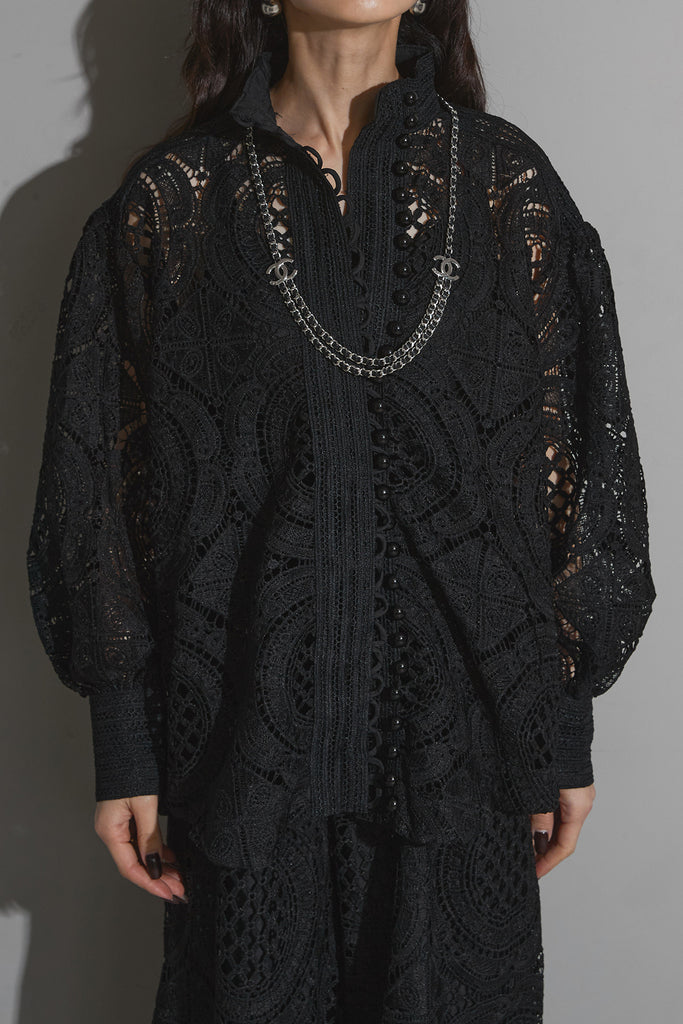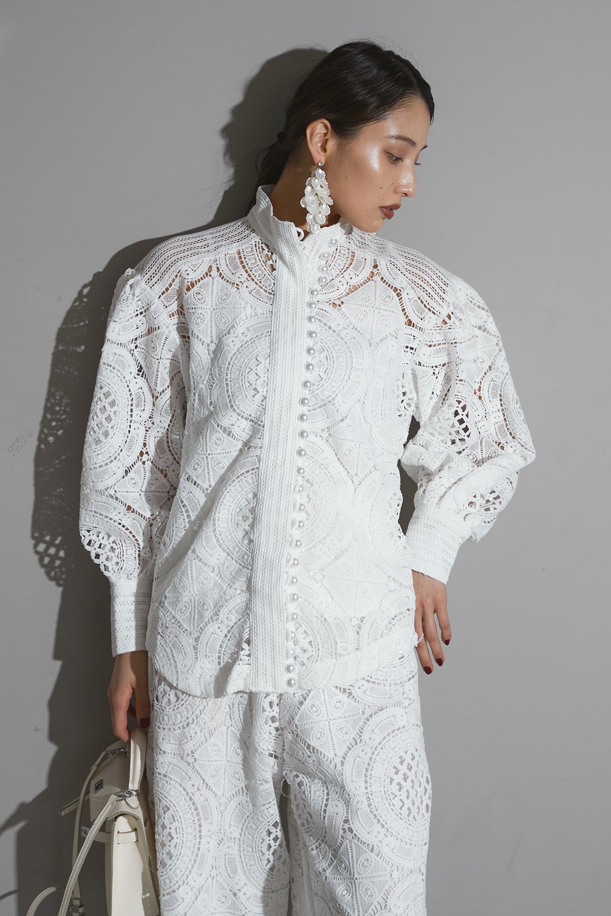 立体的なレース素材が華やかな印象を与えるセットアップ。 程よい透け感と繊細な模様が、エレガントでモードな雰囲気を演出します。 トップスはスタンドカラーとフロントボタンが特徴で、フォーマルにもカジュアルにも着回し可能。 ワイドシルエットのパンツがリラクシーさを加え、セットでの着用はもちろん、単品使いでも存在感のあるアイテムです。