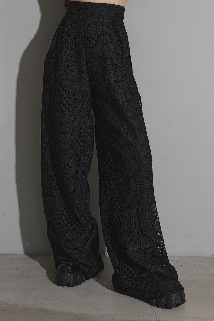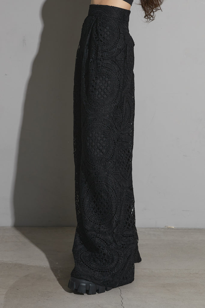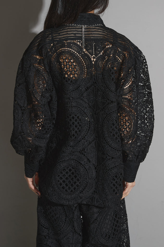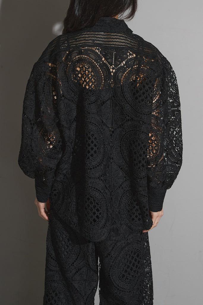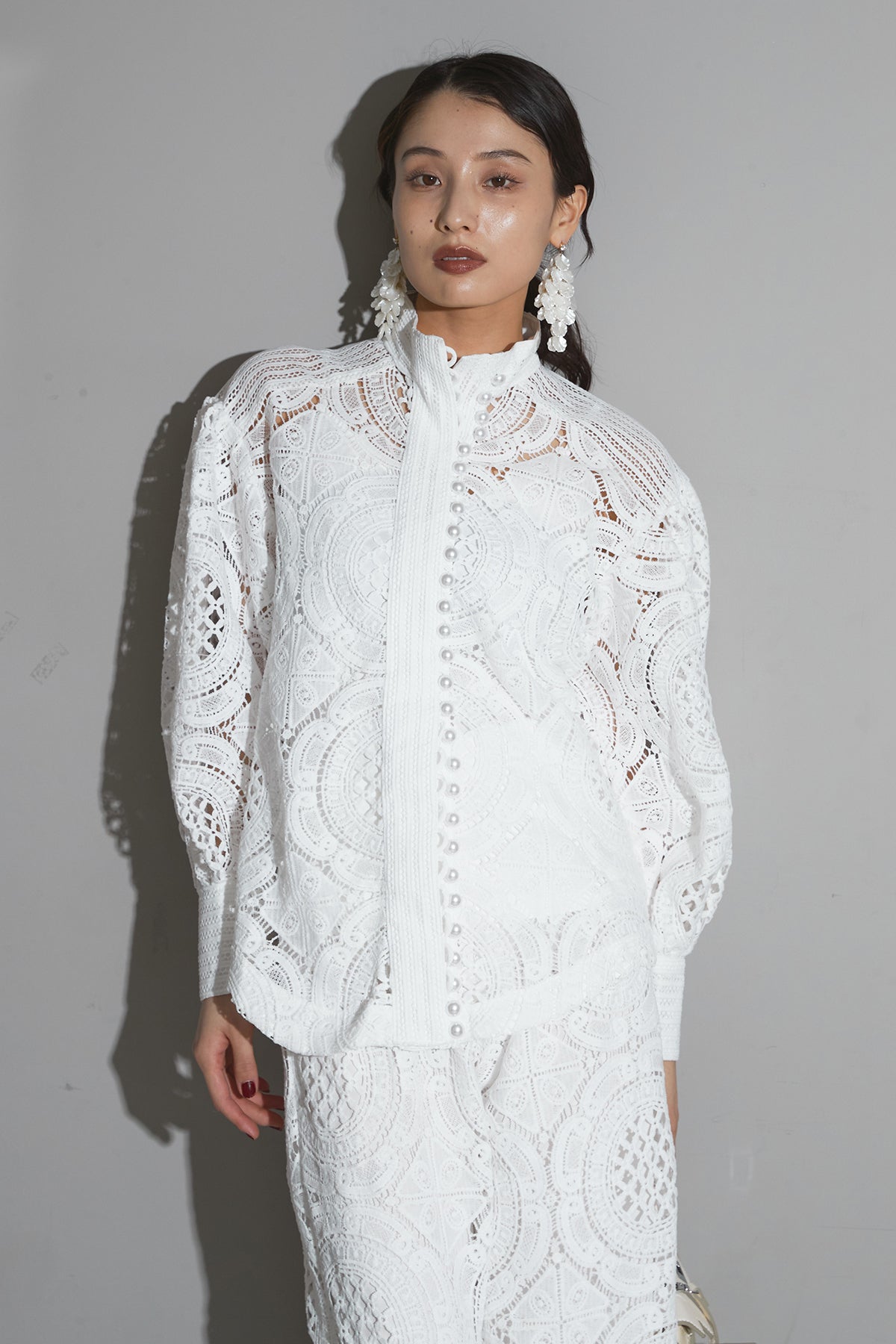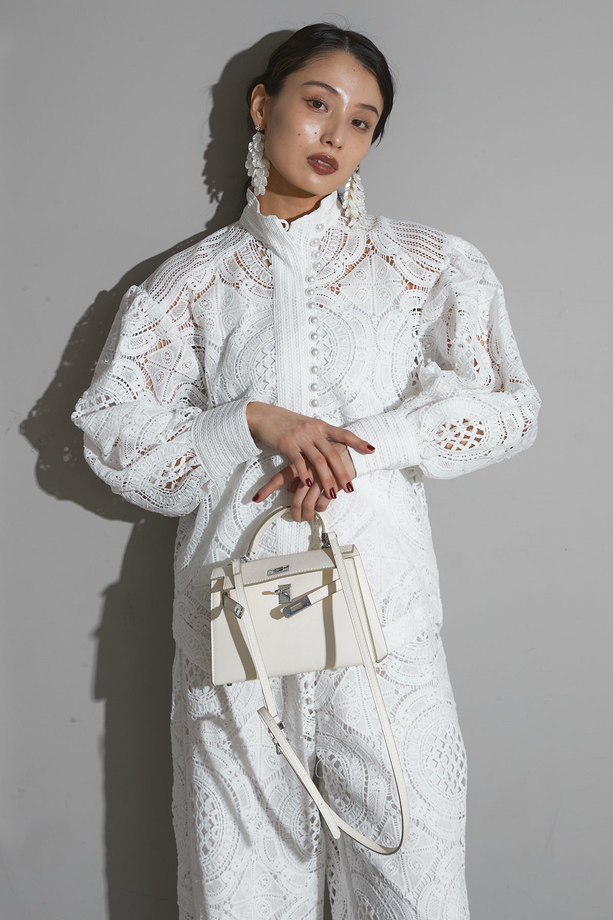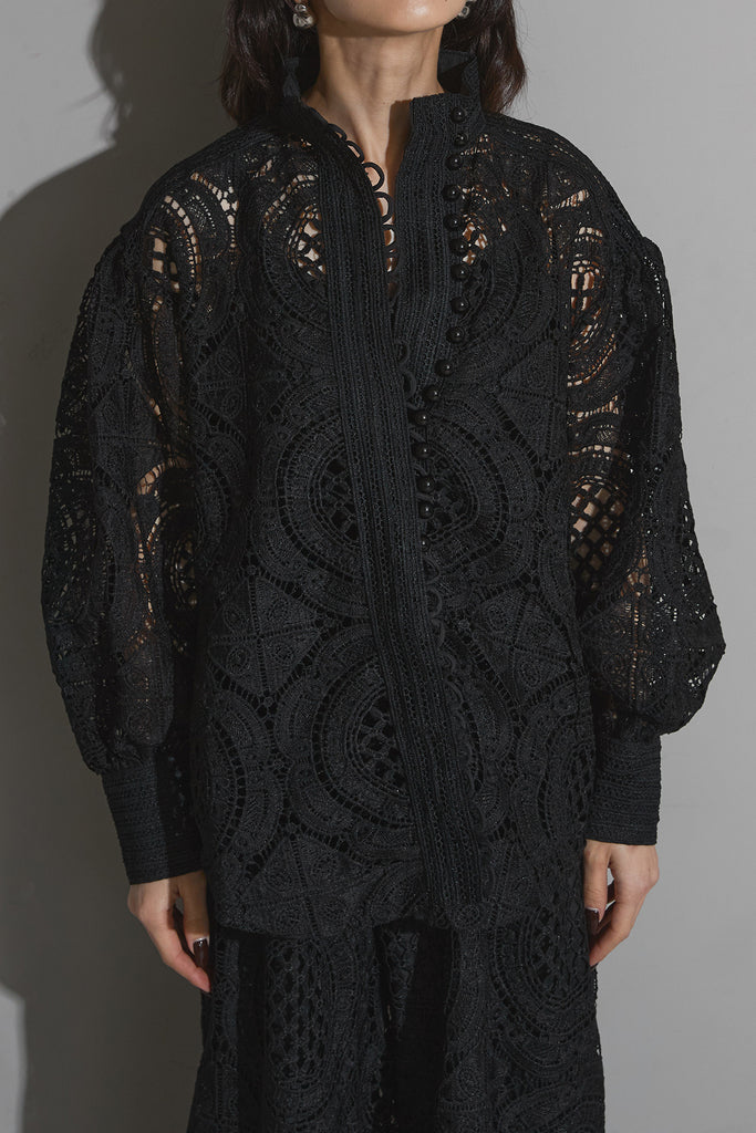 立体的なレース素材が華やかな印象を与えるセットアップ。 程よい透け感と繊細な模様が、エレガントでモードな雰囲気を演出します。 トップスはスタンドカラーとフロントボタンが特徴で、フォーマルにもカジュアルにも着回し可能。 ワイドシルエットのパンツがリラクシーさを加え、セットでの着用はもちろん、単品使いでも存在感のあるアイテムです。