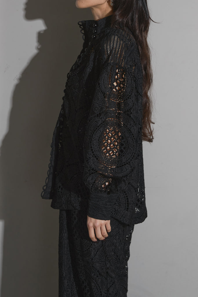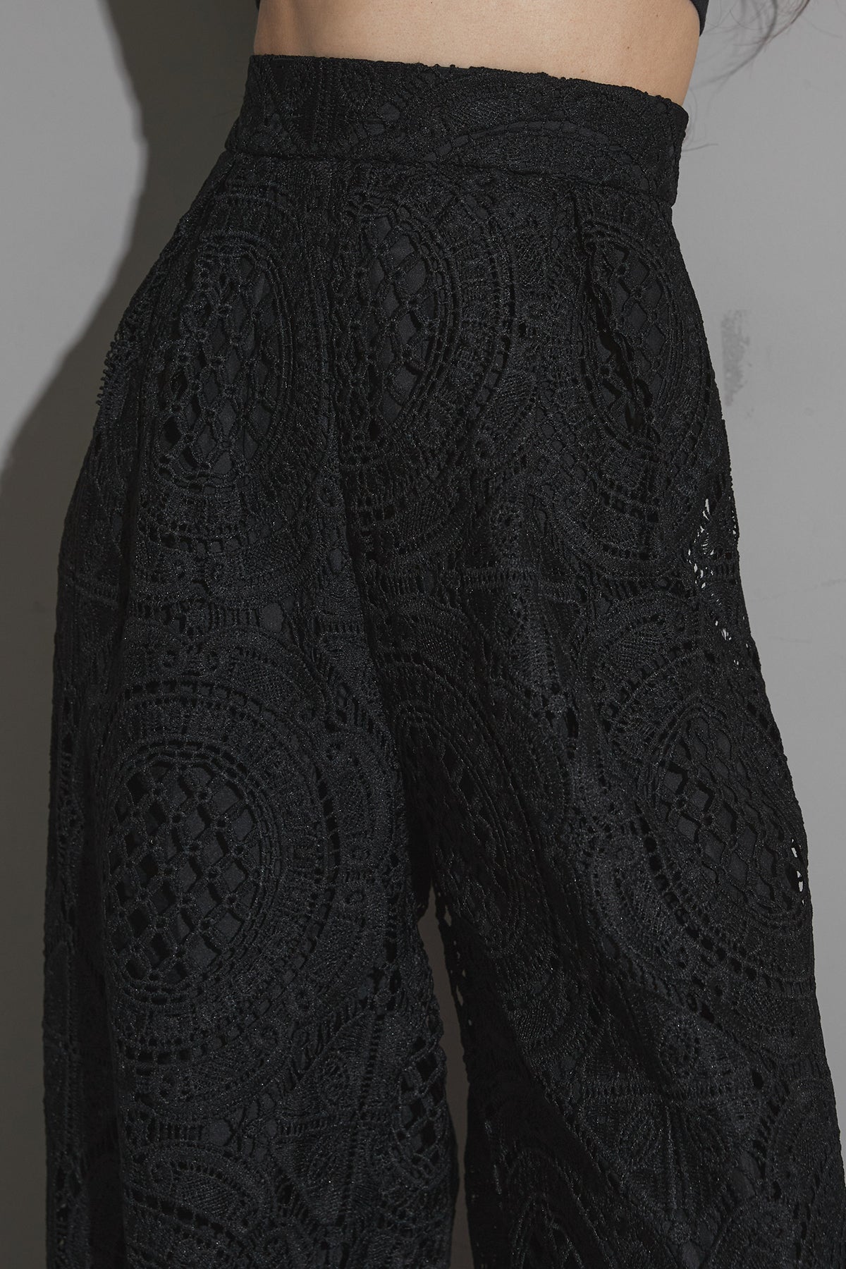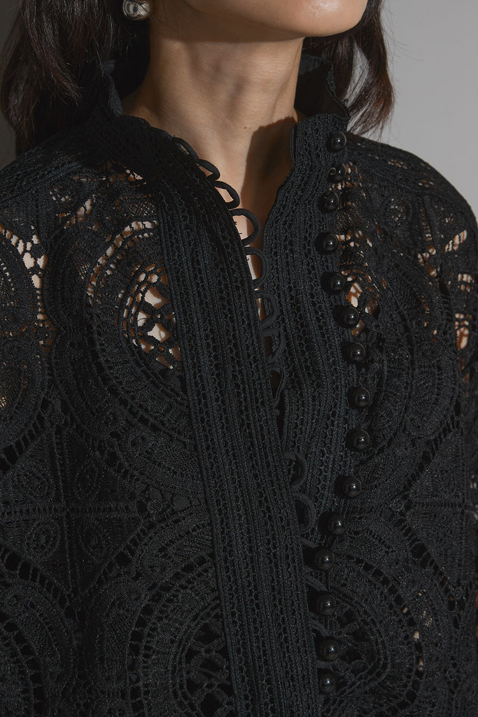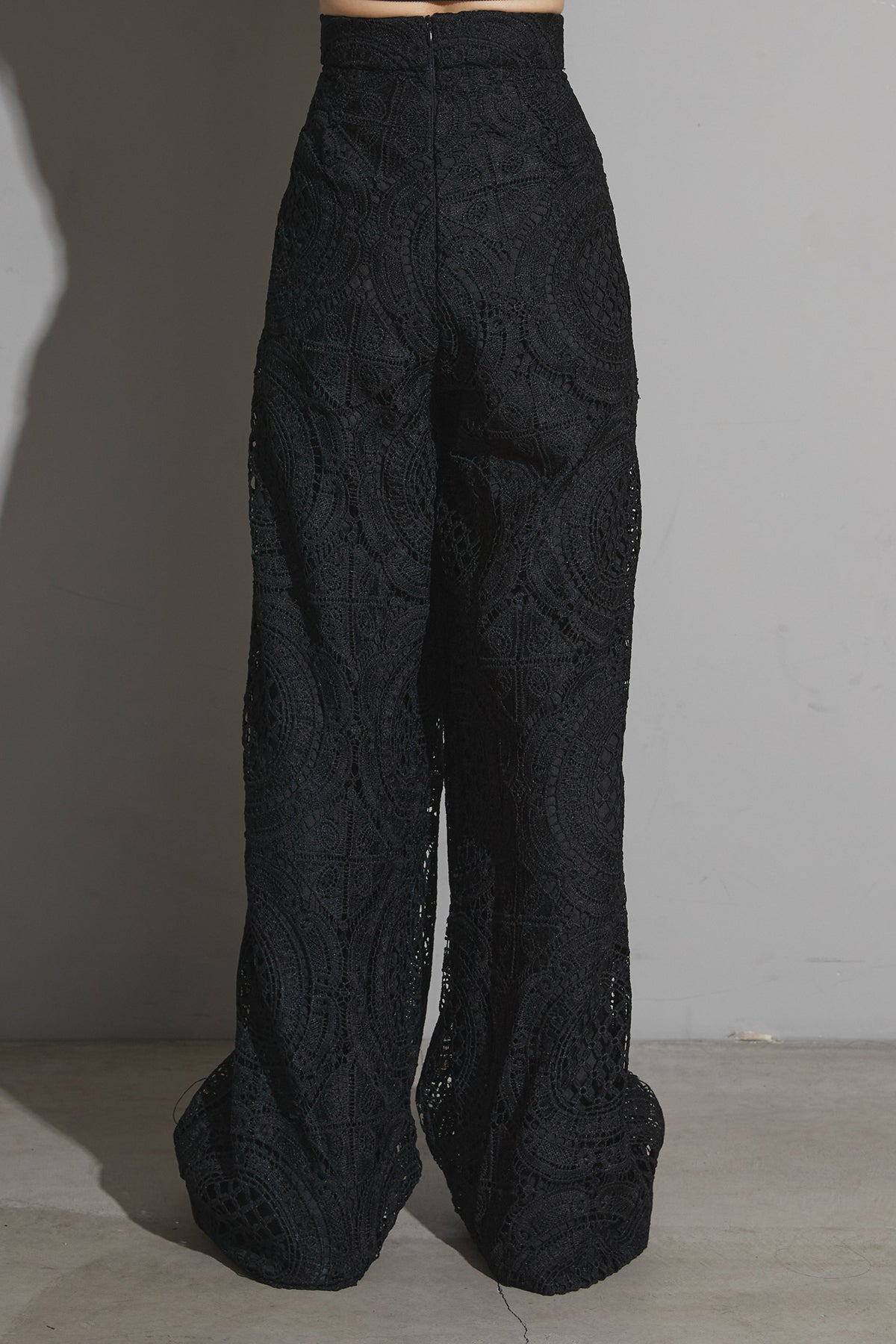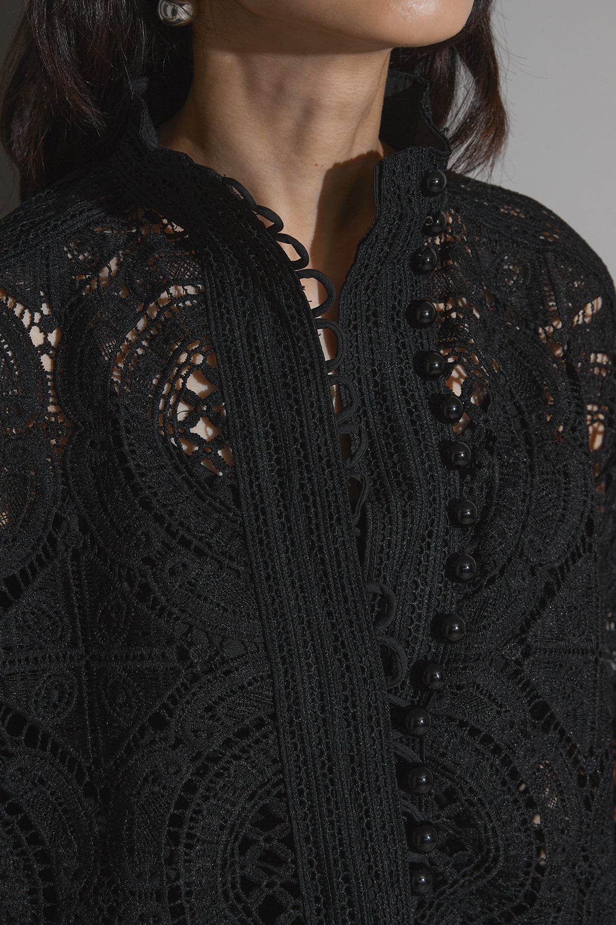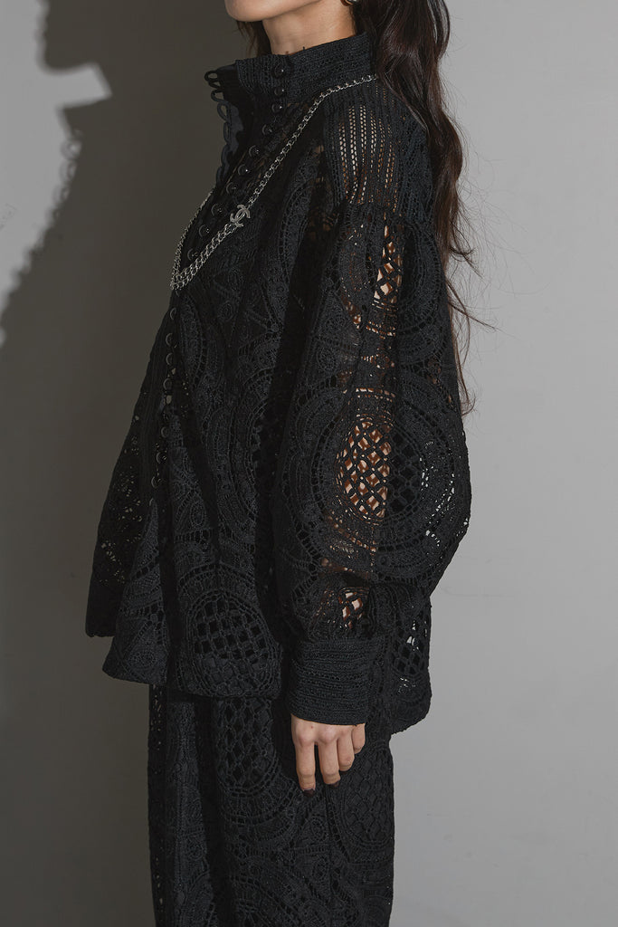 立体的なレース素材が華やかな印象を与えるセットアップ。 程よい透け感と繊細な模様が、エレガントでモードな雰囲気を演出します。 トップスはスタンドカラーとフロントボタンが特徴で、フォーマルにもカジュアルにも着回し可能。 ワイドシルエットのパンツがリラクシーさを加え、セットでの着用はもちろん、単品使いでも存在感のあるアイテムです。