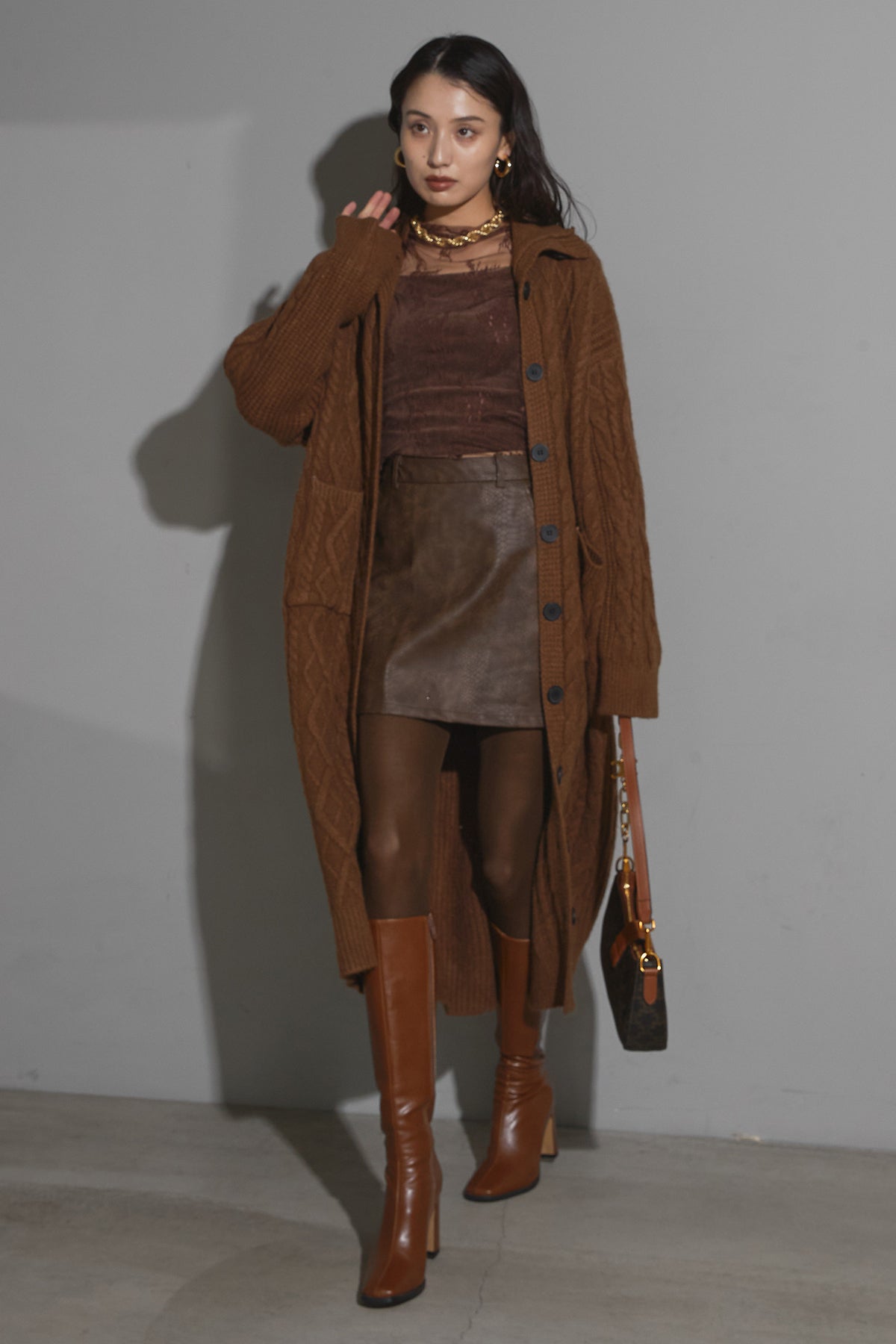 クロコダイル調の型押しが施されたフェイクレザーミニスカート。 上品な光沢と立体感のあるテクスチャーが、コーディネートにモードな印象をプラスします。 コンパクトな丈感ながら、しっかりとした生地で大人っぽく着こなせるアイテム。 ニットやロングブーツと合わせて、秋冬らしいバランスの取れたスタイリングを楽しめます。