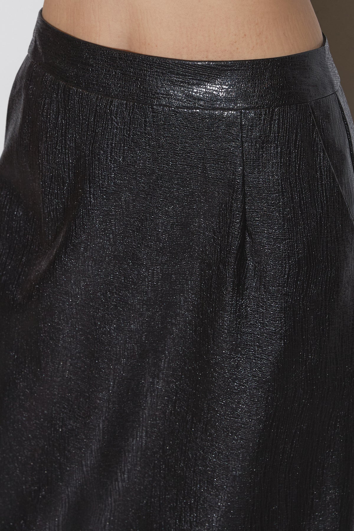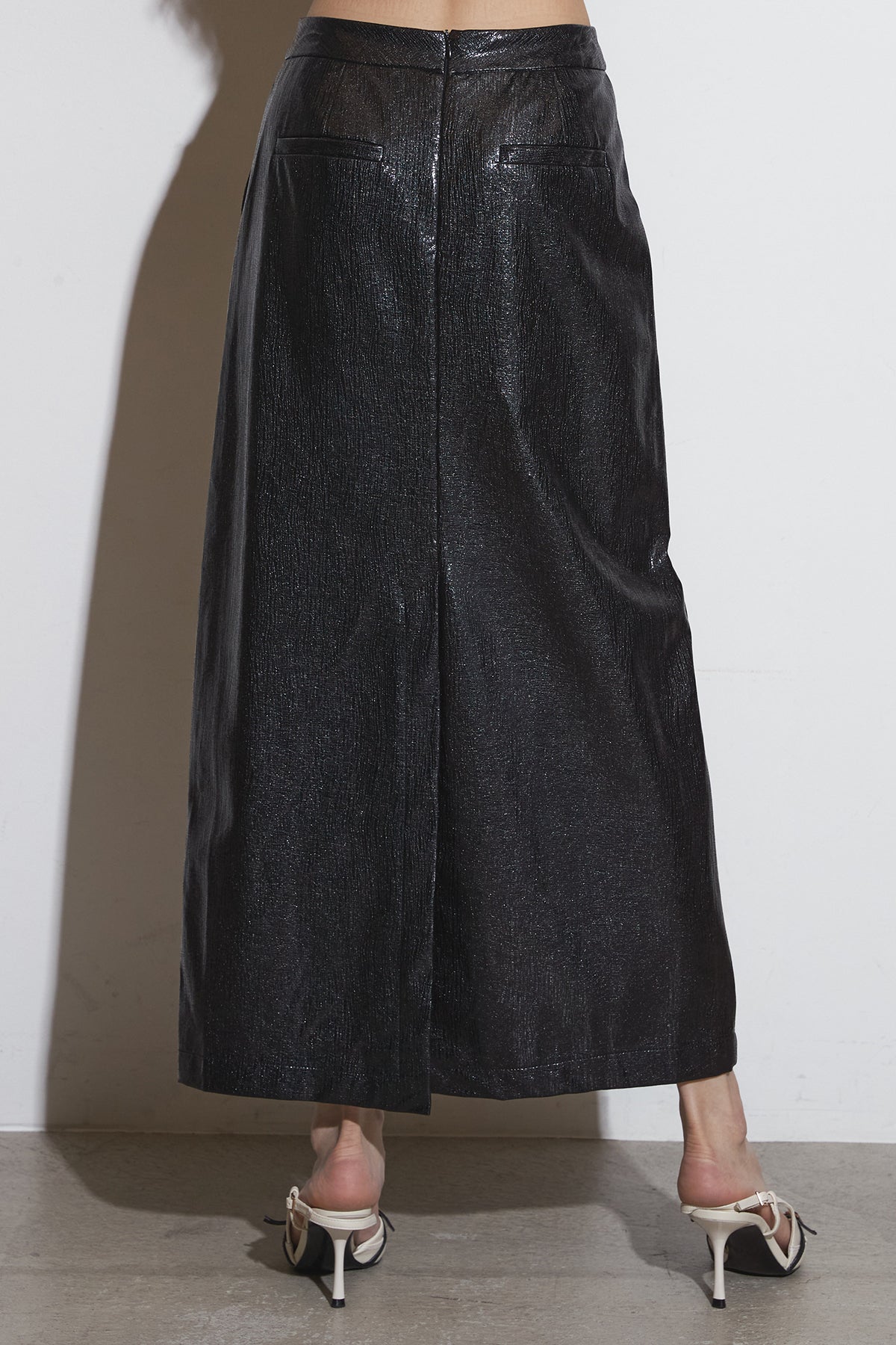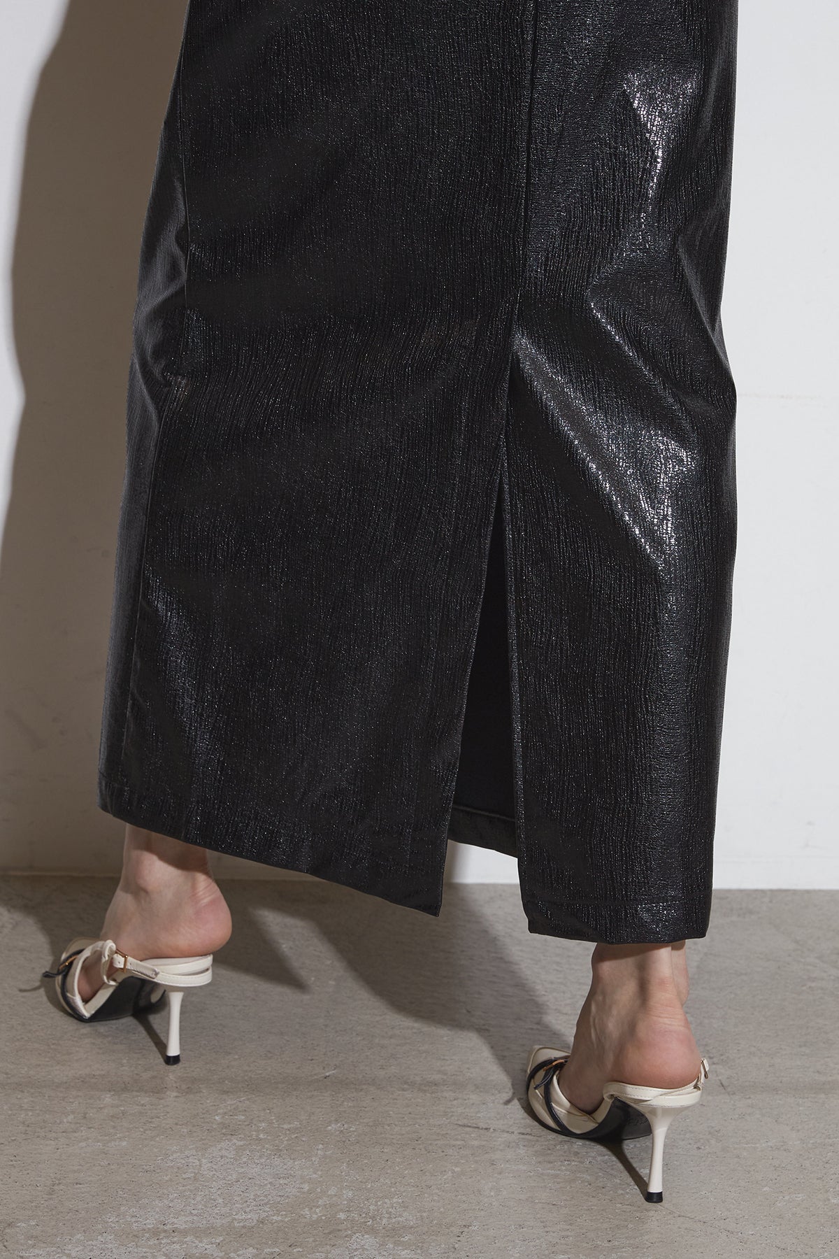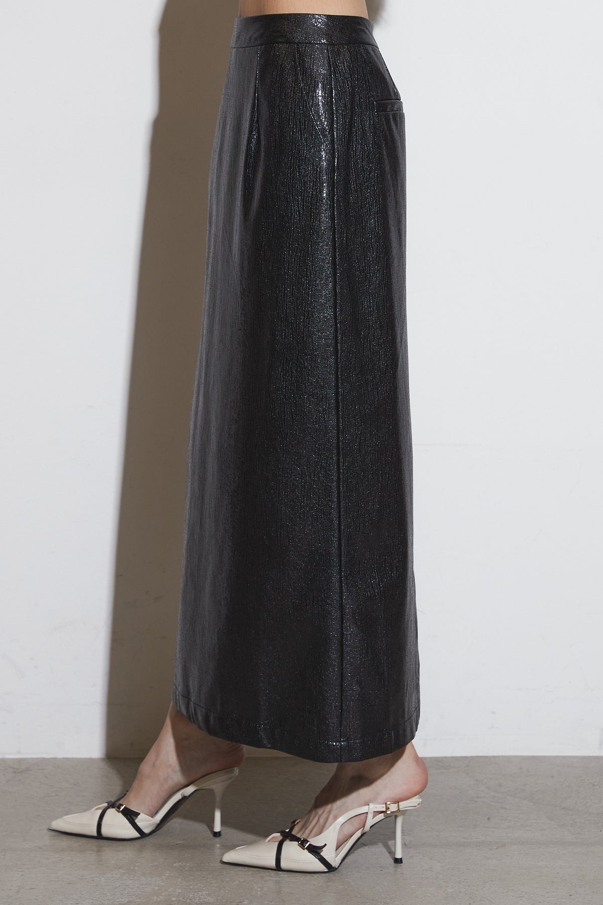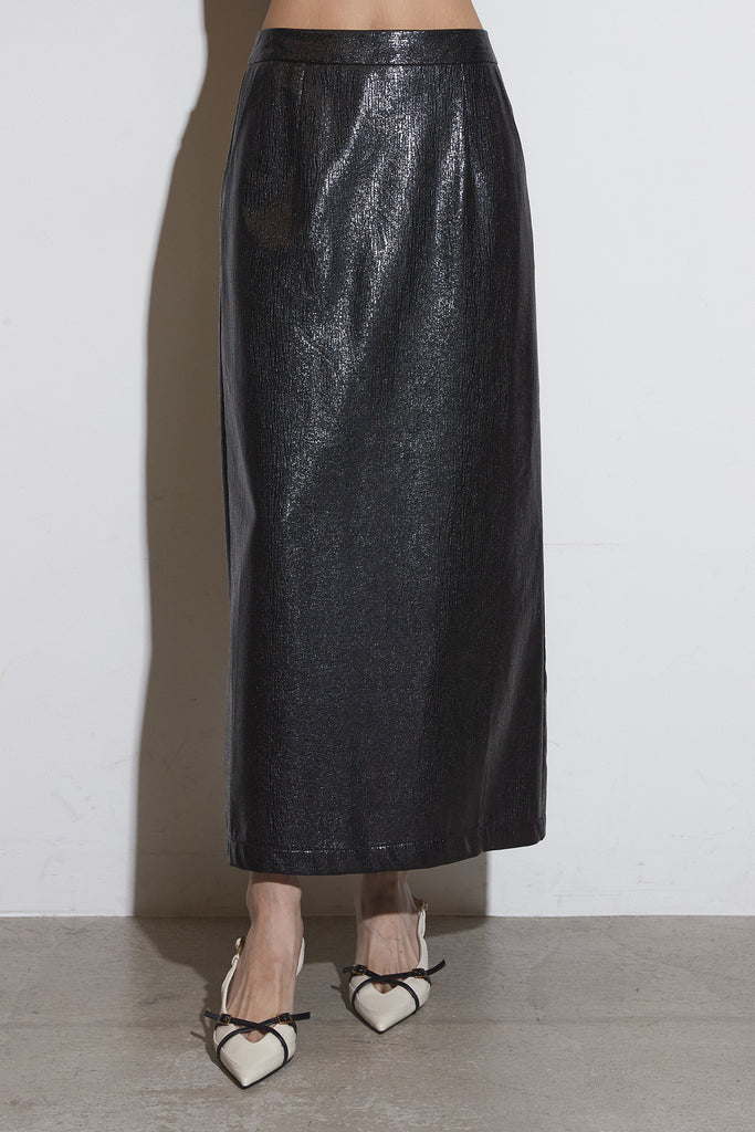 上品な光沢が目を惹くタイトシルエットのスカート。 動くたびに繊細に輝き、スタイリングにモードなアクセントをプラスします。 フロントのポケットデザインが程よくカジュアルさを演出し、 シンプルなトップスを合わせるだけで洗練された印象に仕上がります。