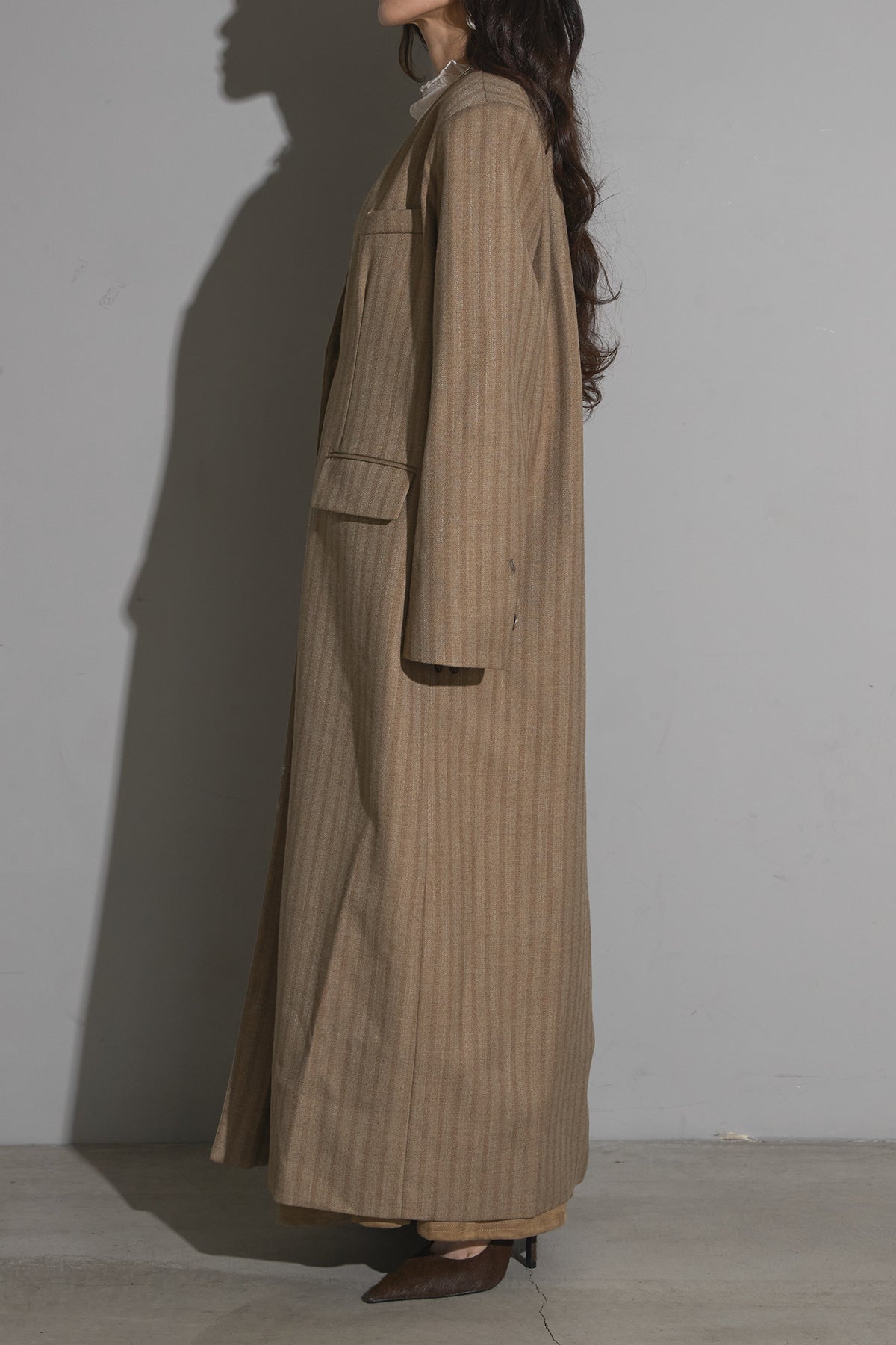 ストライプ柄が上品な印象を与えるロングコート。 程よくゆとりのあるシルエットで、インナーを選ばずレイヤードスタイルにも最適です。 落ち着いたトーンのカラーと軽やかな生地感が、季節の変わり目にも活躍。 シンプルながらも存在感のあるデザインで、羽織るだけでスタイルが完成します。