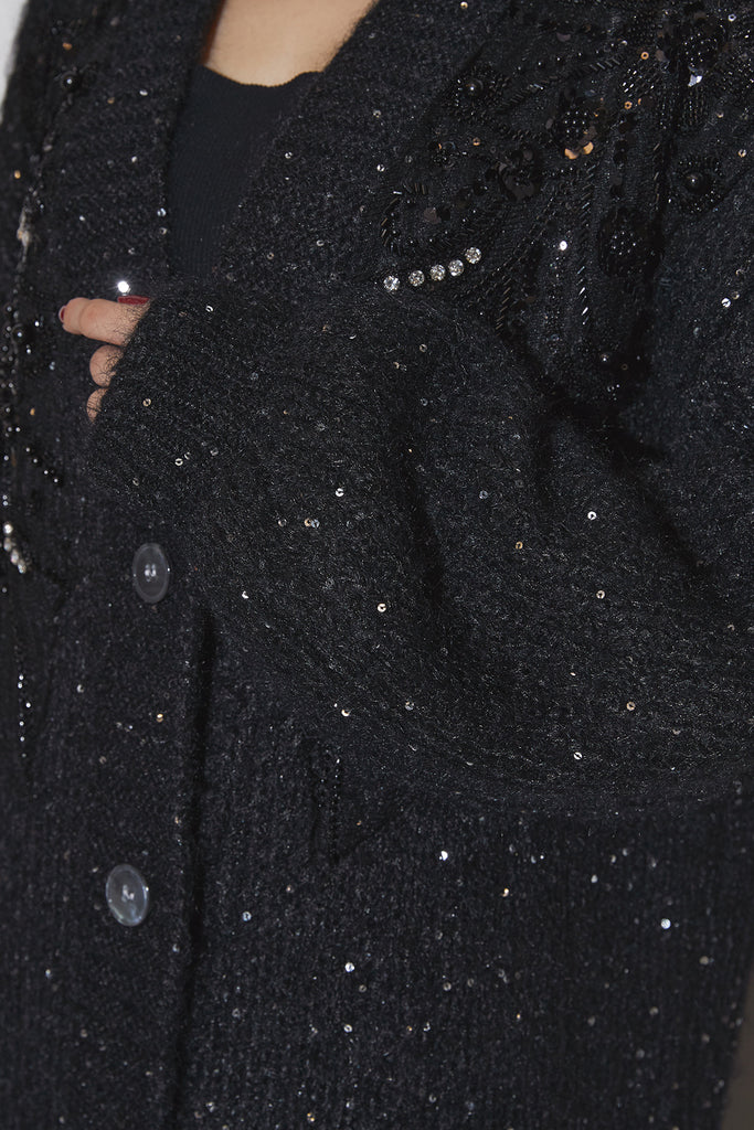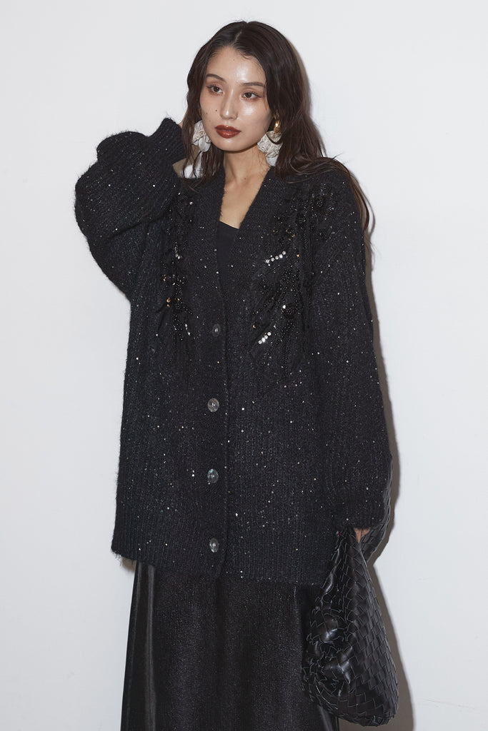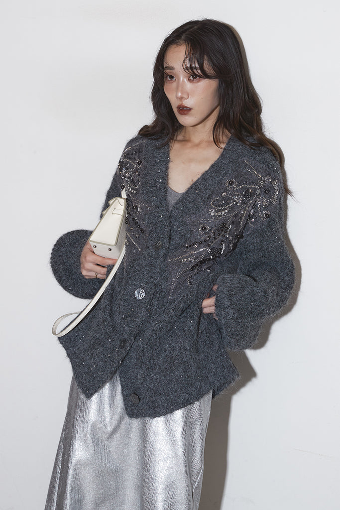 フロントに施されたビジュー刺繍が目を惹くカーディガン。 ふんわりとした風合いが優しい印象を与えつつ、華やかさをプラスします。 程よい丈感でボトムスを選ばず、羽織るだけでスタイリングが決まる一枚。 デイリー使いはもちろん、特別なシーンにも活躍するアイテムです。