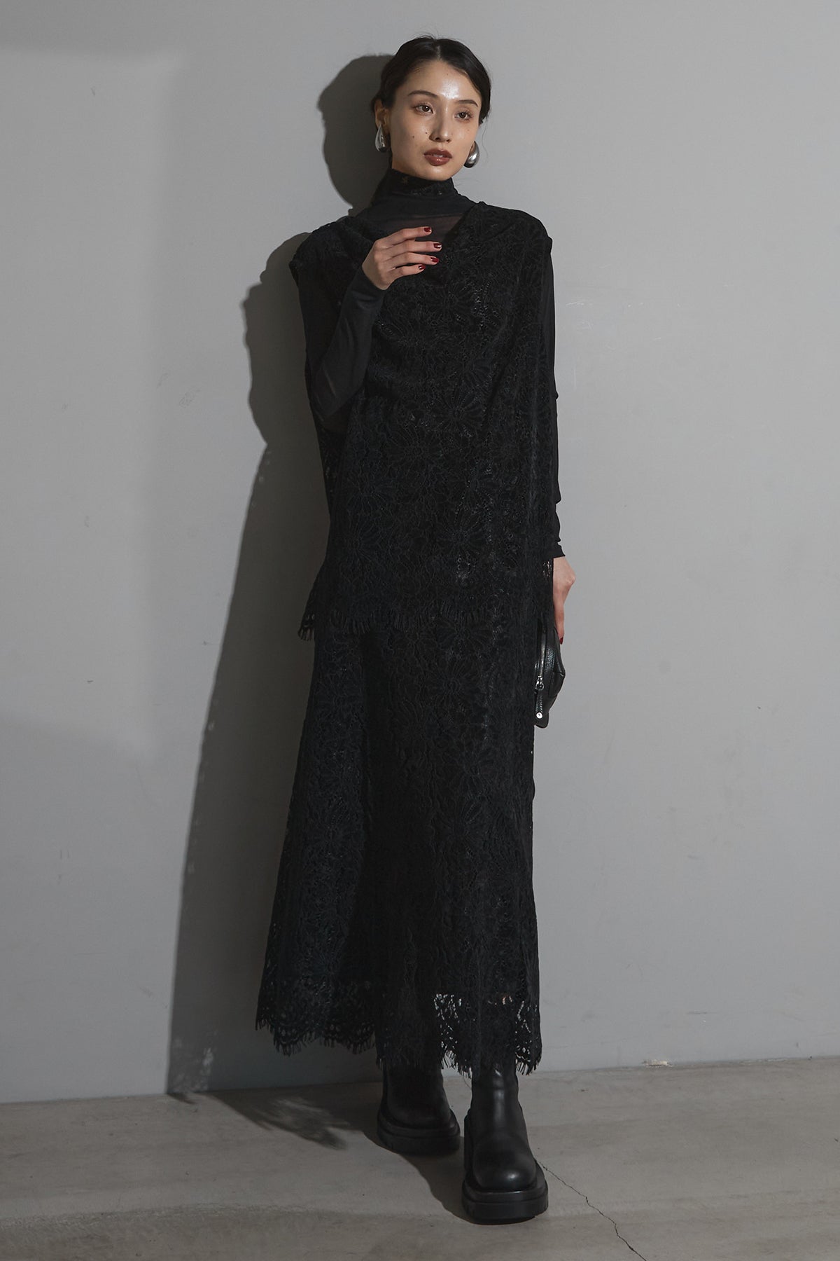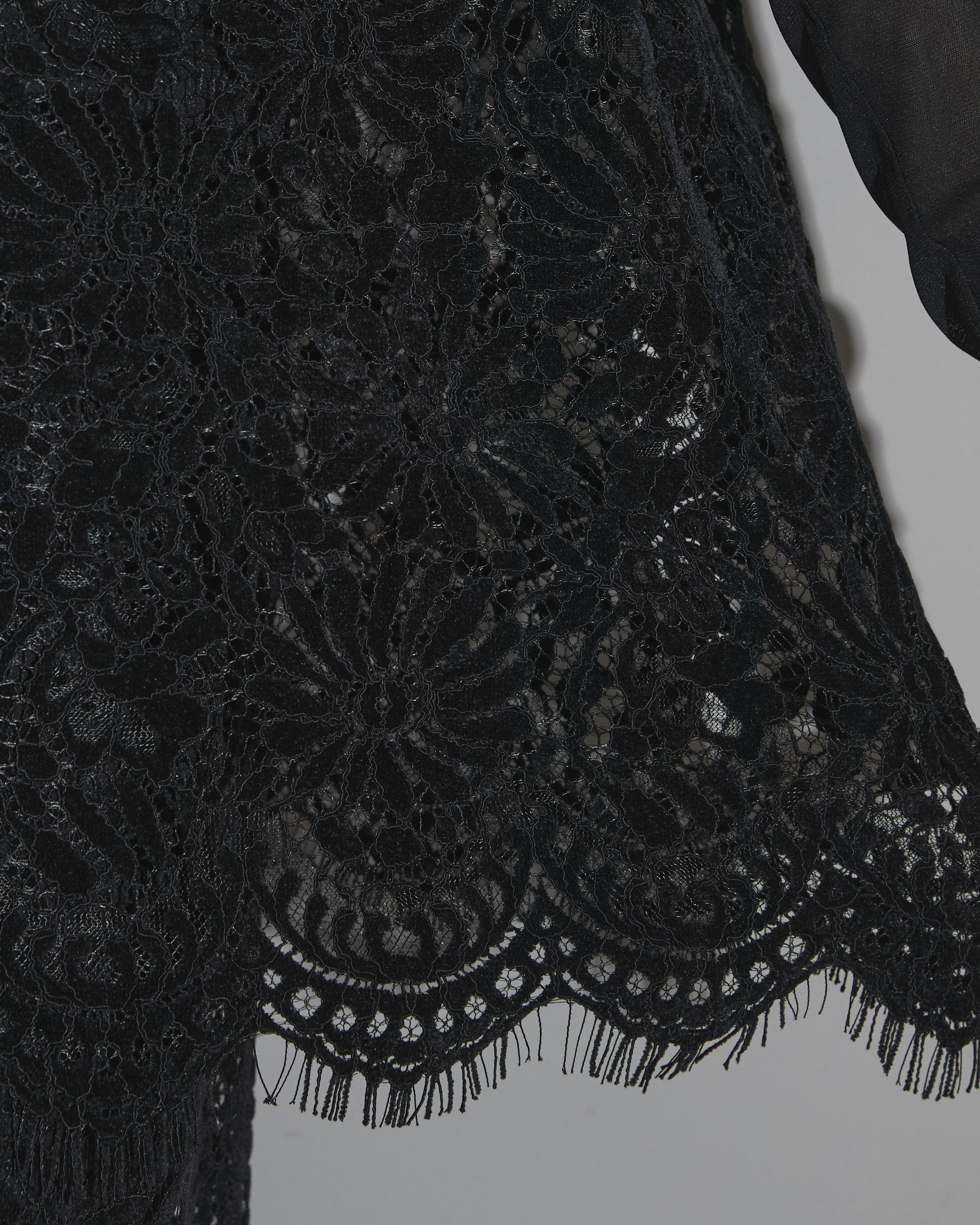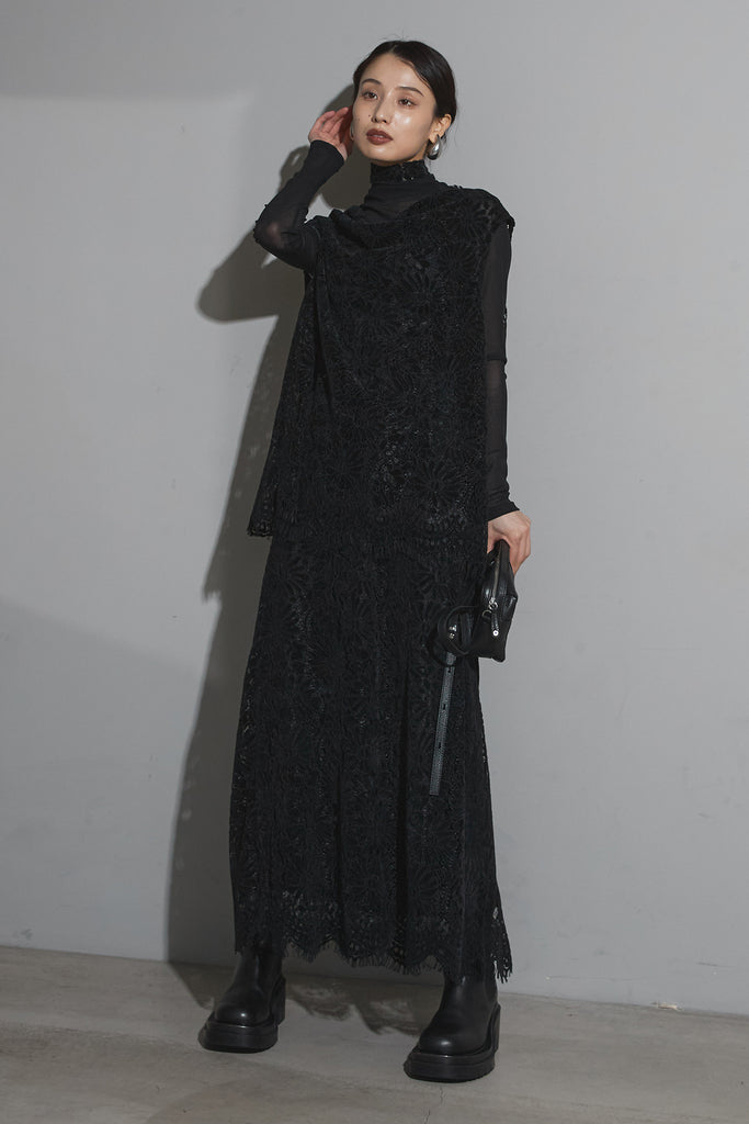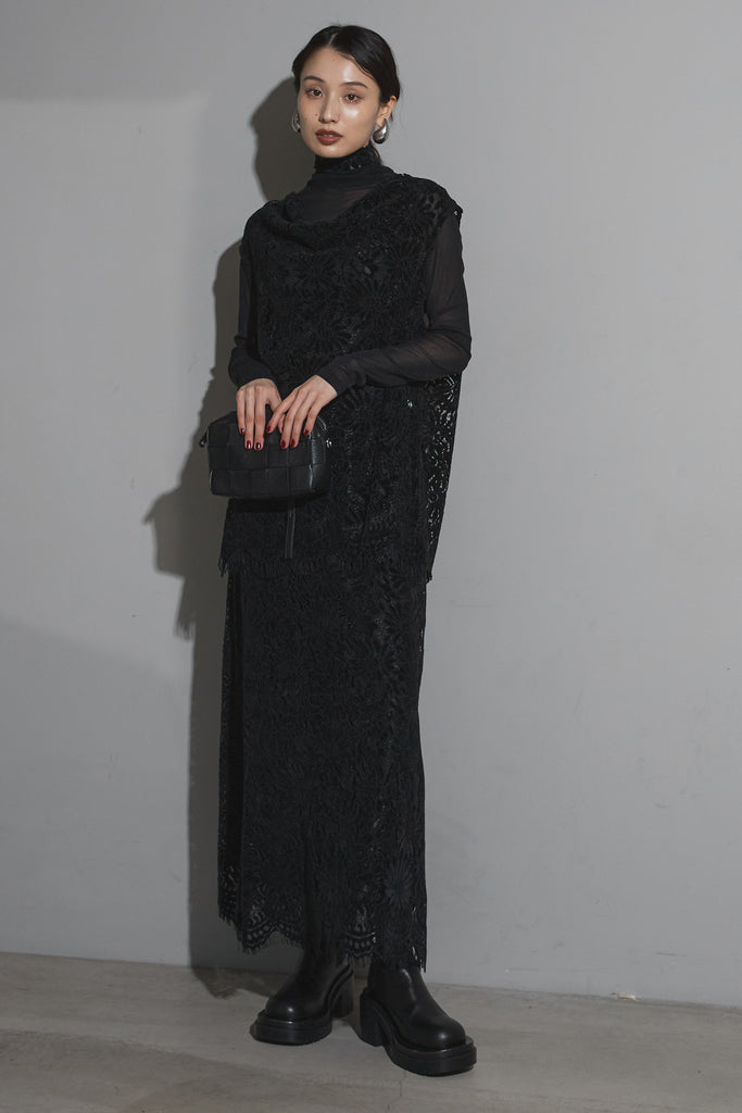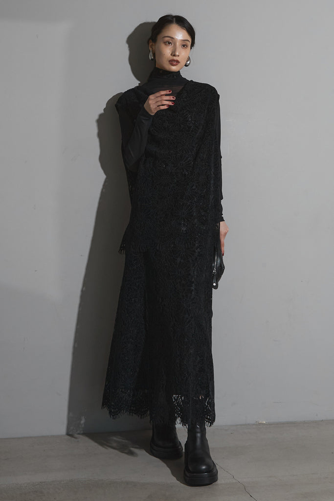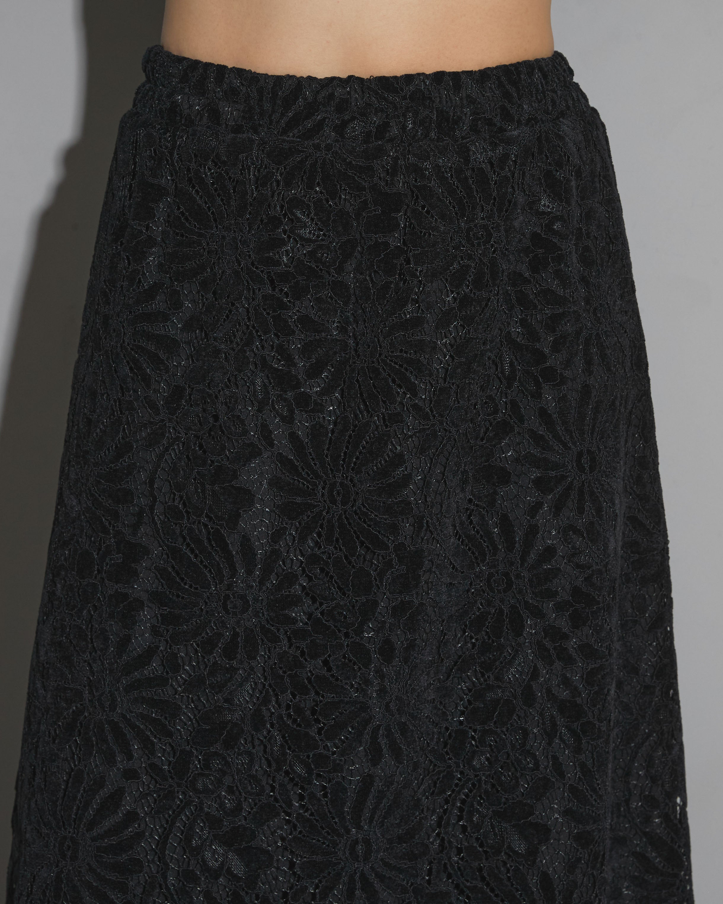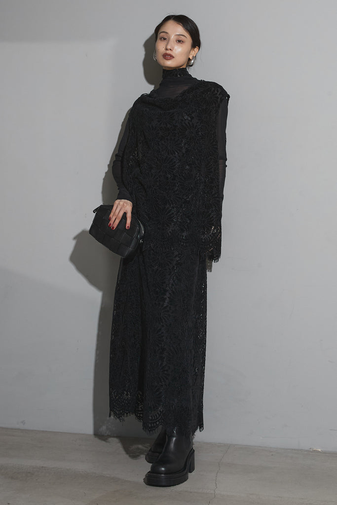 ベロアのような柔らかな光沢とレースの立体感が美しいセットアップ。 トップスはドレープネックで女性らしさを引き立て、スカートは程よく広がるシルエットで上品な印象に。 華やかさがありながらも落ち着いたトーンで、オケージョンにもデイリーにも着こなせるアイテムです。 上下それぞれ単品でも使いやすく、スタイリングの幅が広がります。