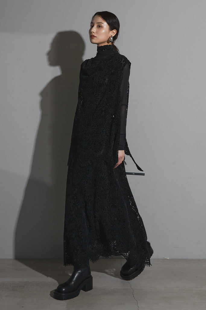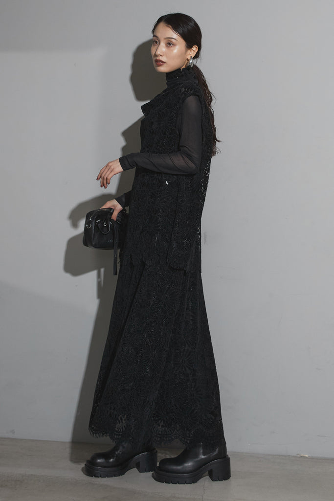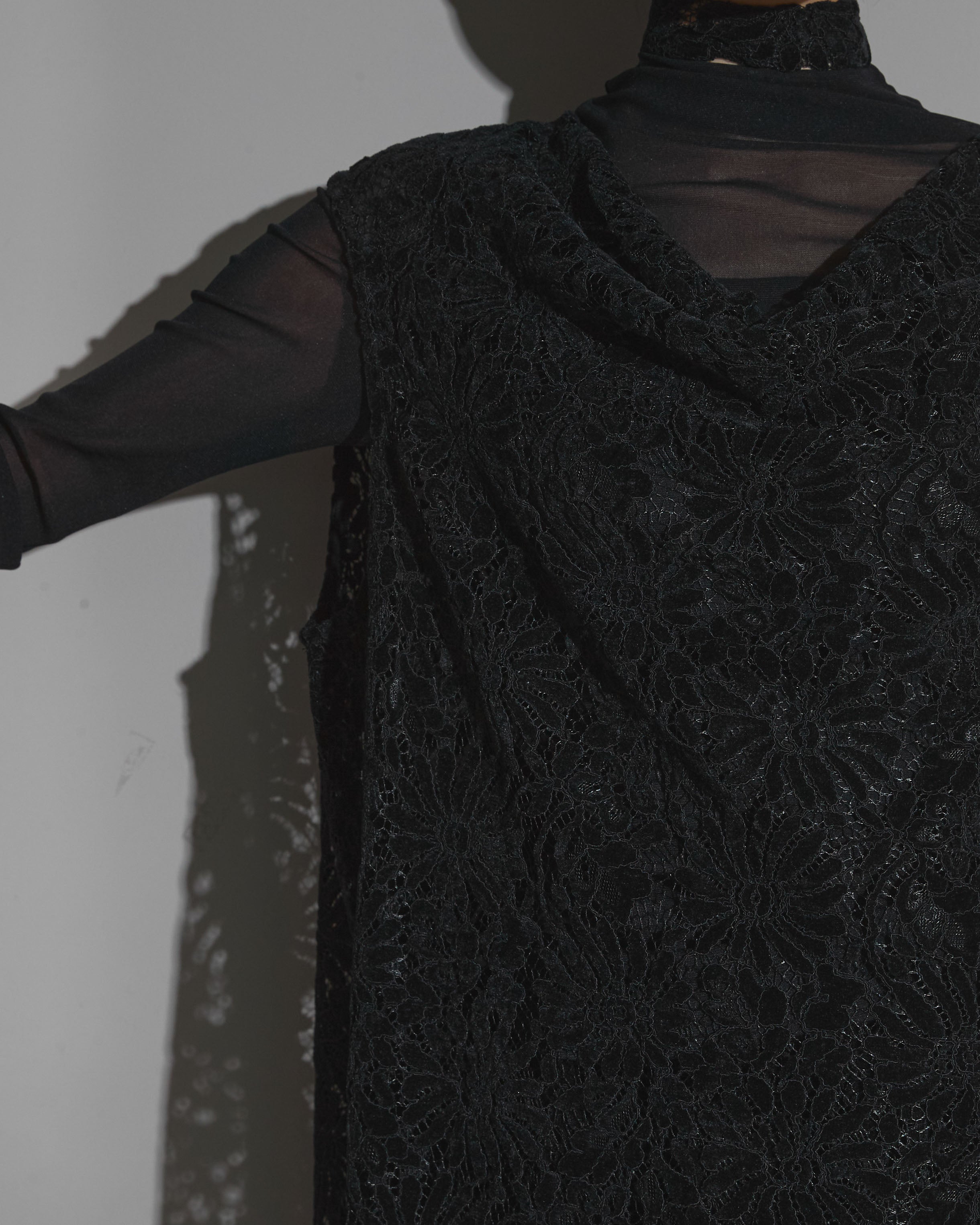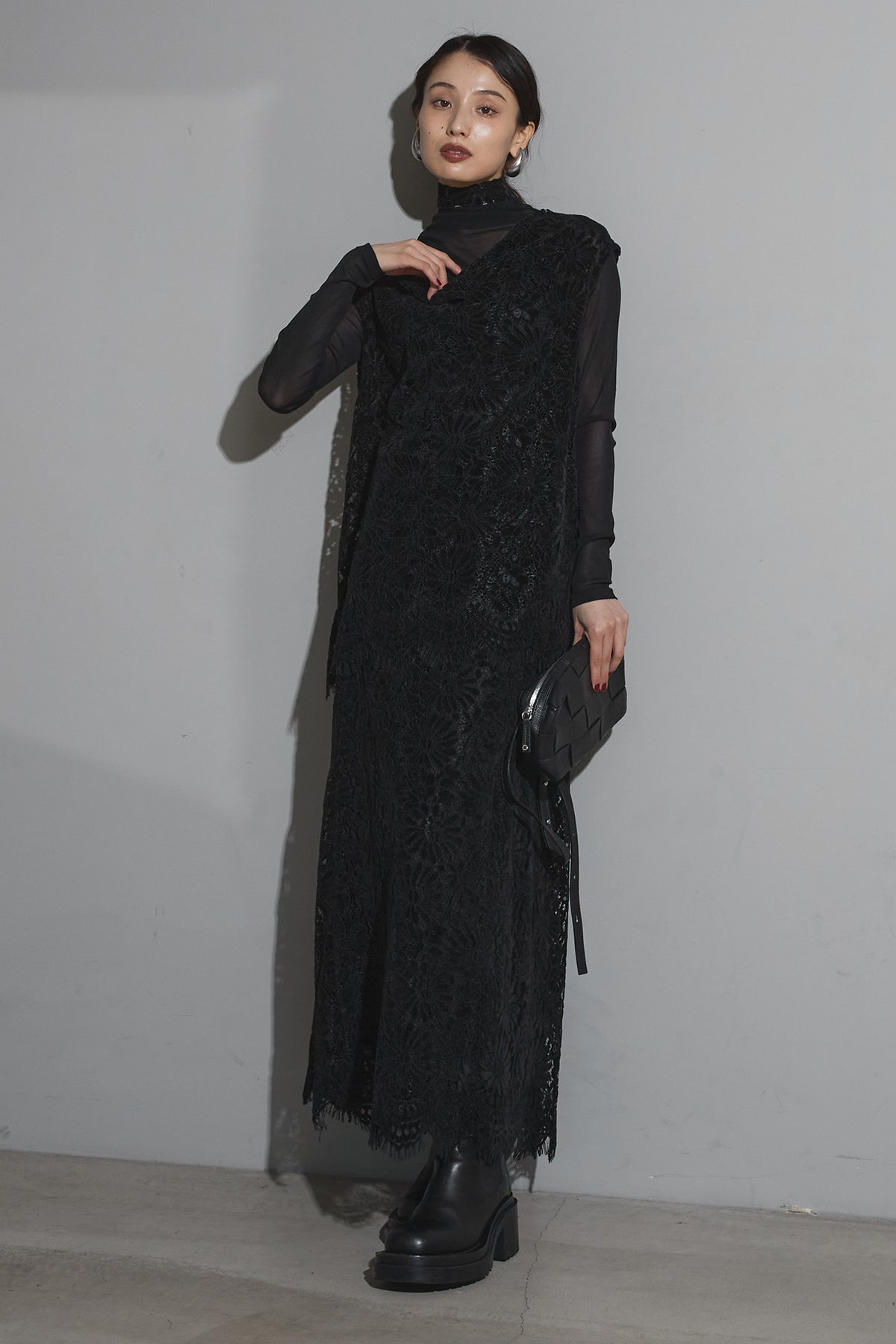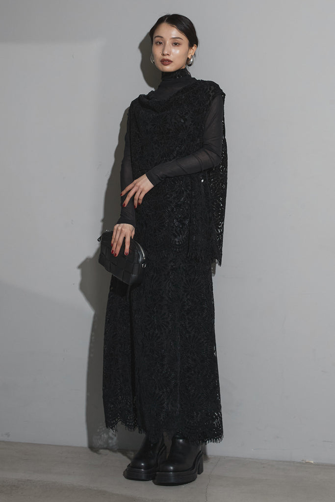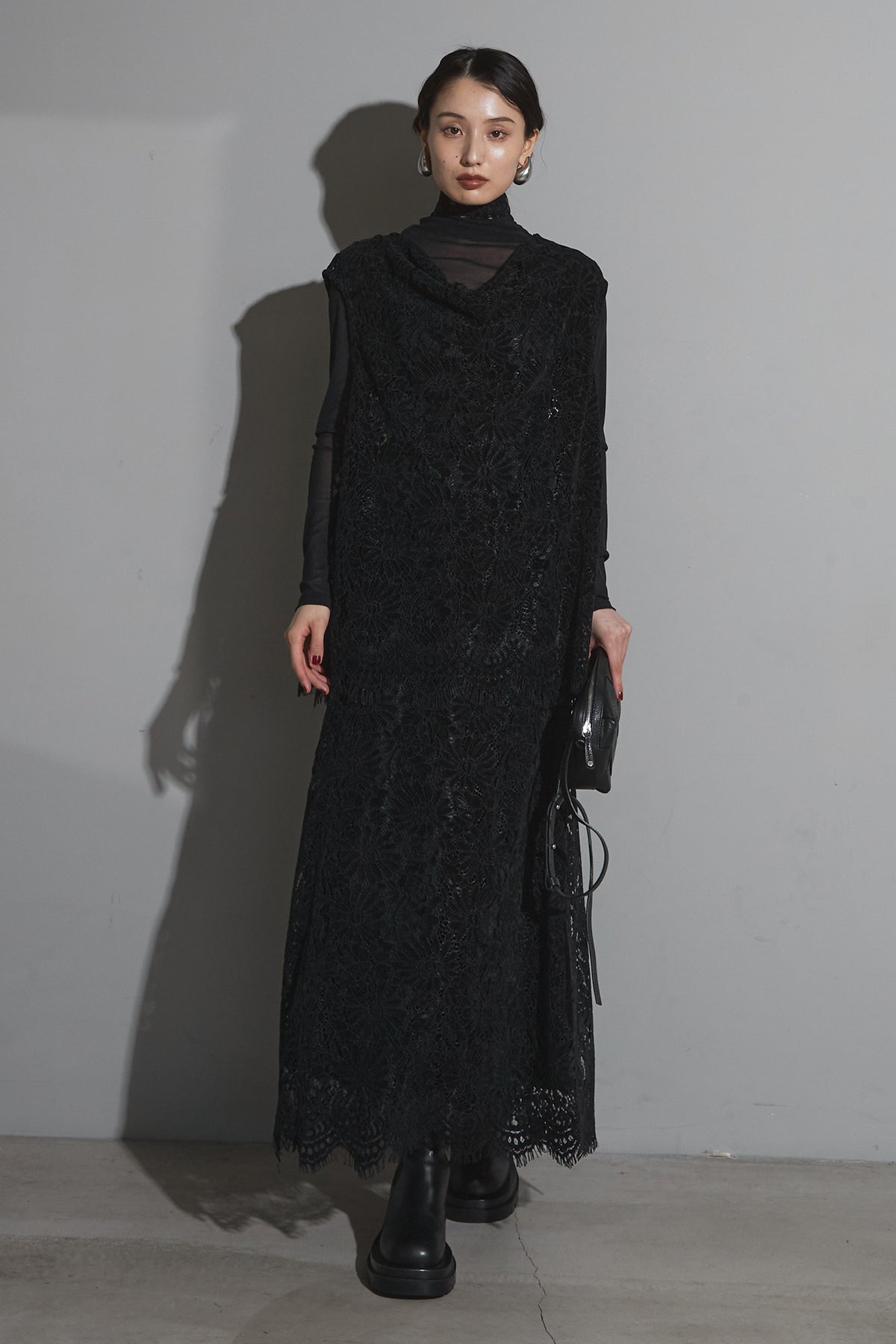 ベロアのような柔らかな光沢とレースの立体感が美しいセットアップ。 トップスはドレープネックで女性らしさを引き立て、スカートは程よく広がるシルエットで上品な印象に。 華やかさがありながらも落ち着いたトーンで、オケージョンにもデイリーにも着こなせるアイテムです。 上下それぞれ単品でも使いやすく、スタイリングの幅が広がります。