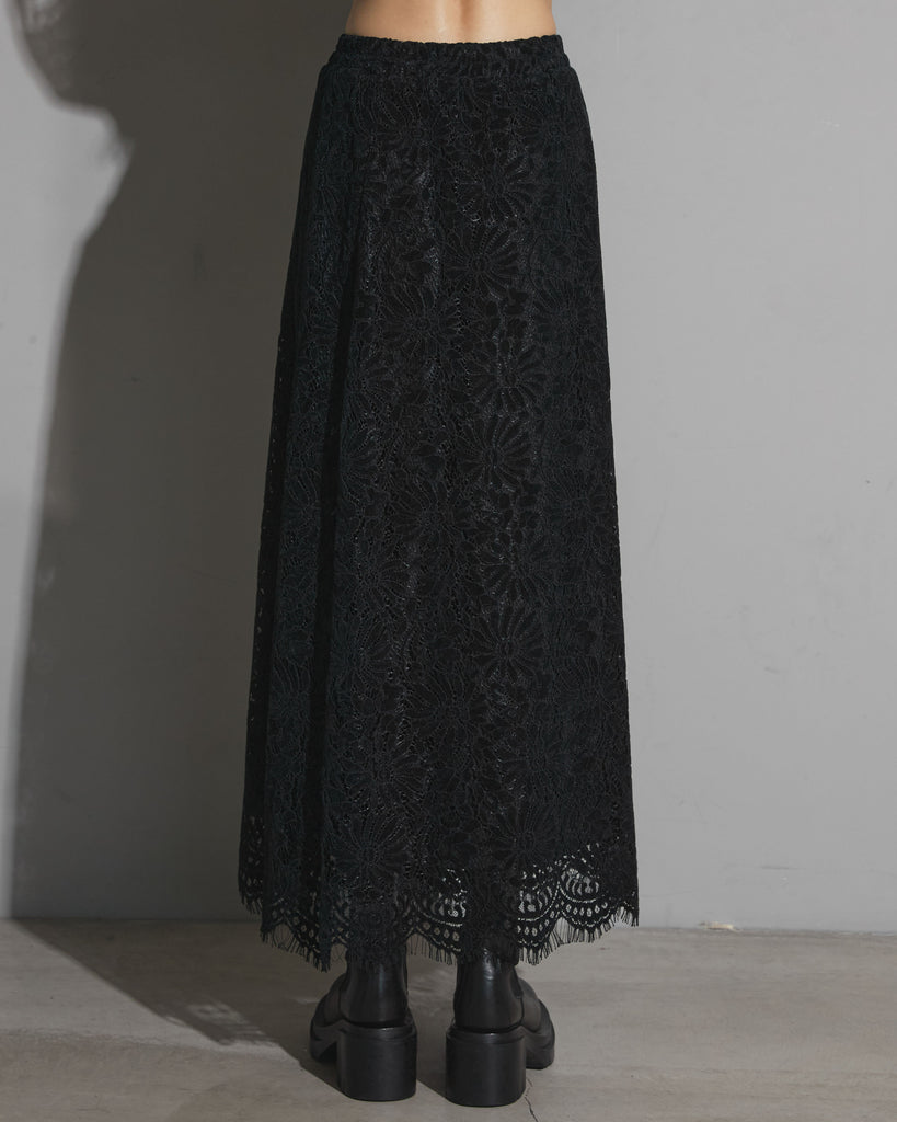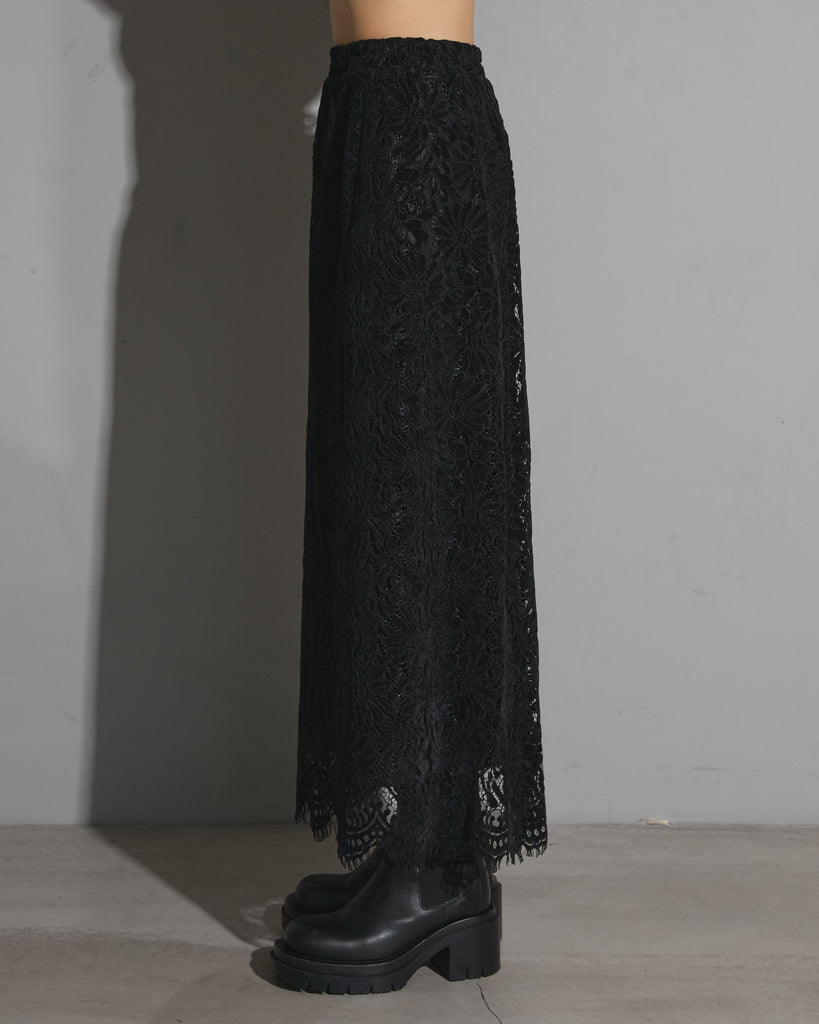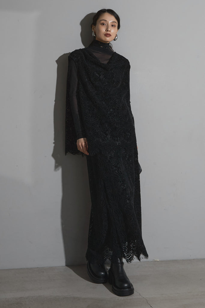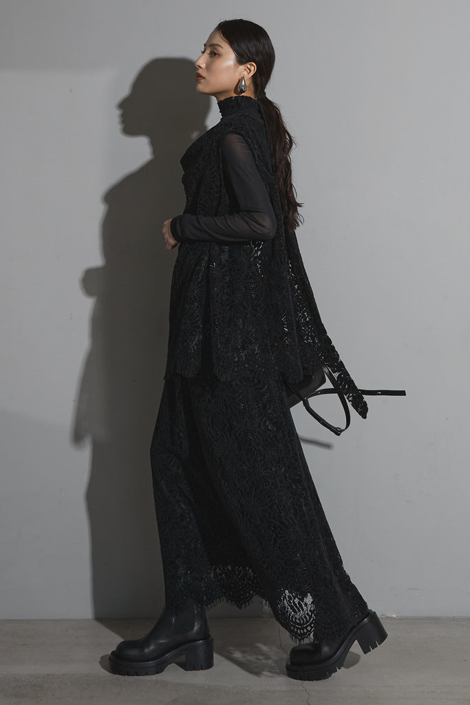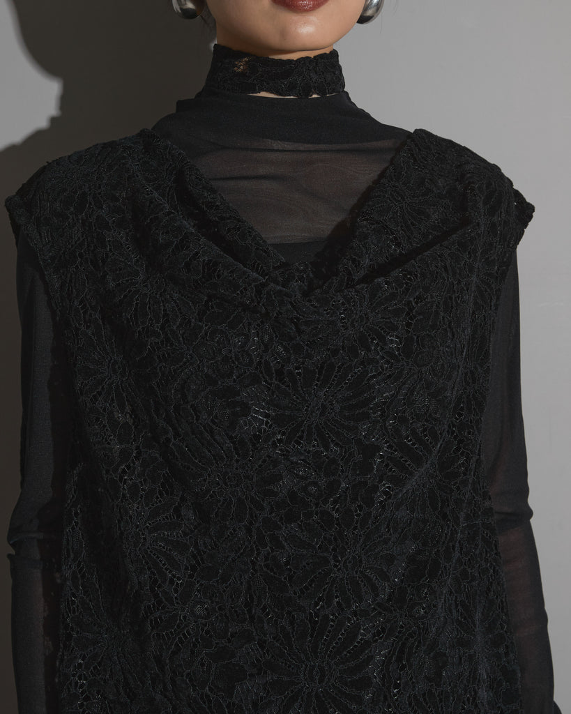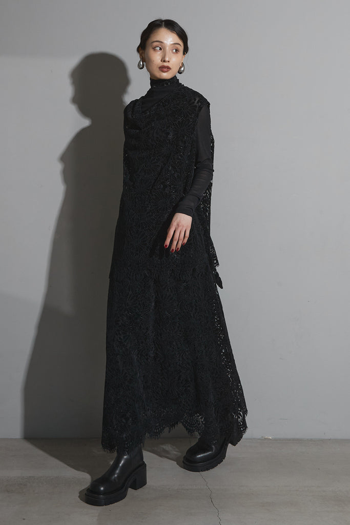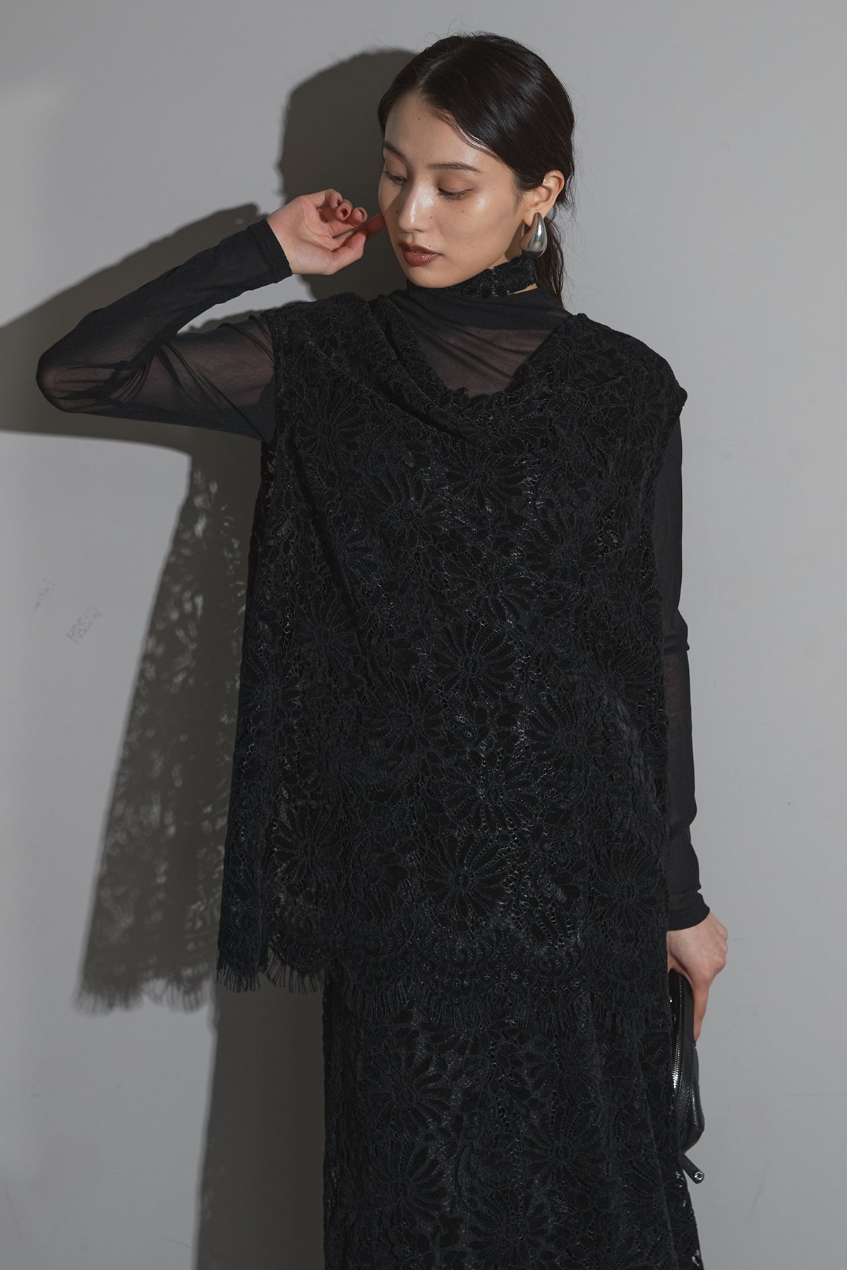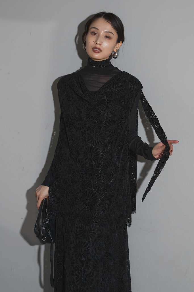 ベロアのような柔らかな光沢とレースの立体感が美しいセットアップ。 トップスはドレープネックで女性らしさを引き立て、スカートは程よく広がるシルエットで上品な印象に。 華やかさがありながらも落ち着いたトーンで、オケージョンにもデイリーにも着こなせるアイテムです。 上下それぞれ単品でも使いやすく、スタイリングの幅が広がります。