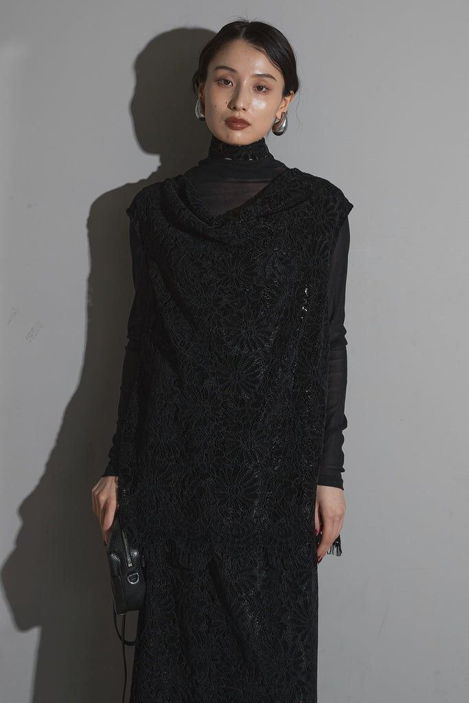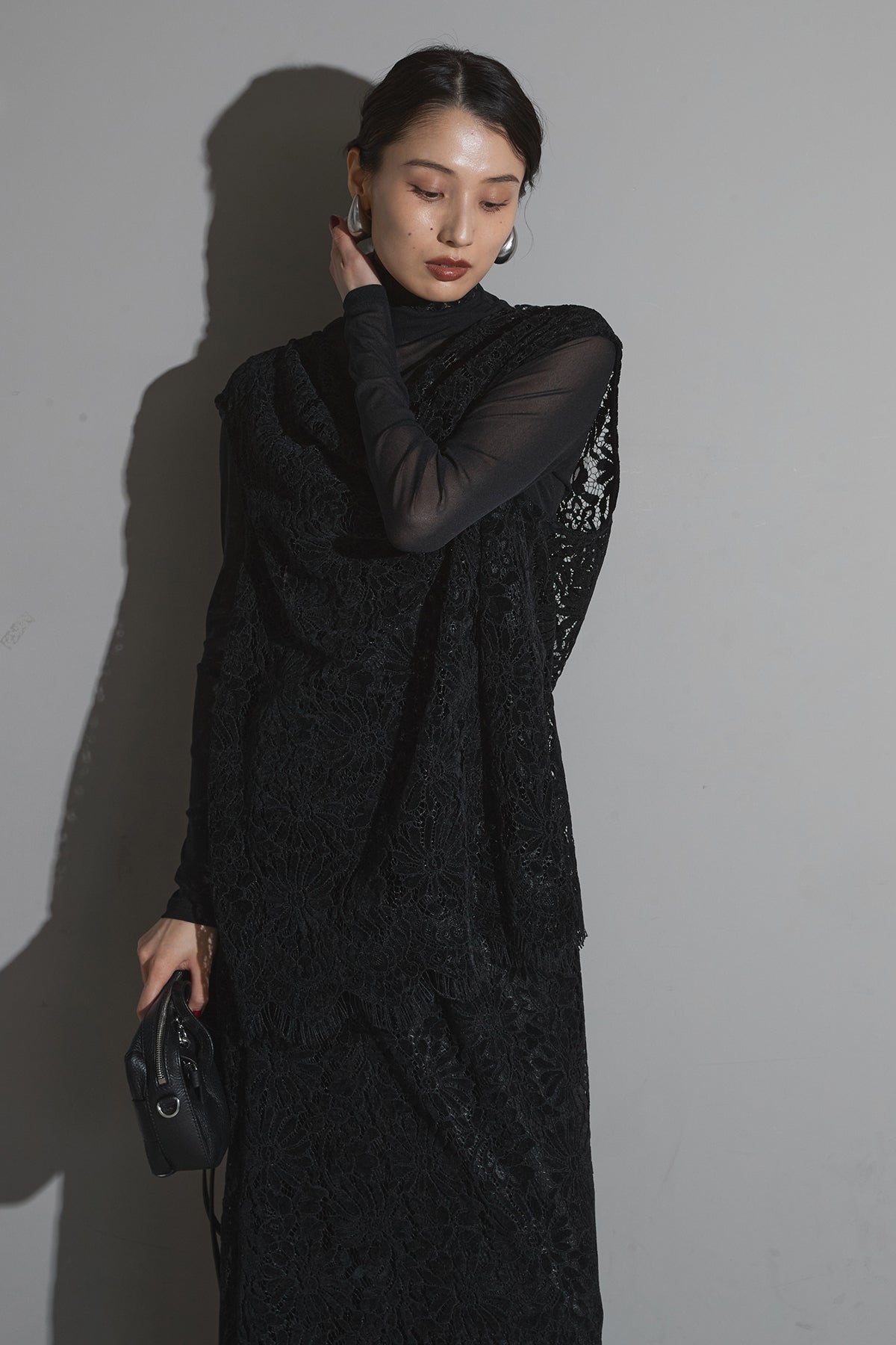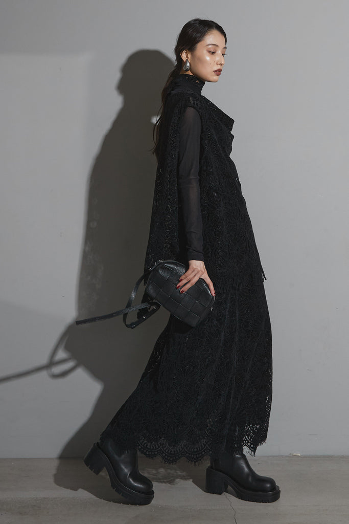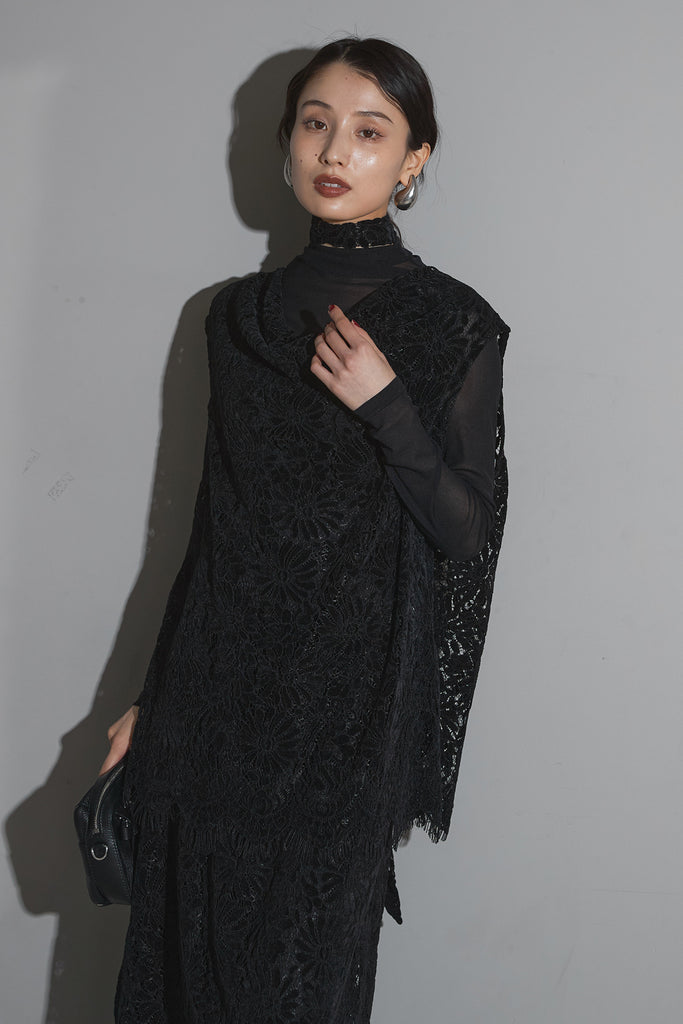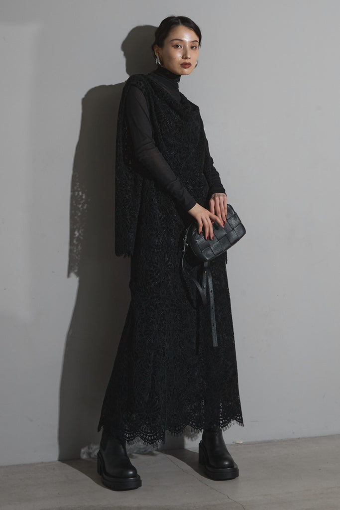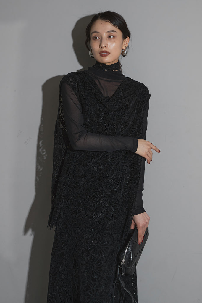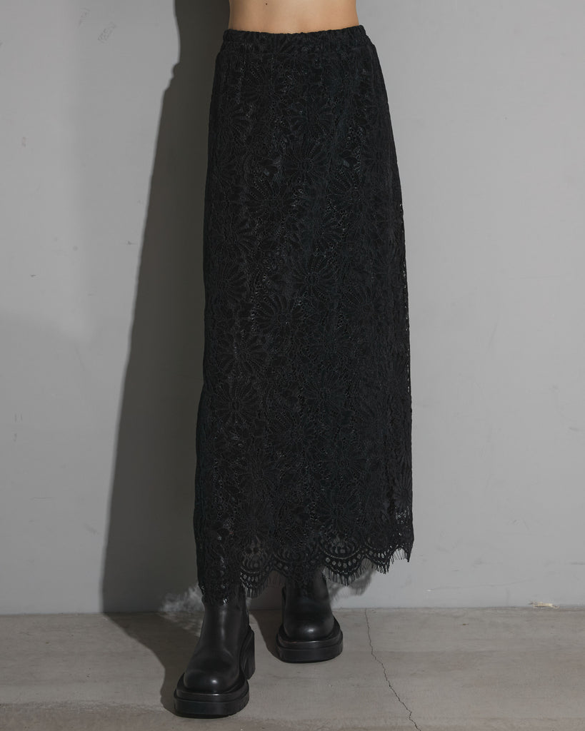 ベロアのような柔らかな光沢とレースの立体感が美しいセットアップ。 トップスはドレープネックで女性らしさを引き立て、スカートは程よく広がるシルエットで上品な印象に。 華やかさがありながらも落ち着いたトーンで、オケージョンにもデイリーにも着こなせるアイテムです。 上下それぞれ単品でも使いやすく、スタイリングの幅が広がります。