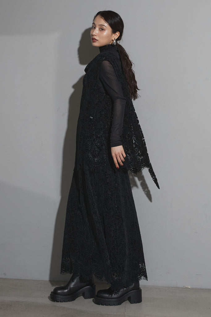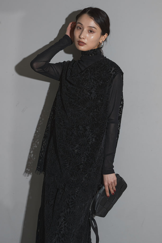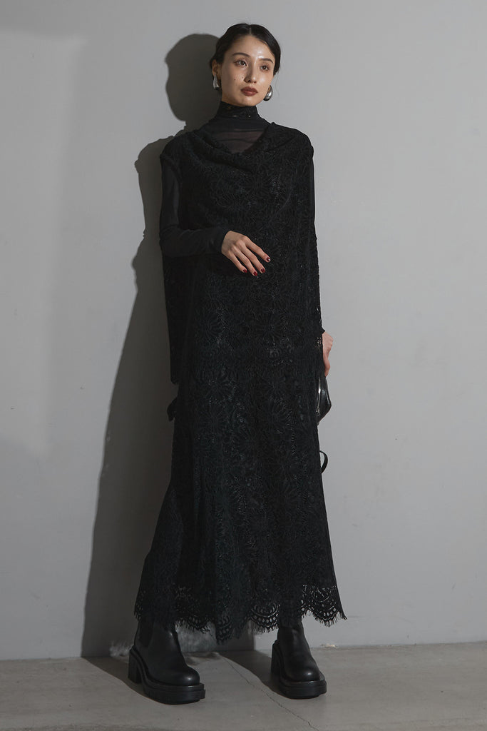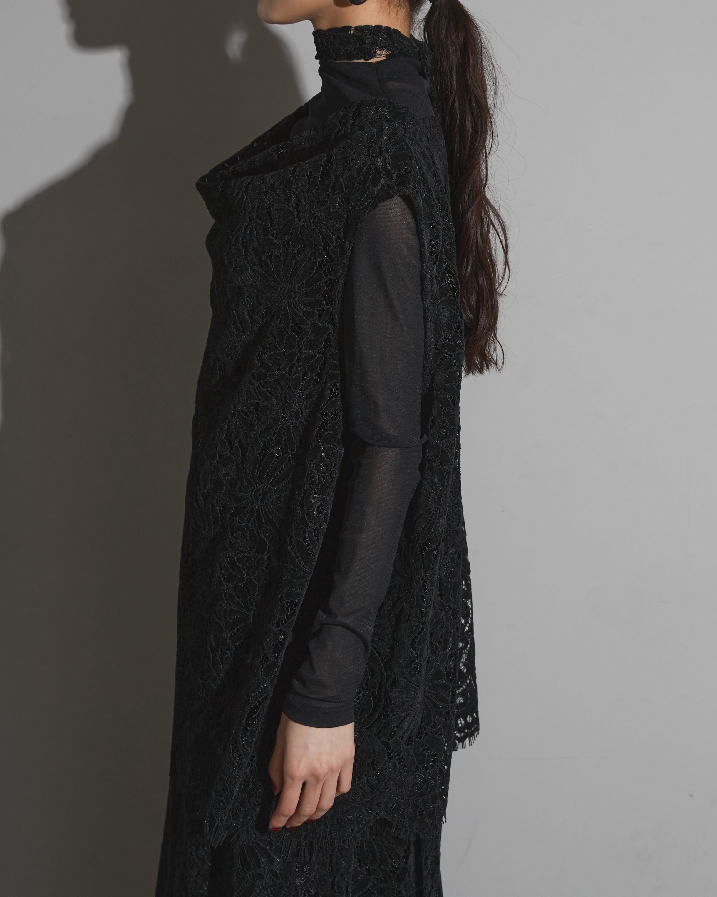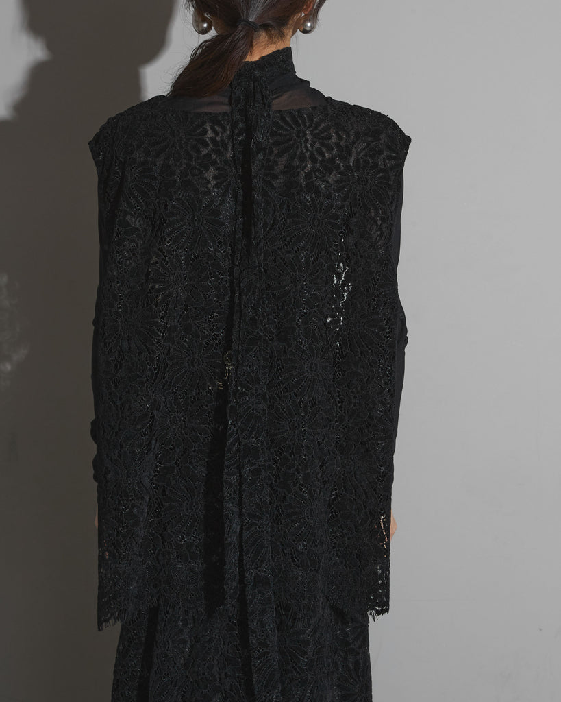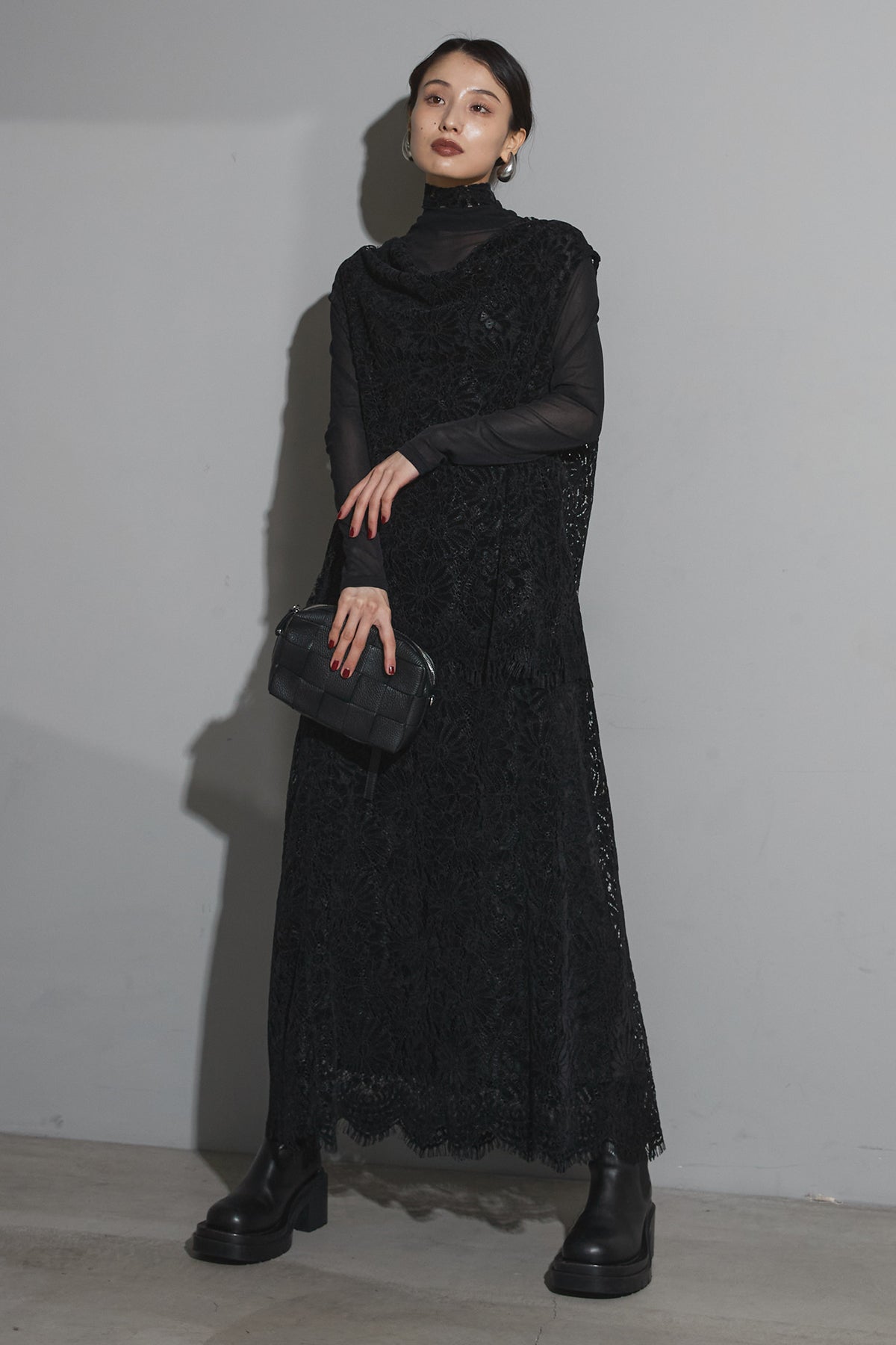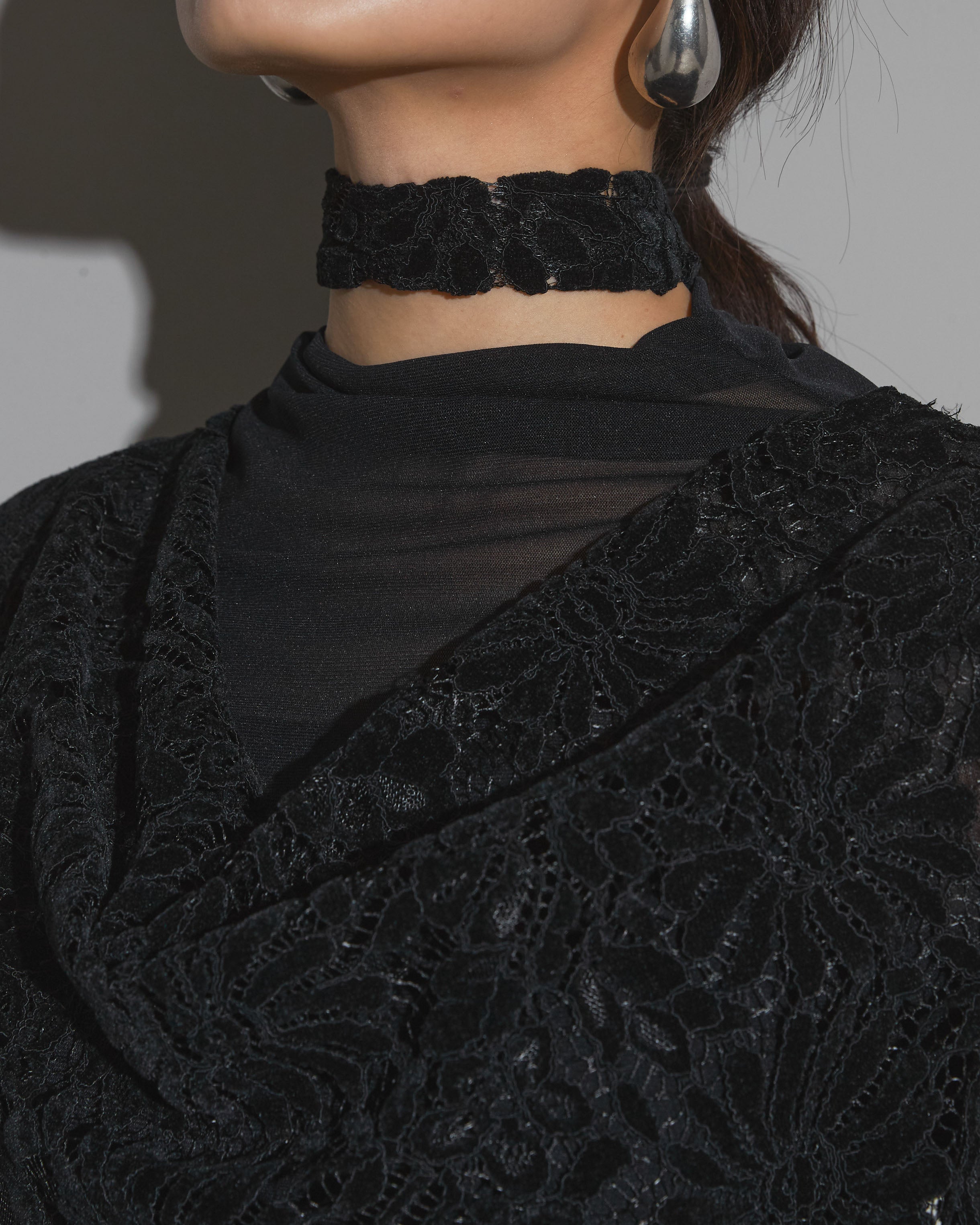 ベロアのような柔らかな光沢とレースの立体感が美しいセットアップ。 トップスはドレープネックで女性らしさを引き立て、スカートは程よく広がるシルエットで上品な印象に。 華やかさがありながらも落ち着いたトーンで、オケージョンにもデイリーにも着こなせるアイテムです。 上下それぞれ単品でも使いやすく、スタイリングの幅が広がります。