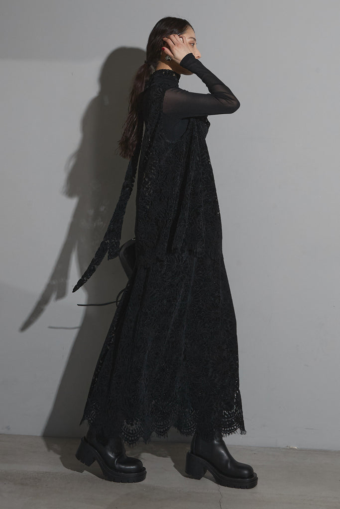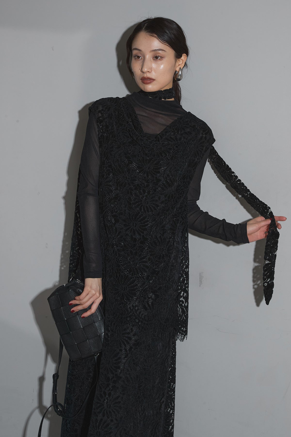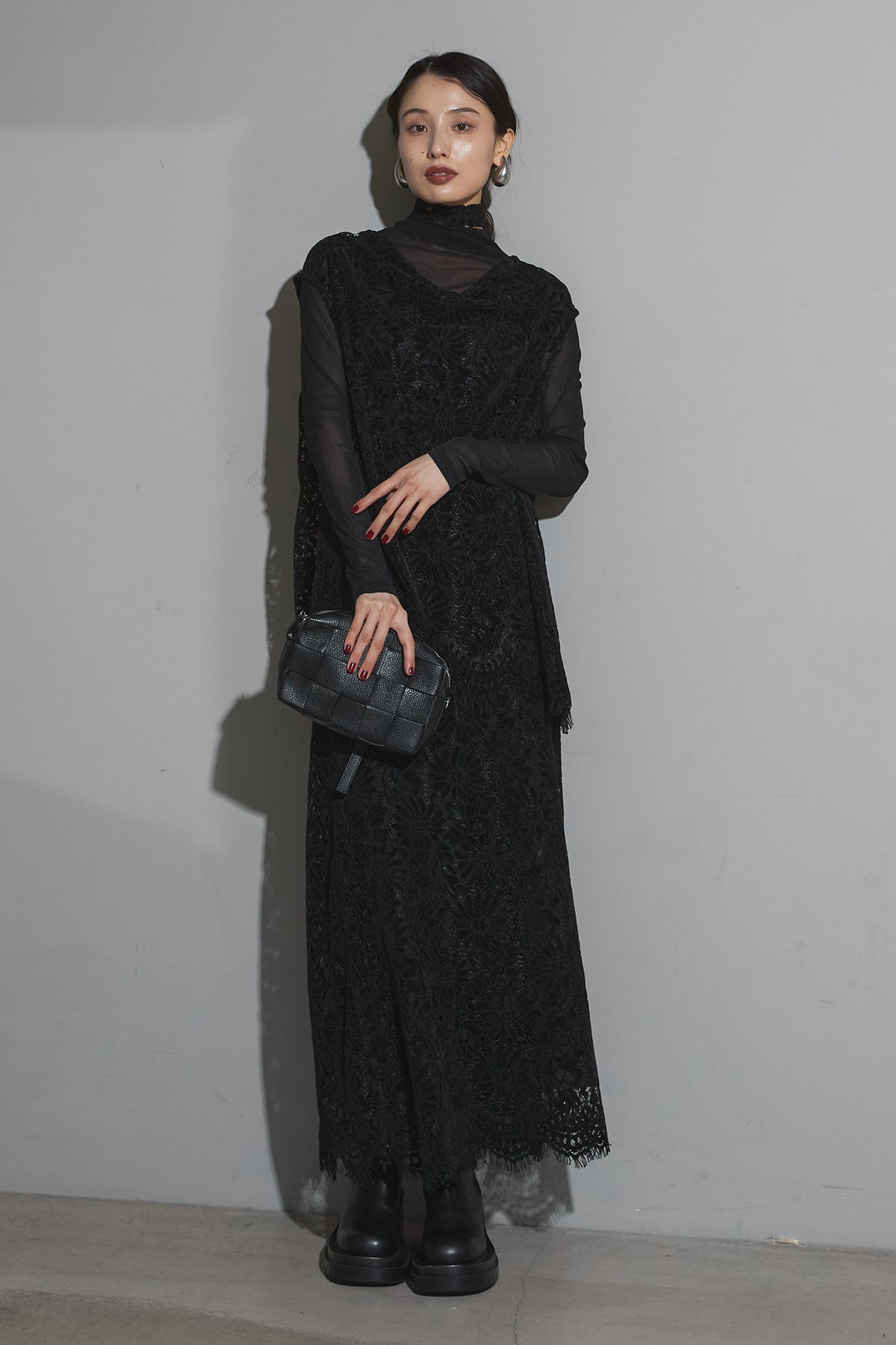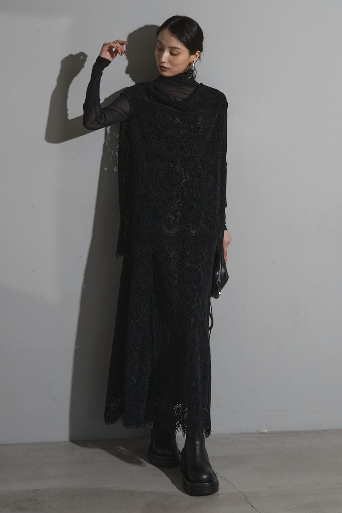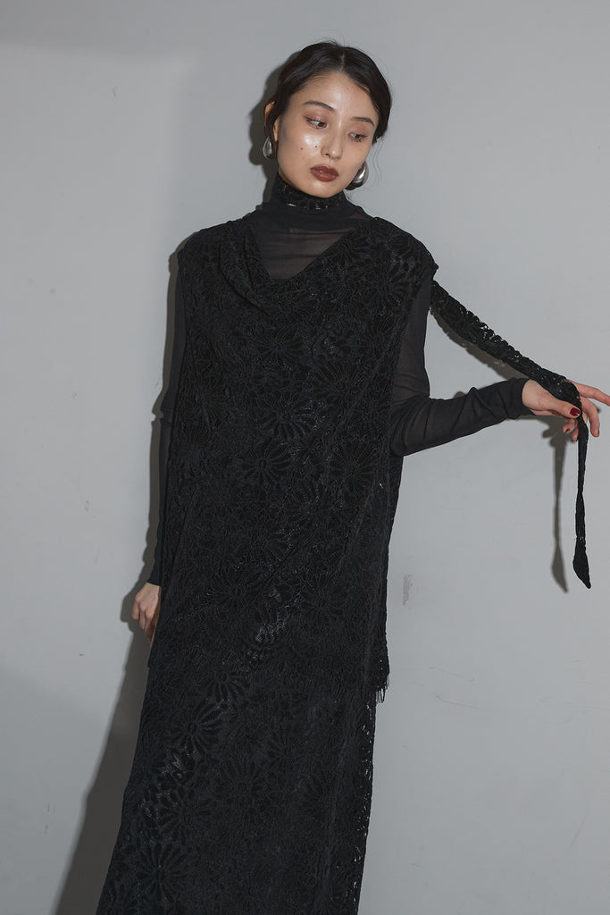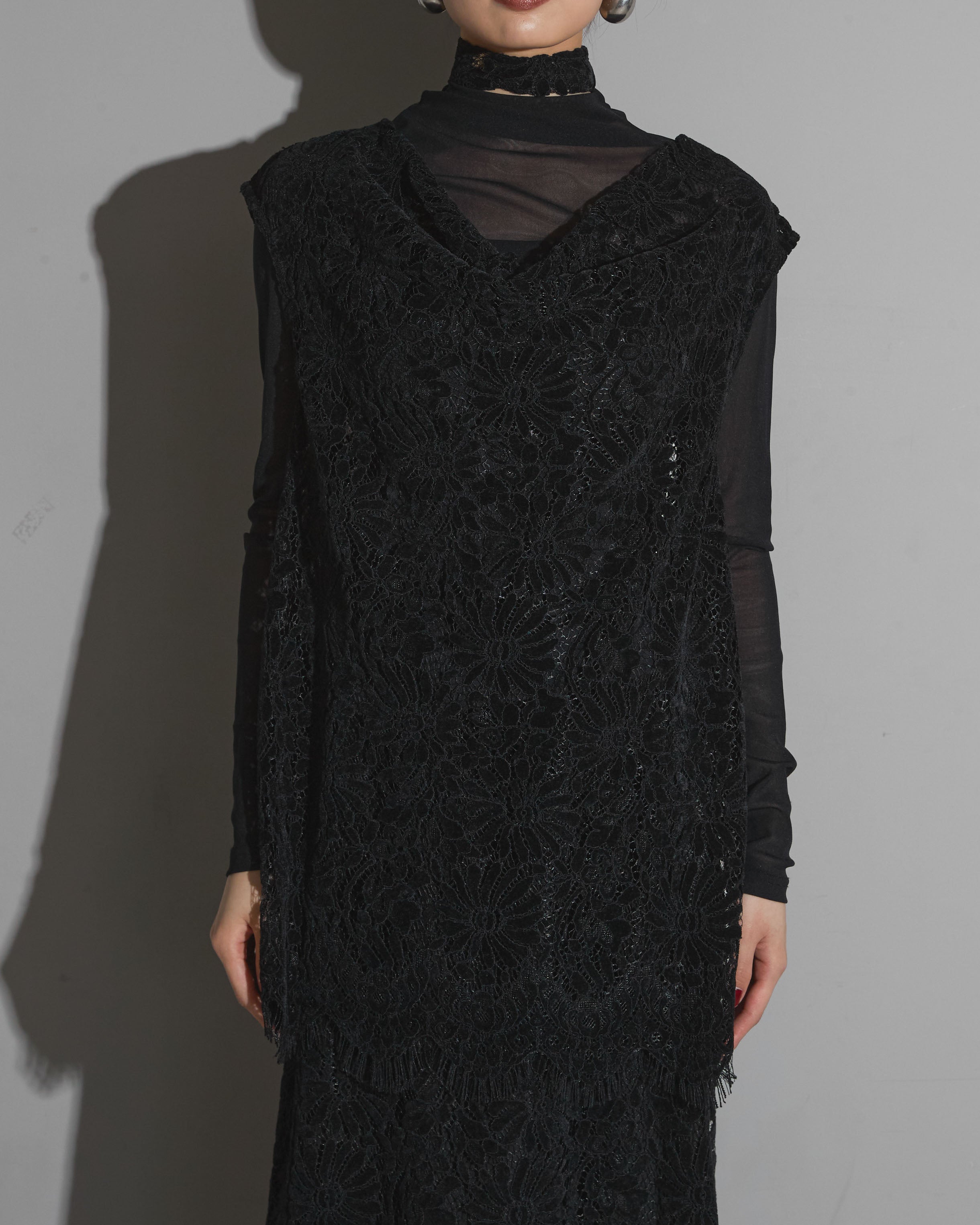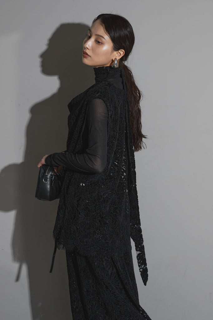 ベロアのような柔らかな光沢とレースの立体感が美しいセットアップ。 トップスはドレープネックで女性らしさを引き立て、スカートは程よく広がるシルエットで上品な印象に。 華やかさがありながらも落ち着いたトーンで、オケージョンにもデイリーにも着こなせるアイテムです。 上下それぞれ単品でも使いやすく、スタイリングの幅が広がります。