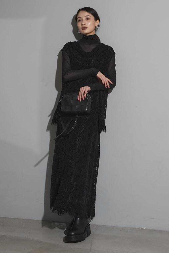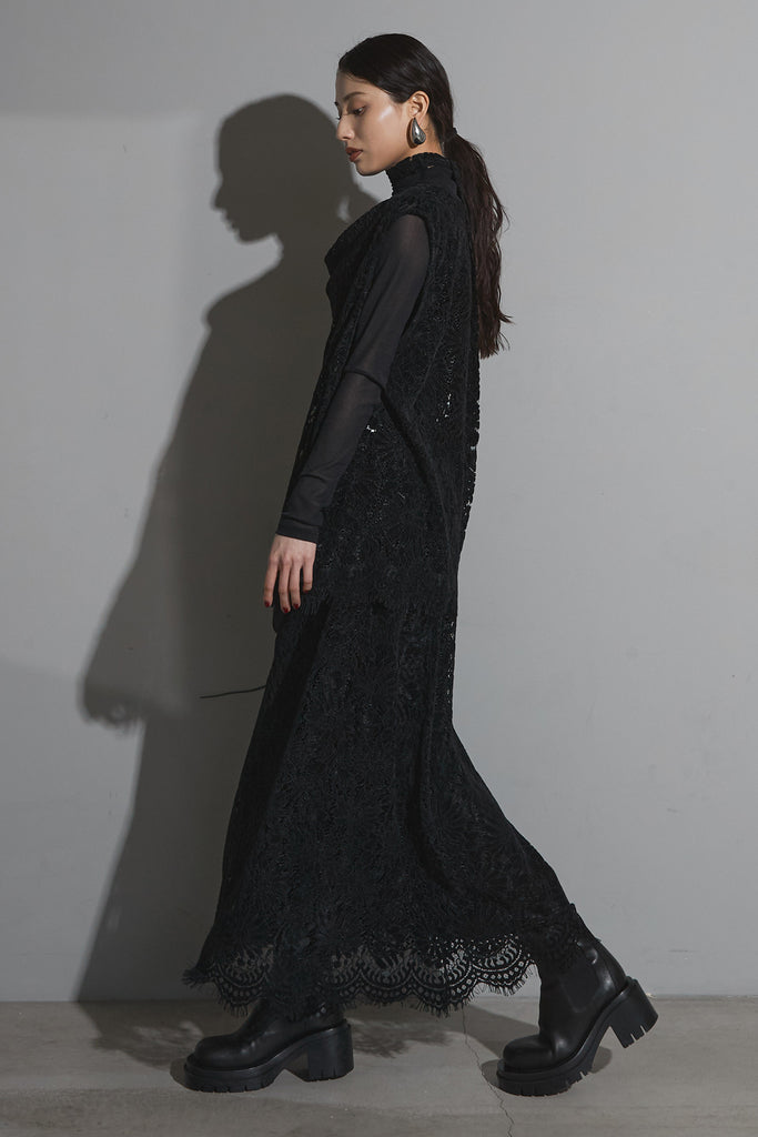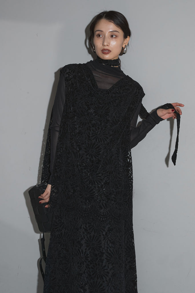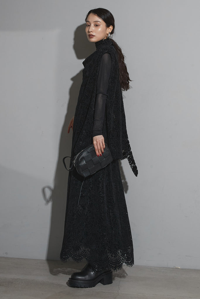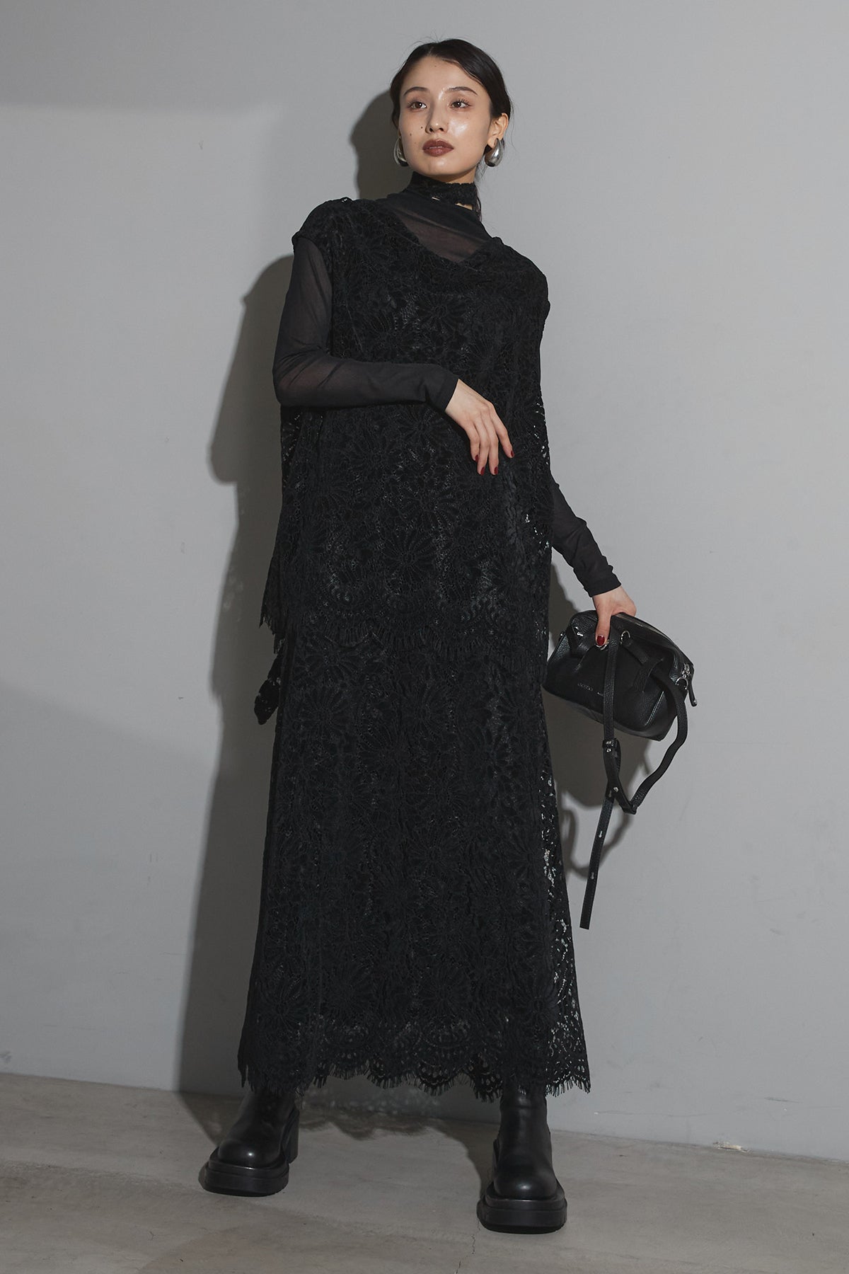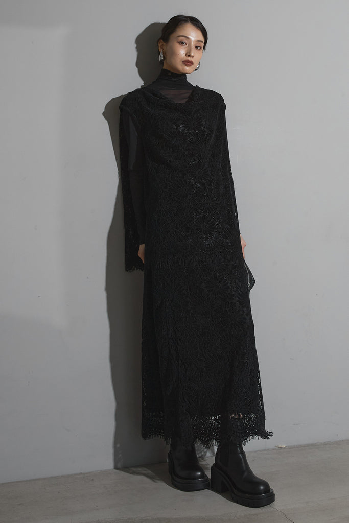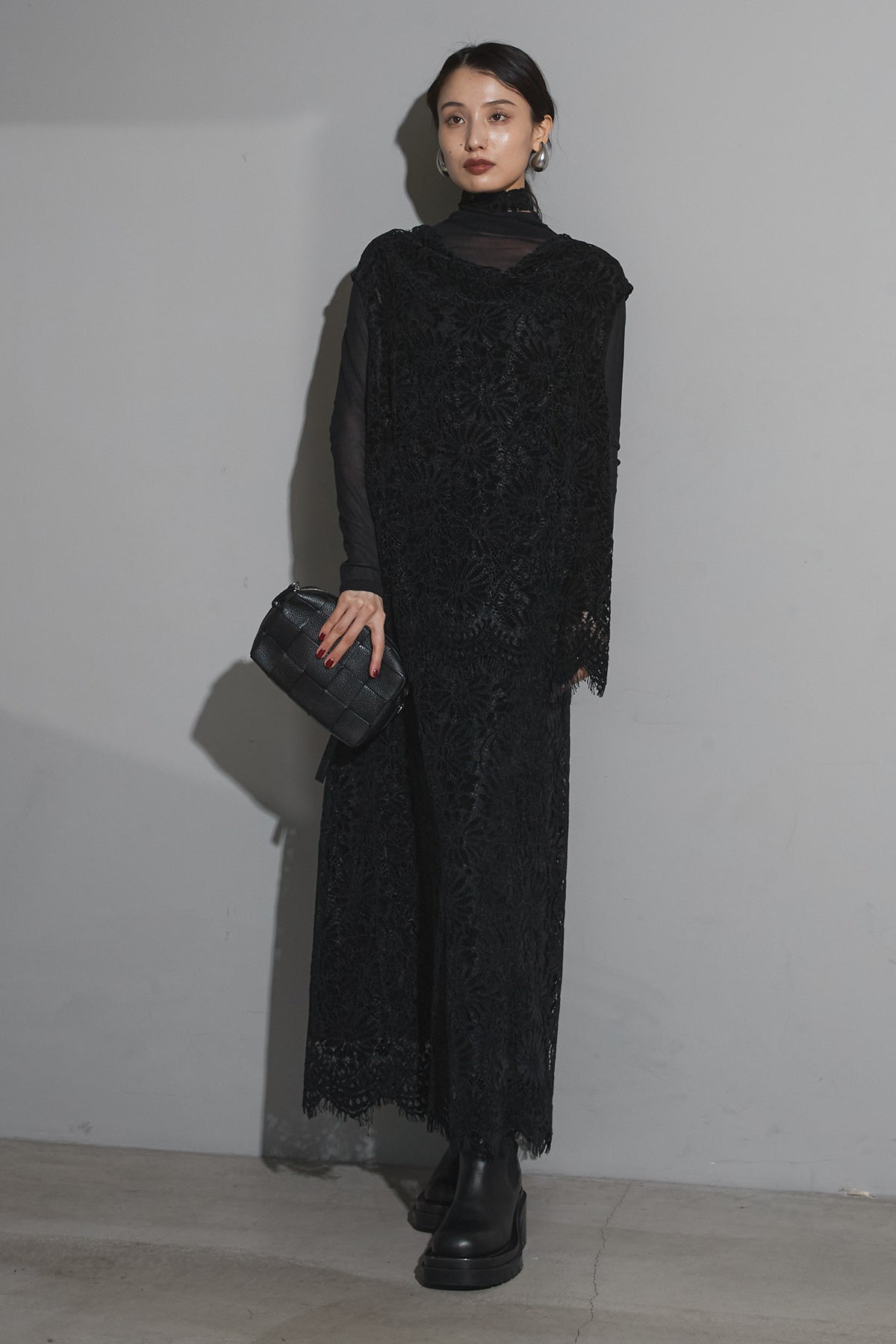 ベロアのような柔らかな光沢とレースの立体感が美しいセットアップ。 トップスはドレープネックで女性らしさを引き立て、スカートは程よく広がるシルエットで上品な印象に。 華やかさがありながらも落ち着いたトーンで、オケージョンにもデイリーにも着こなせるアイテムです。 上下それぞれ単品でも使いやすく、スタイリングの幅が広がります。