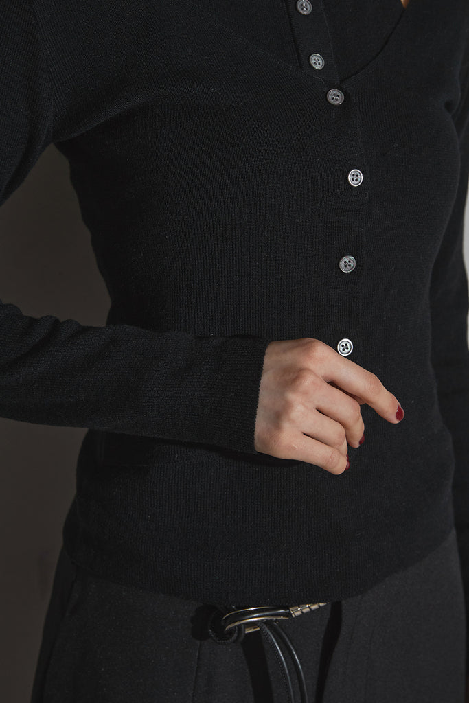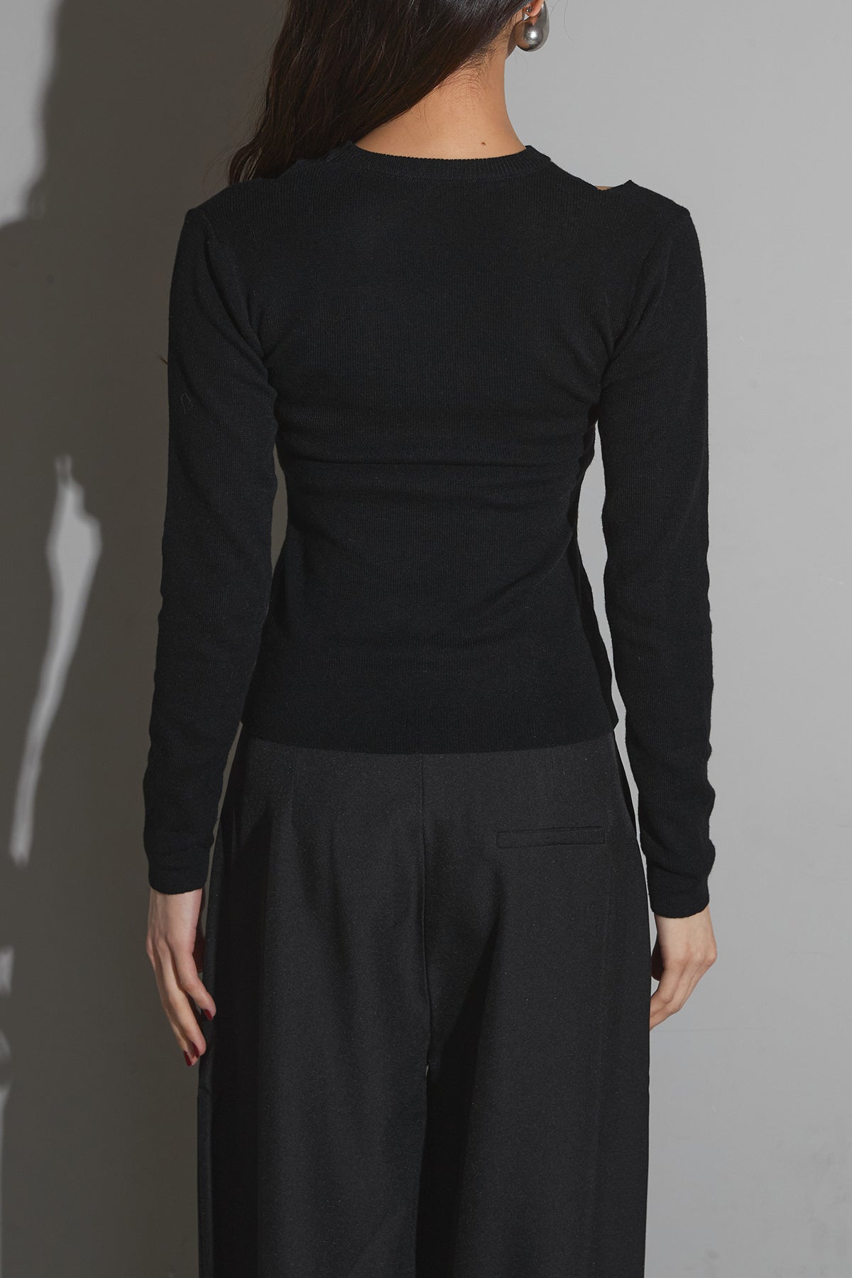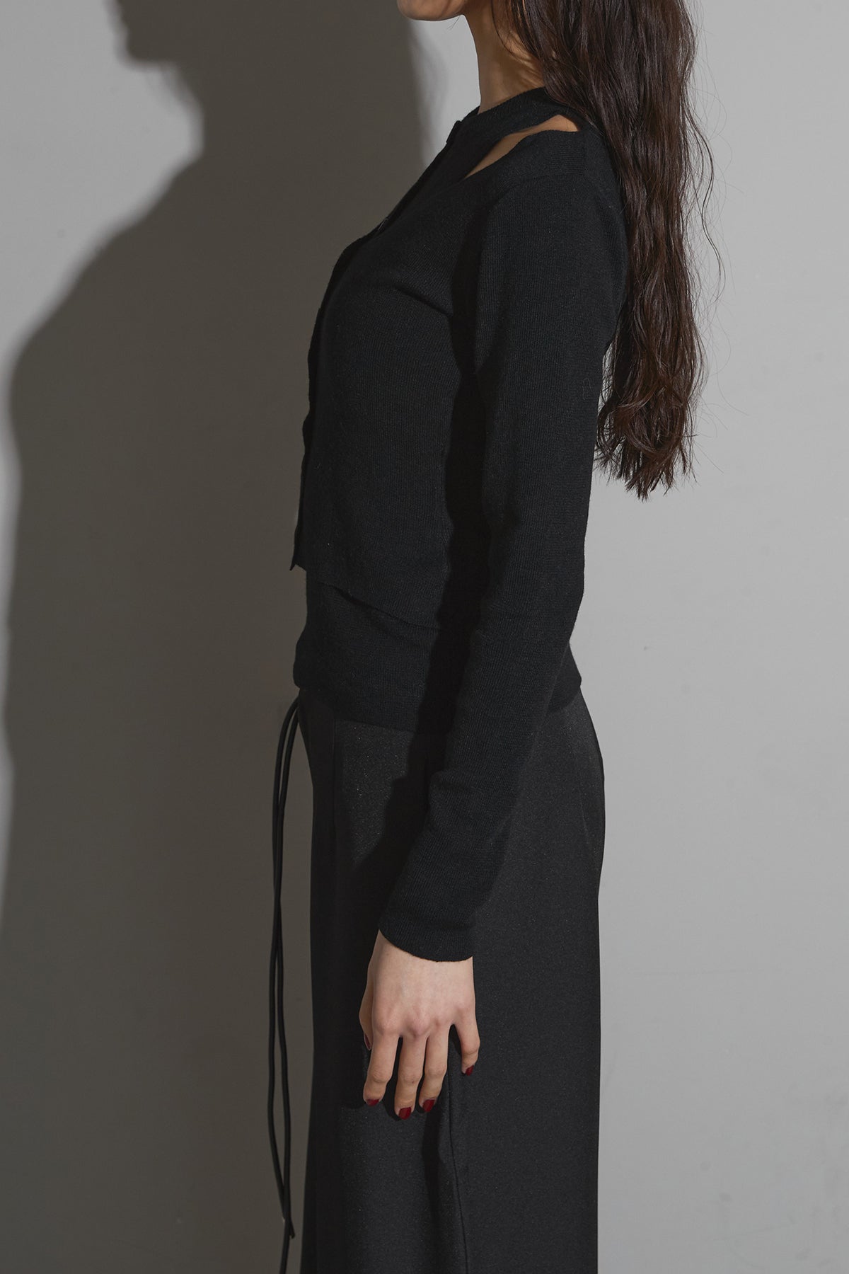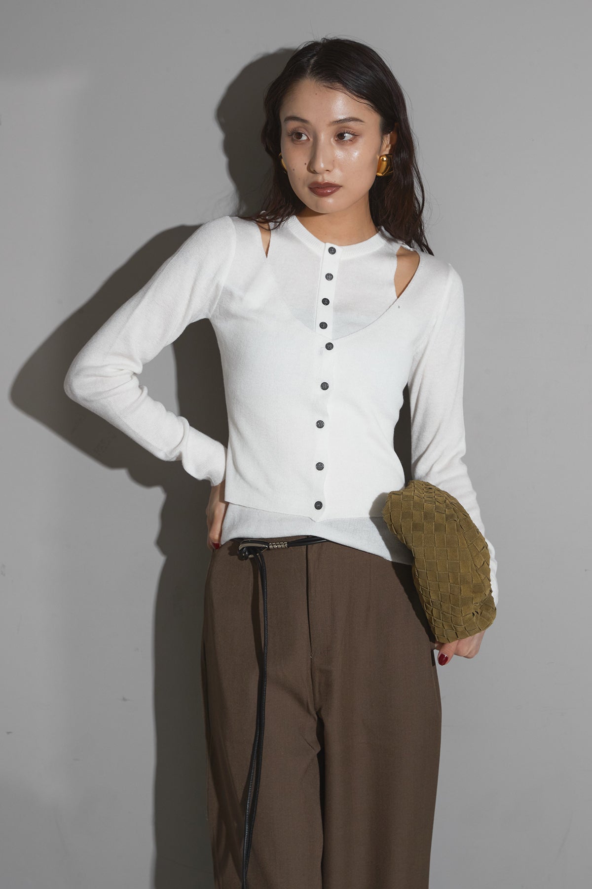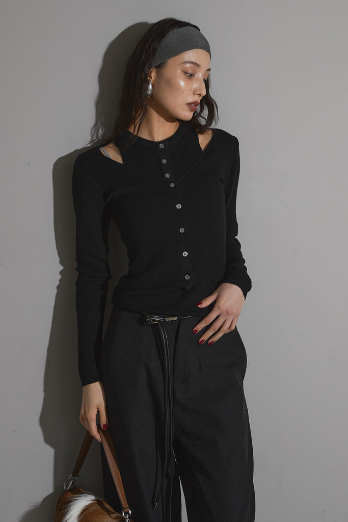 肩のカッティングが印象的なデザインニット。 デコルテラインを美しく見せる抜け感のあるシルエットで、女性らしさとモードな雰囲気を兼ね備えた一枚です。 薄手ながらも暖かみのある素材で、ジャケットやアウターのインナーとしても重宝します。 シンプルなパンツやスカートに合わせるだけで、スタイリッシュなスタイリングが完成します。