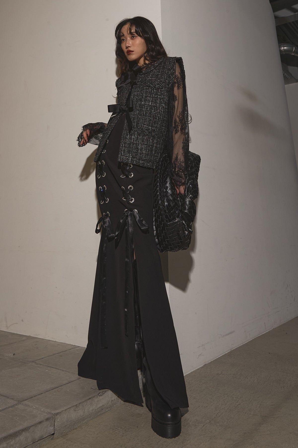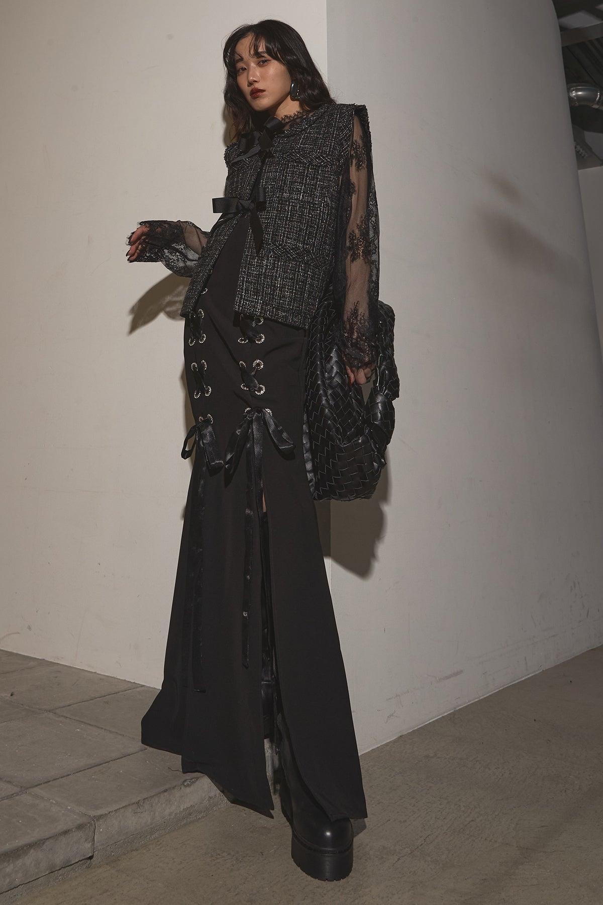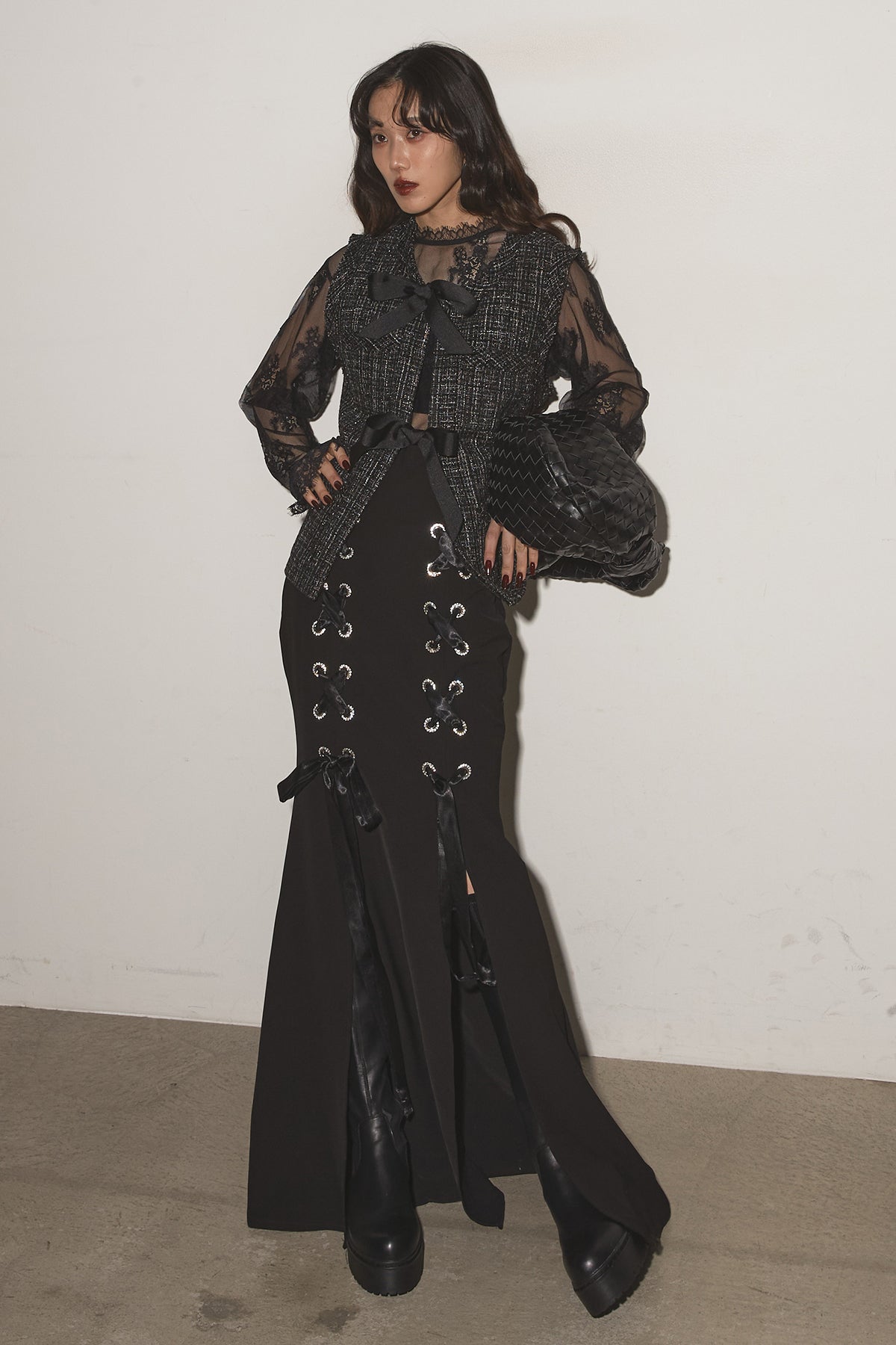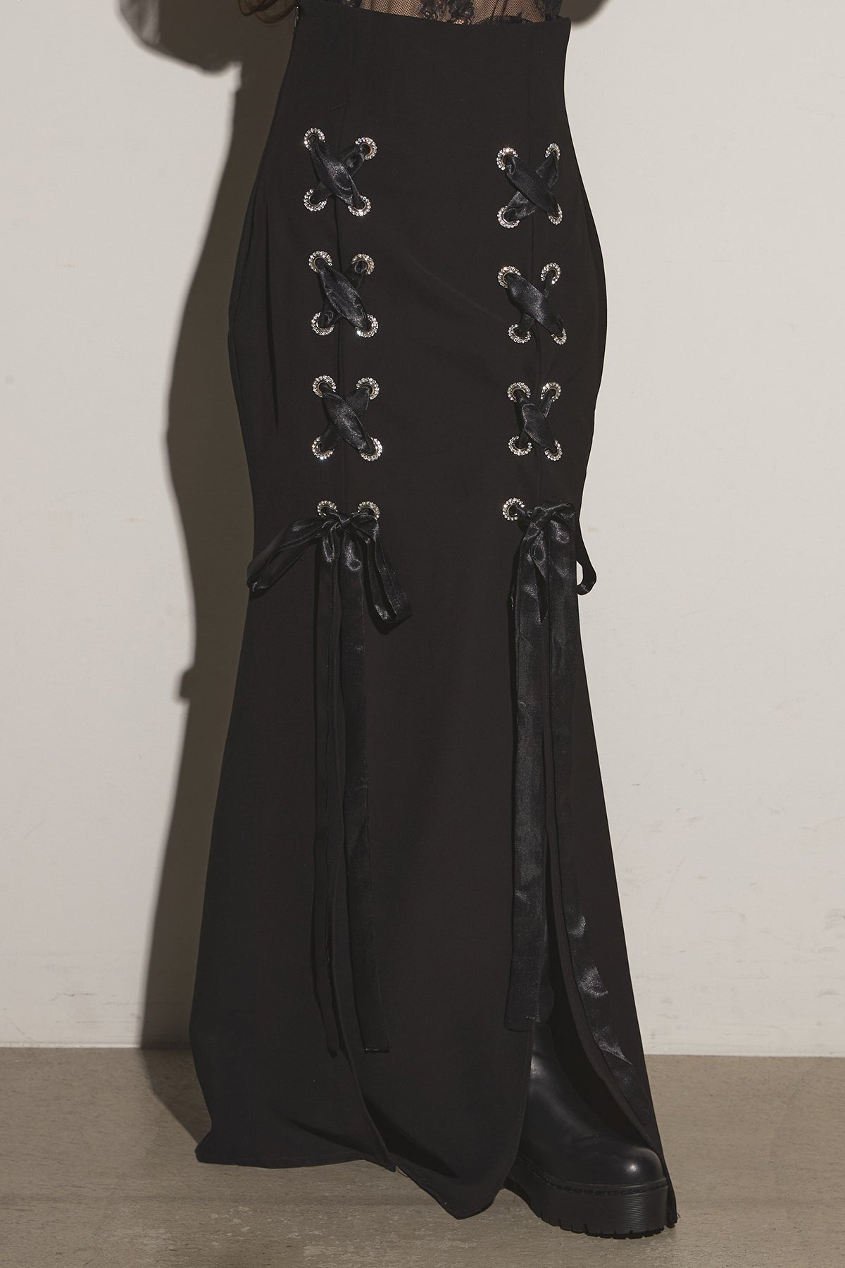 フロントのレースアップ&リボンディテールが目を惹くロングスカート。すっきりとしたハイウエストと縦ラインでスタイルアップ見えし、動くたび揺れるロングリボンがアクセントに。シンプルなトップス合わせでも主役になる一枚です。