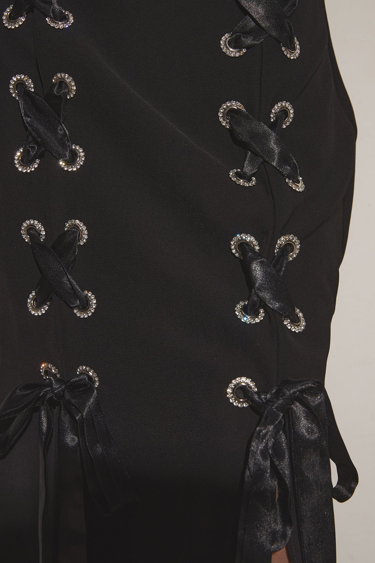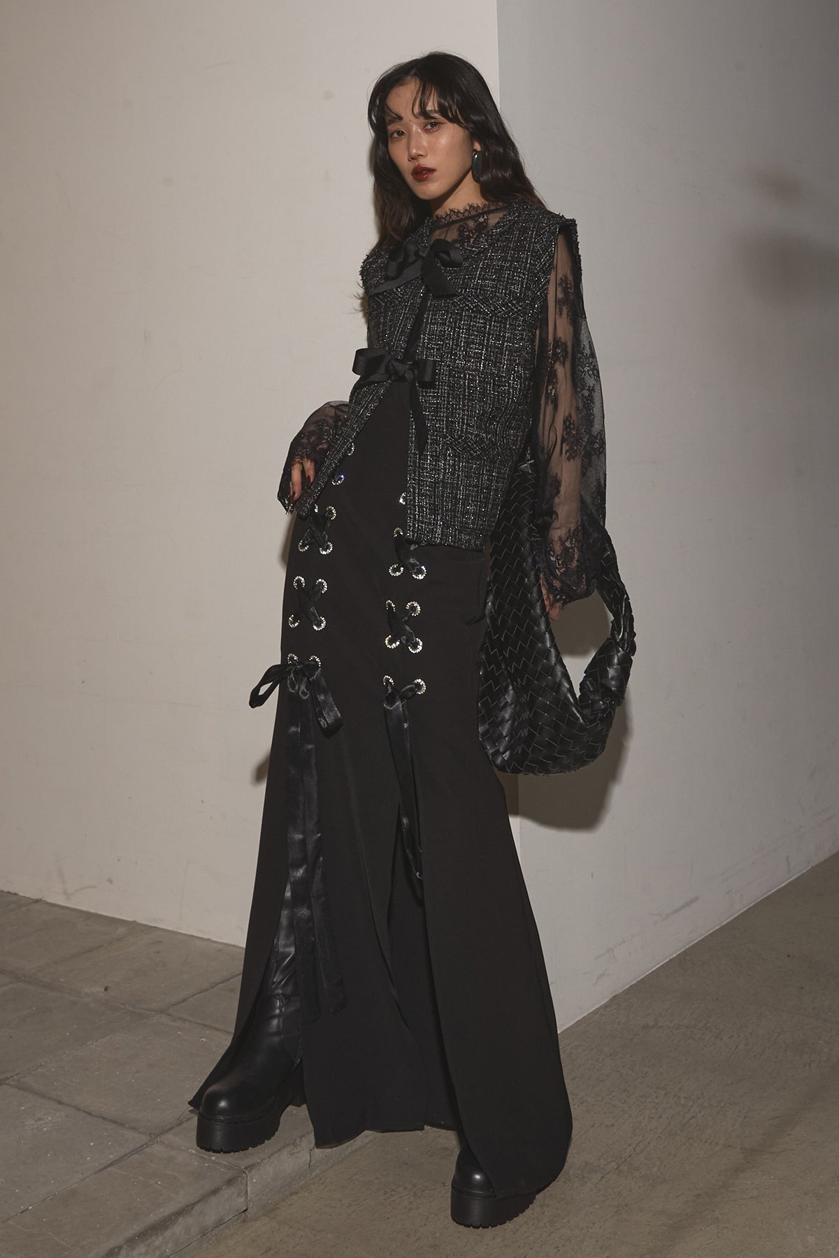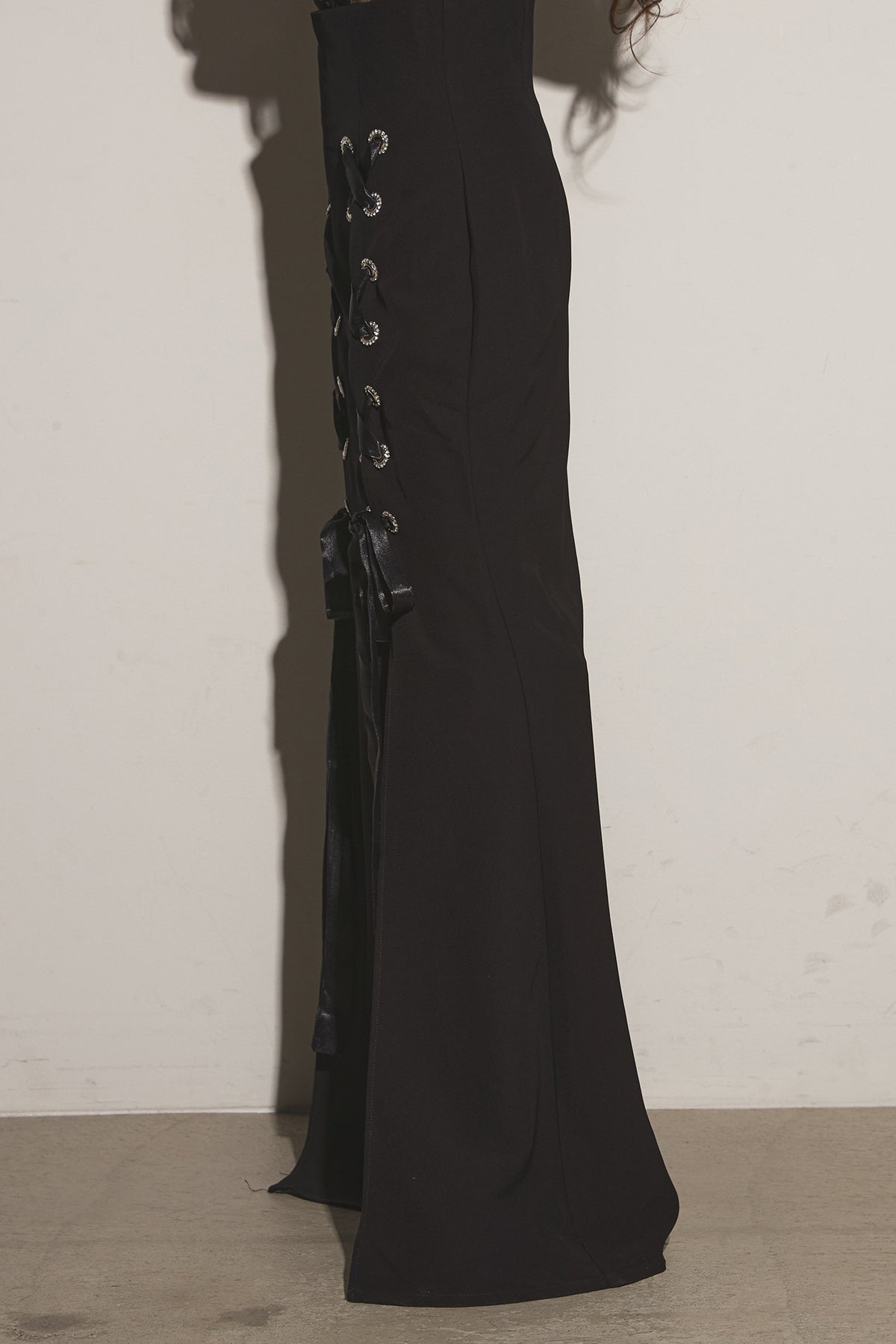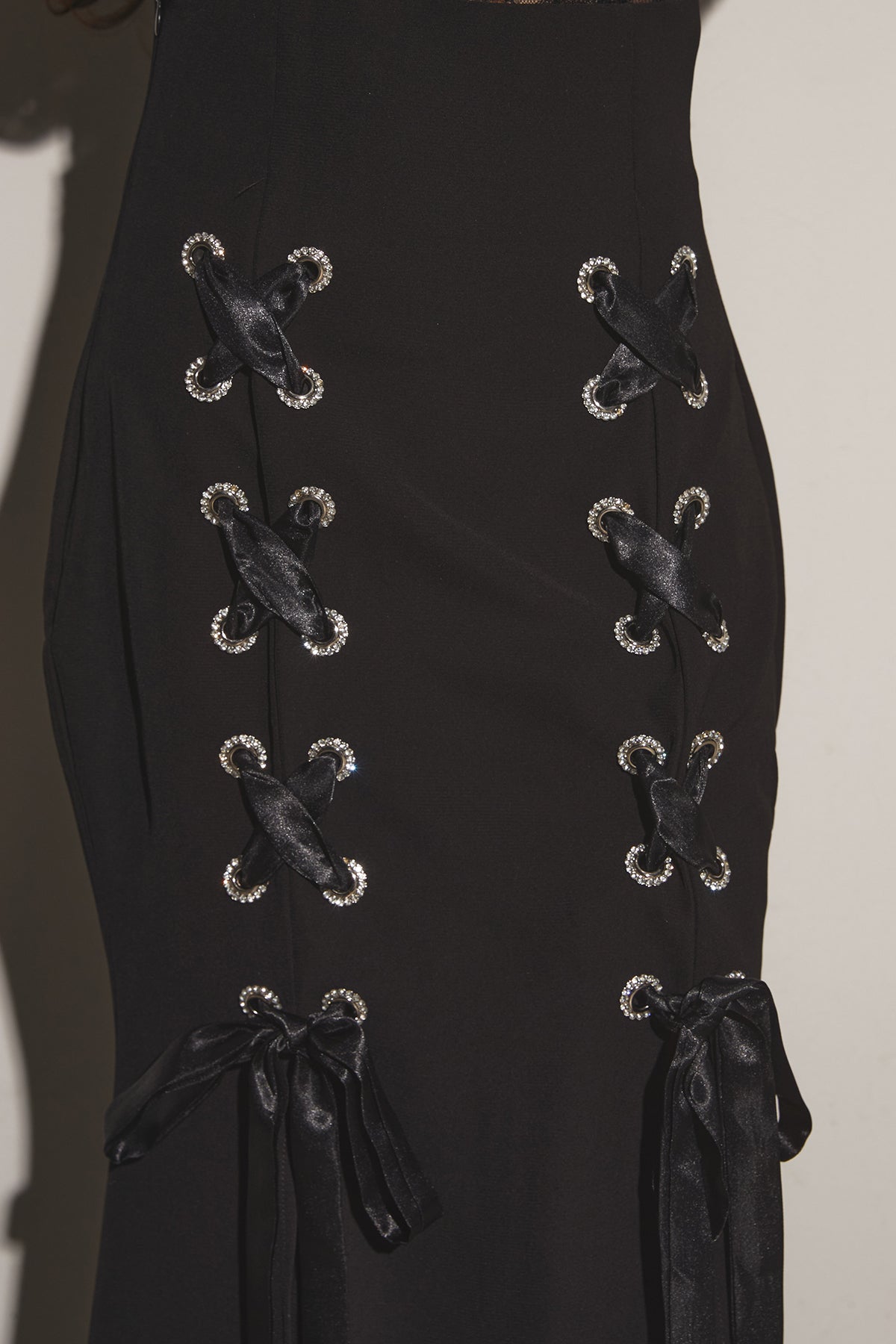 フロントのレースアップ&リボンディテールが目を惹くロングスカート。すっきりとしたハイウエストと縦ラインでスタイルアップ見えし、動くたび揺れるロングリボンがアクセントに。シンプルなトップス合わせでも主役になる一枚です。