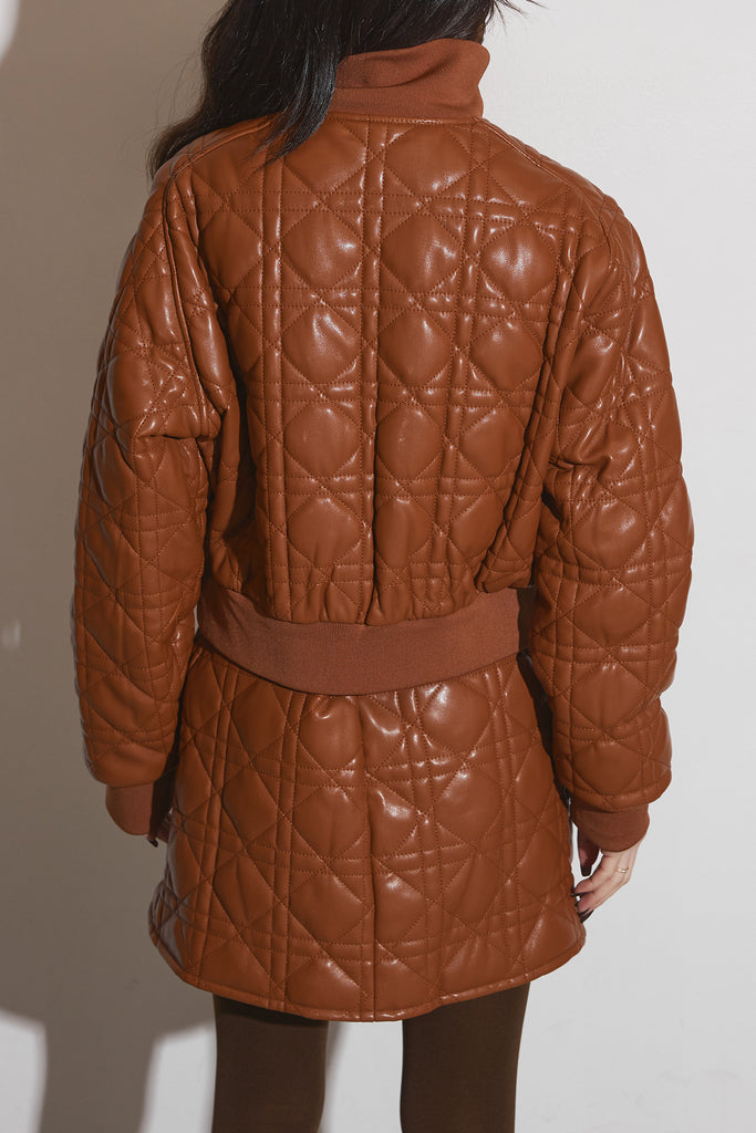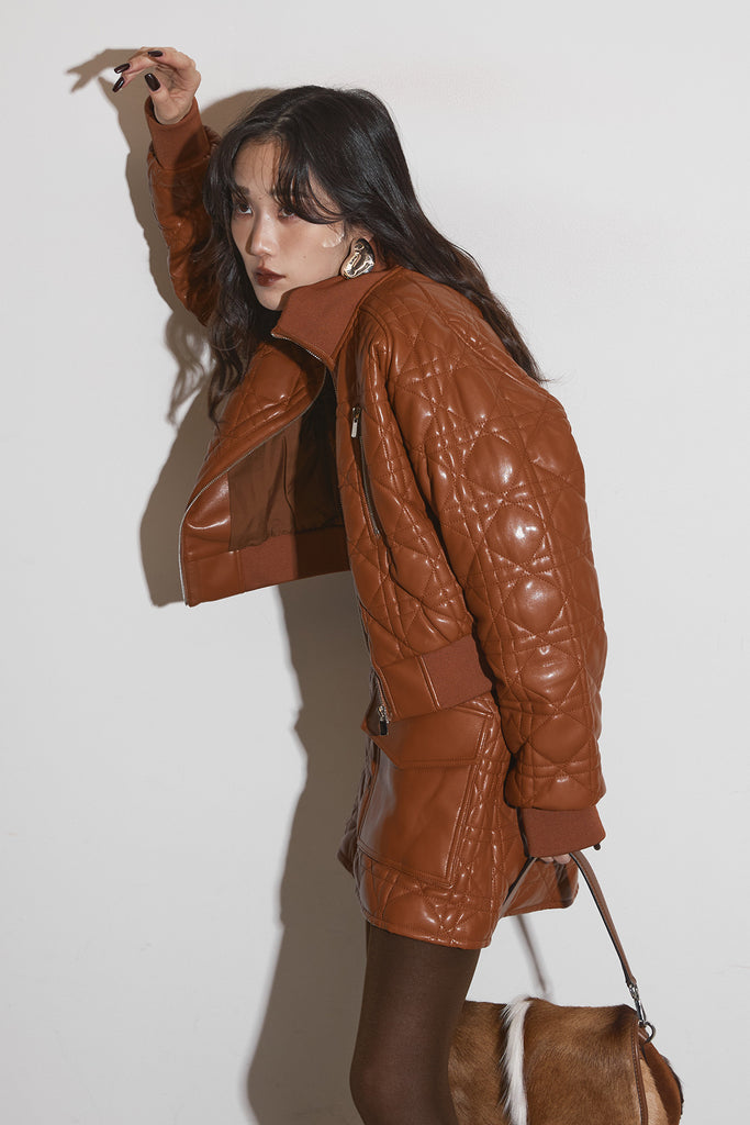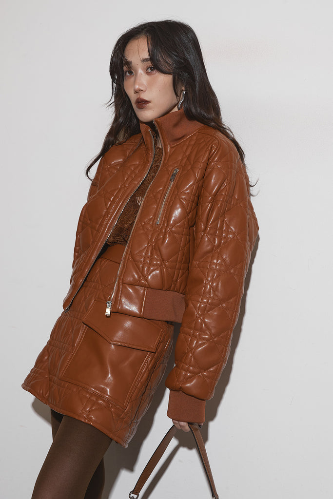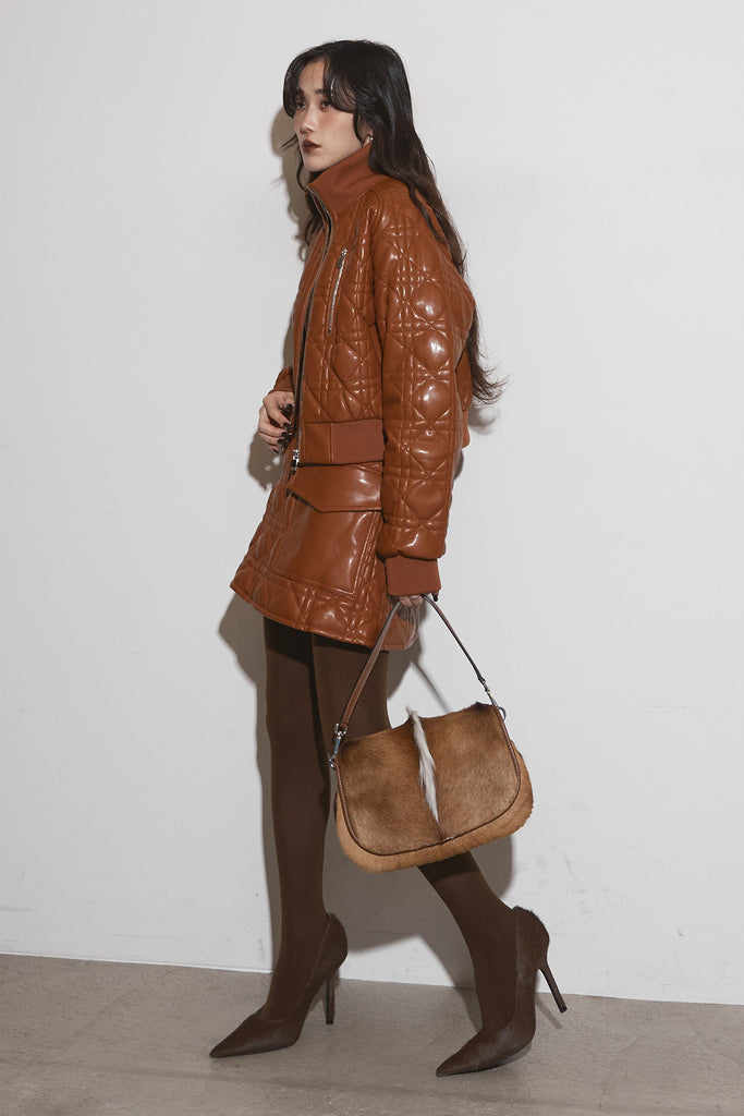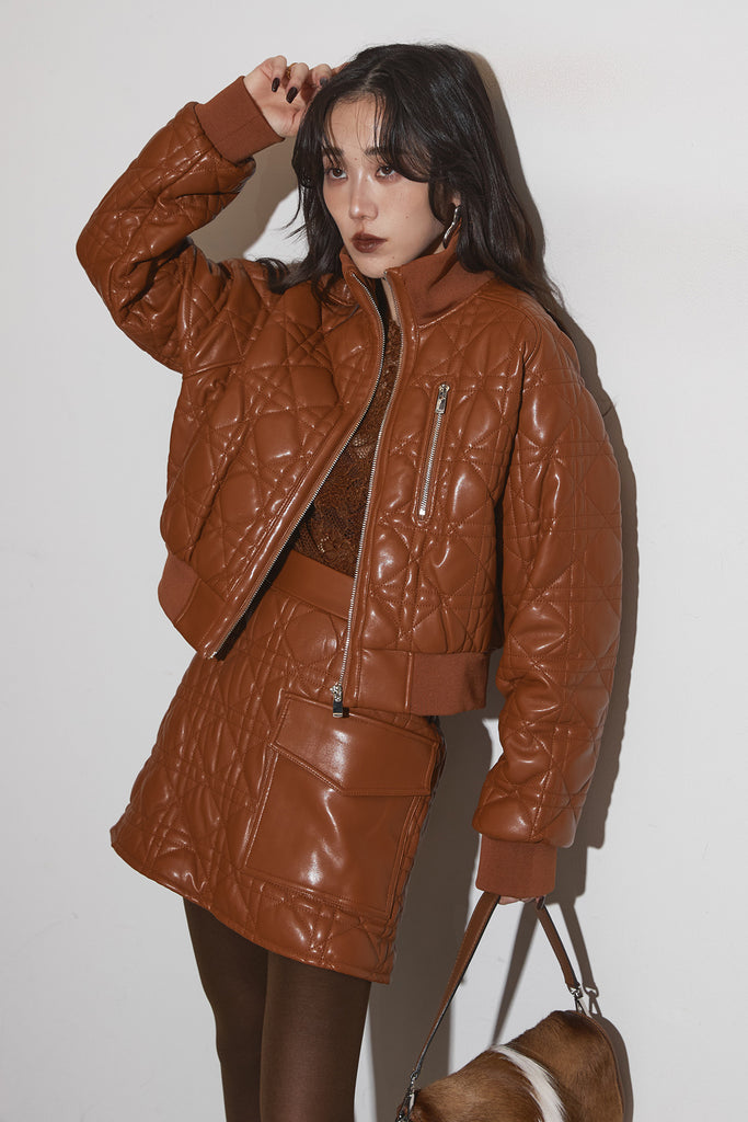 キルティングデザインが印象的なセットアップ。 程よく光沢のある素材で、立体的な表情と上品な存在感を演出します。 ブルゾンはジップ仕様で着脱がしやすく、スカートはポケットデザインがアクセントに。 セットで着用するとスタイリッシュな雰囲気に、単品でも着回しやすい万能アイテムです。