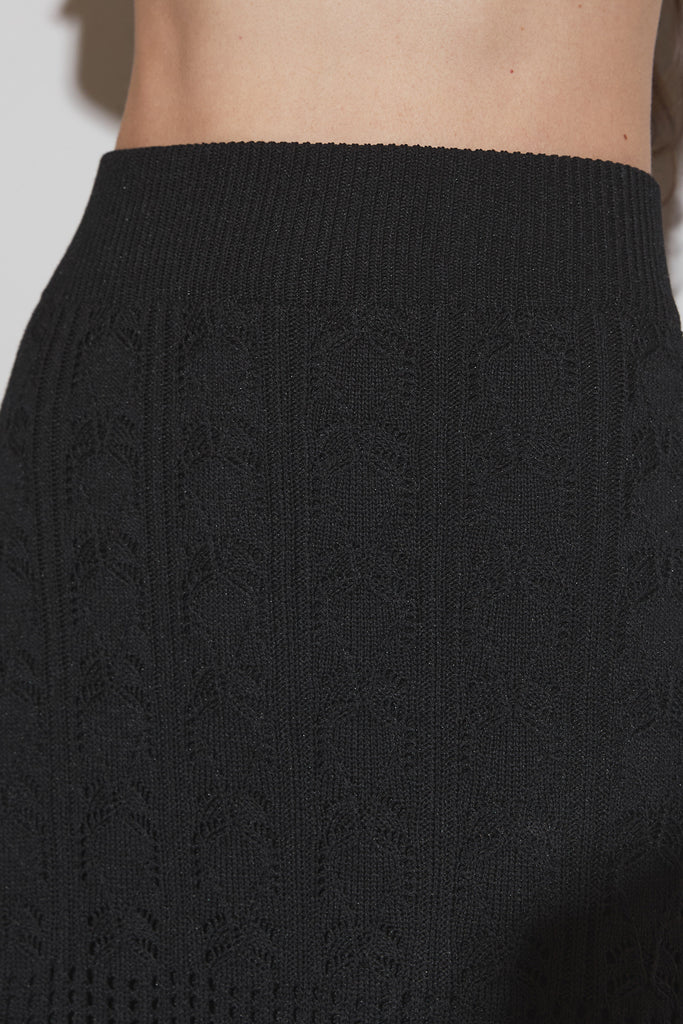 立体的なフラワーモチーフが印象的なロングスカート。 繊細な編地と異素材の装飾が組み合わさり、動くたびに奥行きのある表情を見せます。 ウエストからヒップにかけてはすっきりと、裾に向かってボリュームを出した美しいシルエット。 シンプルなトップスを合わせるだけで、スタイリングの主役になる一枚です。