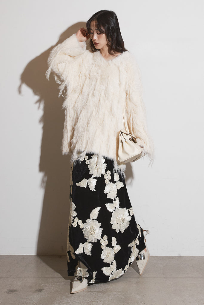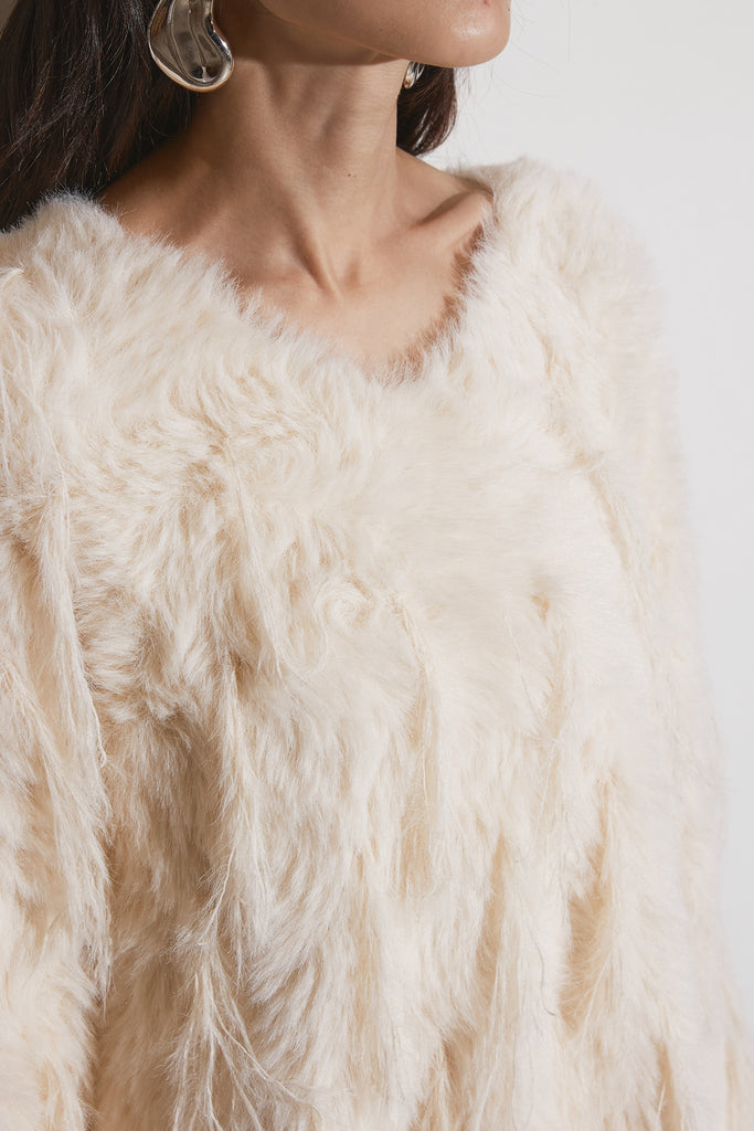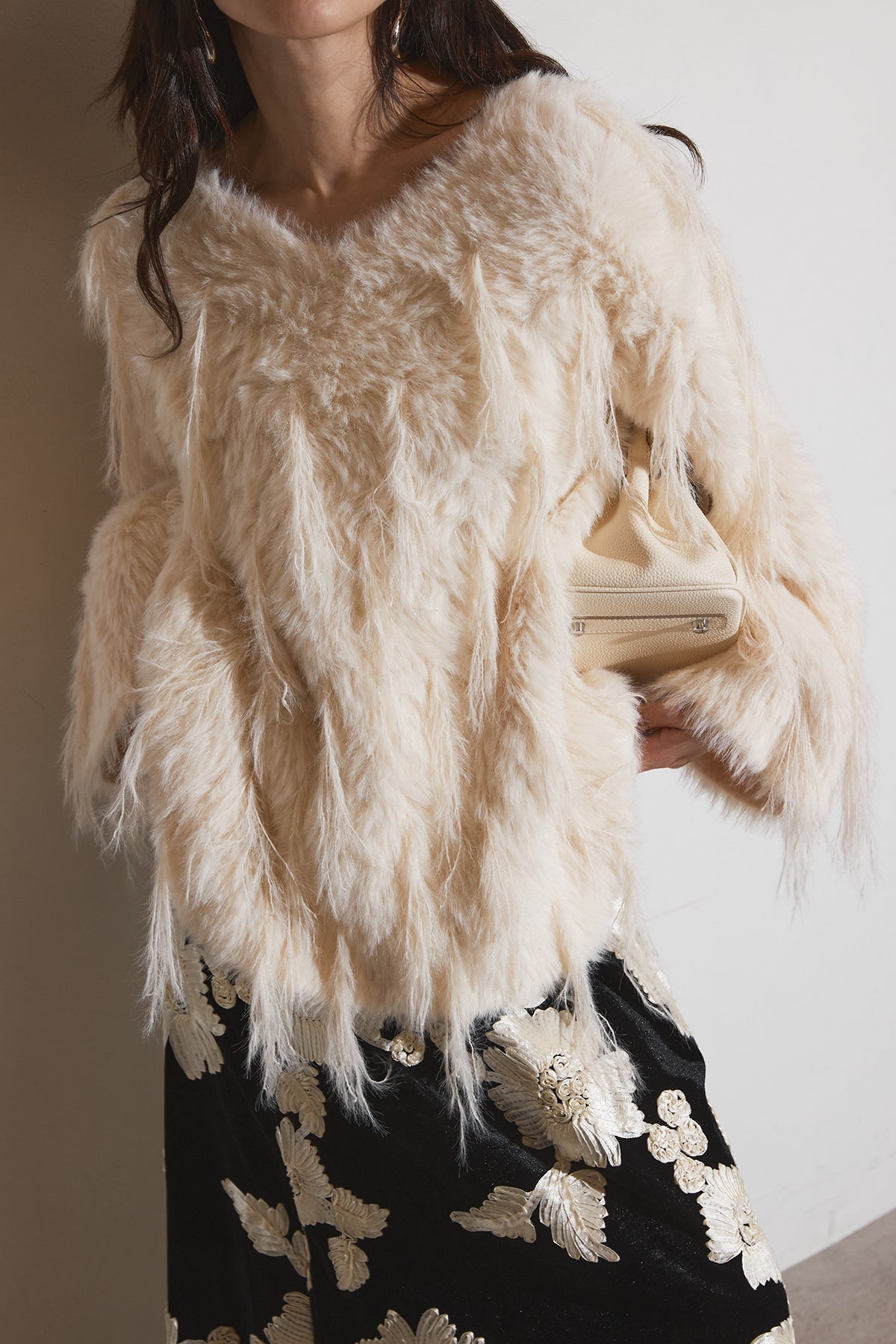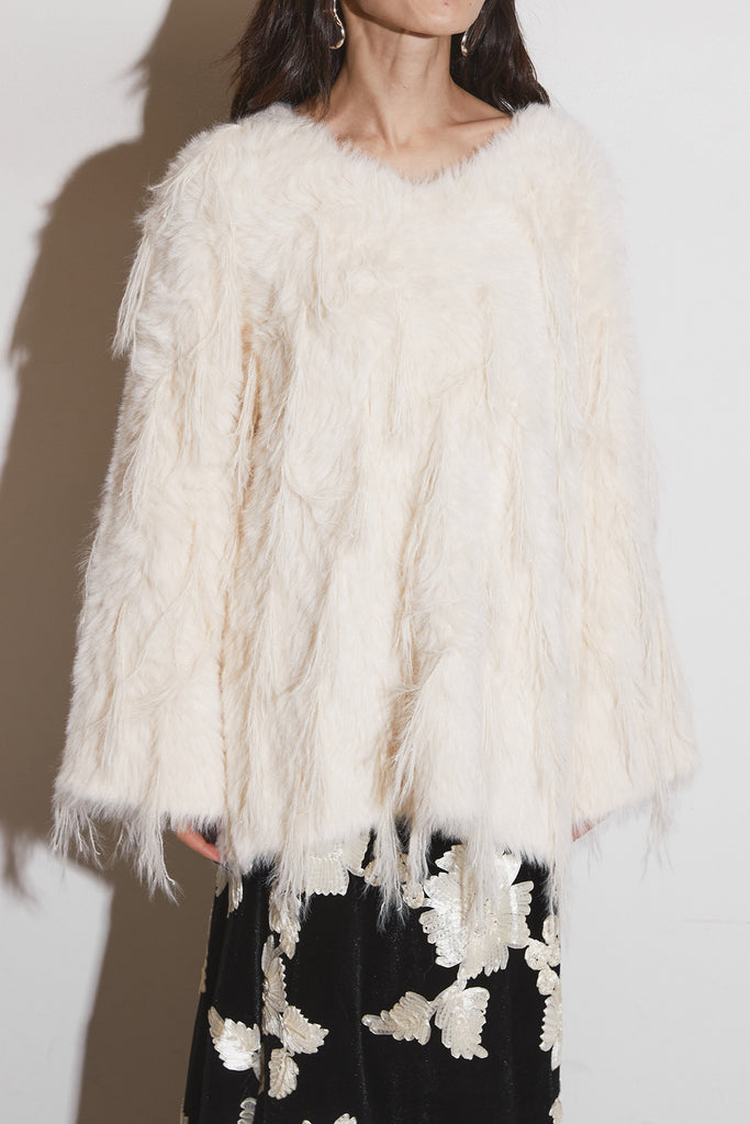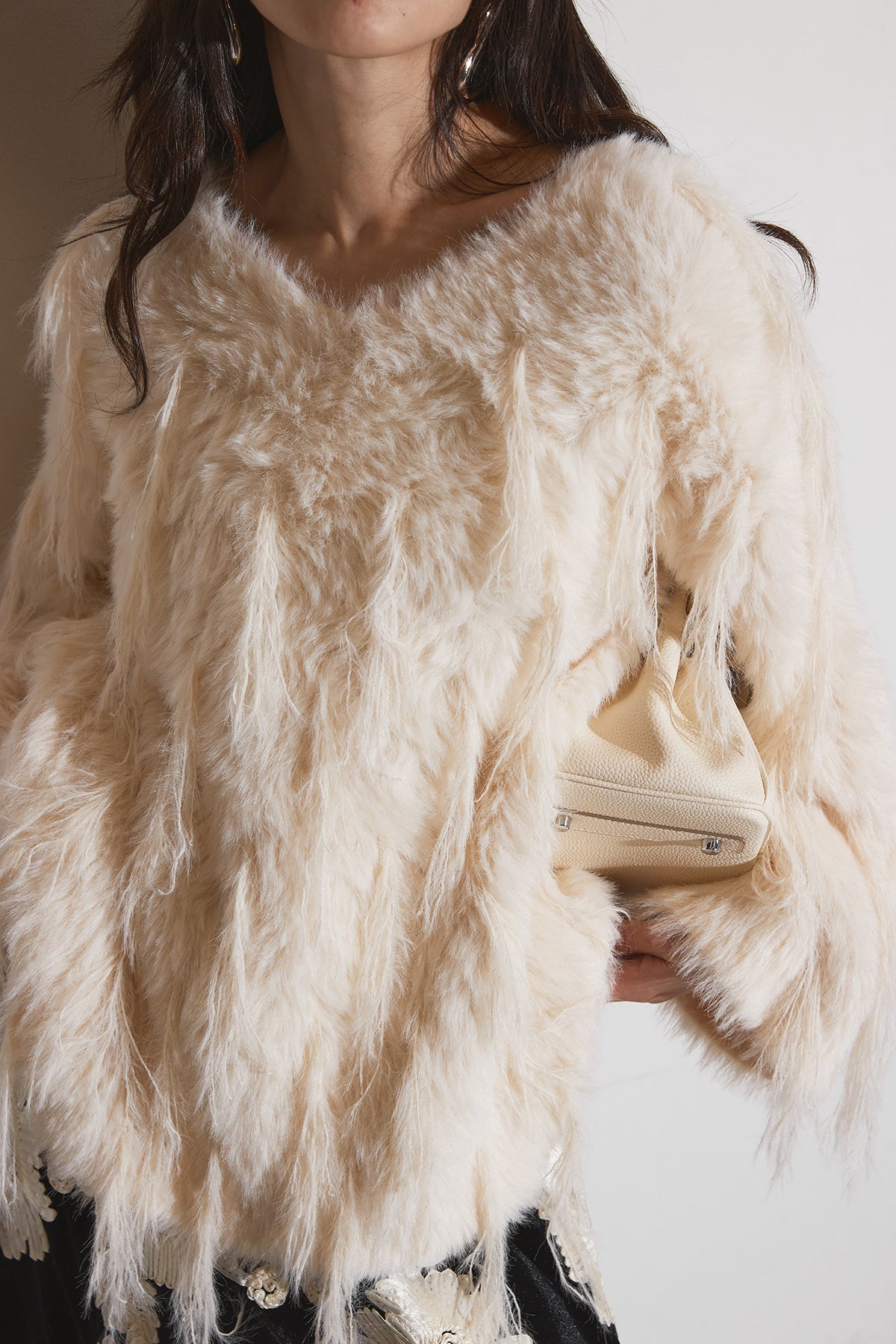 毛足の長いシャギー素材が目を惹くフェザーニット。 ふんわりとした質感がシーズンムードを高め、 一枚でスタイリングの主役になるアイテムです。 ゆったりとしたシルエットで抜け感を演出しつつ、 軽やかな素材感で女性らしい印象に仕上げています。 シンプルなボトムを合わせるだけで、上品で華やかなスタイルが完成します。