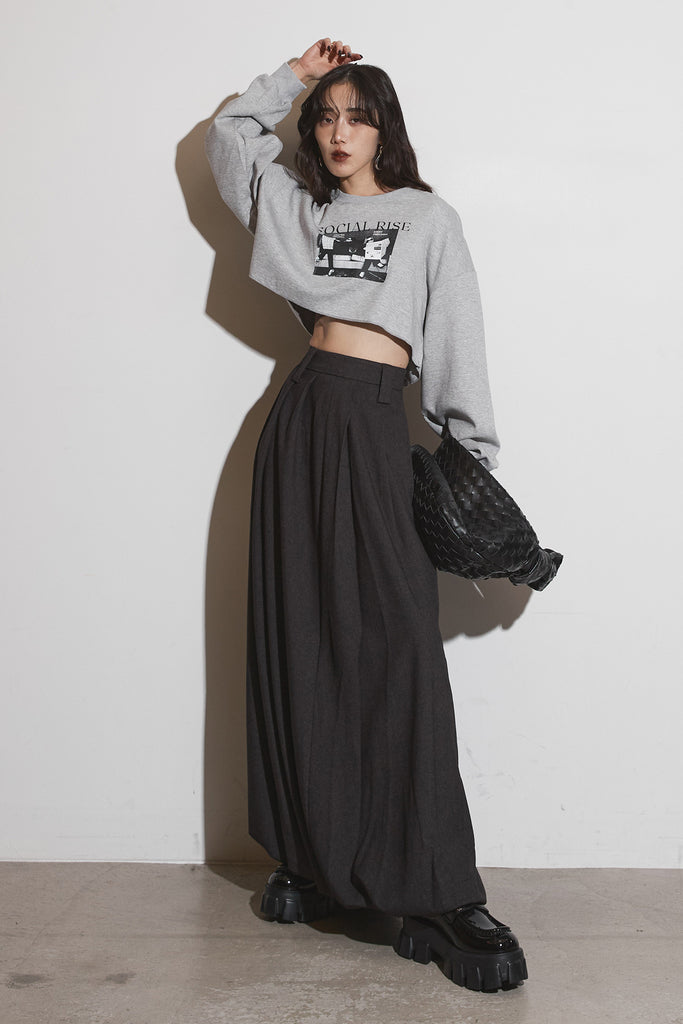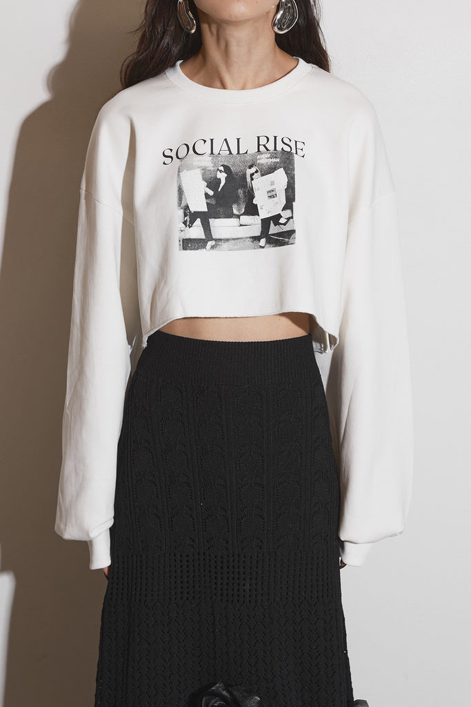 フロントのフォトプリントが目を惹くクロップドプルオーバー。 短めの丈感がスタイルアップ効果を演出し、ハイウエストボトムとの相性も抜群。 ゆったりとしたシルエットでリラックス感がありつつ、モードな雰囲気も漂います。 一枚で着るのはもちろん、シャツやワンピースとのレイヤードもおすすめ。