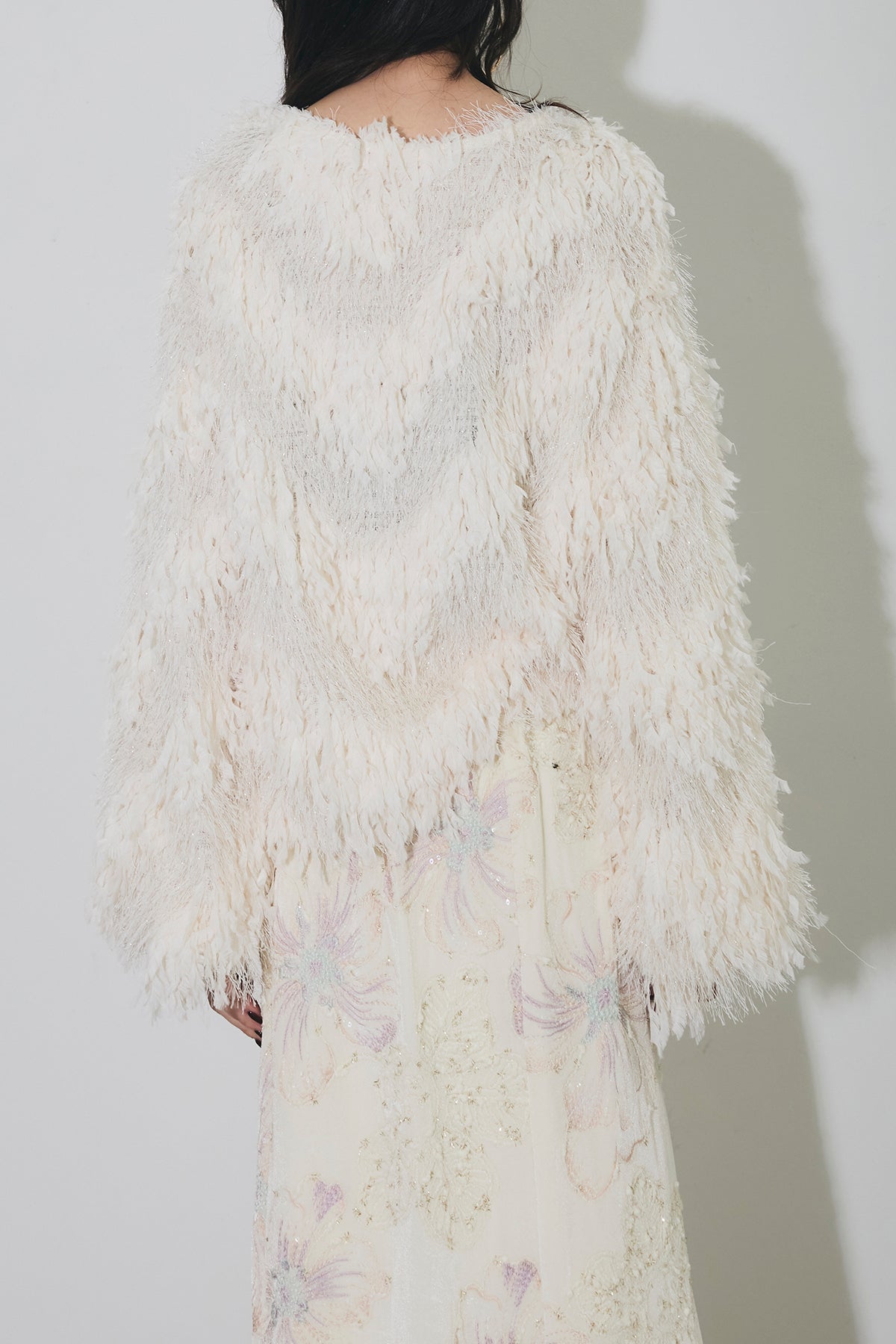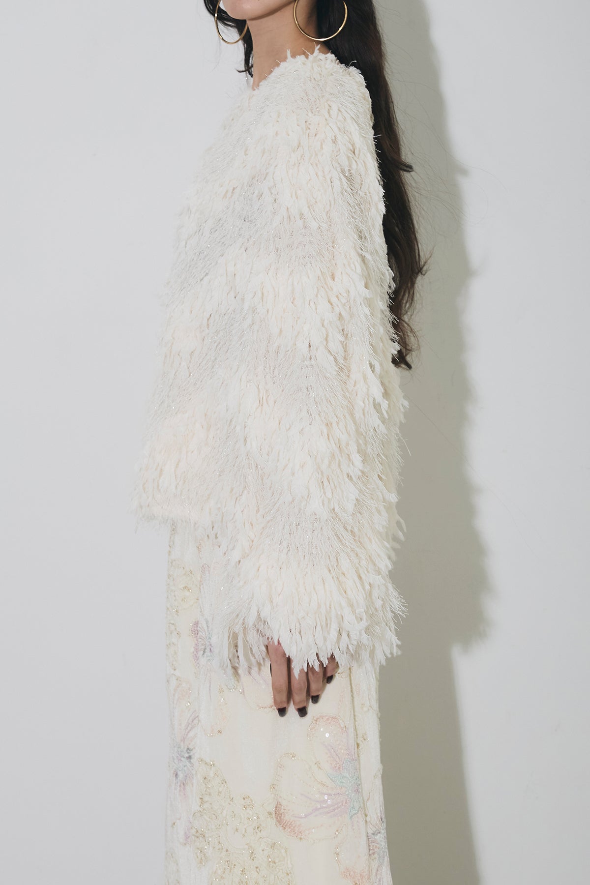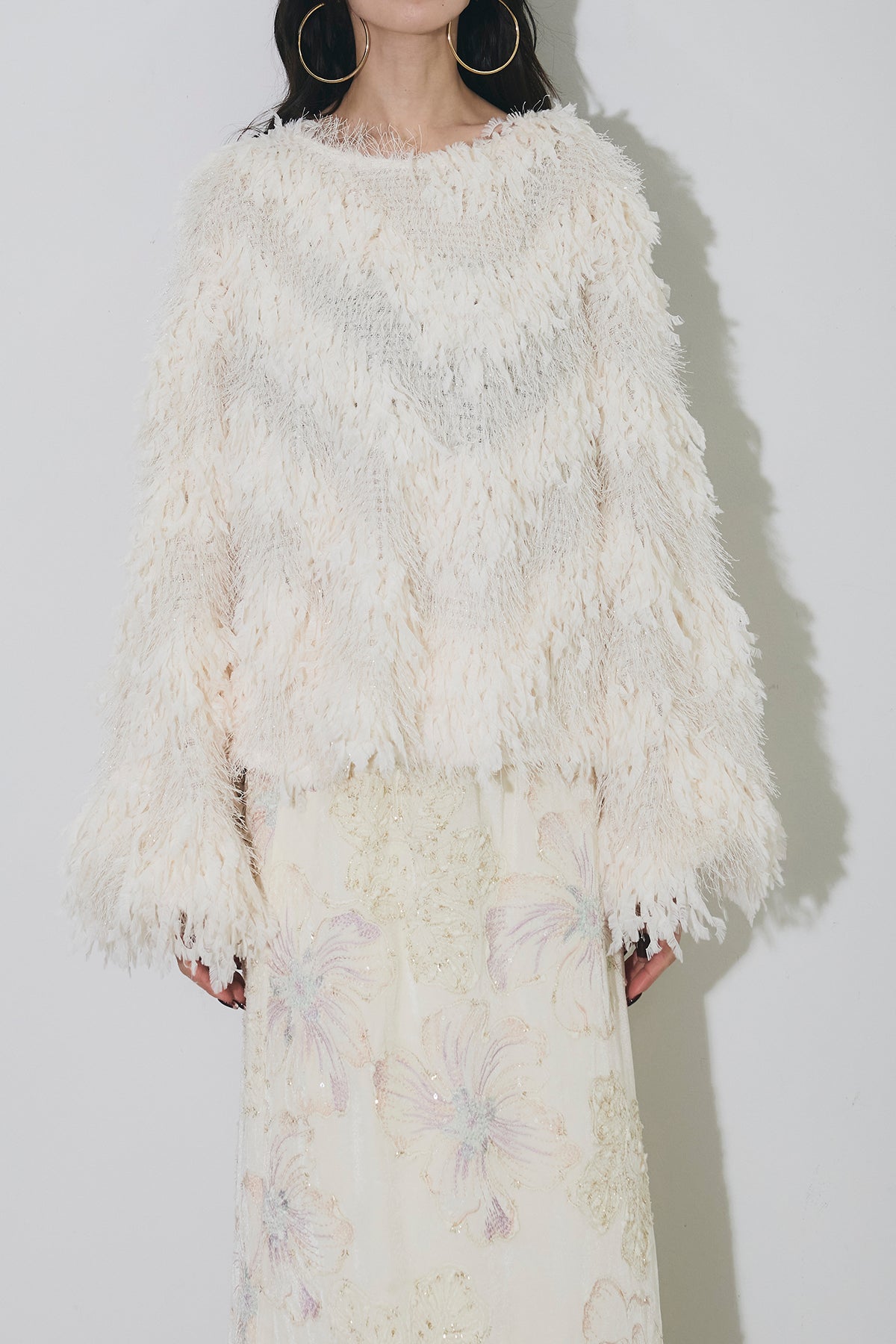 ふんわりとした立体的なシャギー素材が目を惹くプルオーバー。 軽やかで柔らかな糸を使用し、程よいボリューム感と動きのある表情を演出します。 ゆったりとしたシルエットでリラックス感がありながら、 華やかな存在感でスタイリングを格上げしてくれる一着。 インにシャツやレーストップスを重ねたレイヤードスタイルもおすすめです。
