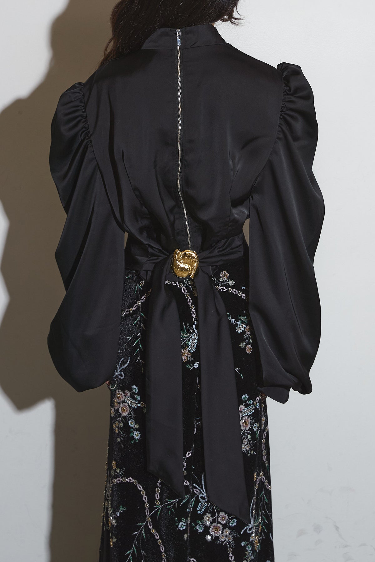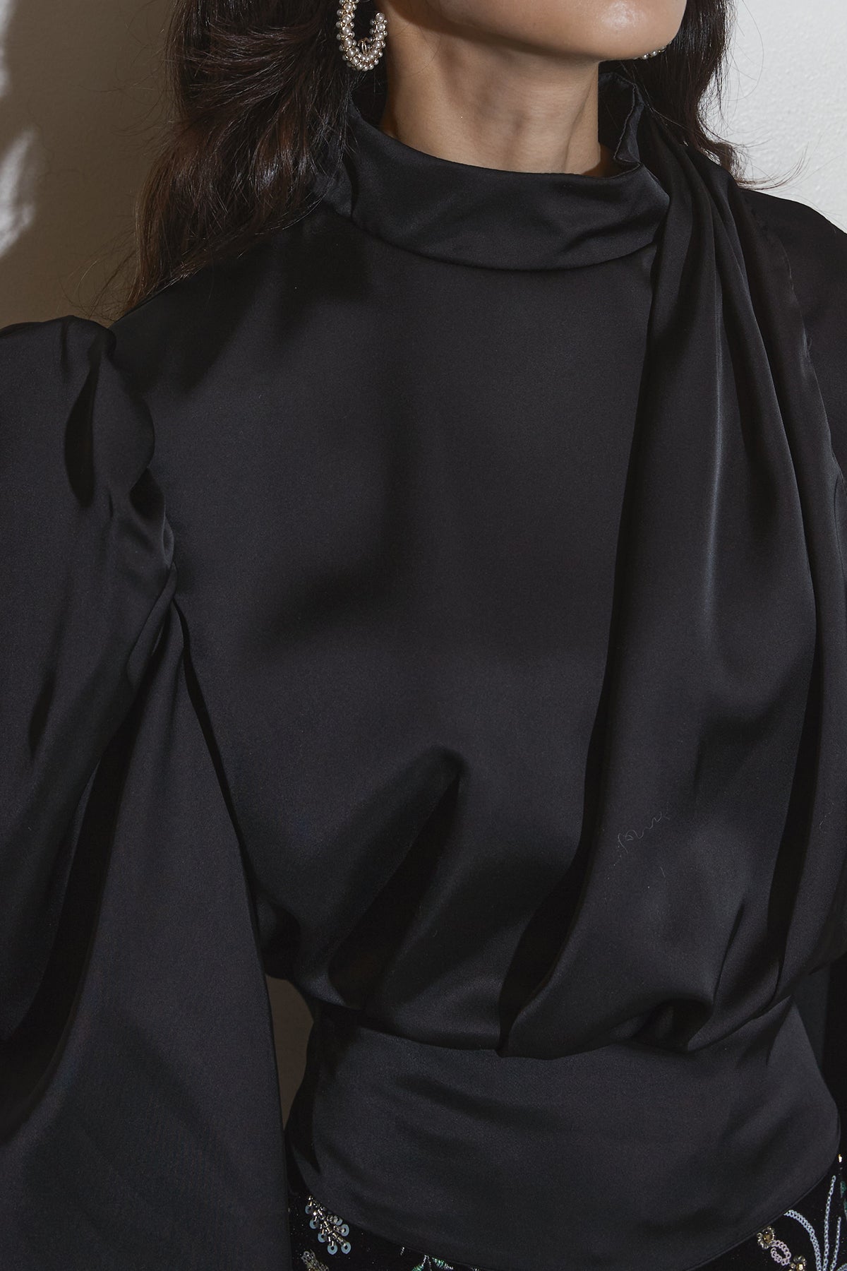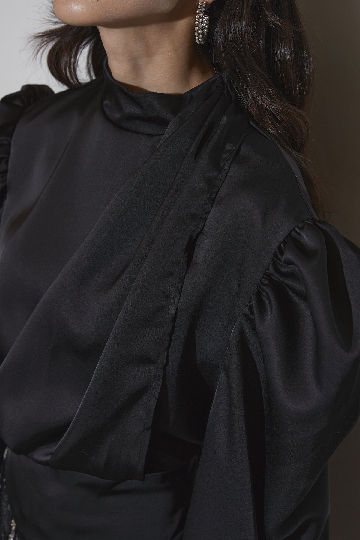 ご注文前に必ずページ下部「お届け期間」をご確認くださいませ。ドレープを効かせたハイネックデザインとボリュームスリーブが目を惹くトップスで、フロントに流れるように落ちる生地がエレガントな存在感を添える一枚です。滑らかな光沢素材が上品に揺れ、ウエストをすっきり見せるシルエットでドレッシーにもモードにも着こなせます。