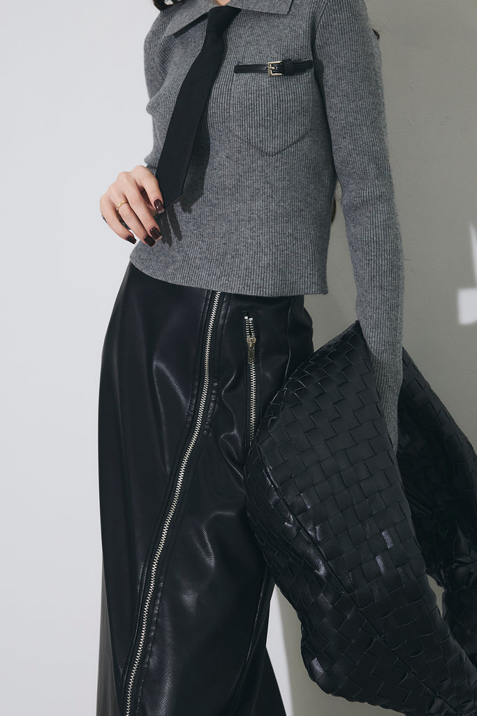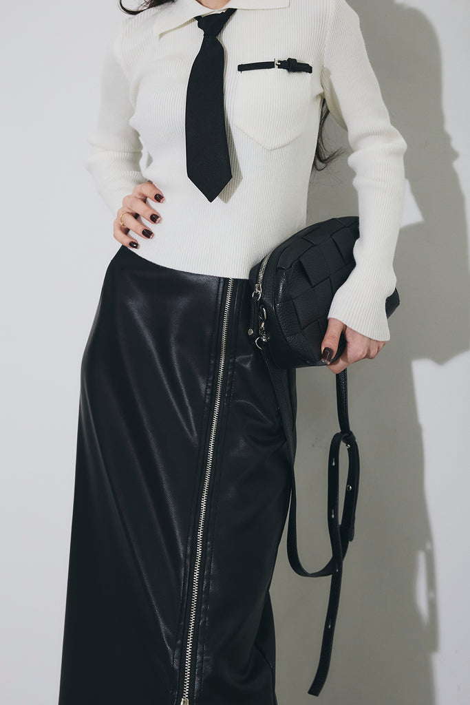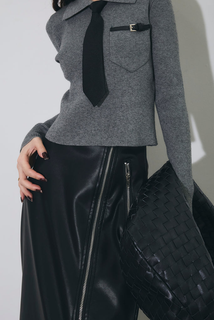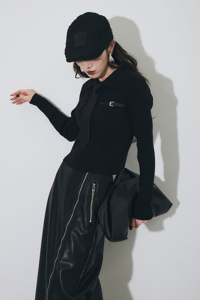 ご注文前に必ずページ下部「お届け期間」をご確認くださいませ。クラシカルなネクタイディテールを取り入れた、モードな印象のリブニットトップス。 フィット感のあるリブ素材がボディラインを美しく引き立てつつ、 胸元の立体的なポケット風デザインと細ベルトがアクセントに。 セットのネクタイは取り外し可能で、スタイリングに合わせて印象を変えられます。 上品さとエッジを兼ね備えた、トレンド感ある一枚です。